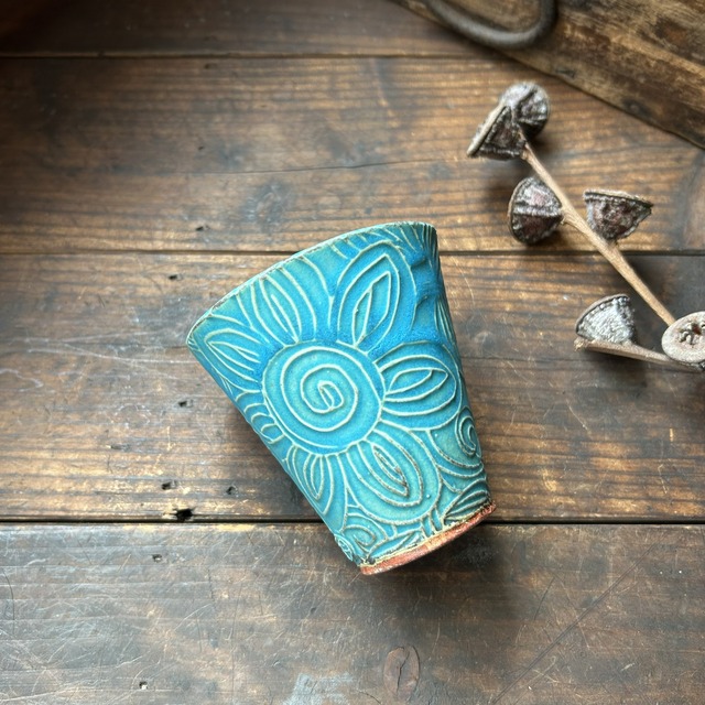 【笠間焼】 佐藤りぢゅう フリーカップ(フラワー)9cm ターコイズ