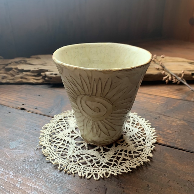 お花模様の刻文が入ったアイボリー色のフリーカップです。どんな飲み物も美味しく素敵に演出してくれます。 ■□■□■□■□ 手作り商品です。一つ一つの形、大きさ、色、表情が違います。機械のように全く同じものはございません。手仕事ならではの個性、風合いとご理解の上ご購入下さい。 *陶器1点のみの販売です。写真に写っている付属品等は含まれません。 サイズ 直径‥約9cm(取っ手まで12cm) 高さ‥約9、2cm 【作家】 佐藤りぢゅう 【笠間焼】 茨城県笠間市で江戸時代中期から始まり、信楽焼の流れをくむ関東で最も古い焼き物です。栃木県益子町の益子焼は笠間焼の製法を受け継いでおり、笠間焼と益子焼は兄弟産地の関係にあります。伝統を残しつつ型にとらわれない自由な作風が特徴の焼き物です。1992年、国の伝統的工芸品に指定されました。 ◆食洗器…使用可能(欠けやひびのある場合はご使用をお勧めできません) ◆電子レンジ…温め程度の使用は可能