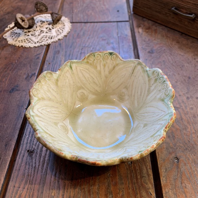 オフホワイトに所々スモーキーグリーンの色味がある、花の刻文が入った深皿です。深さがあるので、スープやヨーグルト、シリアルを入れたりといろいろな使い方ができます。 ■□■□■□■□ 手作り商品です。一つ一つの形、大きさ、色、表情が違います。機械のように全く同じものはございません。手仕事ならではの個性、風合いとご理解の上ご購入下さい。 *陶器1点のみの販売です。写真に写っている付属品は含まれません。 サイズ 直径‥約15cm 高さ‥約5.5cm 【作家】 佐藤りぢゅう 【笠間焼】 茨城県笠間市で江戸時代中期から始まり、信楽焼の流れをくむ関東で最も古い焼き物です。栃木県益子町の益子焼は笠間焼の製法を受け継いでおり、笠間焼と益子焼は兄弟産地の関係にあります。伝統を残しつつ型にとらわれない自由な作風が特徴の焼き物です。1992年、国の伝統的工芸品に指定されました。 ◆食洗器…使用可能(欠けやひびのある場合はご使用をお勧めできません) ◆電子レンジ…温め程度の使用は可能