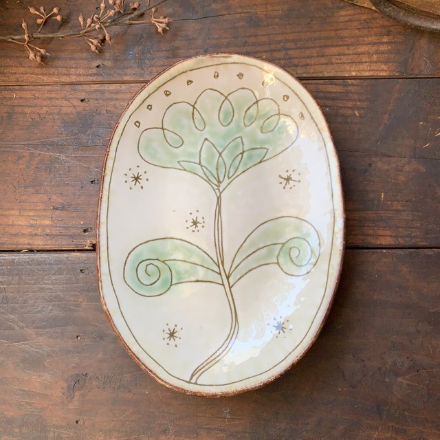 こちらのお皿は、掻き落としという伝統的な技法で作られたお皿です。りぢゅう氏オリジナルの温もりあふれる絵柄がとても個性的です。光沢のあるアイボリー色と淡い緑色が優しい雰囲気を醸し出しています。手作りならではの、色合いと柄が素敵なお皿です。 ■□■□■□■□ 手作り商品です。一つ一つの形、大きさ、色、表情が違います。機械のように全く同じものはございません。手仕事ならではの個性、風合いとご理解の上ご購入下さい。 *陶器1点のみの販売です。写真に写っている付属品等は含まれません。 サイズ 縦‥約20~20.5cm 横‥約15cm 高さ‥約2cm 【作家】 佐藤りぢゅう 【笠間焼】 茨城県笠間市で江戸時代中期から始まり、信楽焼の流れをくむ関東で最も古い焼き物です。栃木県益子町の益子焼は笠間焼の製法を受け継いでおり、笠間焼と益子焼は兄弟産地の関係にあります。伝統を残しつつ型にとらわれない自由な作風が特徴の焼き物です。1992年、国の伝統的工芸品に指定されました。 ◆食洗器…使用可能(欠けやひびのある場合はご使用をお勧めできません) ◆電子レンジ…温め程度の使用は可能