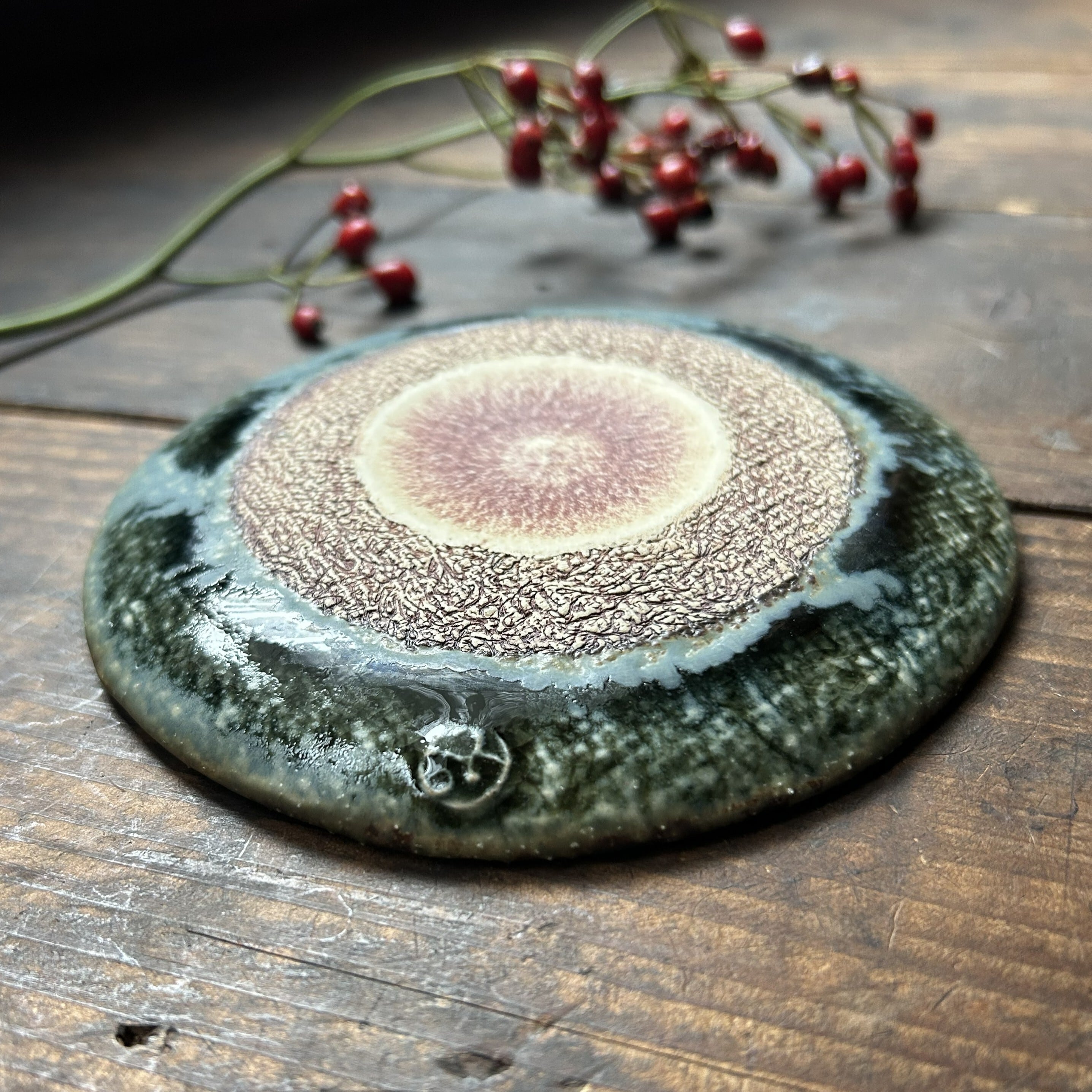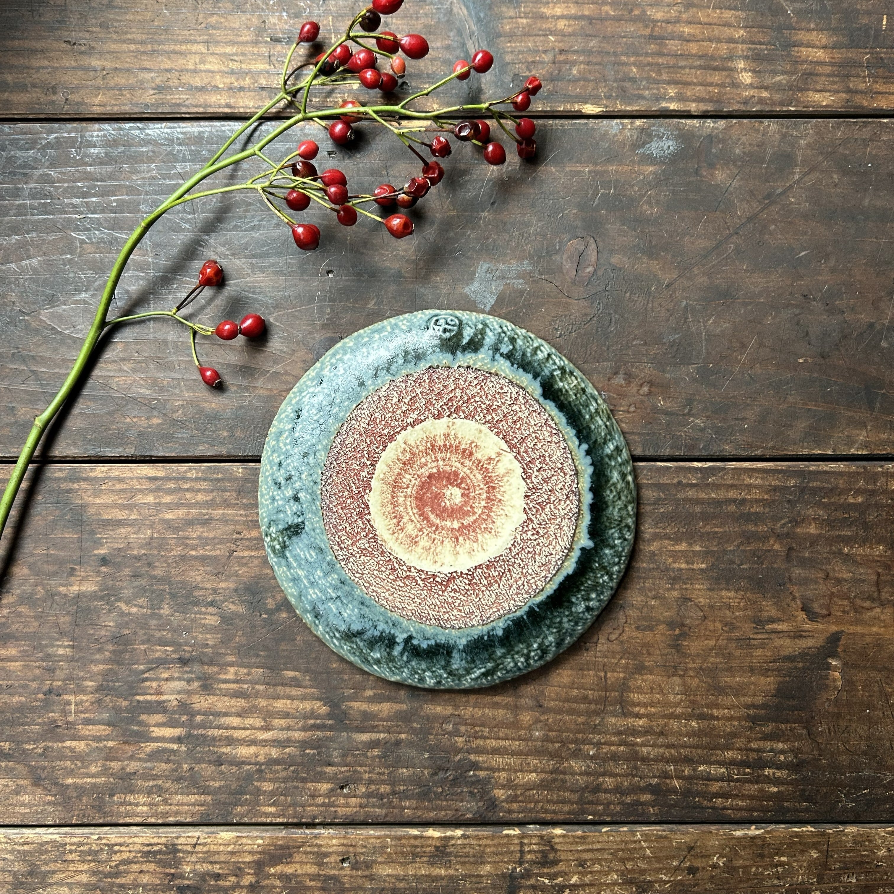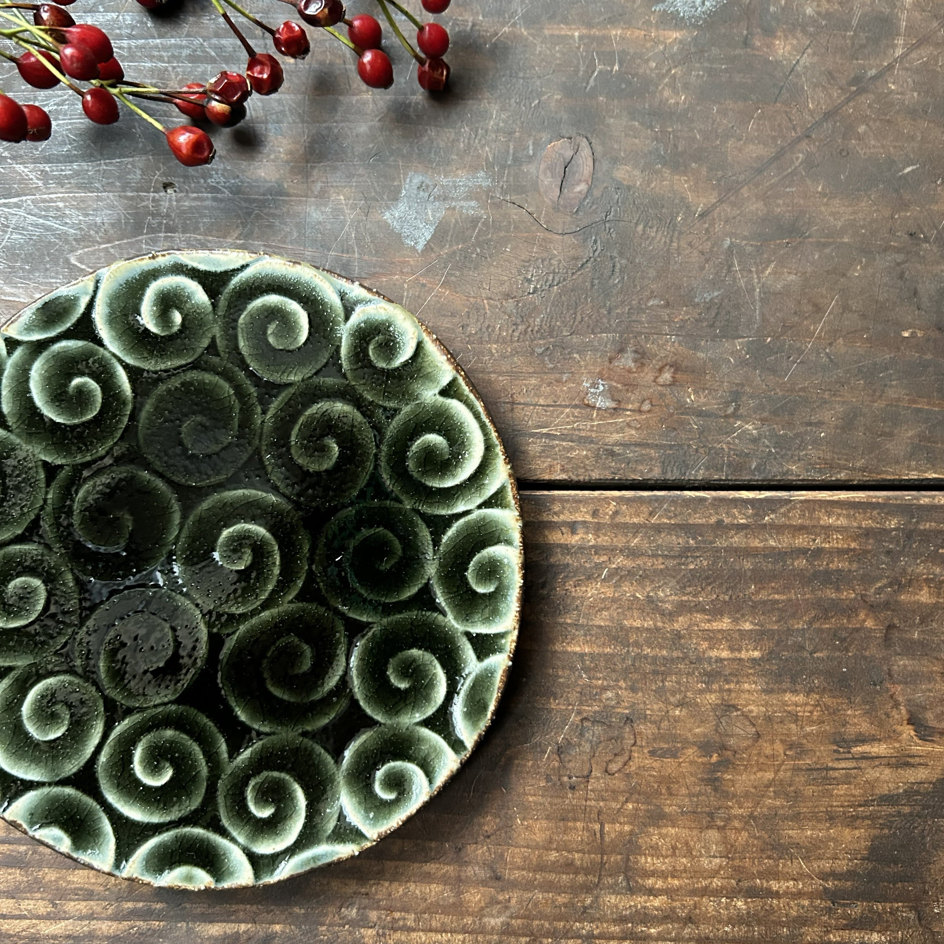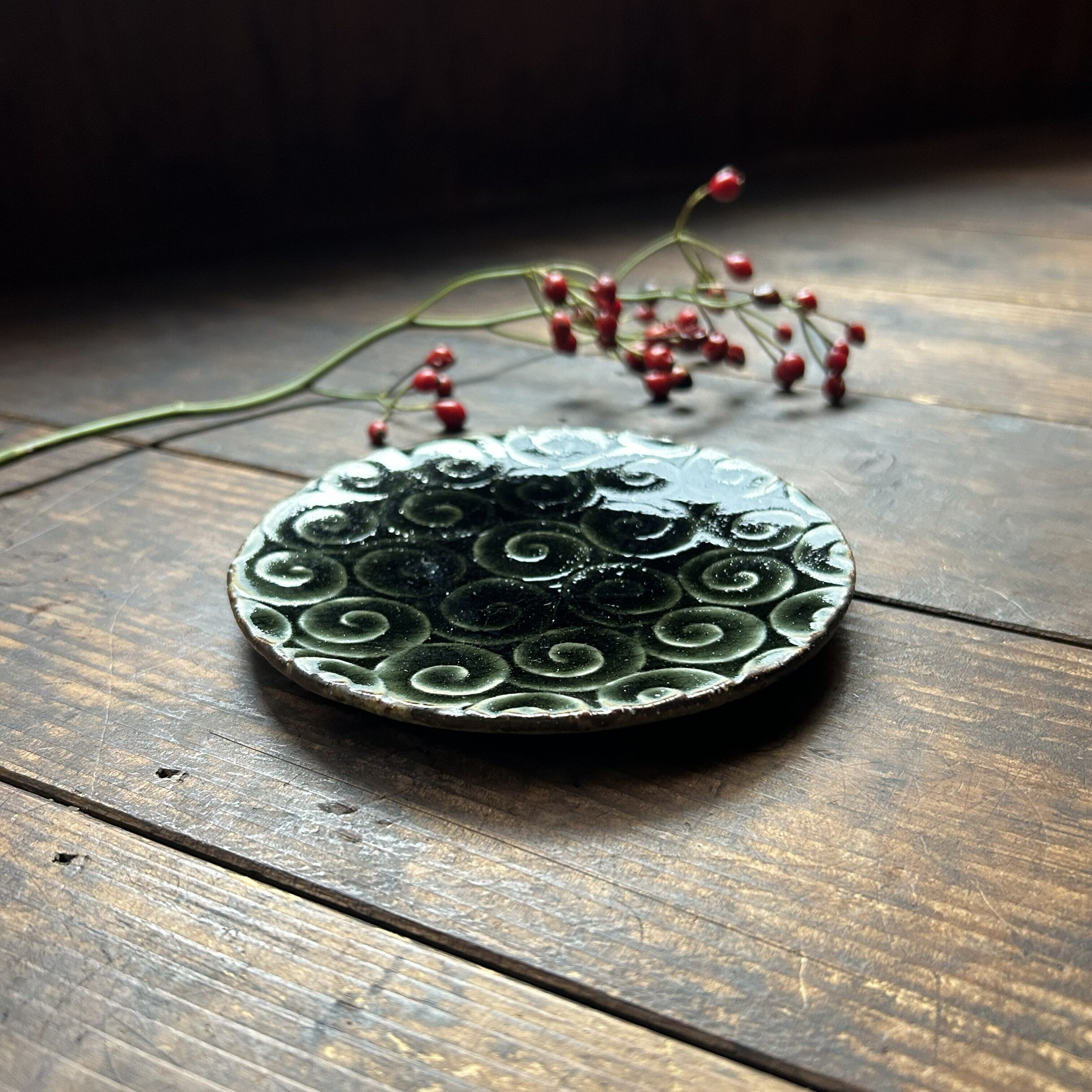 藍色釉にうずまき模様が素敵な中皿です。取り皿にちょうど良い大きさです。深い藍色ですが、どちらかというと黒に近いお色味です。光沢があります。