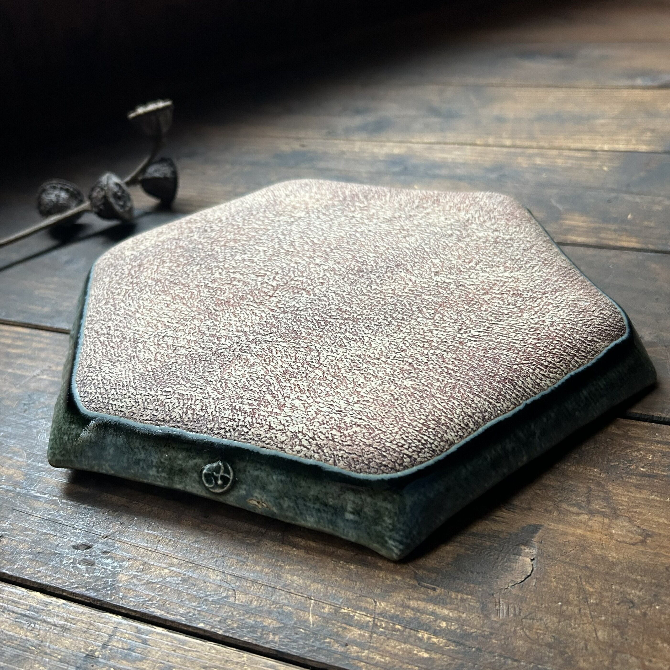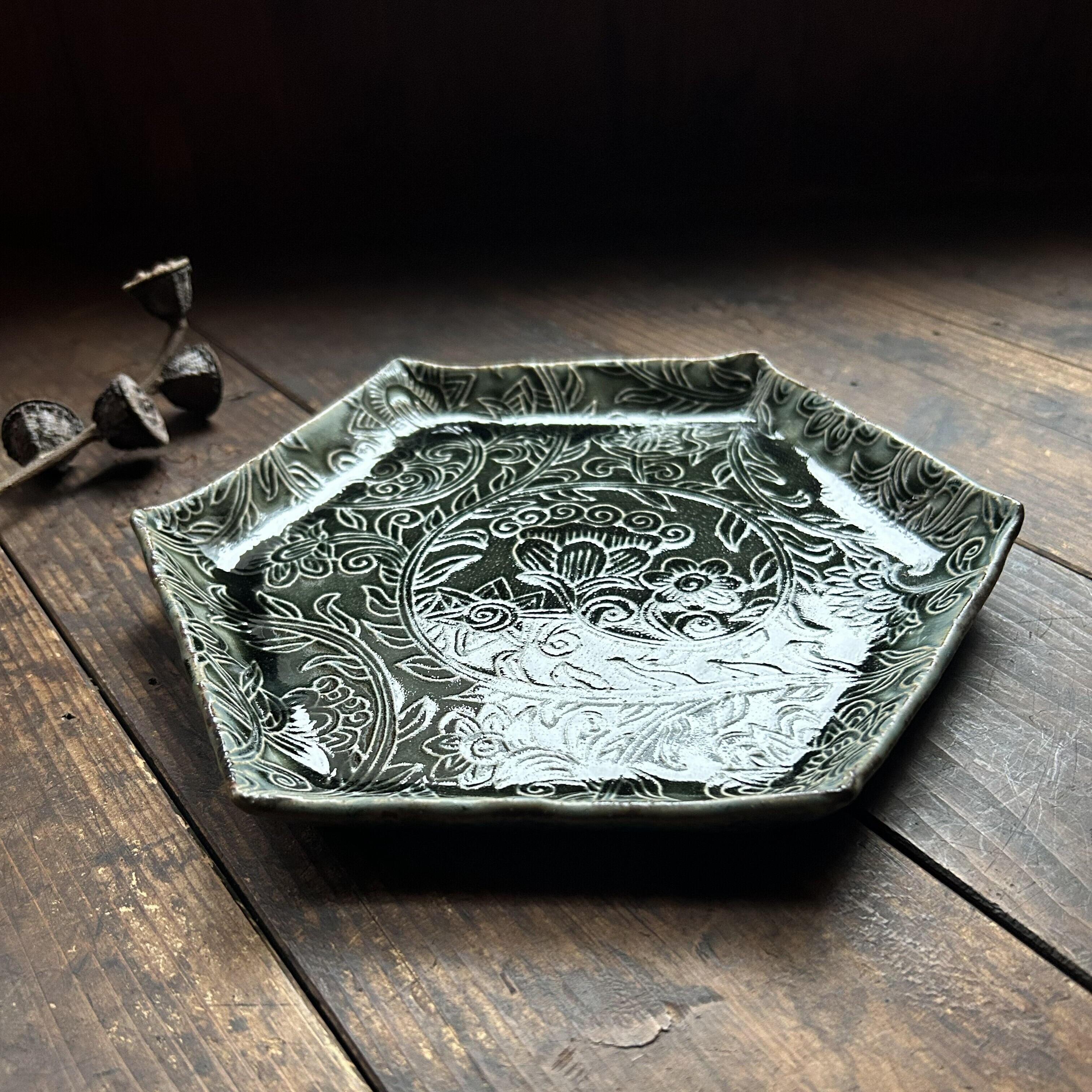 個性豊かな唐草の刻文が入った六角大皿。黒に近い光沢のある藍色釉薬がシックな雰囲気を醸し出します。