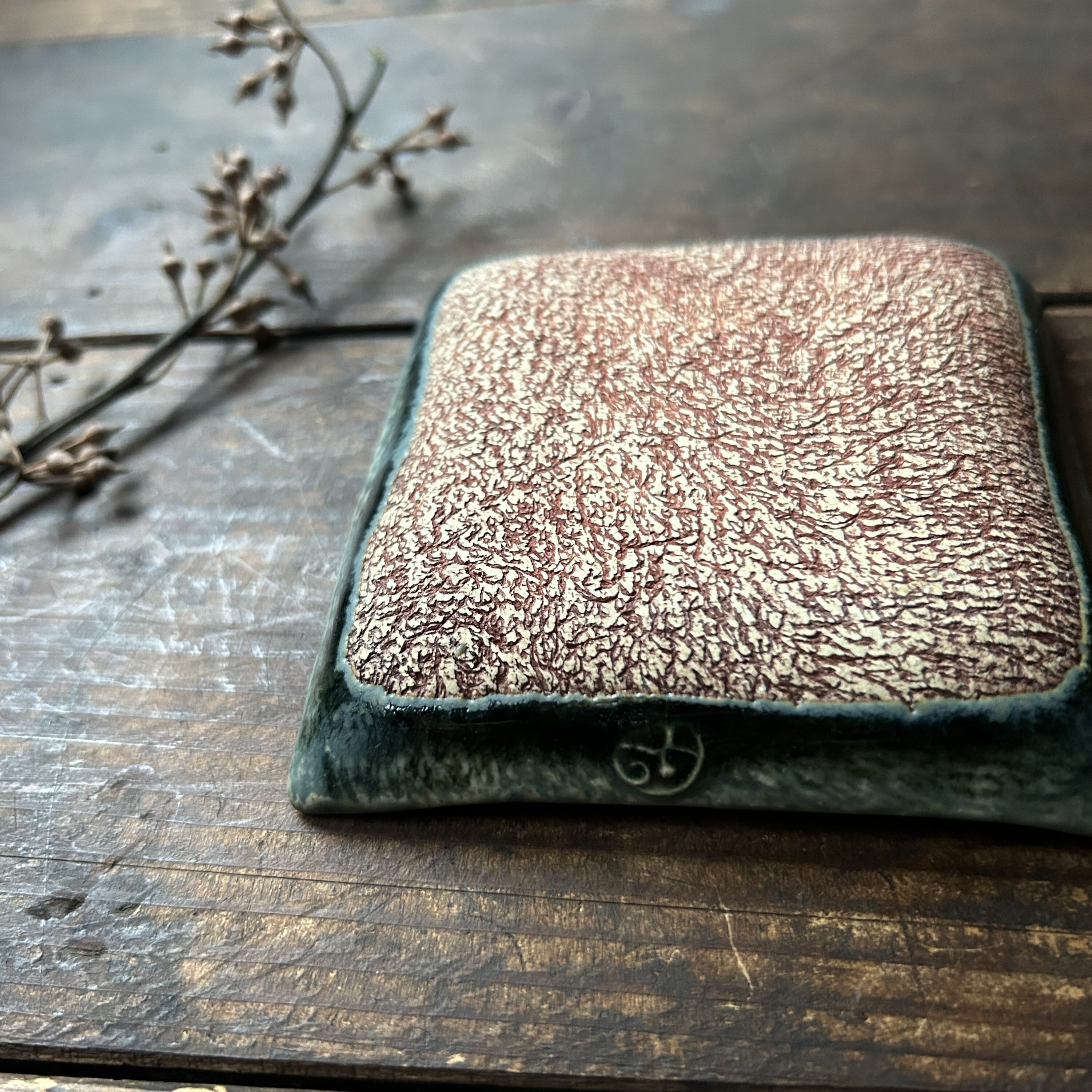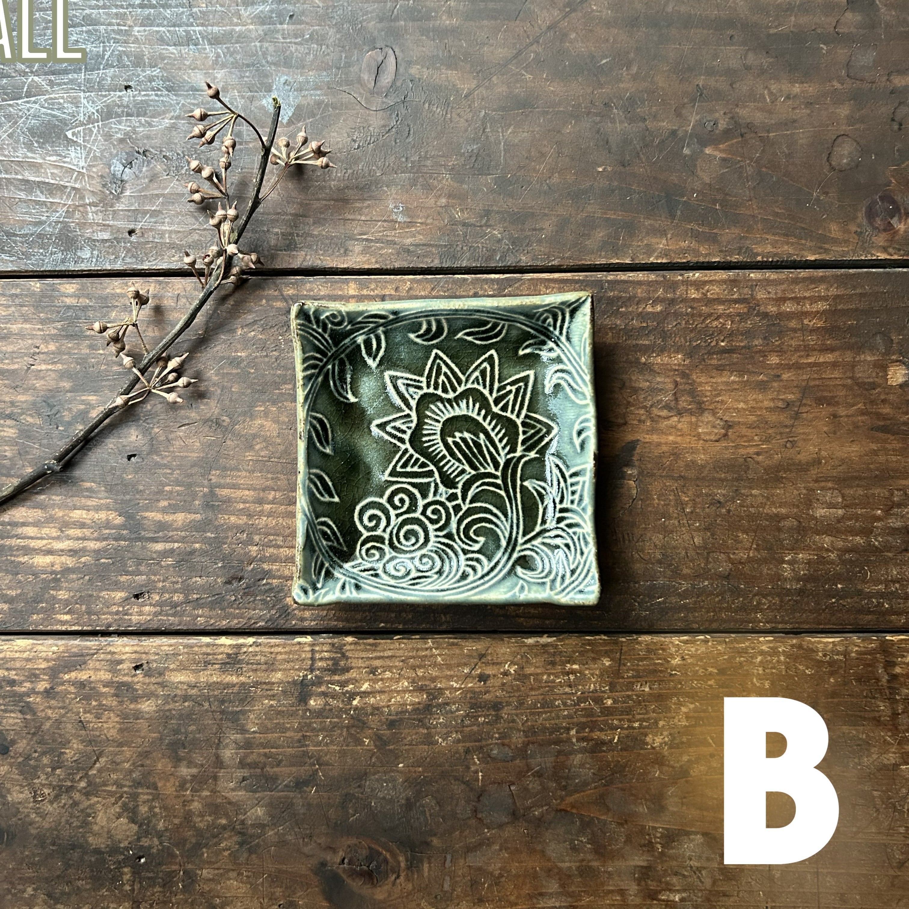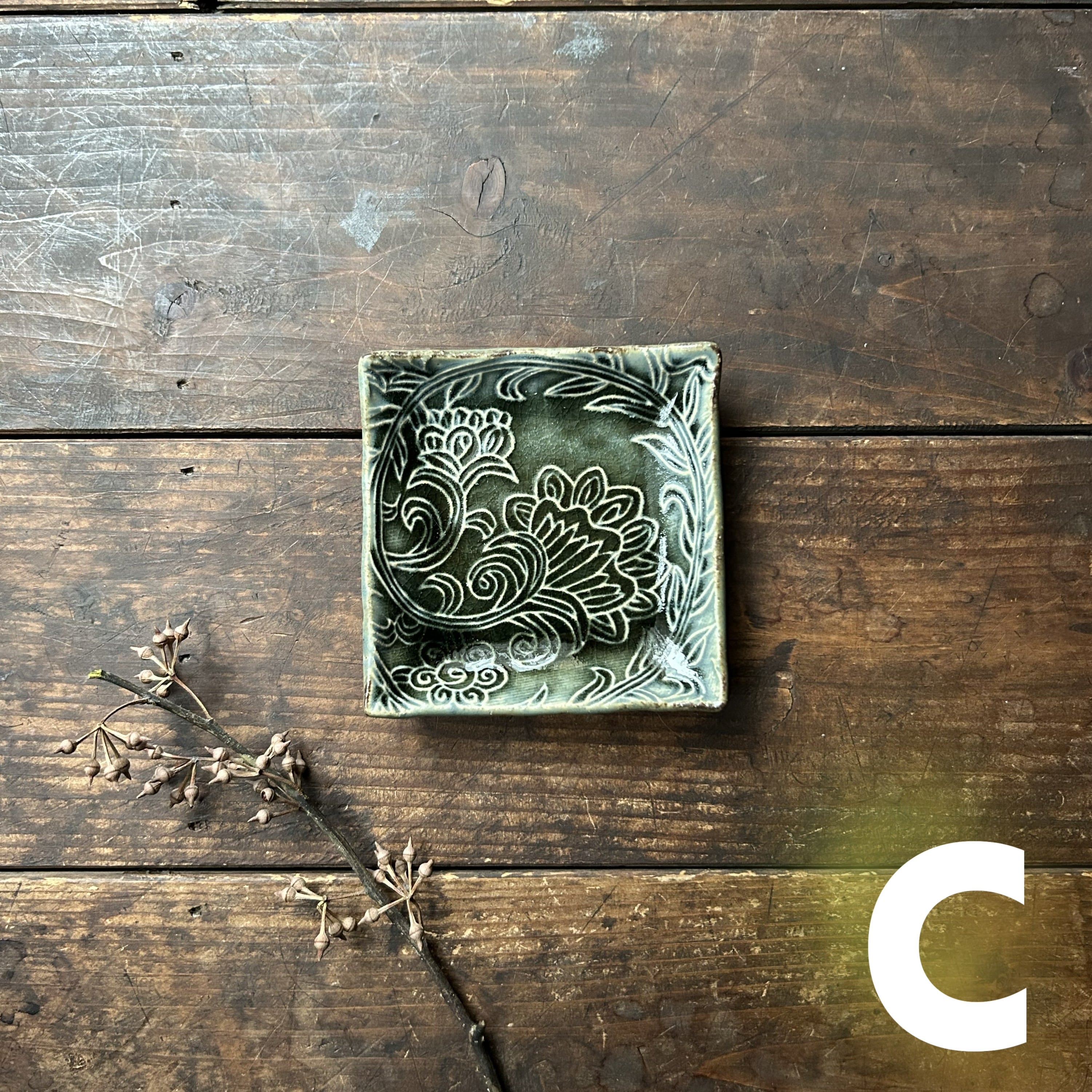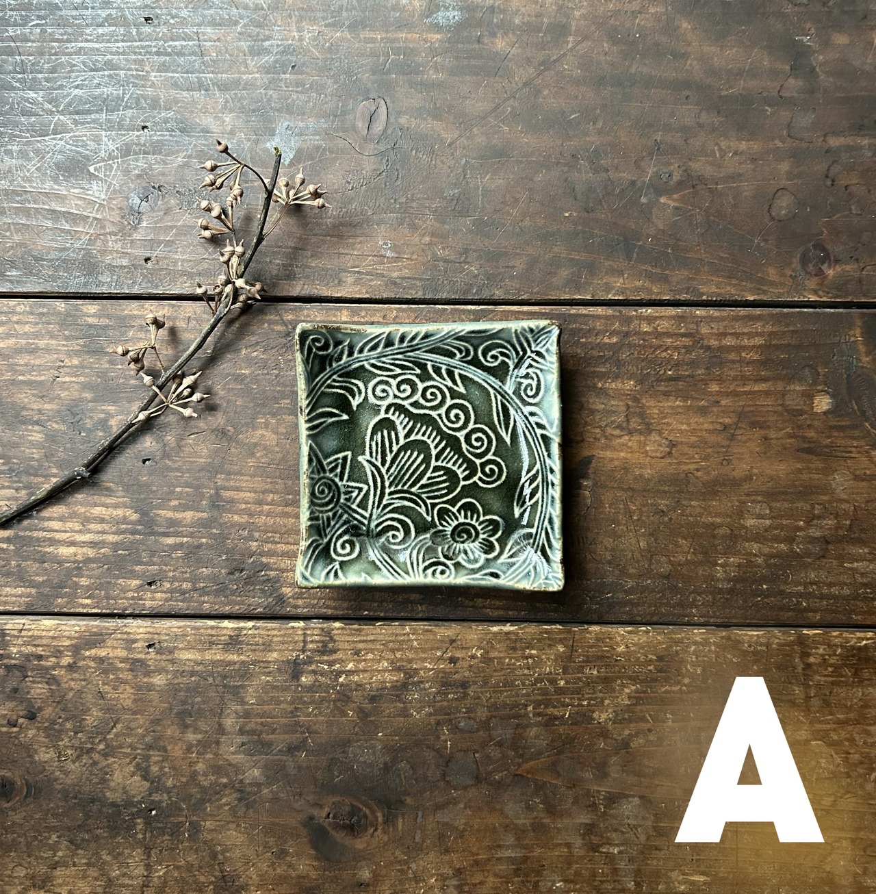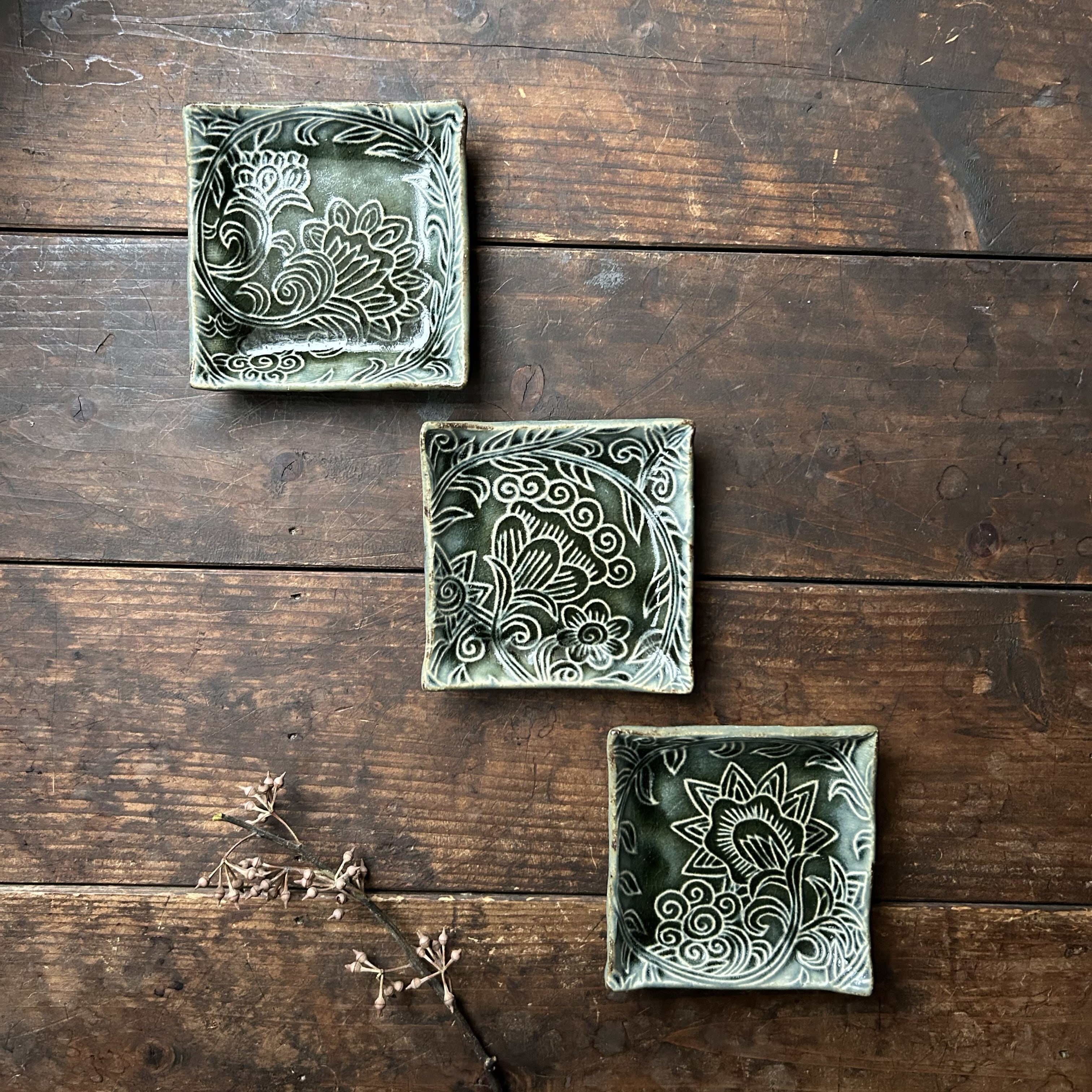黒に近い深い藍色釉の角皿です。とてもシックなお色味です。りぢゅう氏オリジナルの草刻文と藍色の組み合わせが、お料理だけでなくお茶菓子などもかっこよく盛り付けらそうですね。