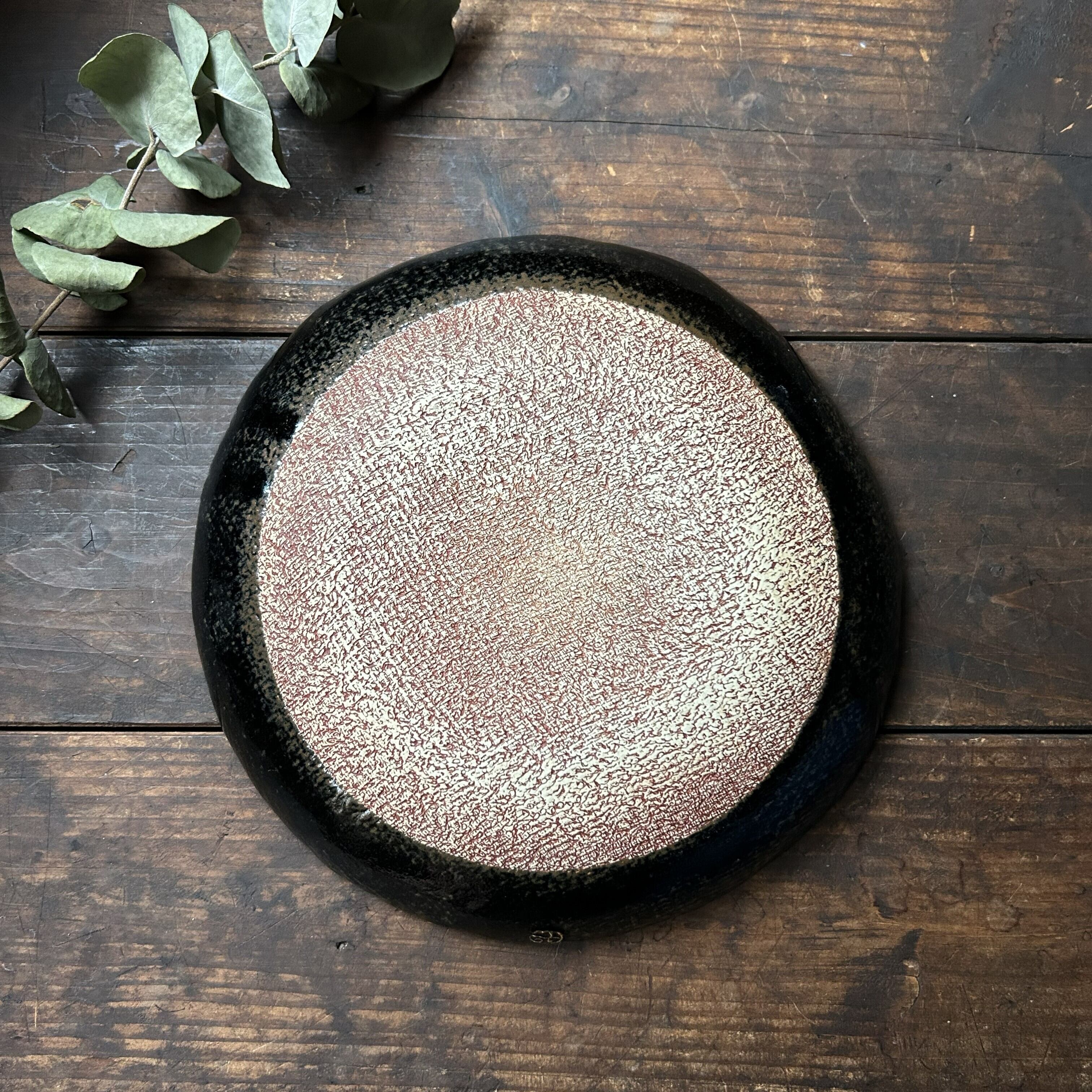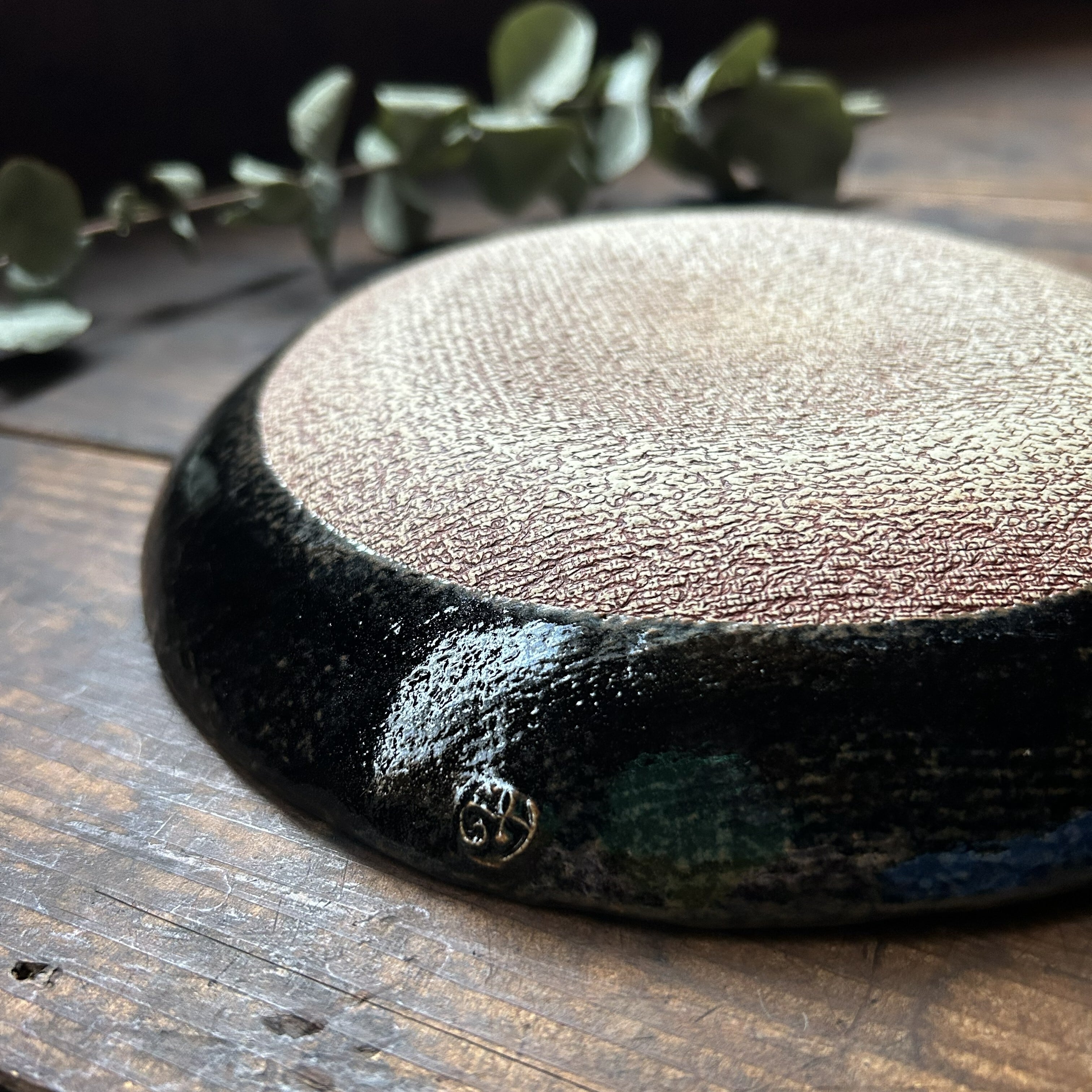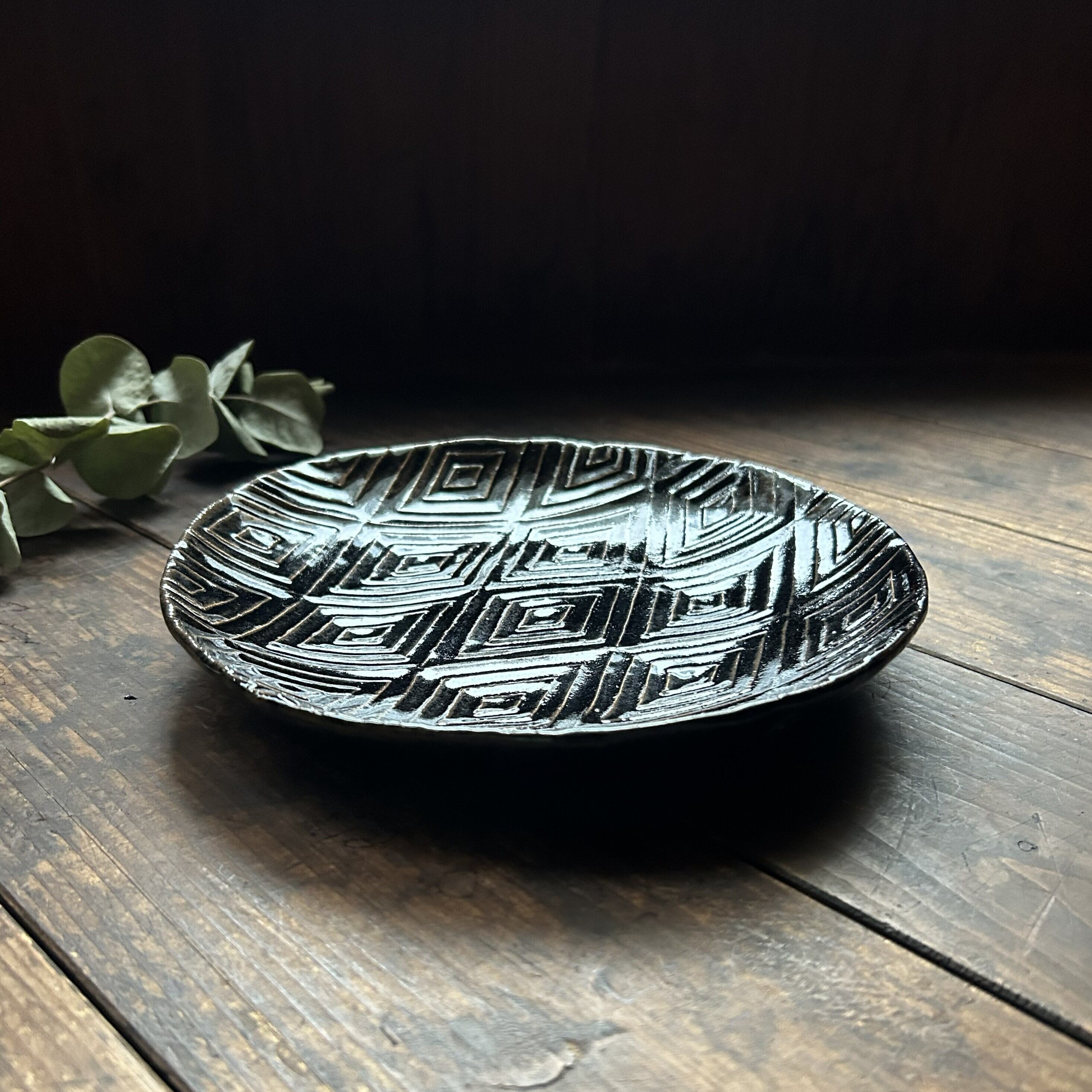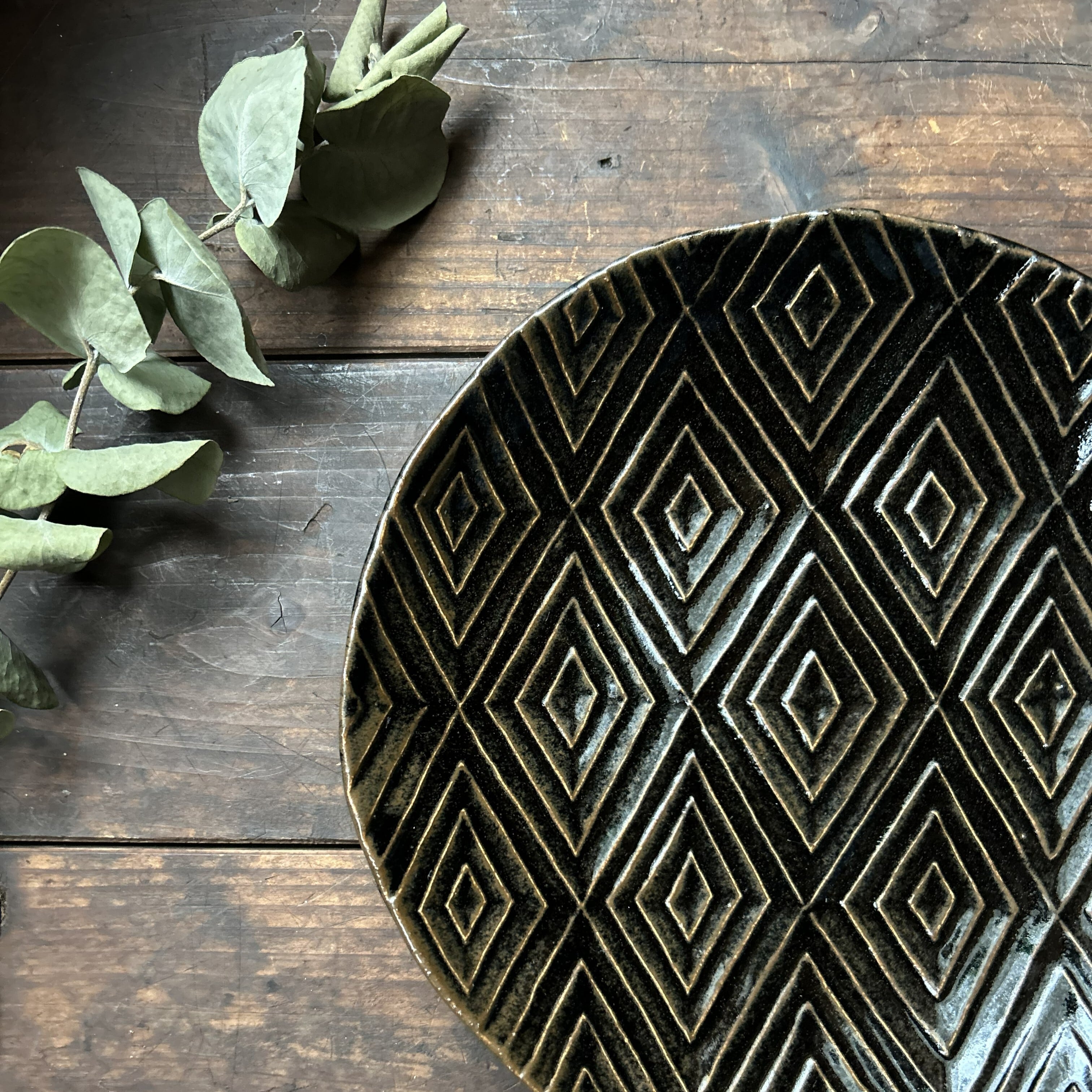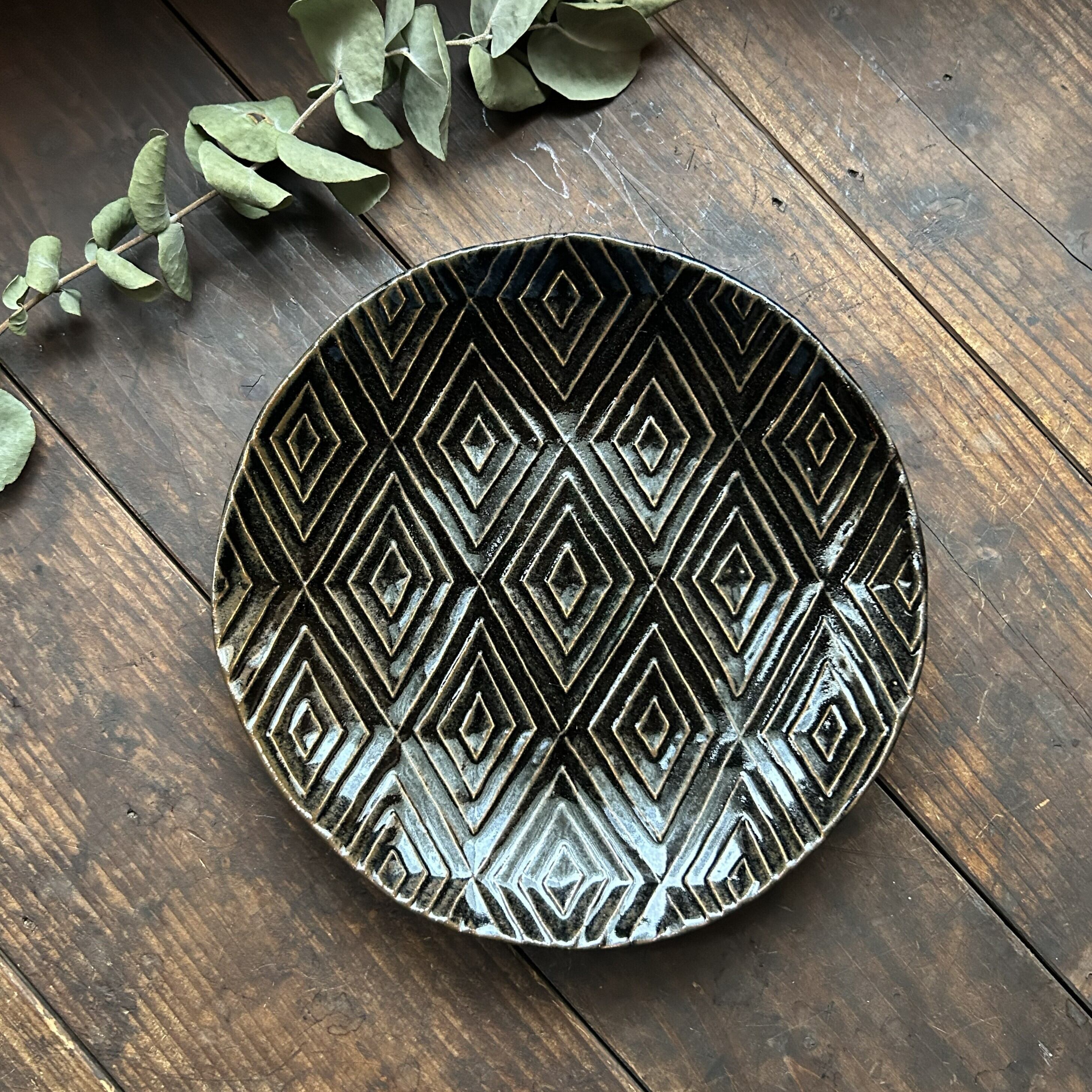 黒に近い深いシックな飴色釉薬に菱文様が素敵な中皿です。やや深みがあります。どんなお料理もかっこよく演出してくれます。光沢があります。