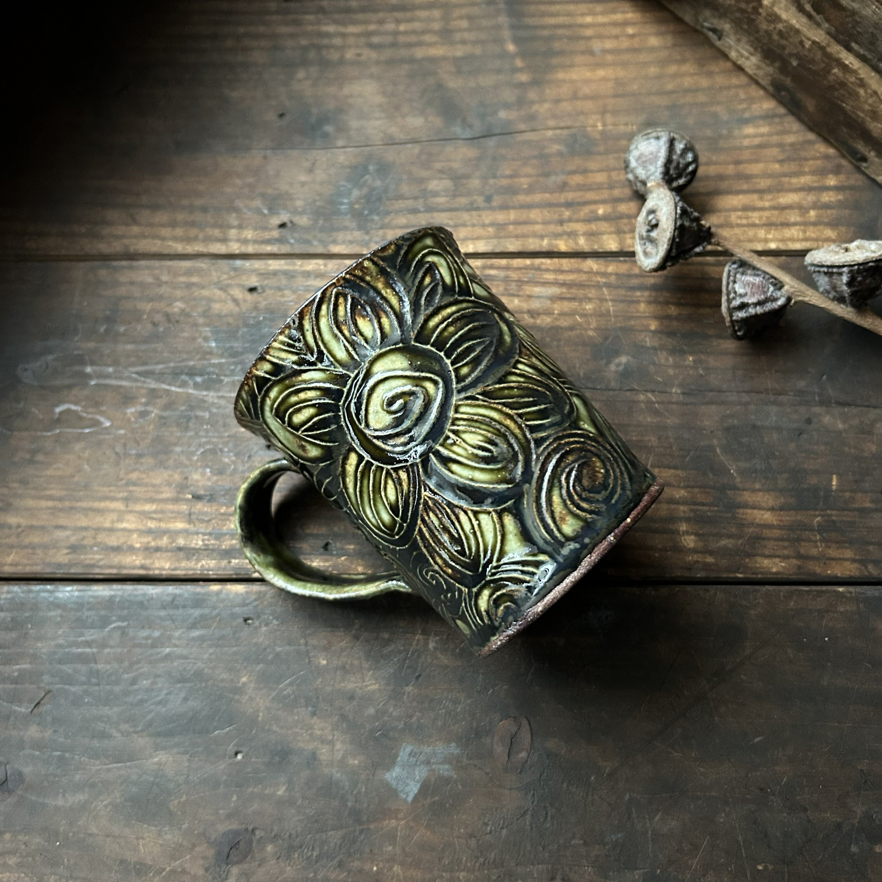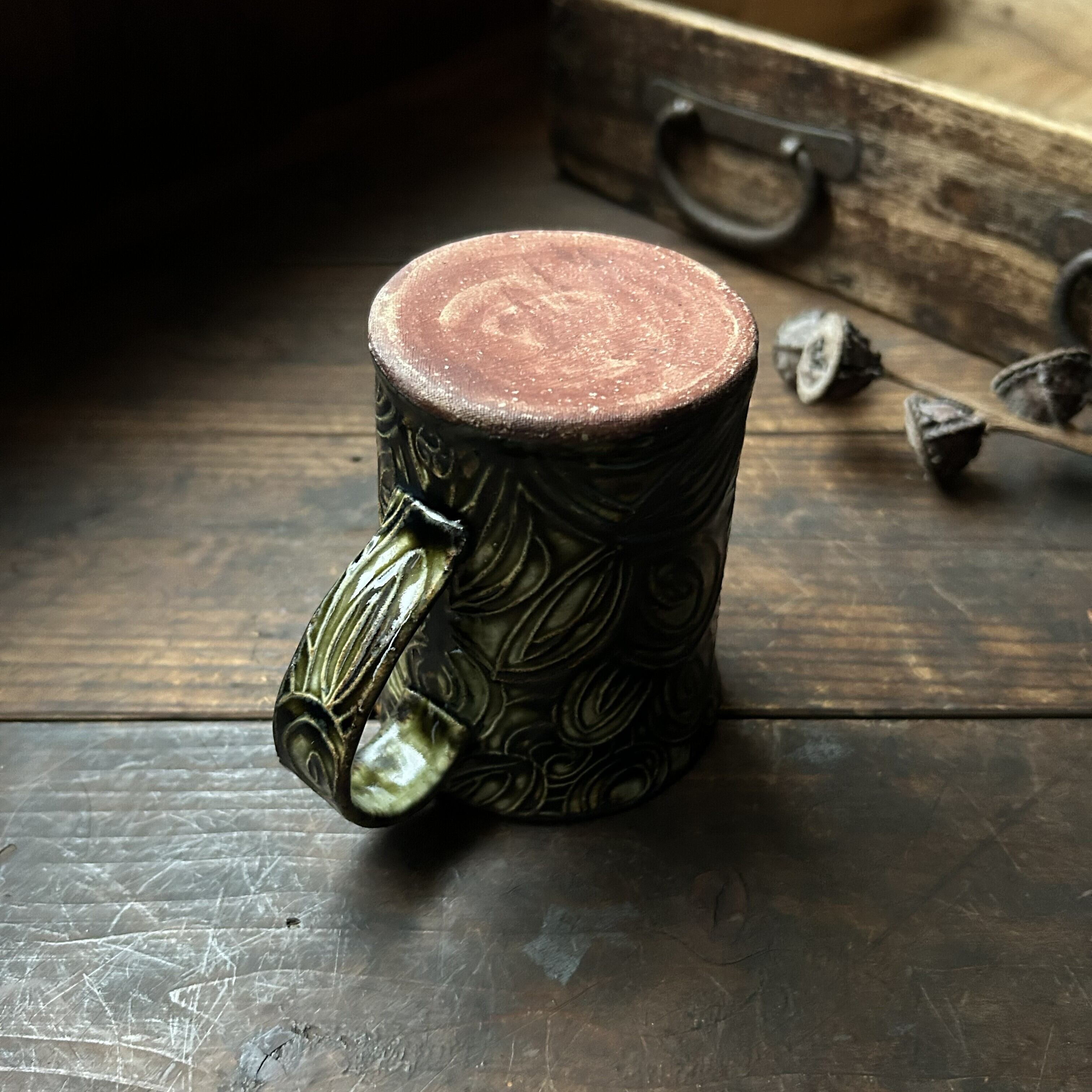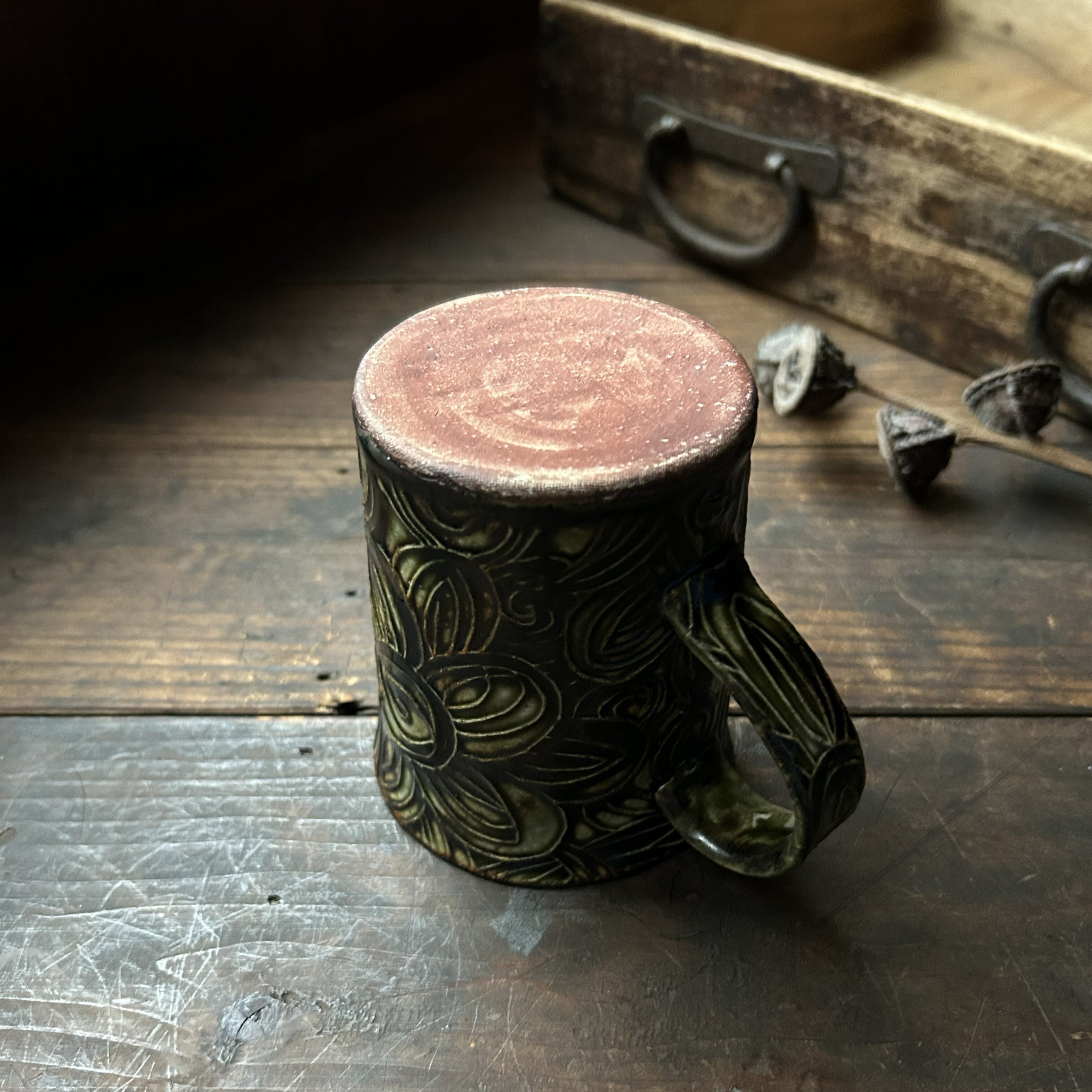個性的なフラワーの刻文が素敵な深緑灰釉のマグカップです。深い緑灰釉で渋みがあり、かっこいい色合いです。光沢があります。