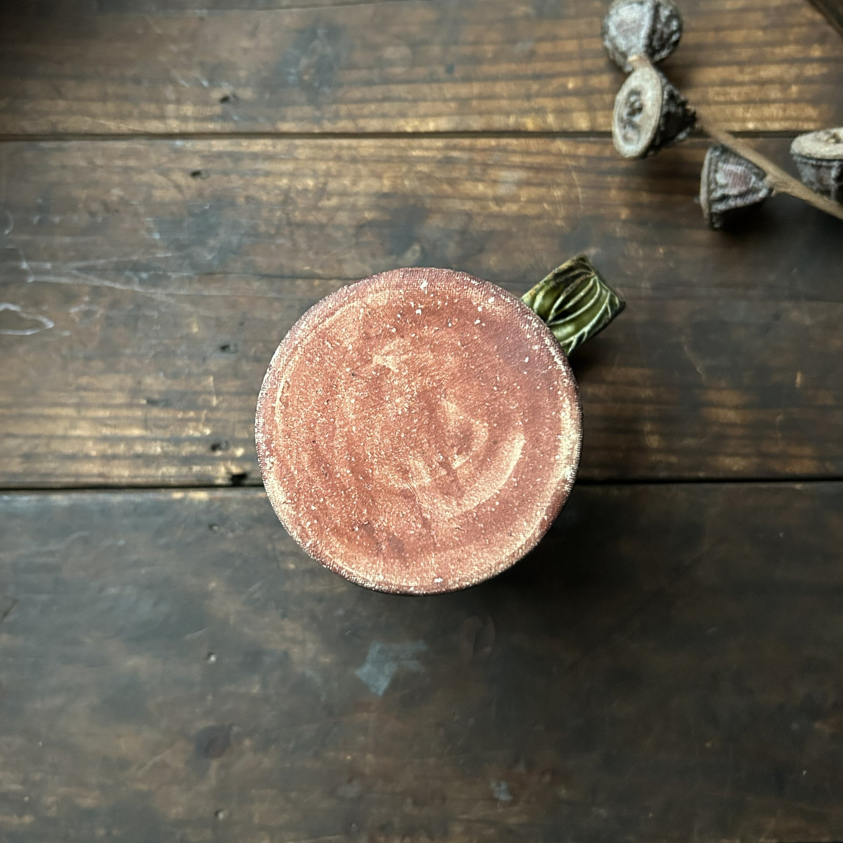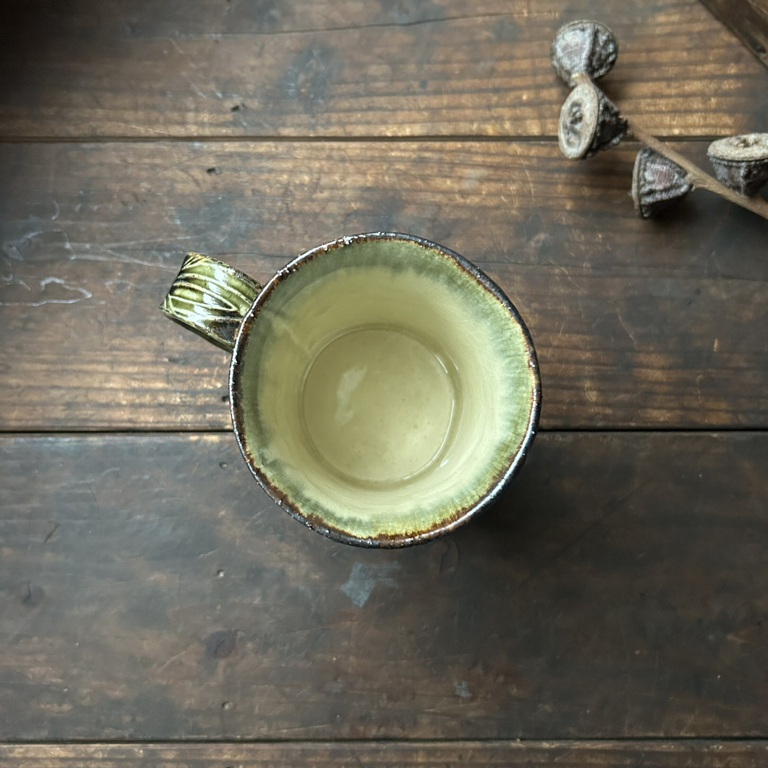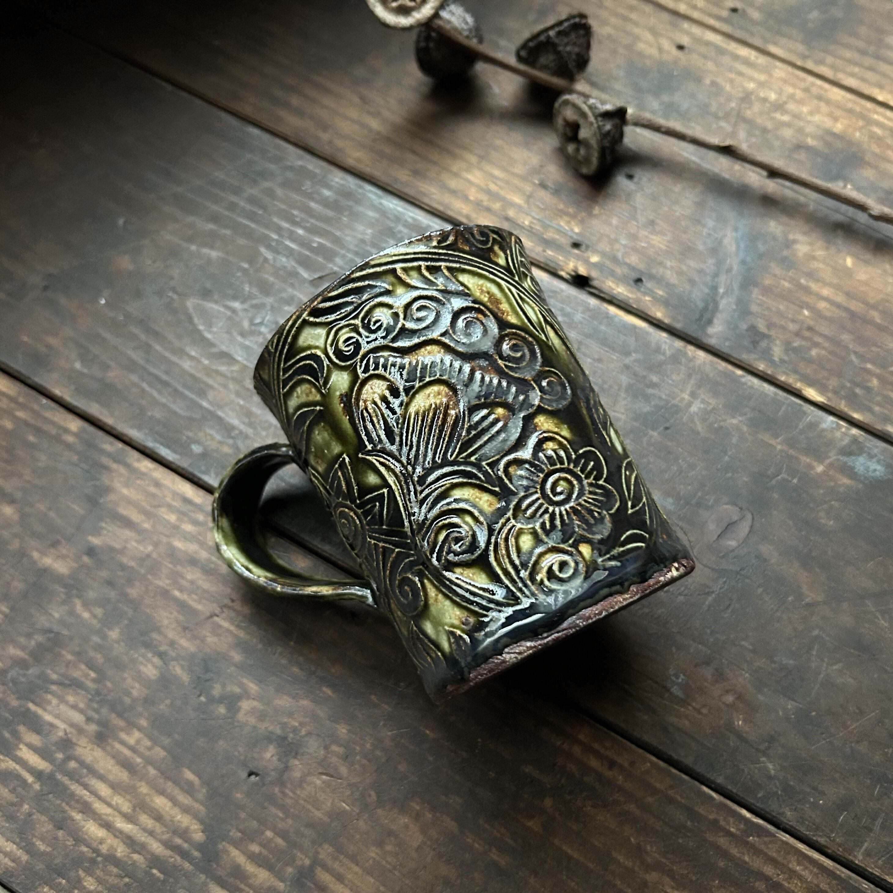 個性的なフラワーの刻文が素敵な深緑灰釉のマグカップです。深い緑灰釉で渋みがあり、かっこいい色合いです。光沢があります。