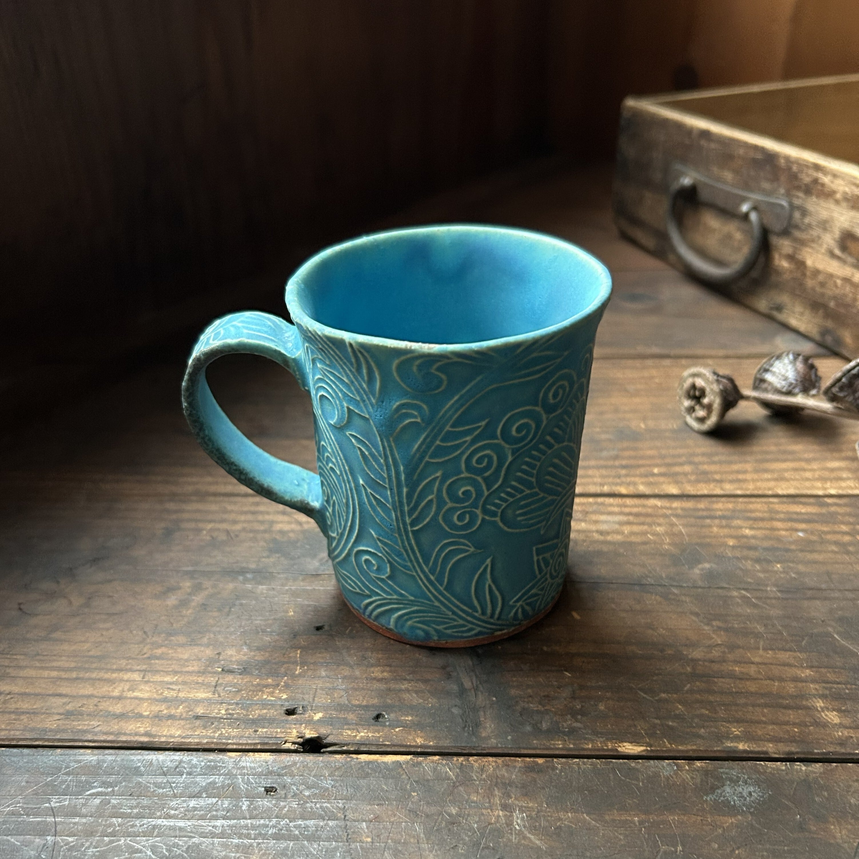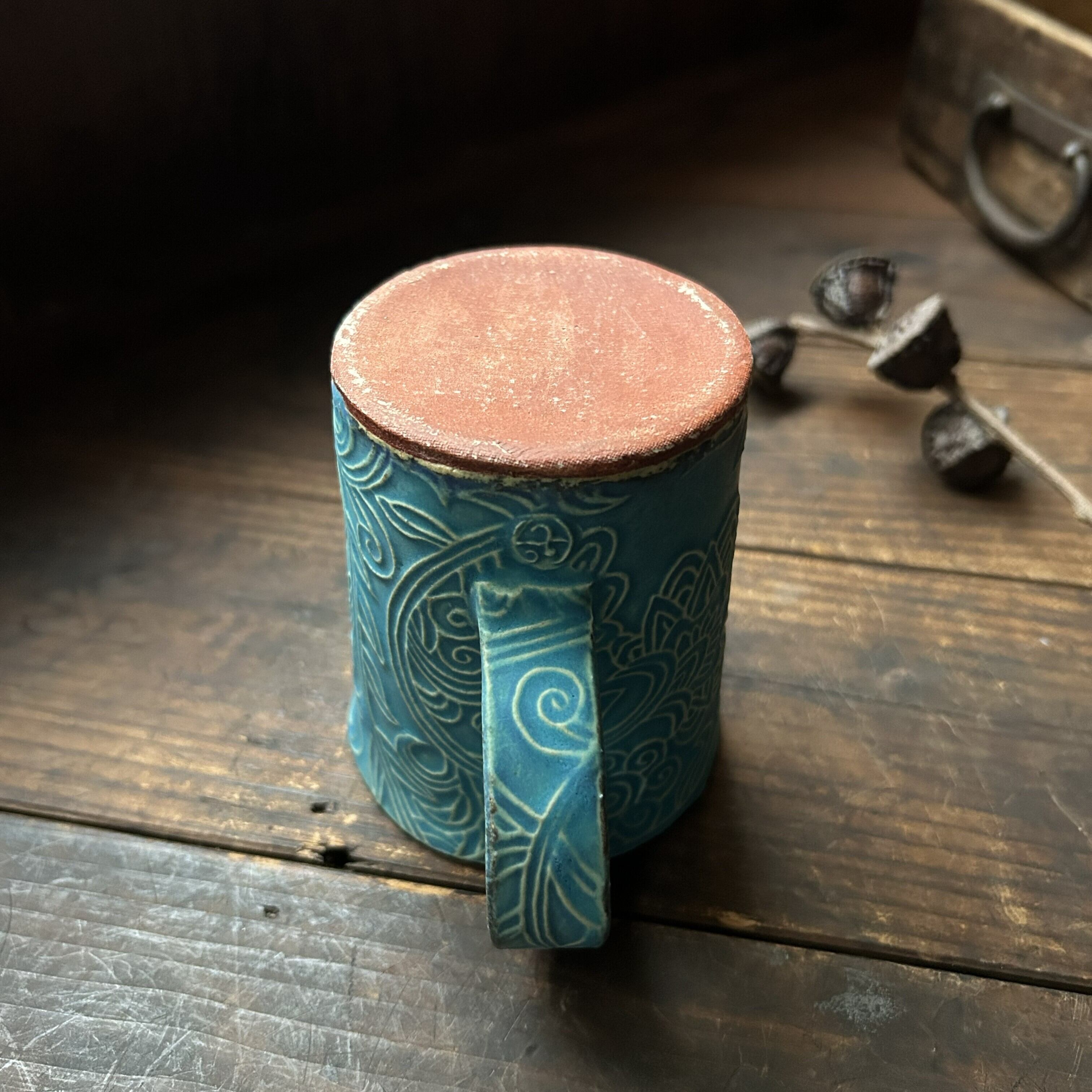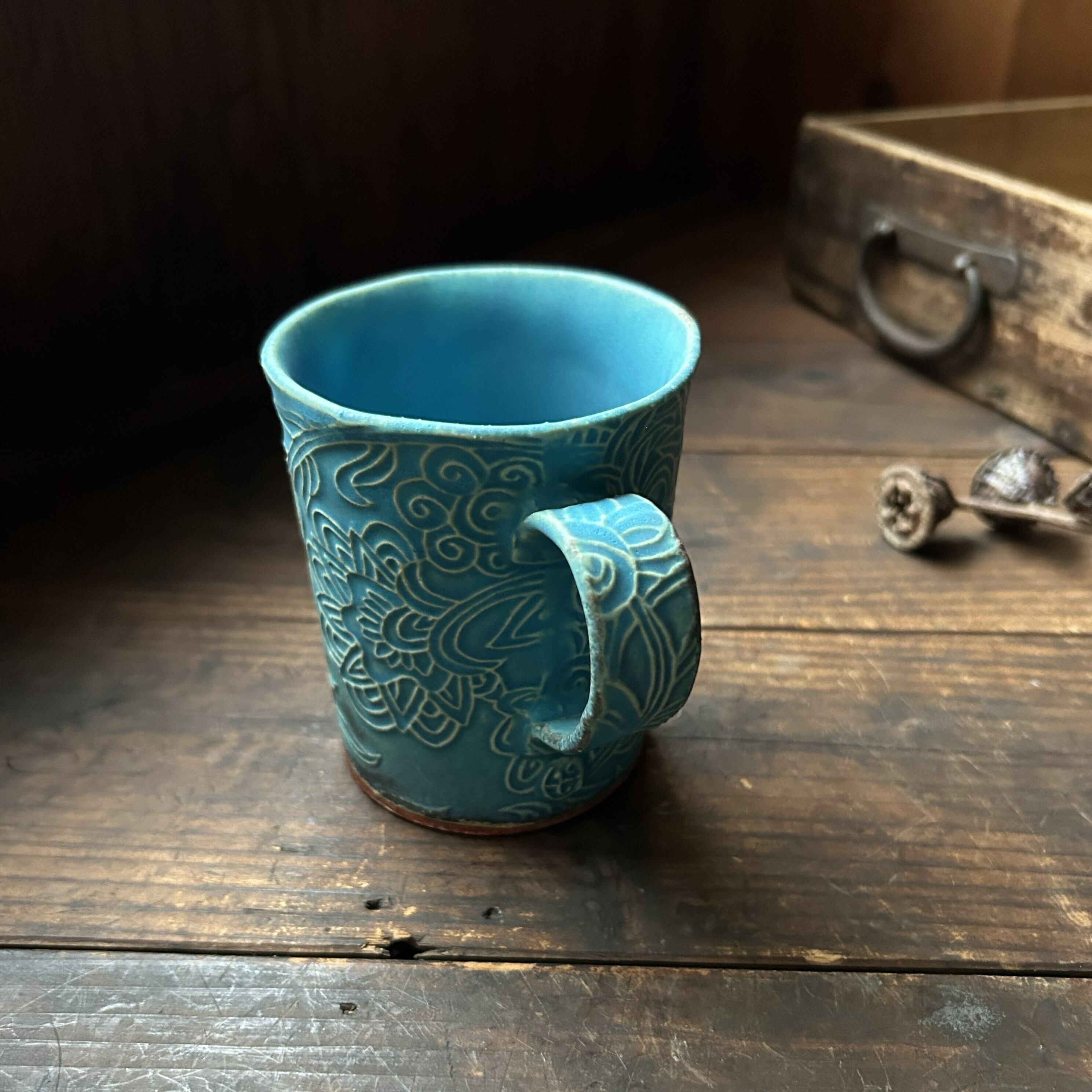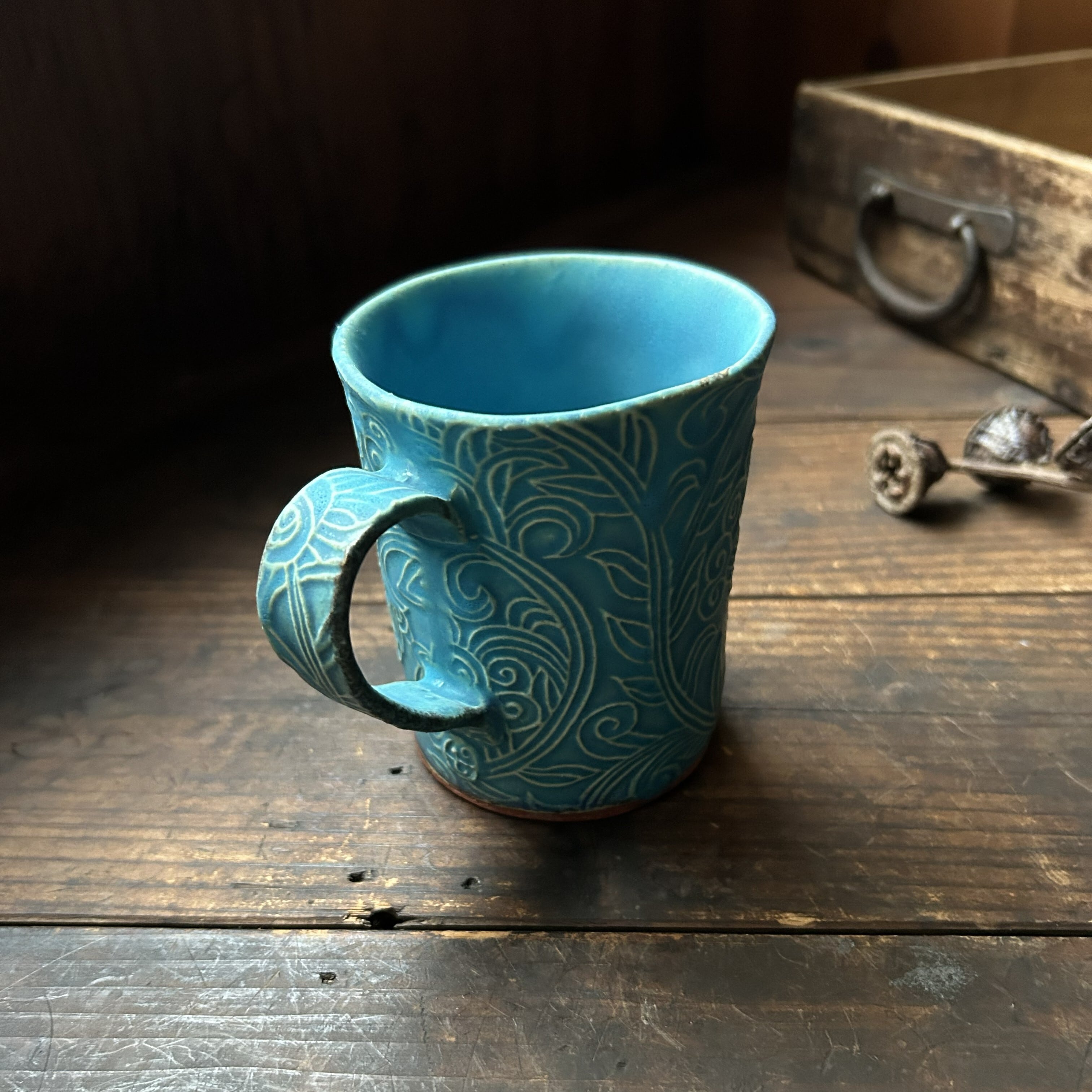 個性的な草の刻文が素敵なターコイズブルーのマグカップ(筒型)です。きれいなお色味の中にもやや渋みがあるかっこいい色合いです。