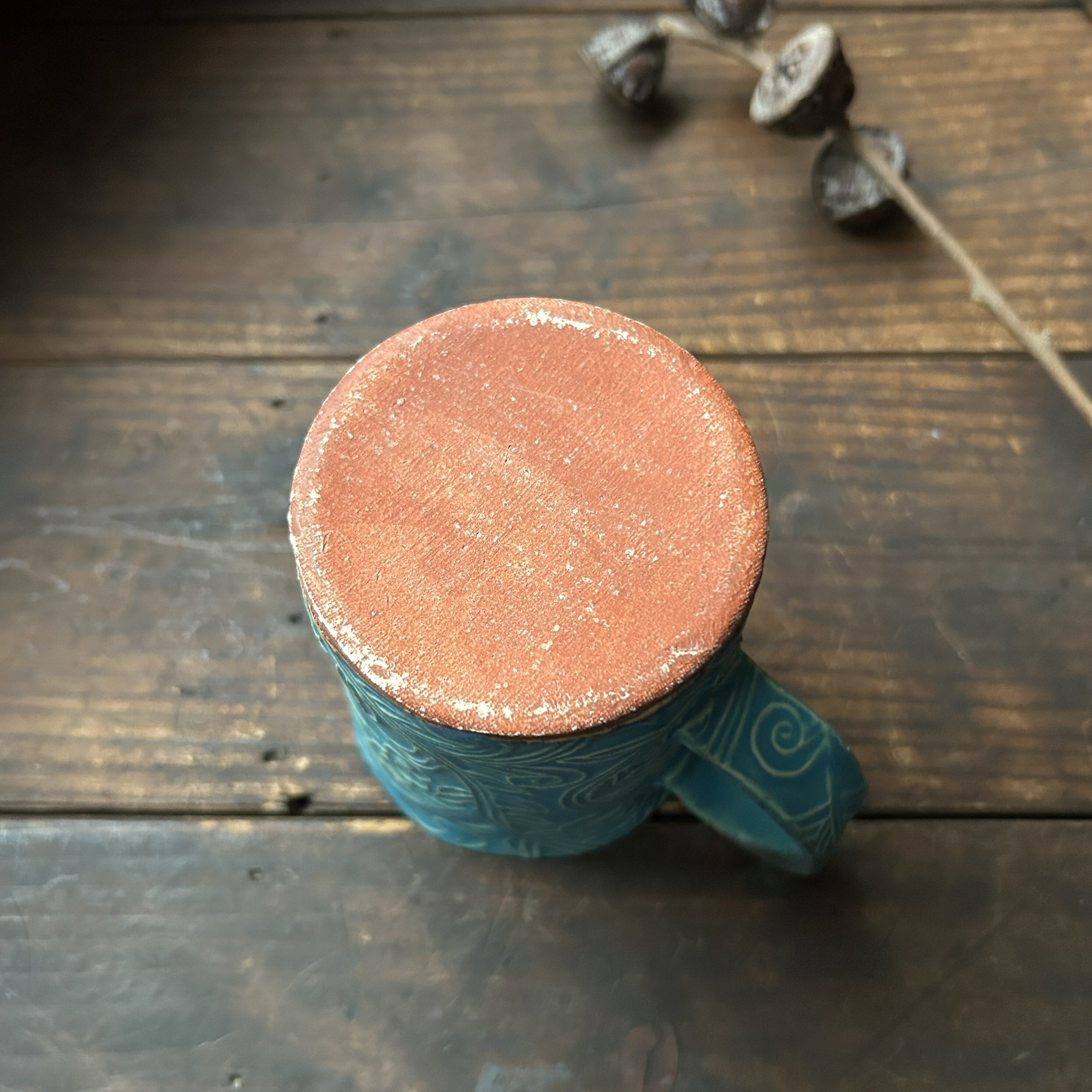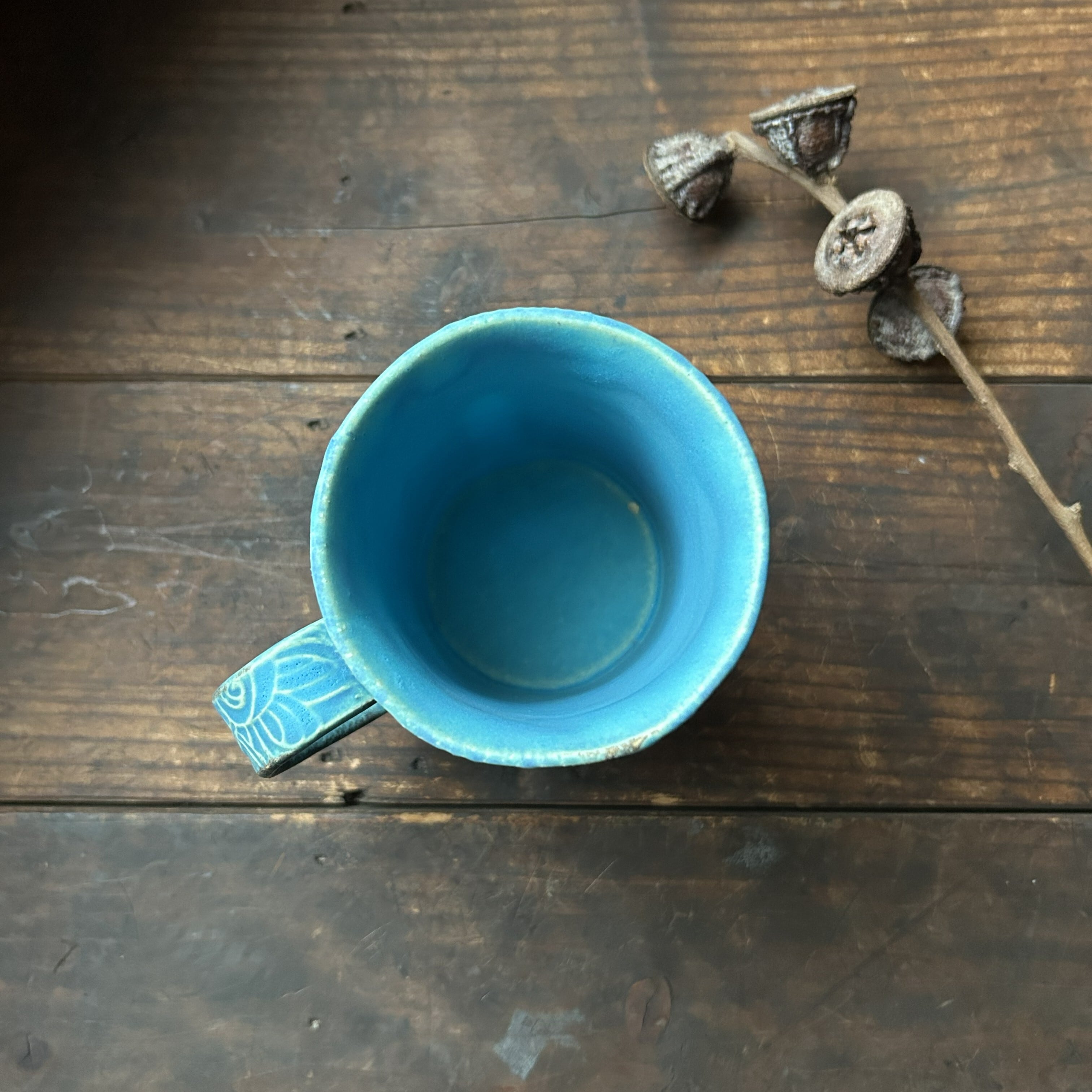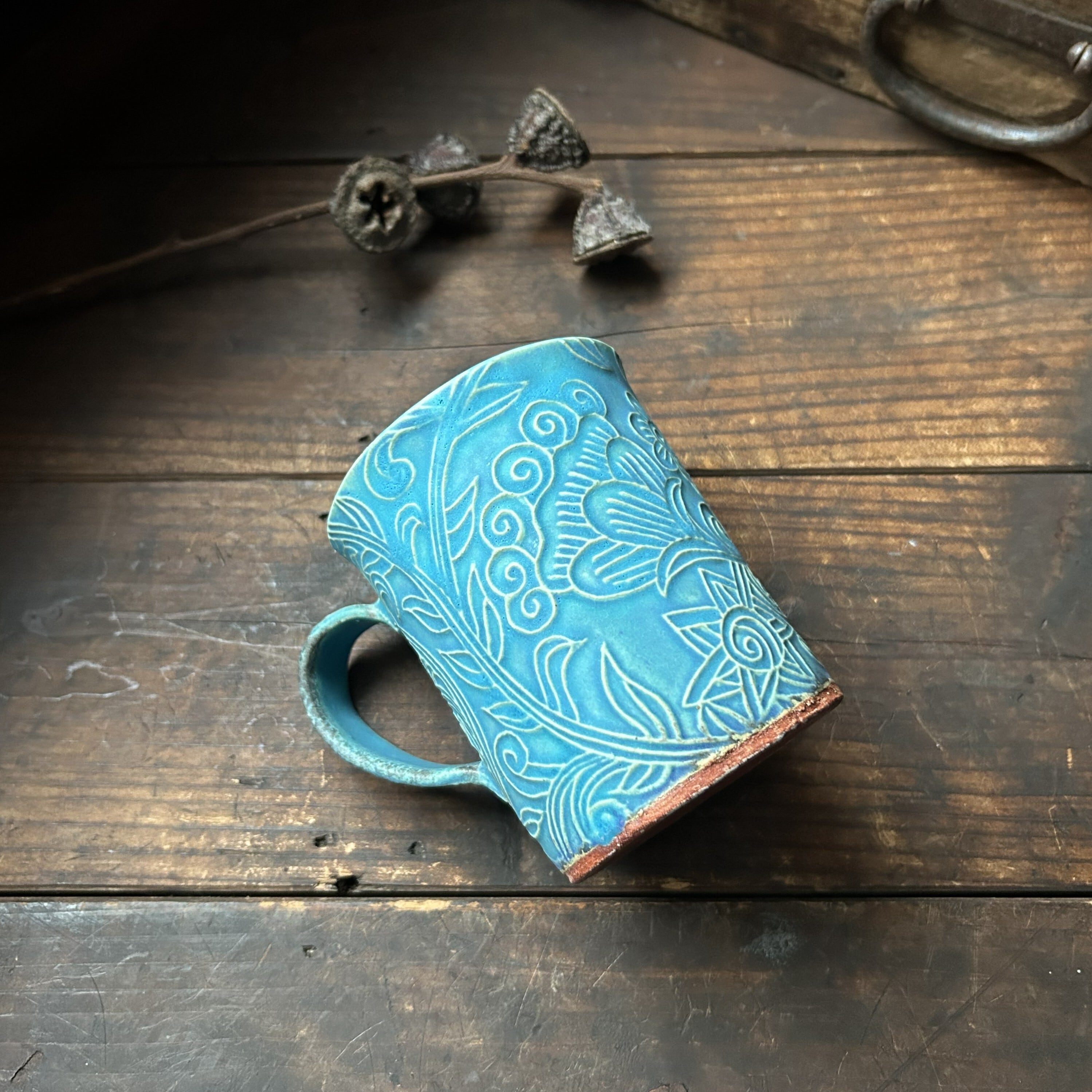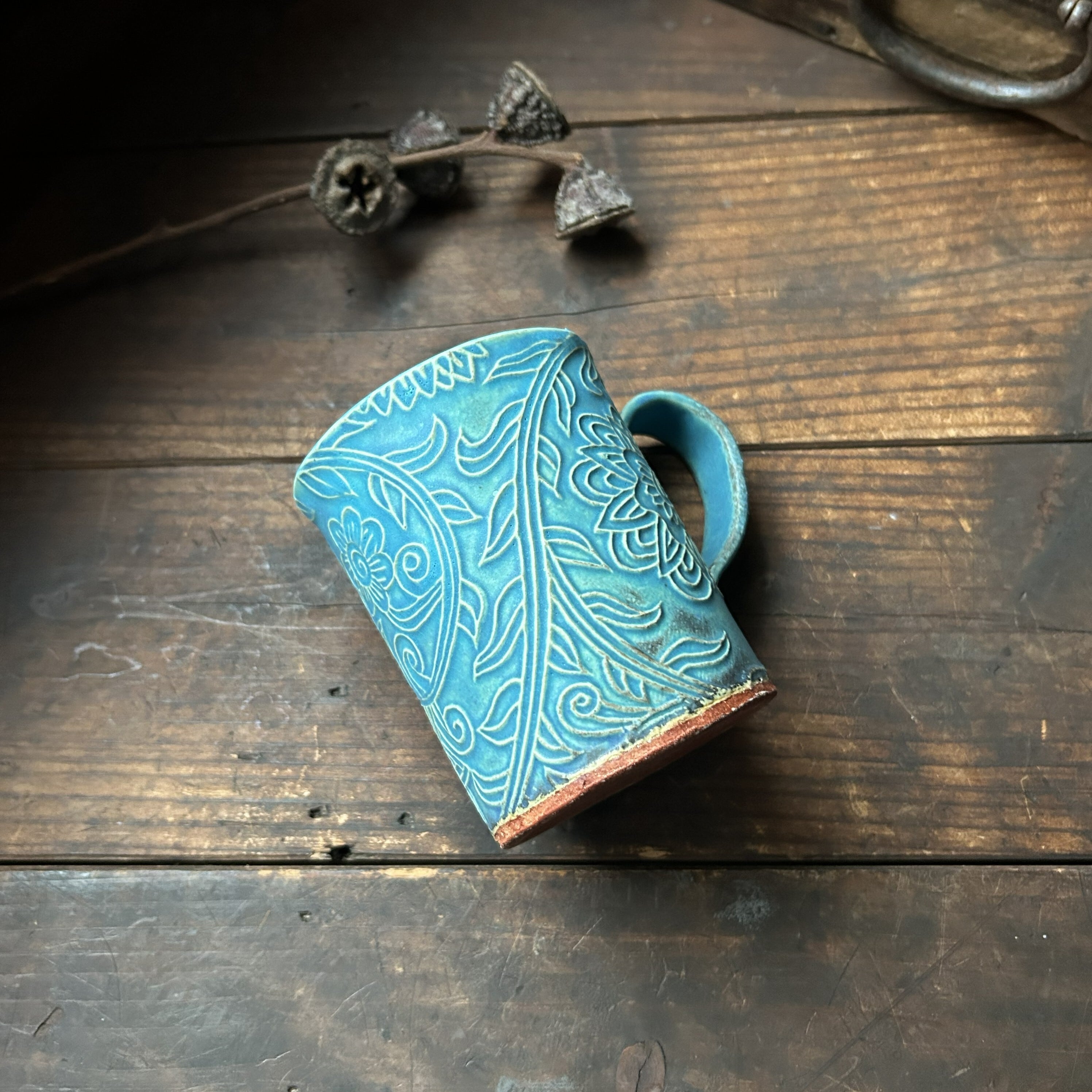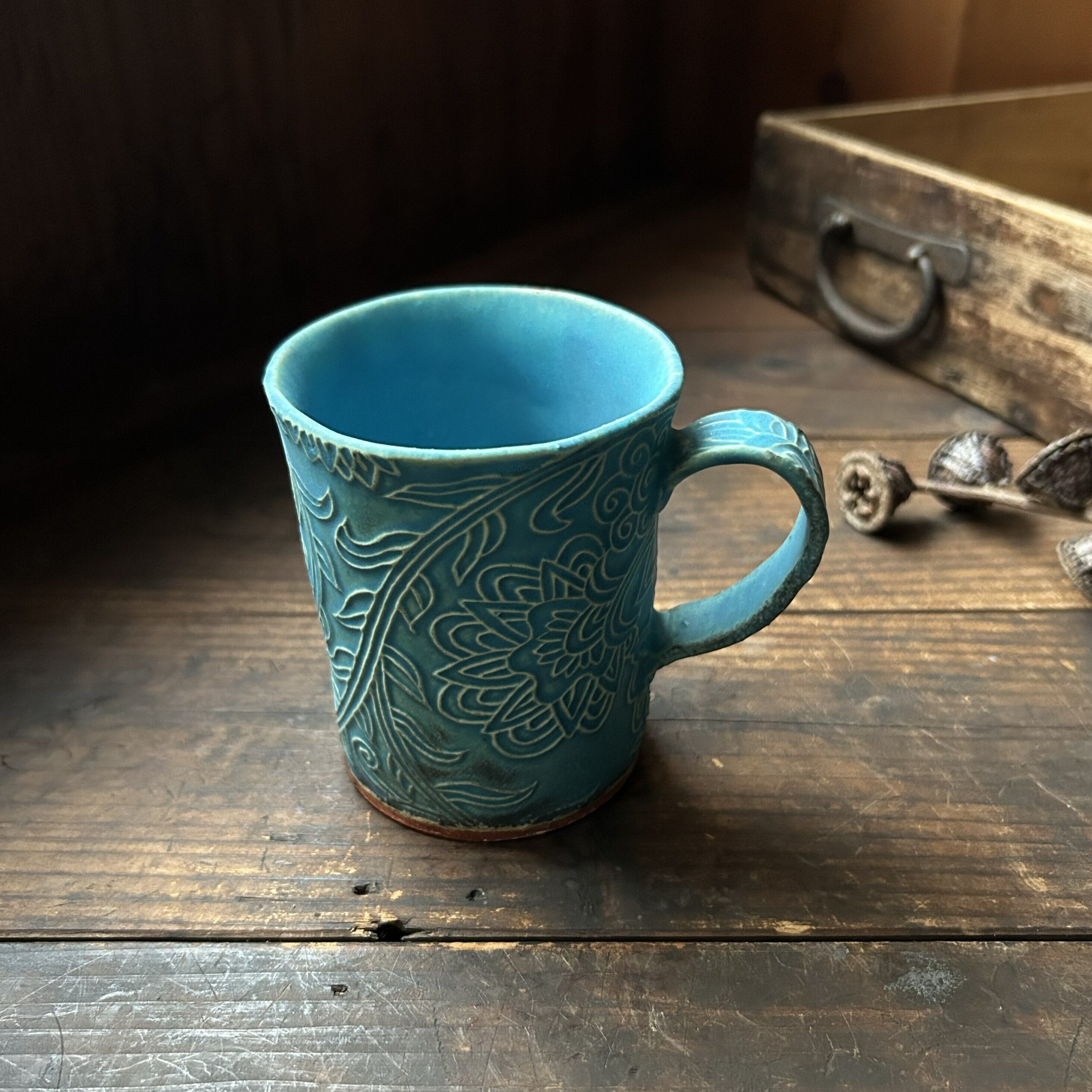 個性的な草の刻文が素敵なターコイズブルーのマグカップ(筒型)です。きれいなお色味の中にもやや渋みがあるかっこいい色合いです。
