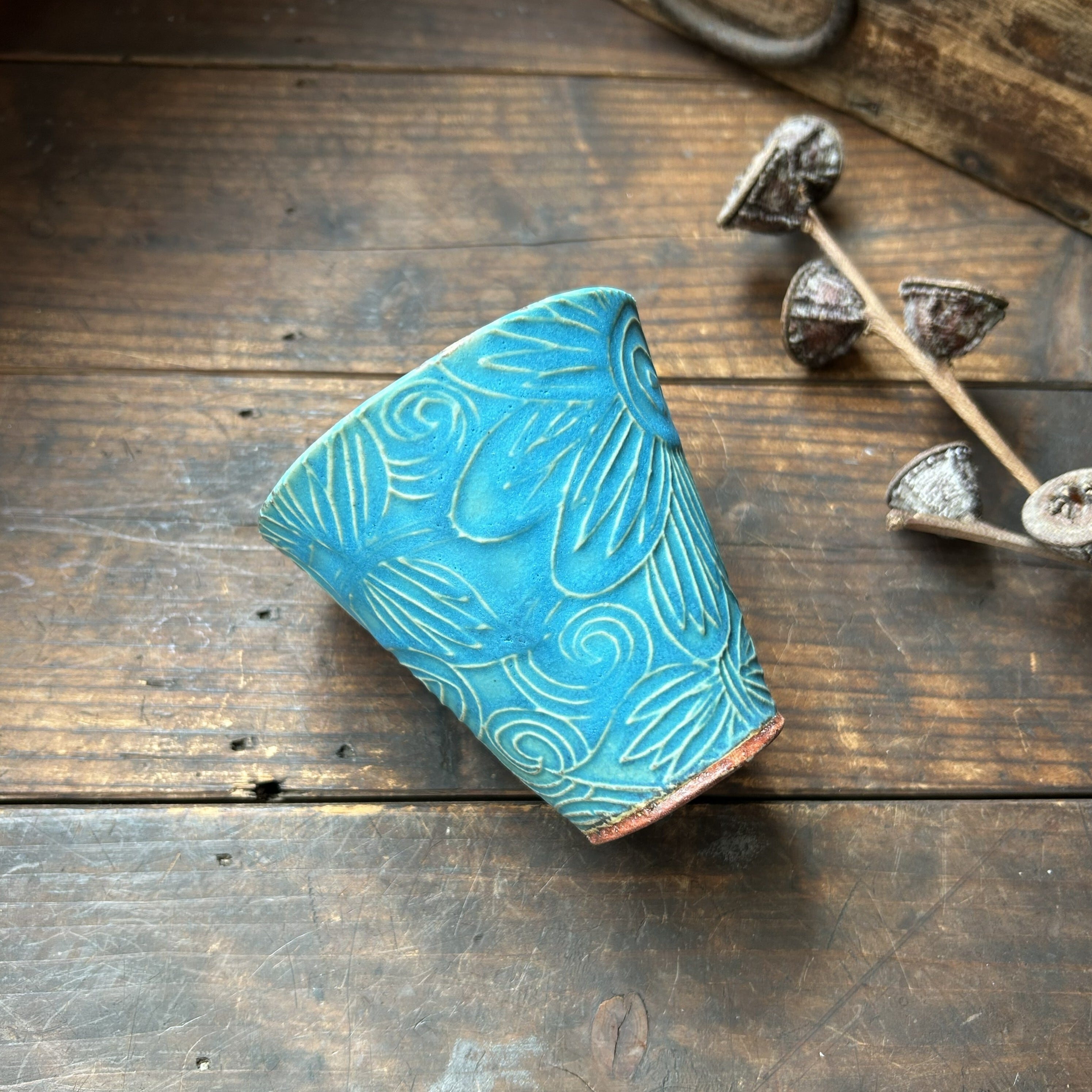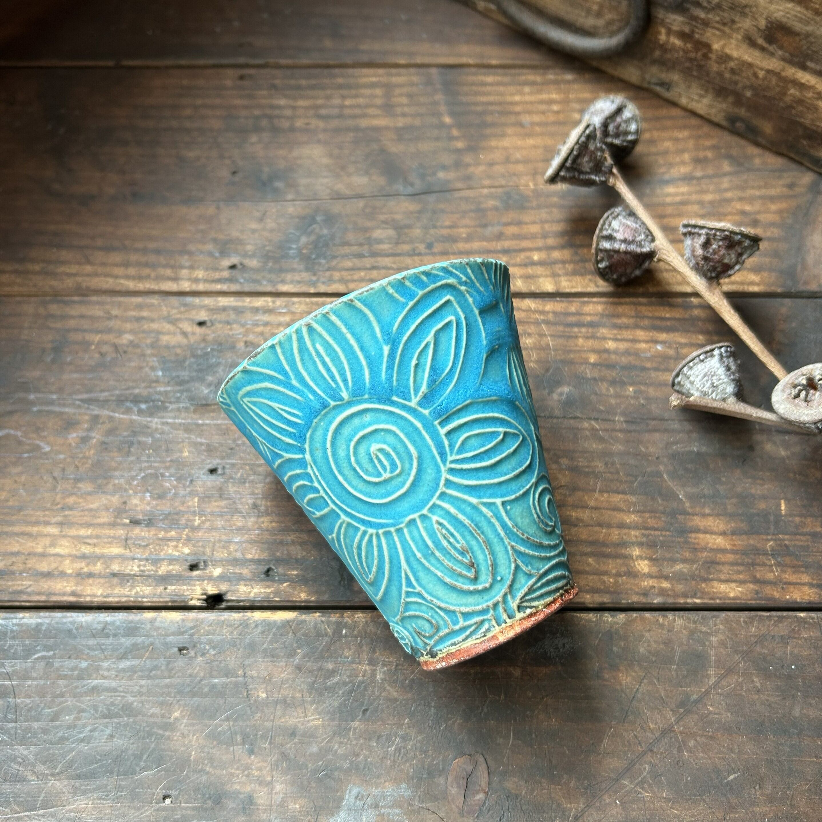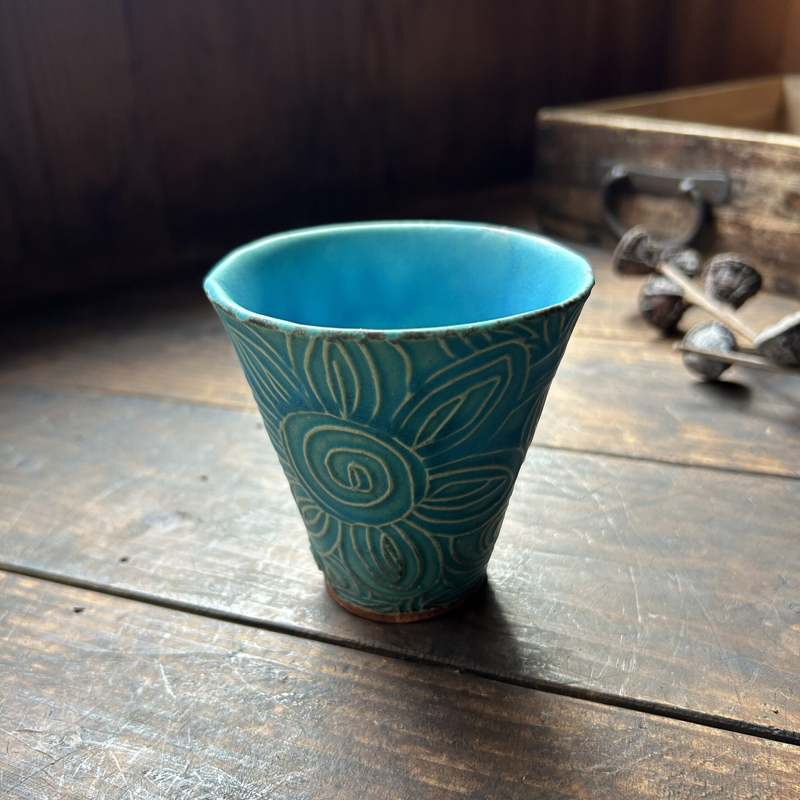 きれいなターコイズブルーに個性豊かなフラワーの刻文が入ったフリーカップです。いつものティーブレイクにさわやかな彩りをプラスしてくれます。