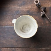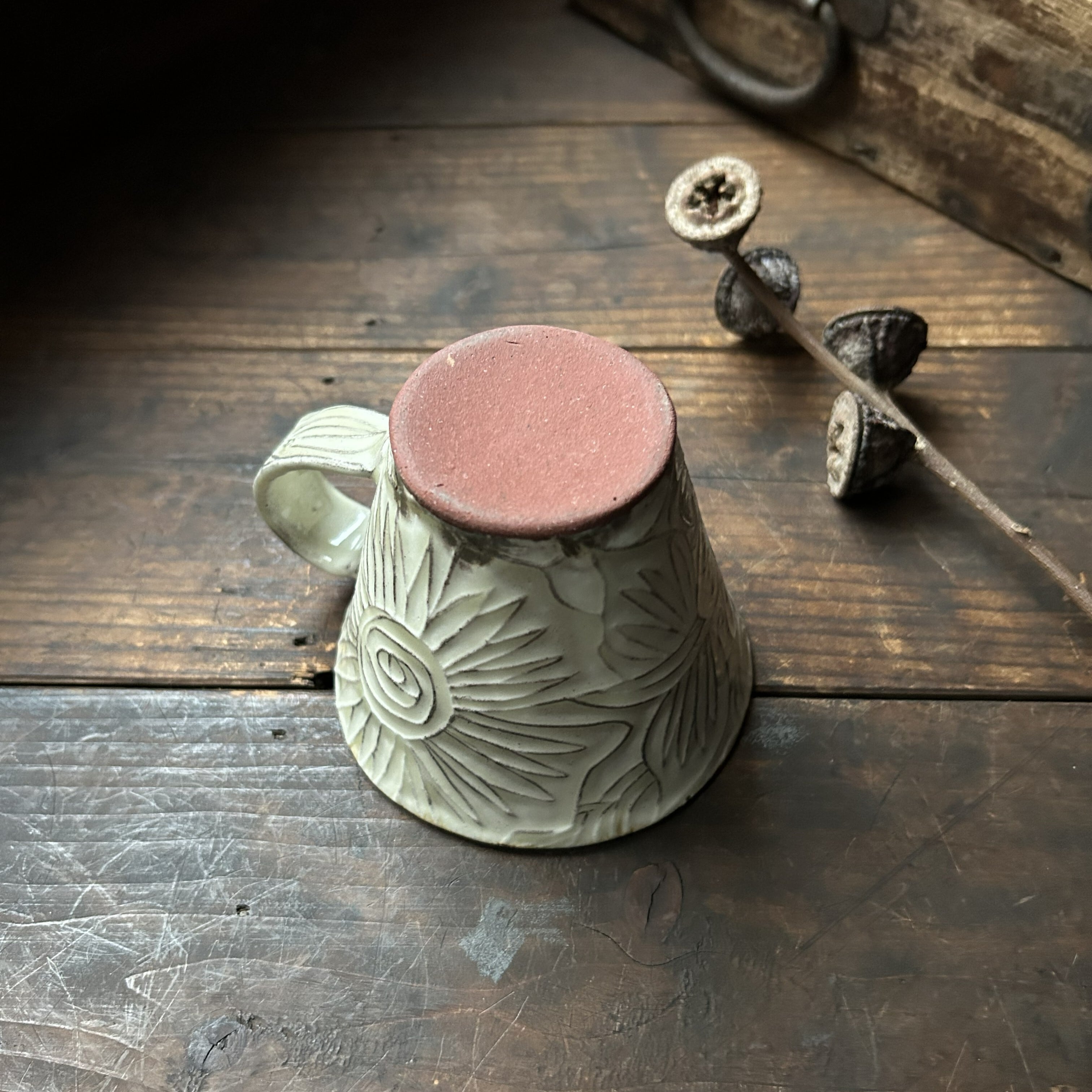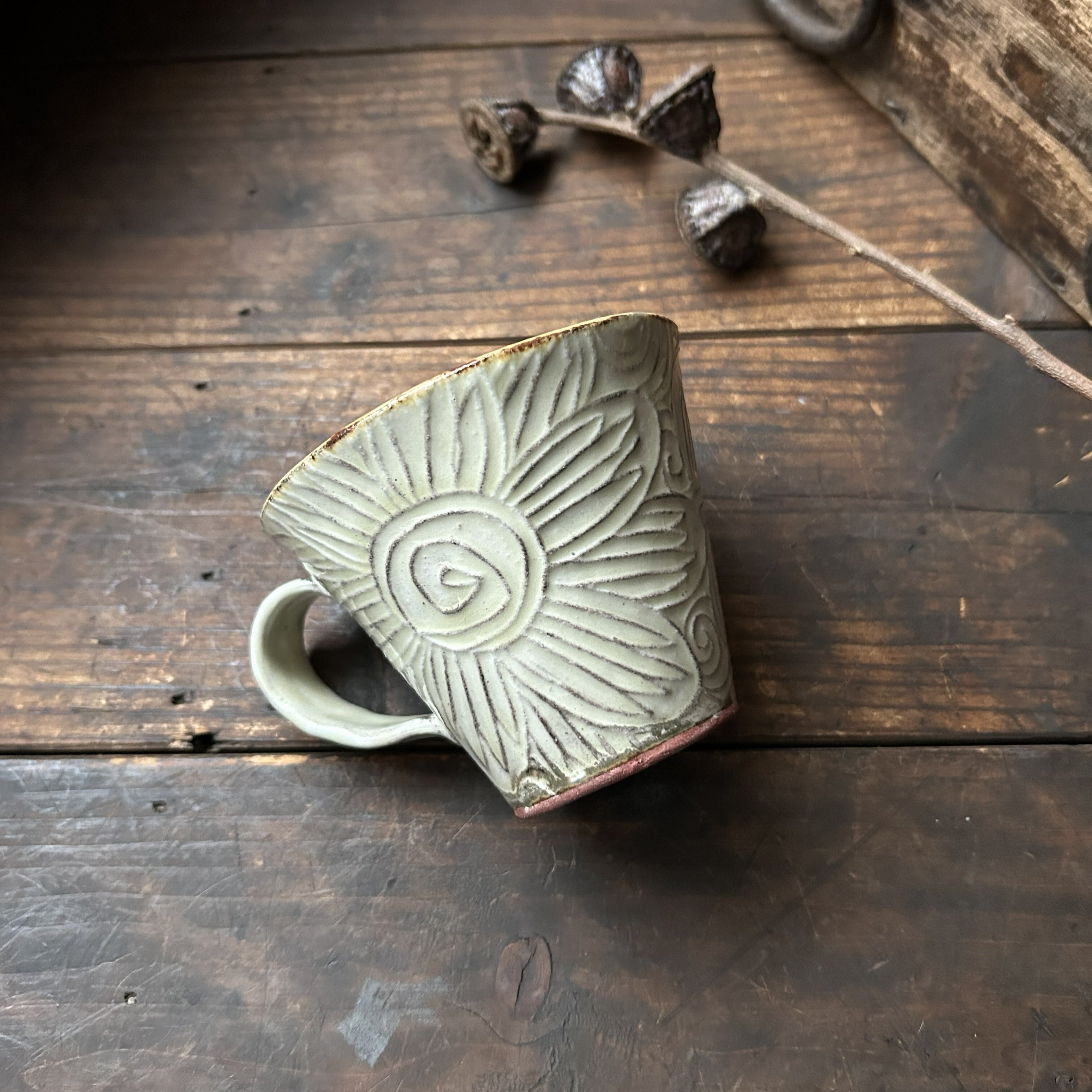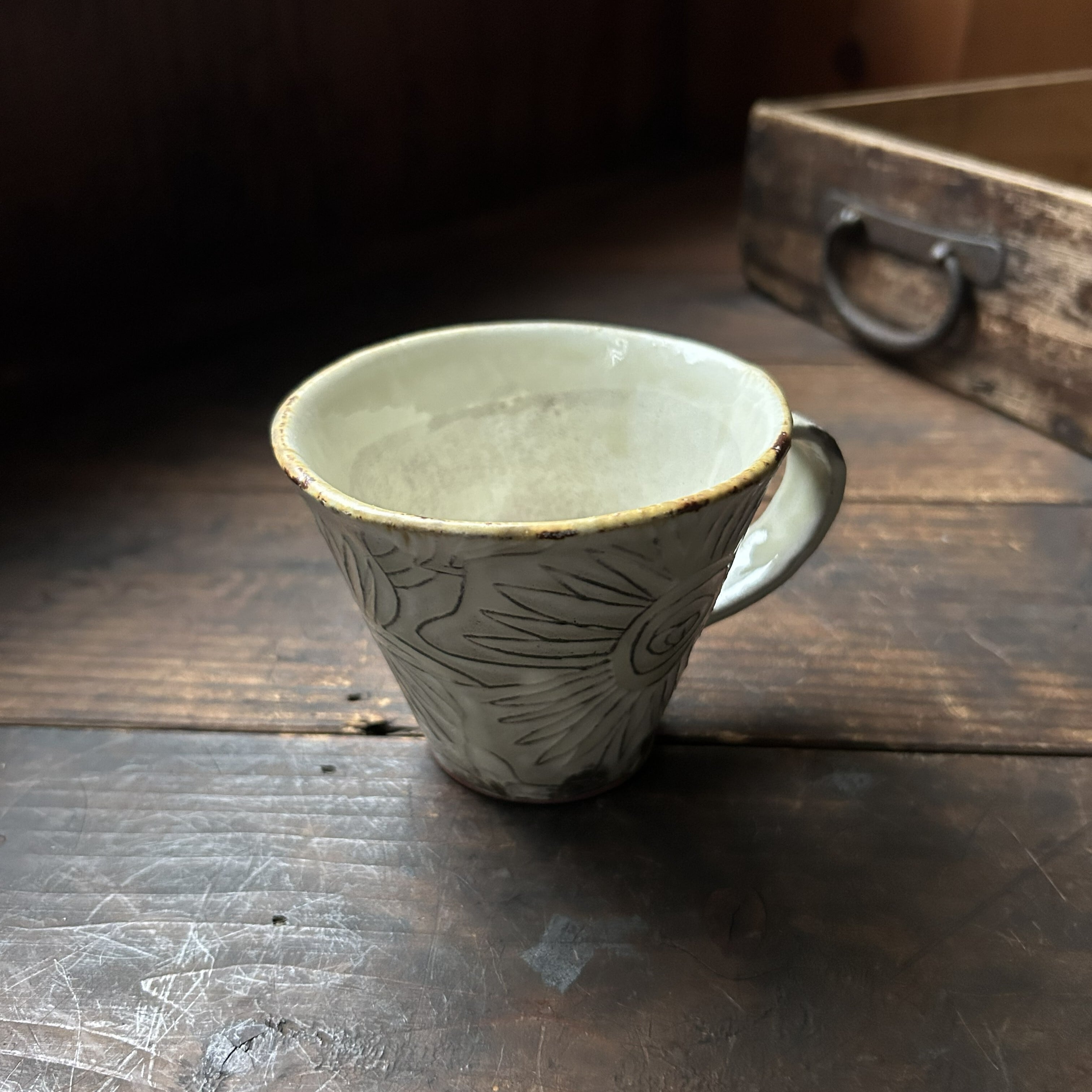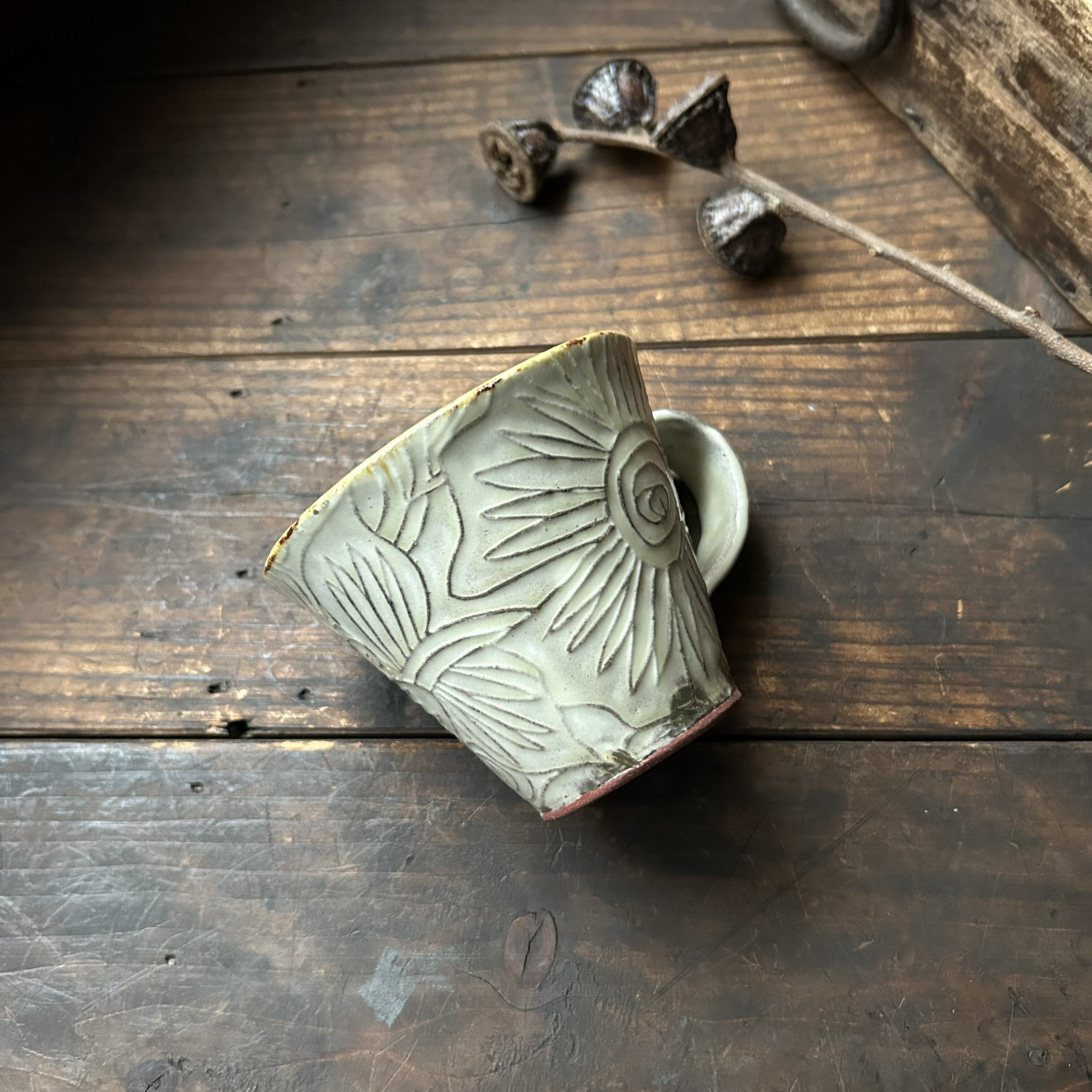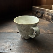 個性豊かなフラワーの刻文が素敵なアイボリー色のマグカップです。いつものティーブレイクに彩りをプラスしてくれます。光沢があります。