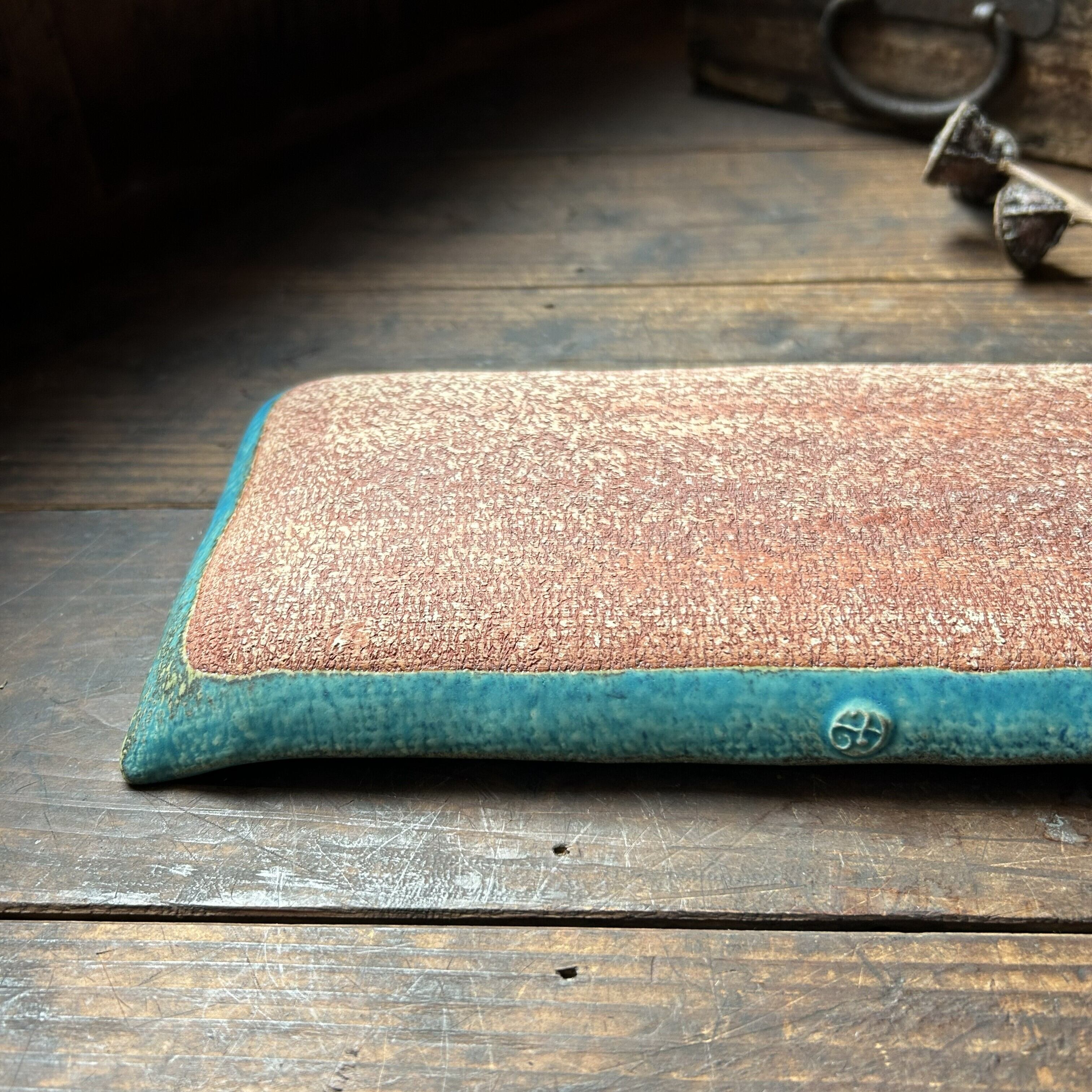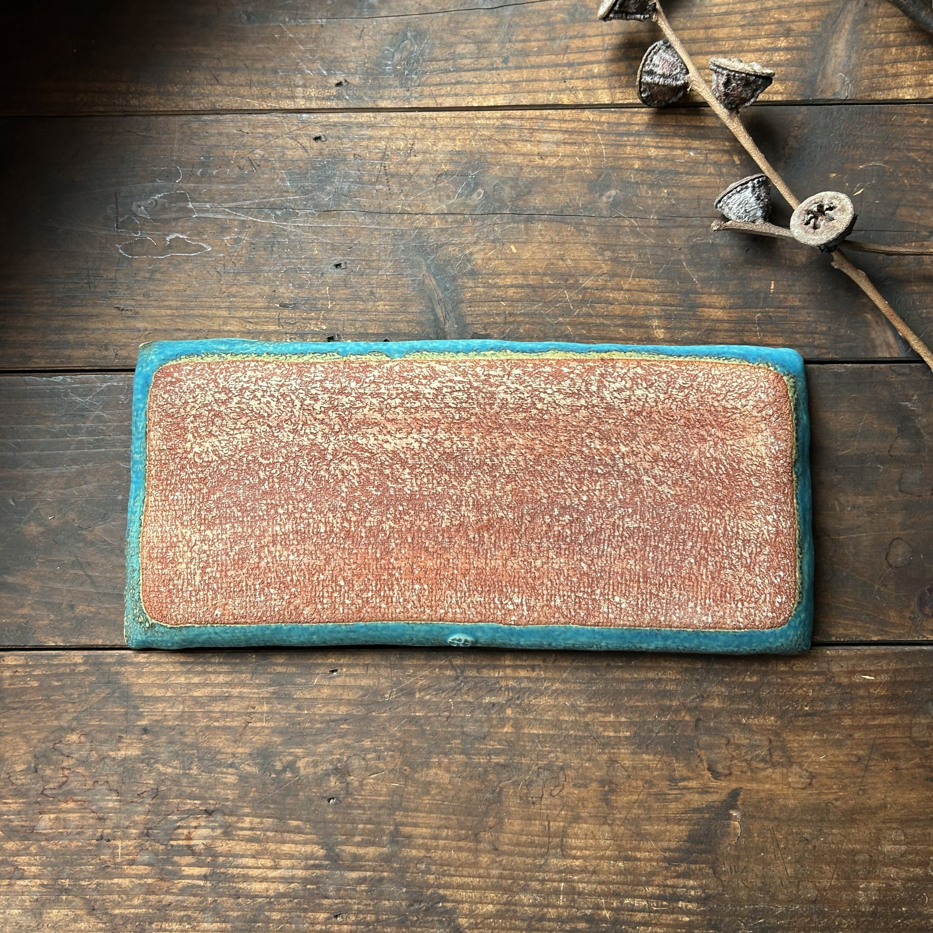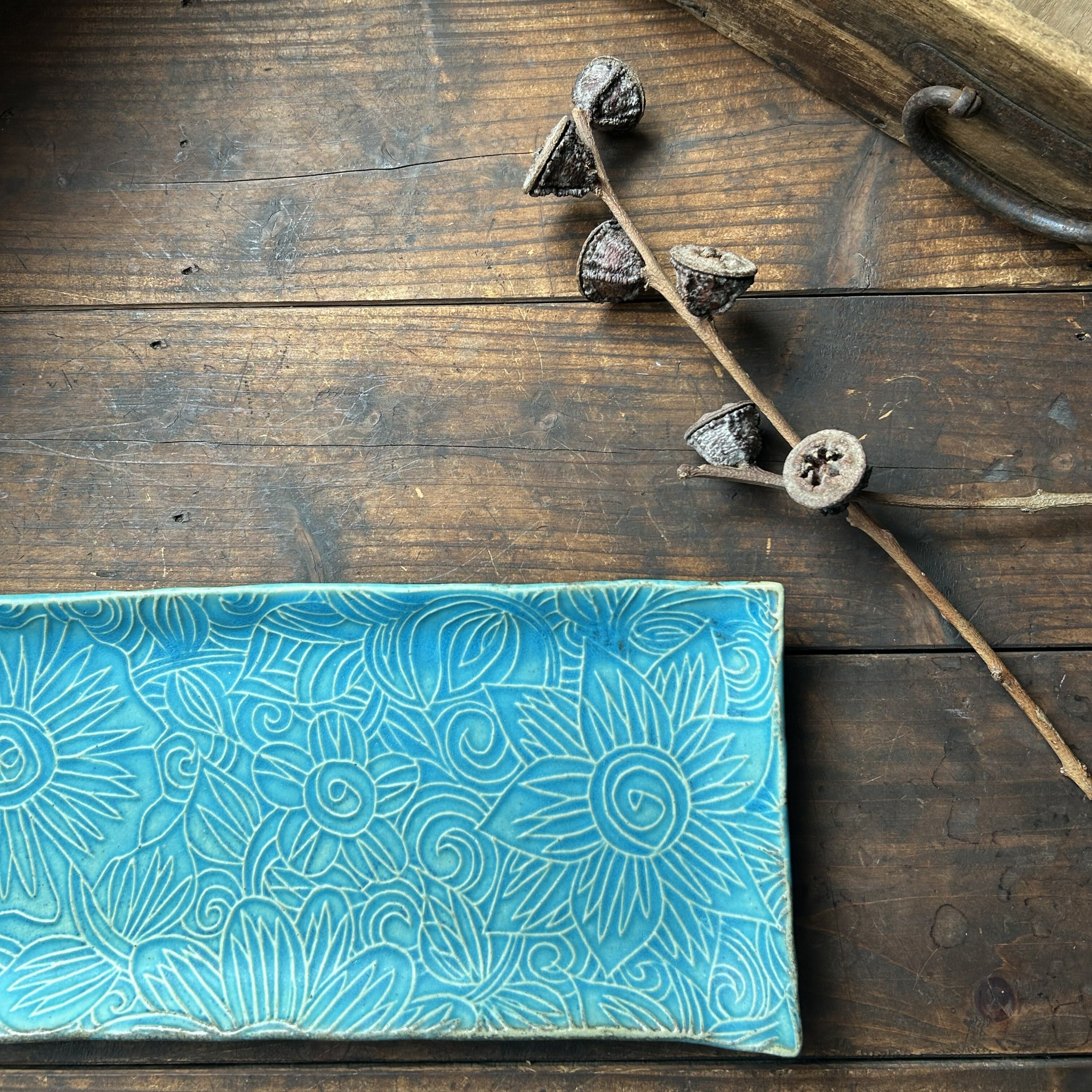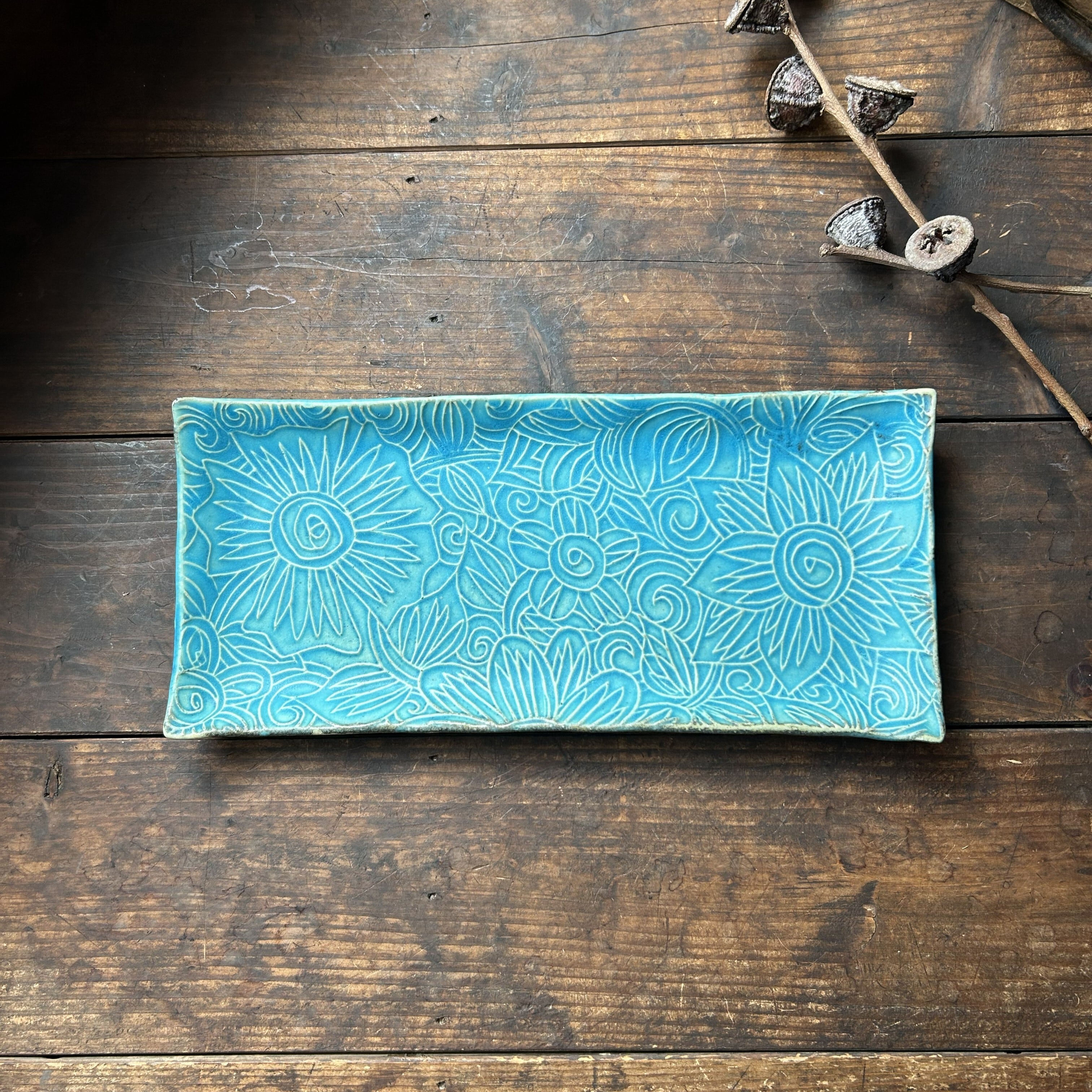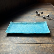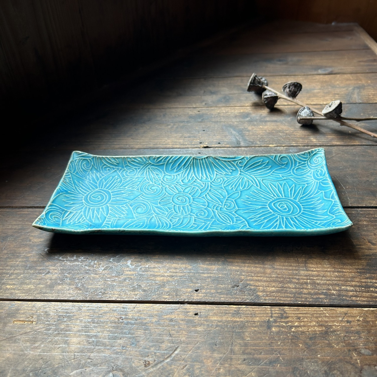 きれいなターコイズブルーに個性豊かなフラワーの刻文が入った細長皿です。いつもの食卓に爽やかな彩りを添えくれます。