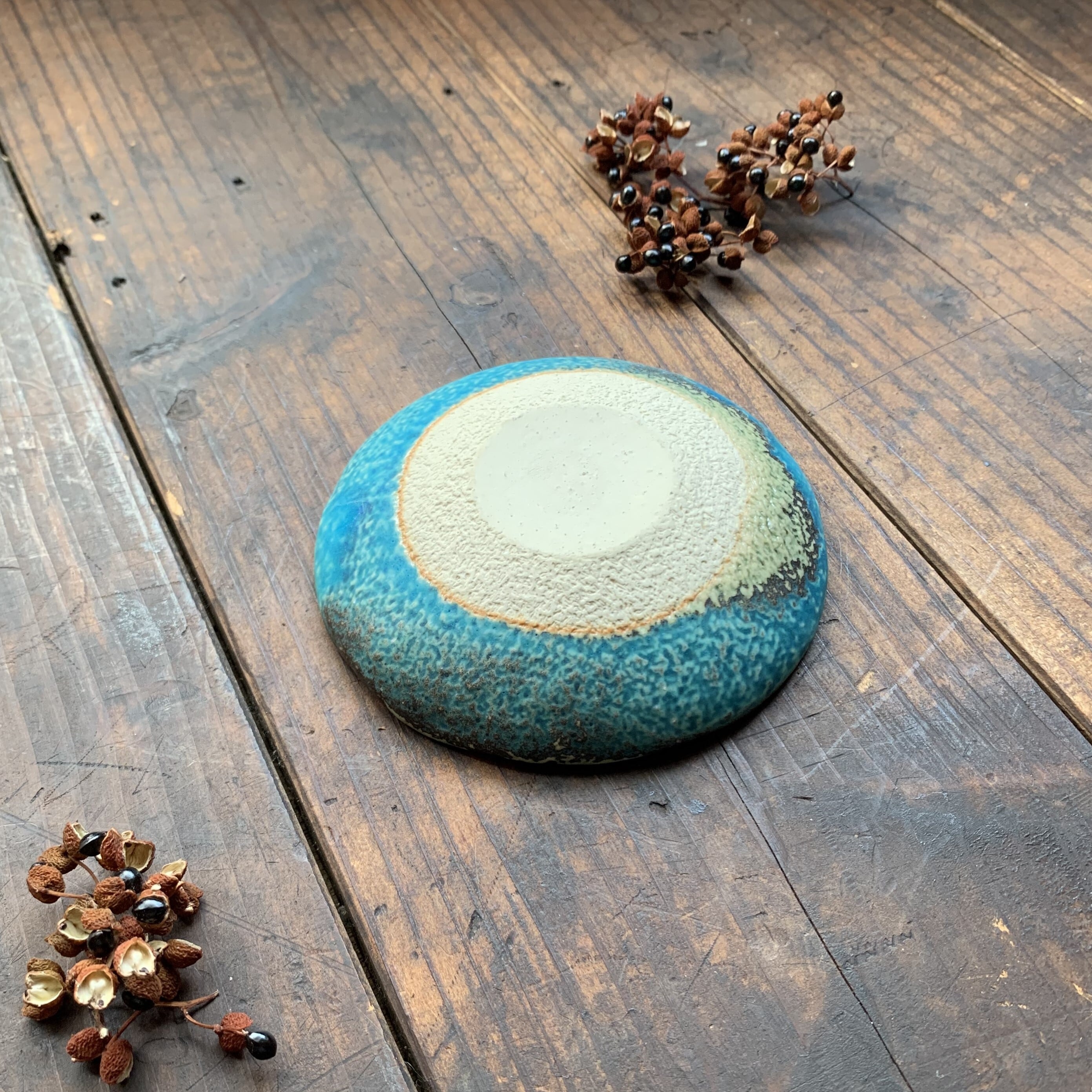 きれいなターコイズブルーに個性豊かな波の刻文が入った豆皿です。いつもの食卓に彩りをプラスしてくれます。