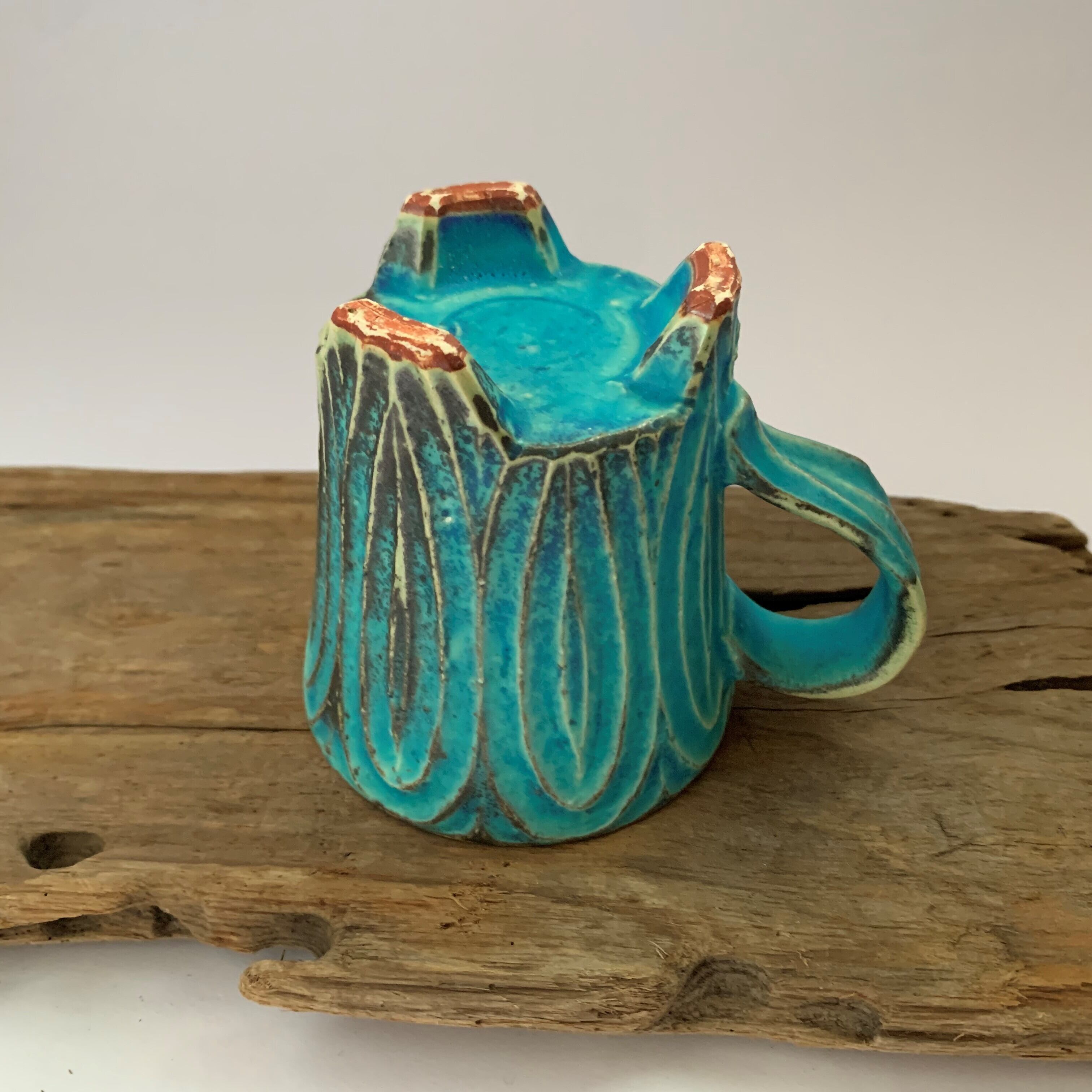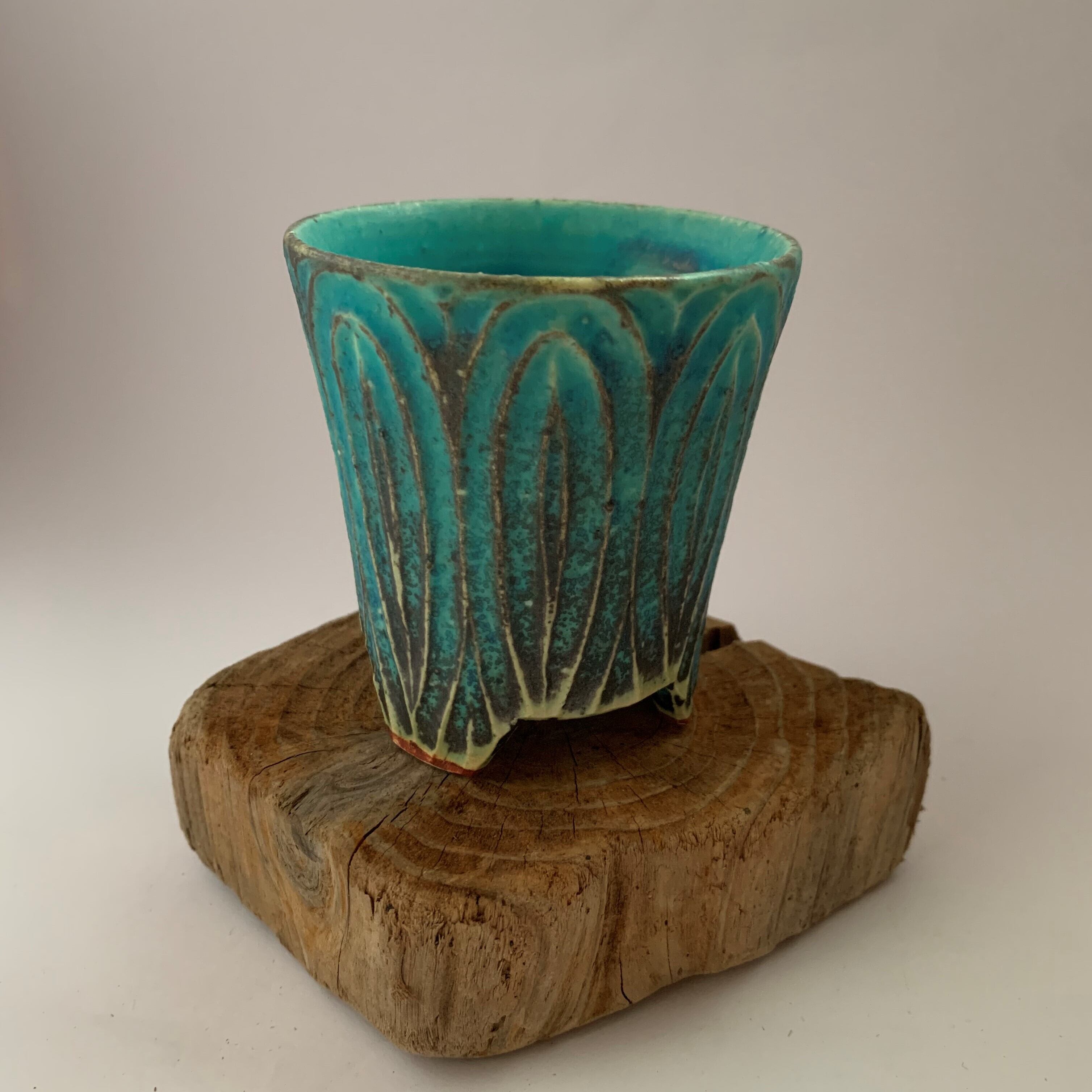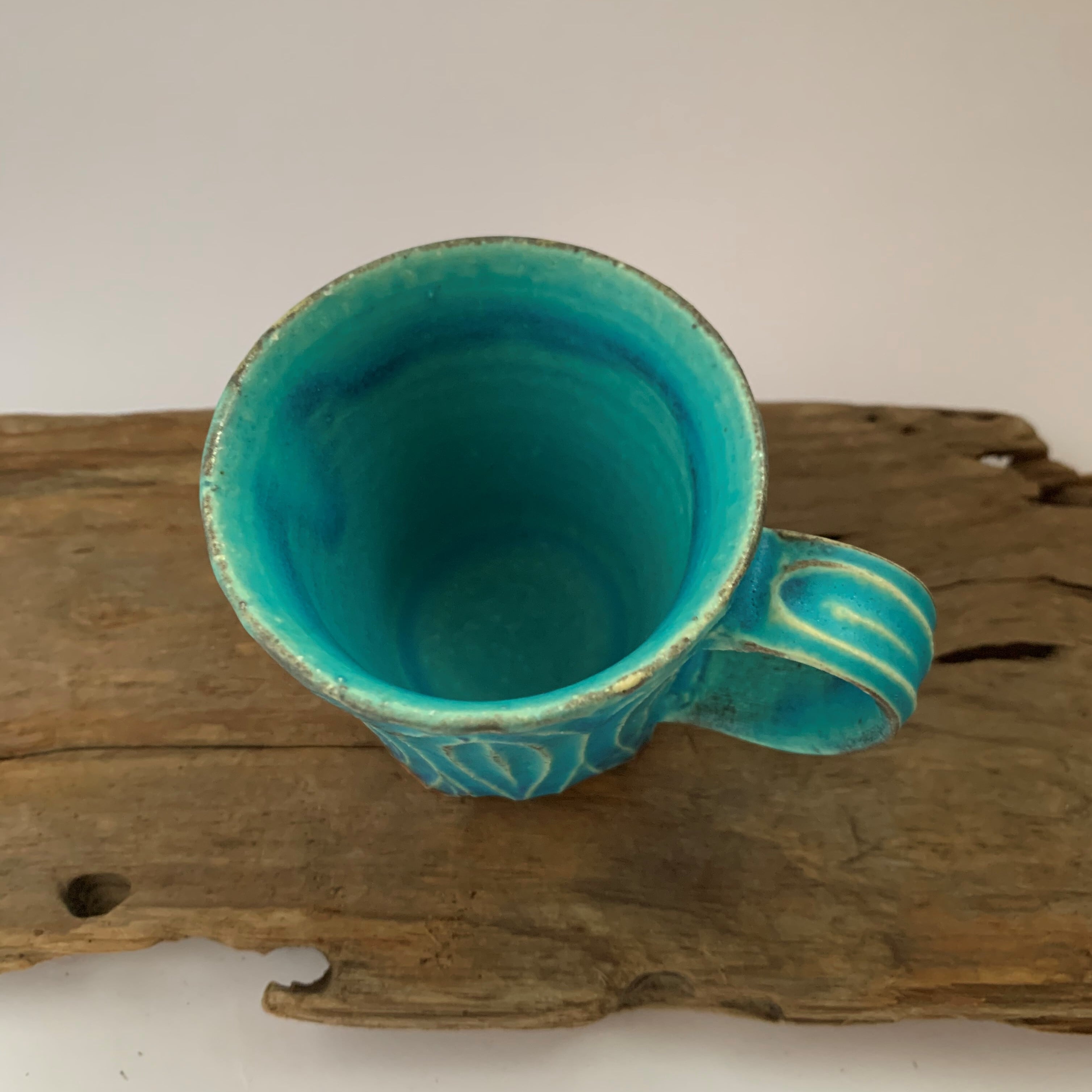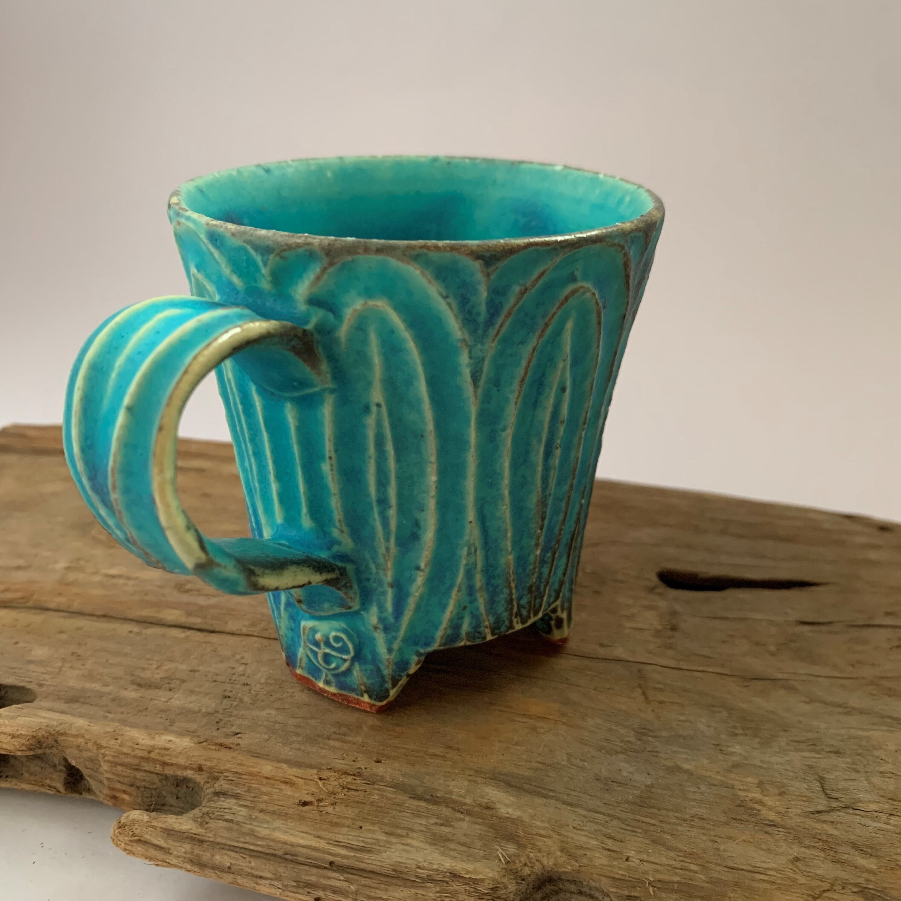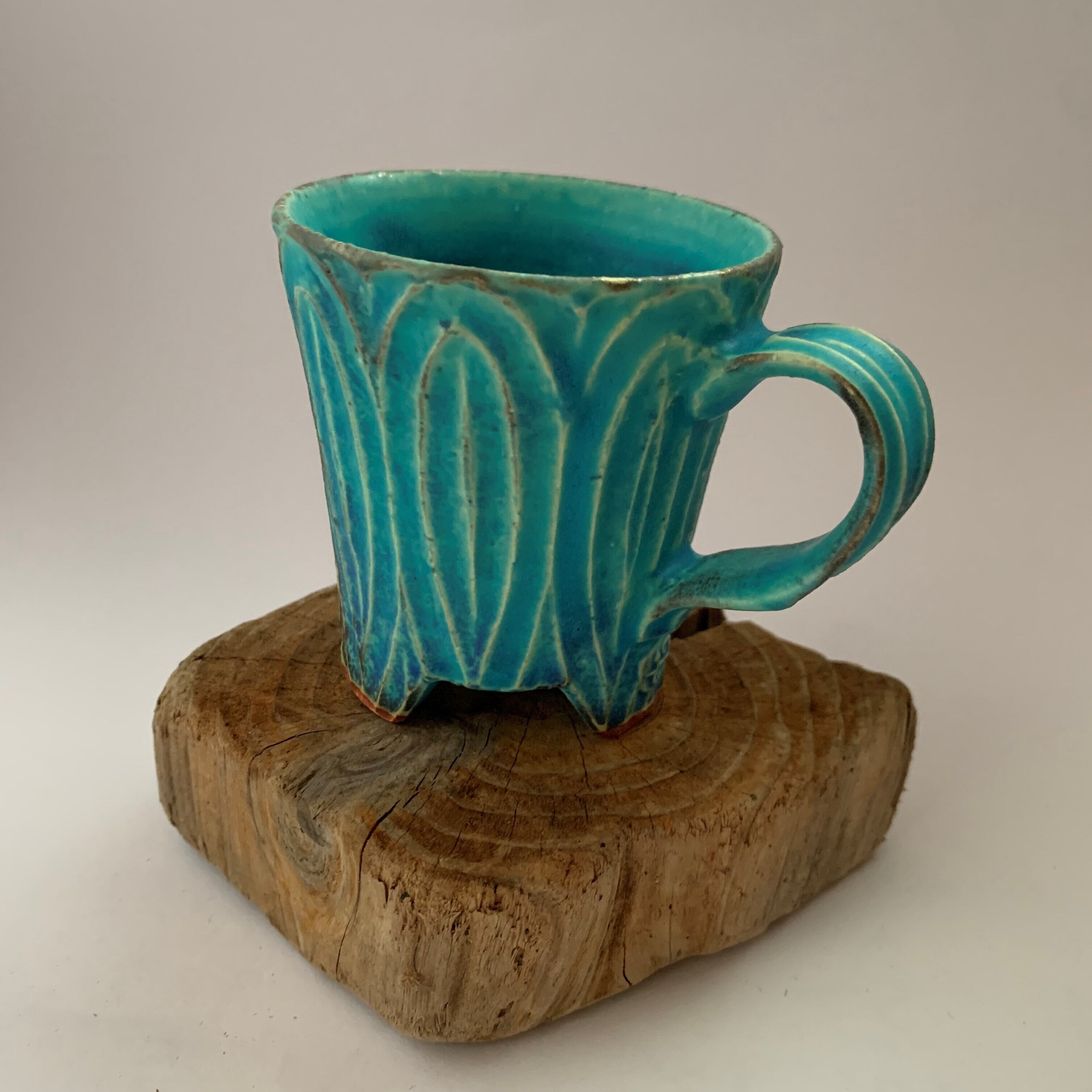 きれいなターコイズブルーに個性豊かな刻文の入ったカップです。いつものティーブレイクに彩りをプラスしてくれます。