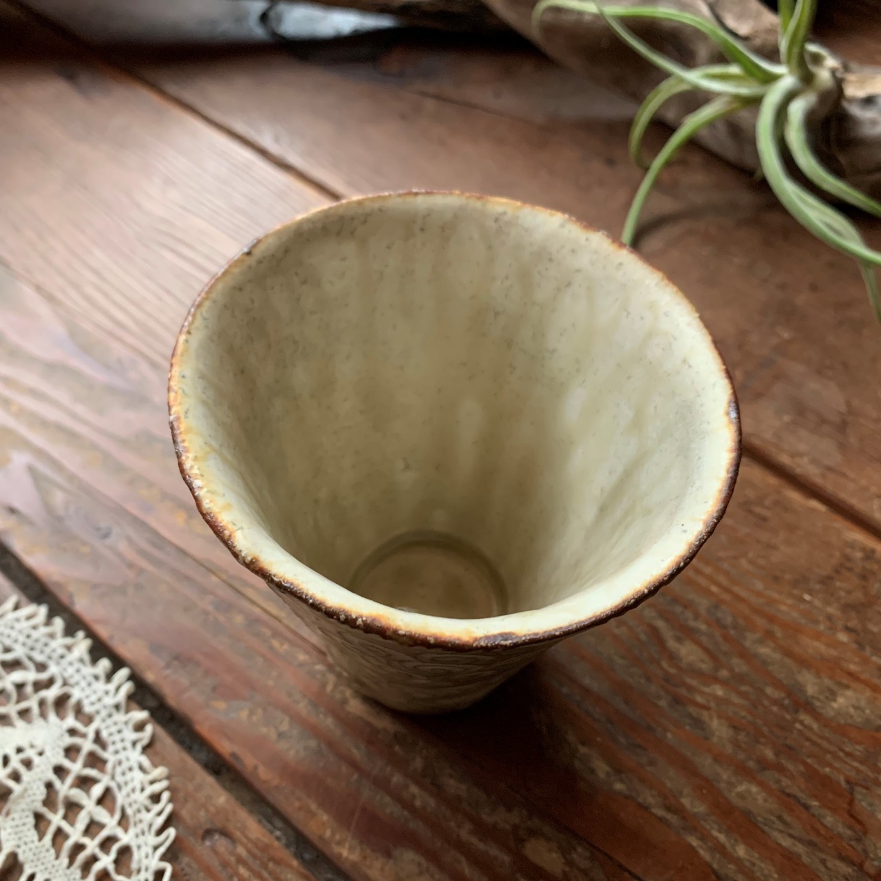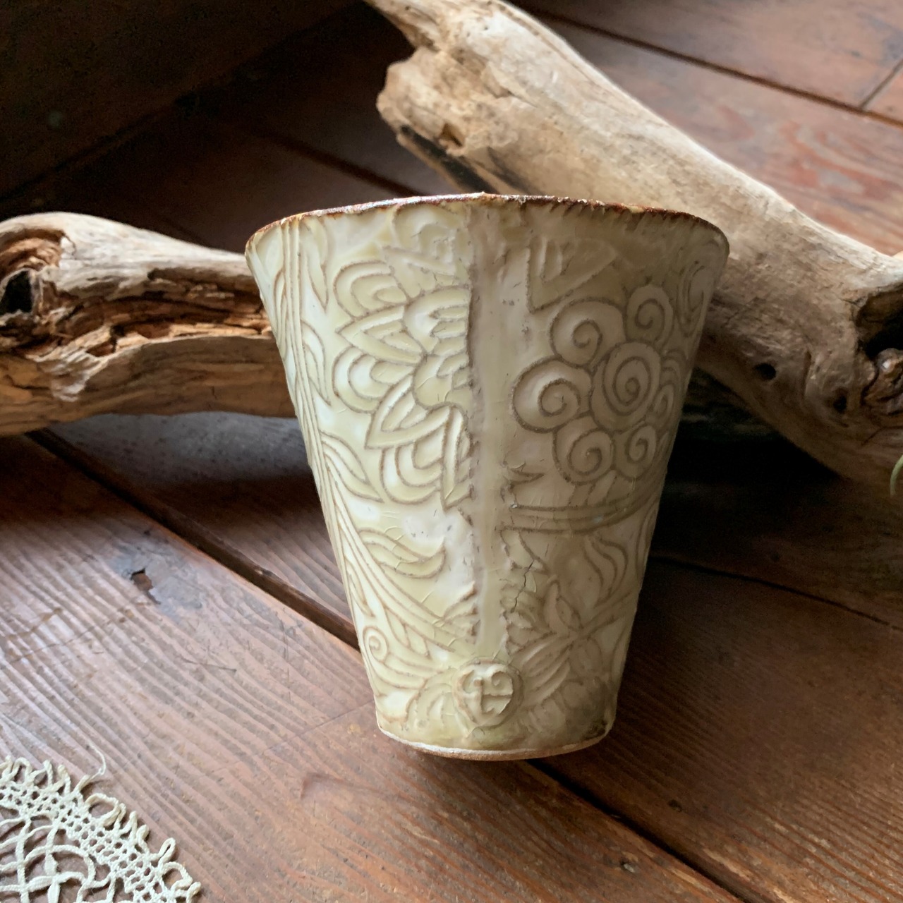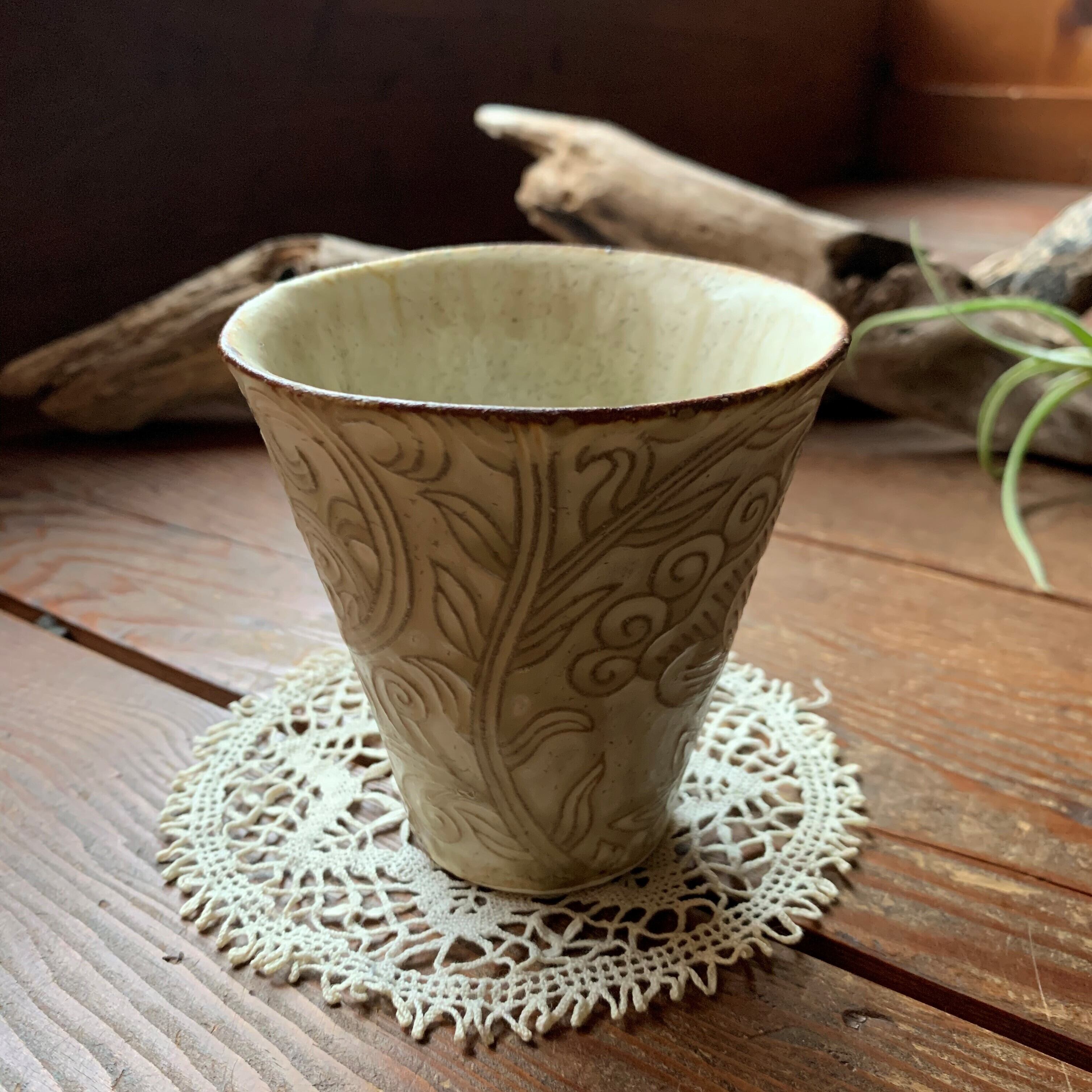 個性豊かな刻文の入ったアイボリー色のフリーカップです。どんな飲み物も美味しく素敵に演出してくれます。