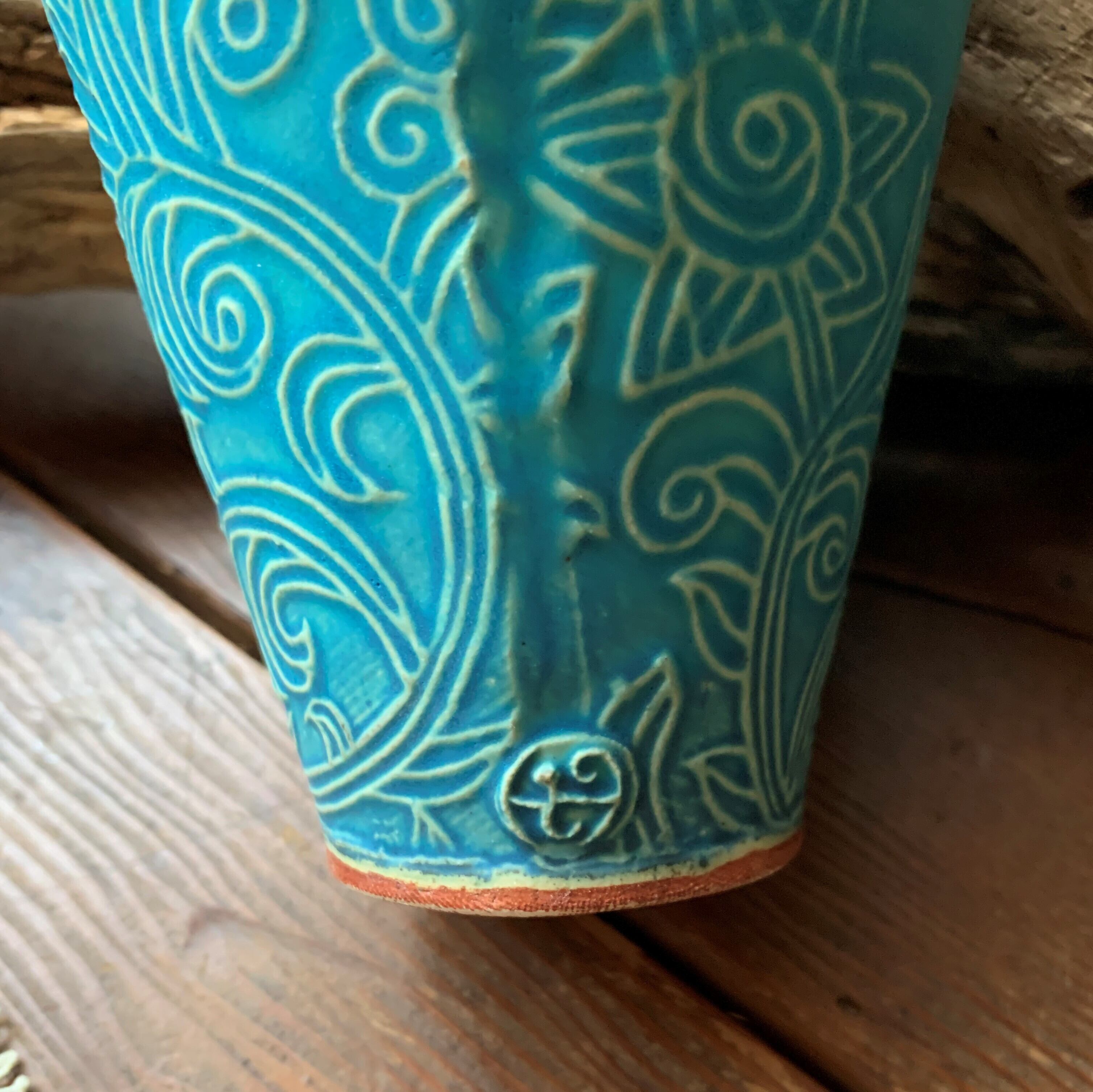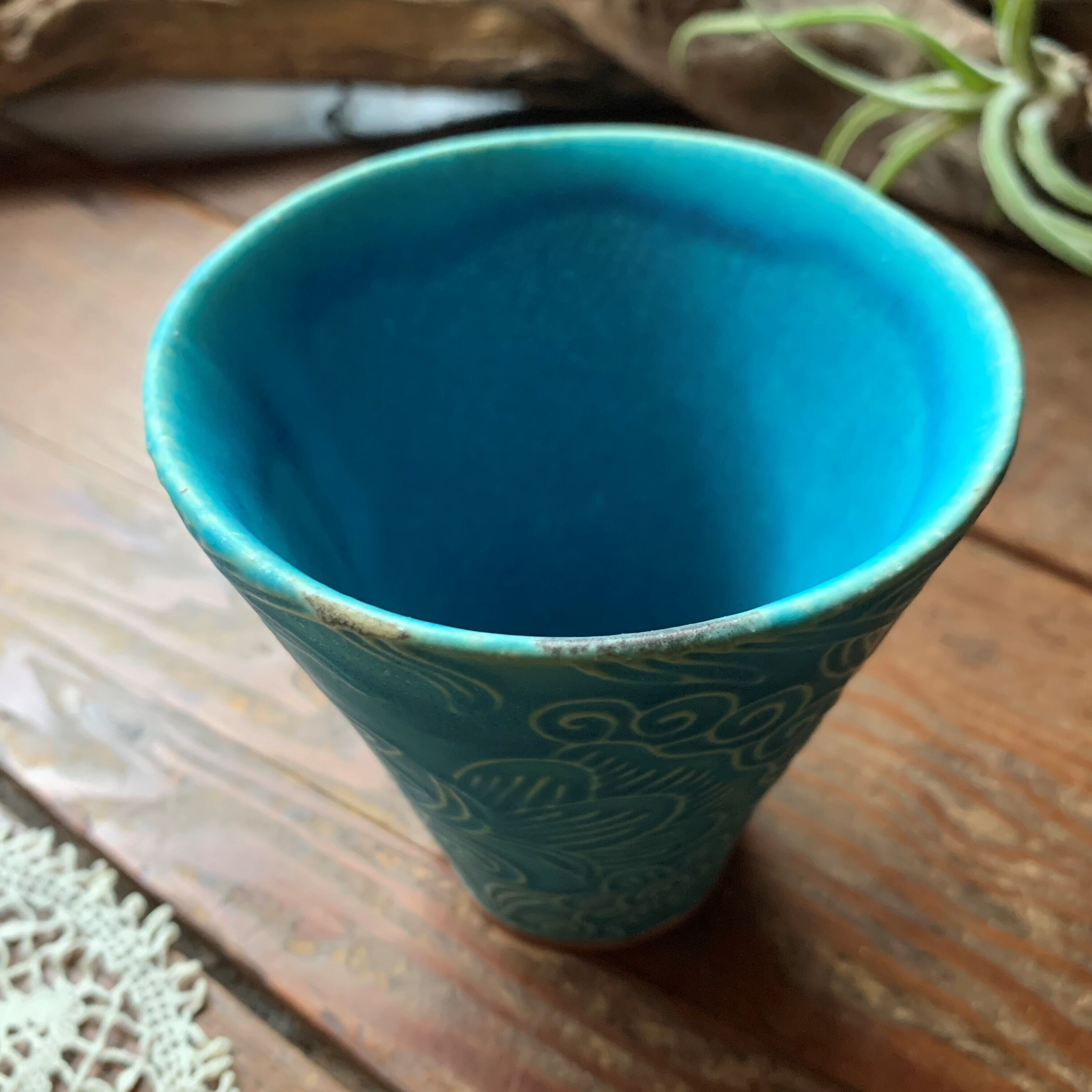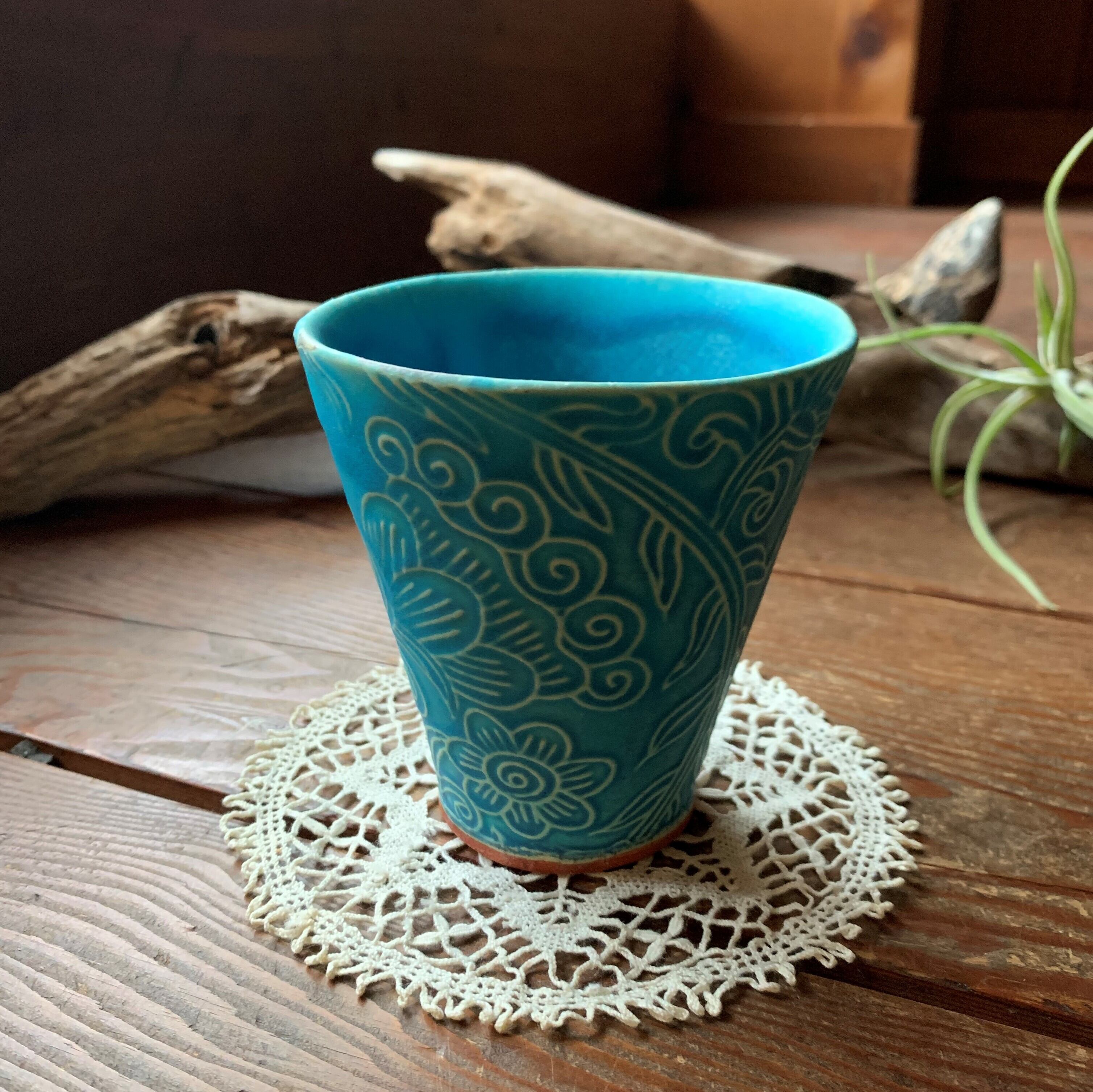 【笠間焼】 佐藤りぢゅう フリーカップ(草刻文)9cm ターコイズ