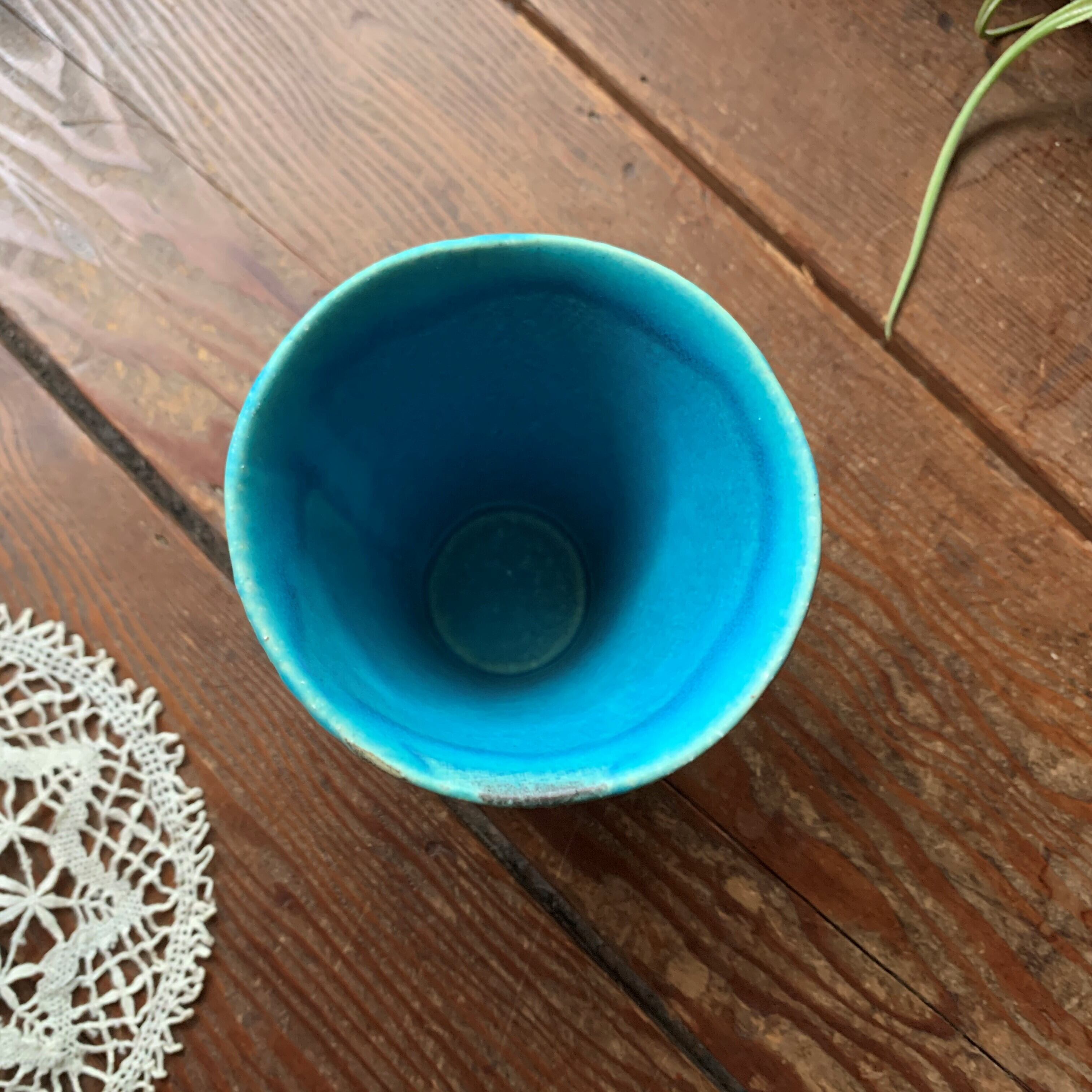 きれいなターコイズブルーに個性豊かな刻文の入ったカップです。いつものティーブレイクに彩りをプラスしてくれます。