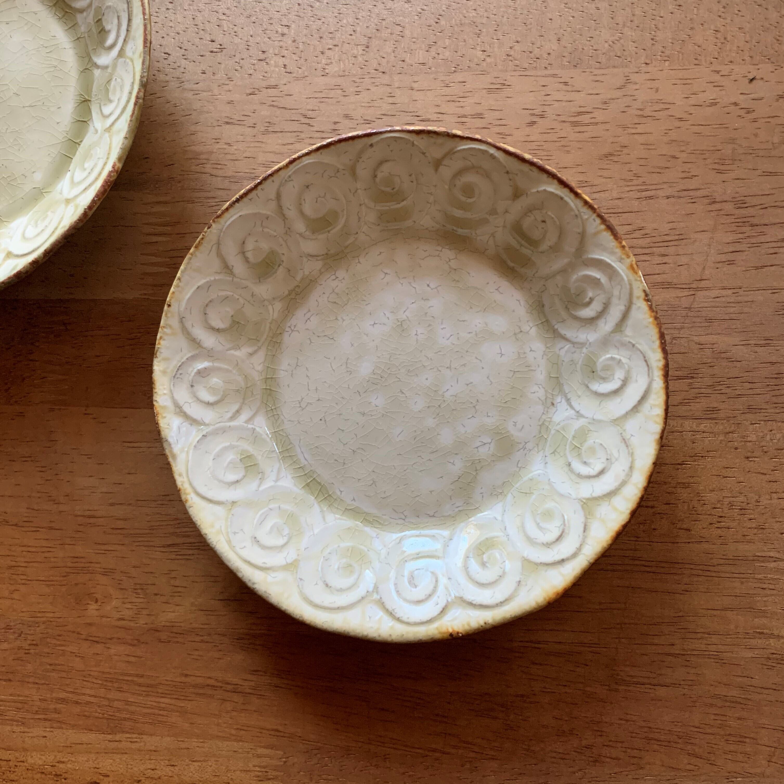 オフホワイトに所々スモーキーグリーンが入った、リムのうずまき模様が素敵な中皿です。深さがあるので汁物の取り皿などにも使用できます。側面が薄緑色で上と横の顔が違ってみえるのも趣があります。