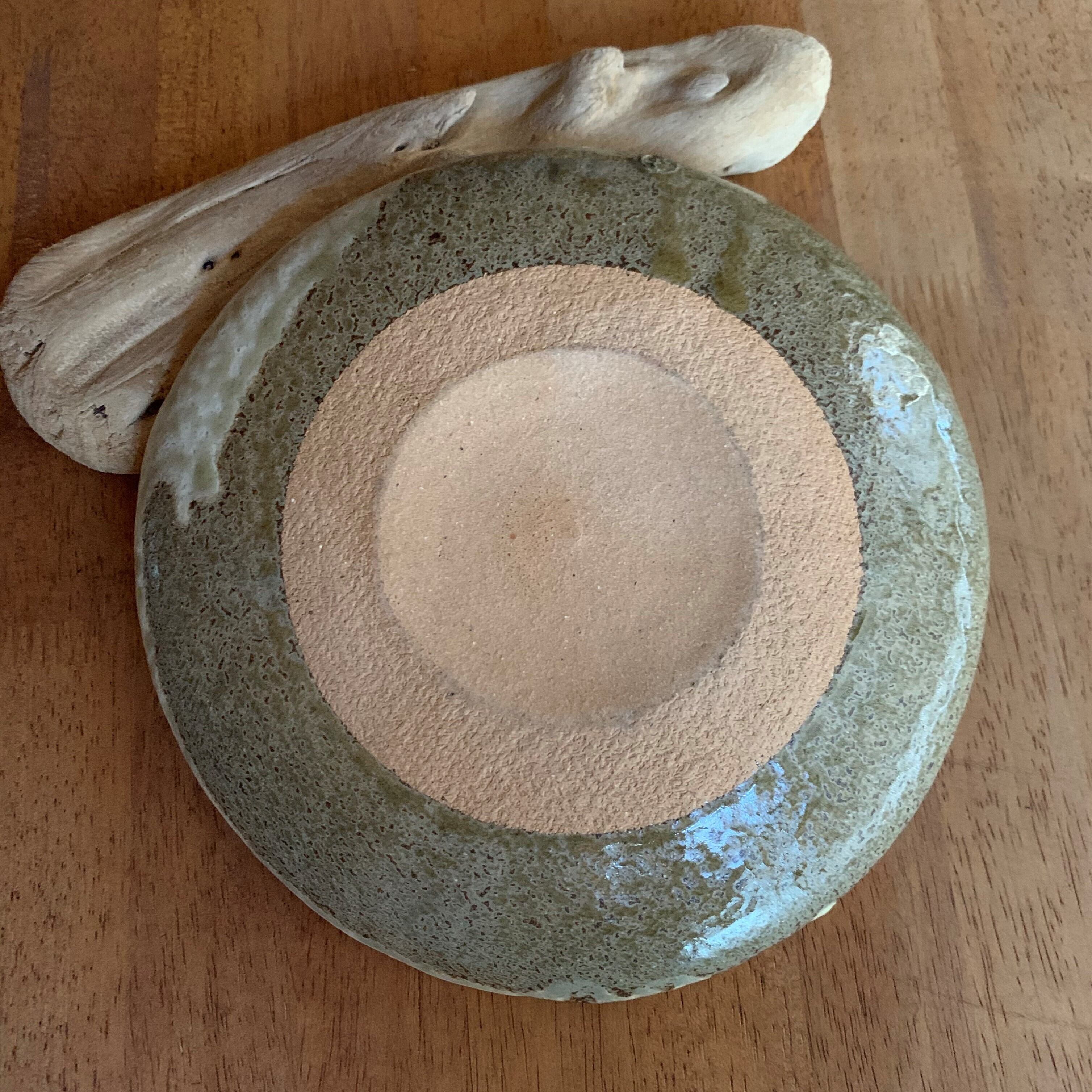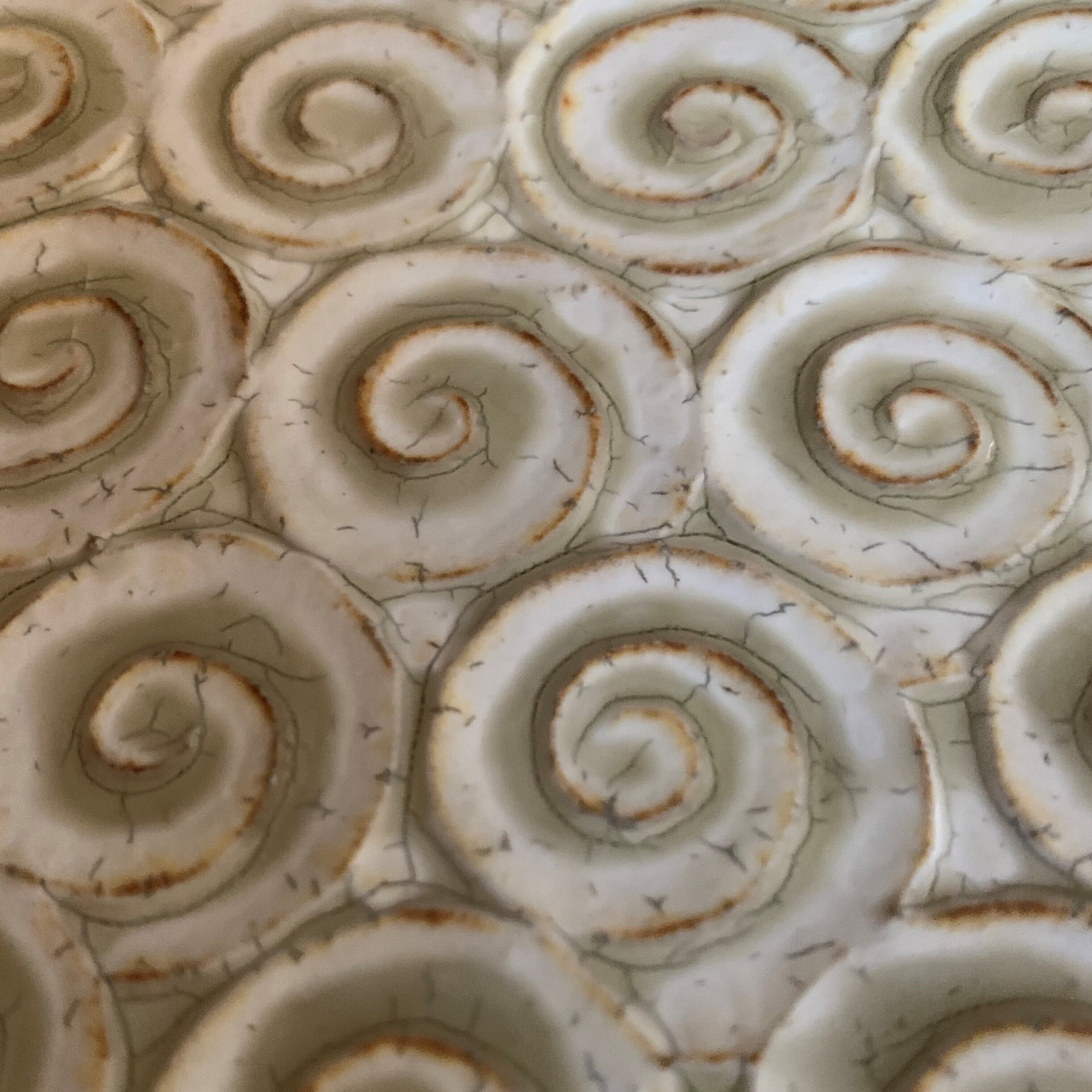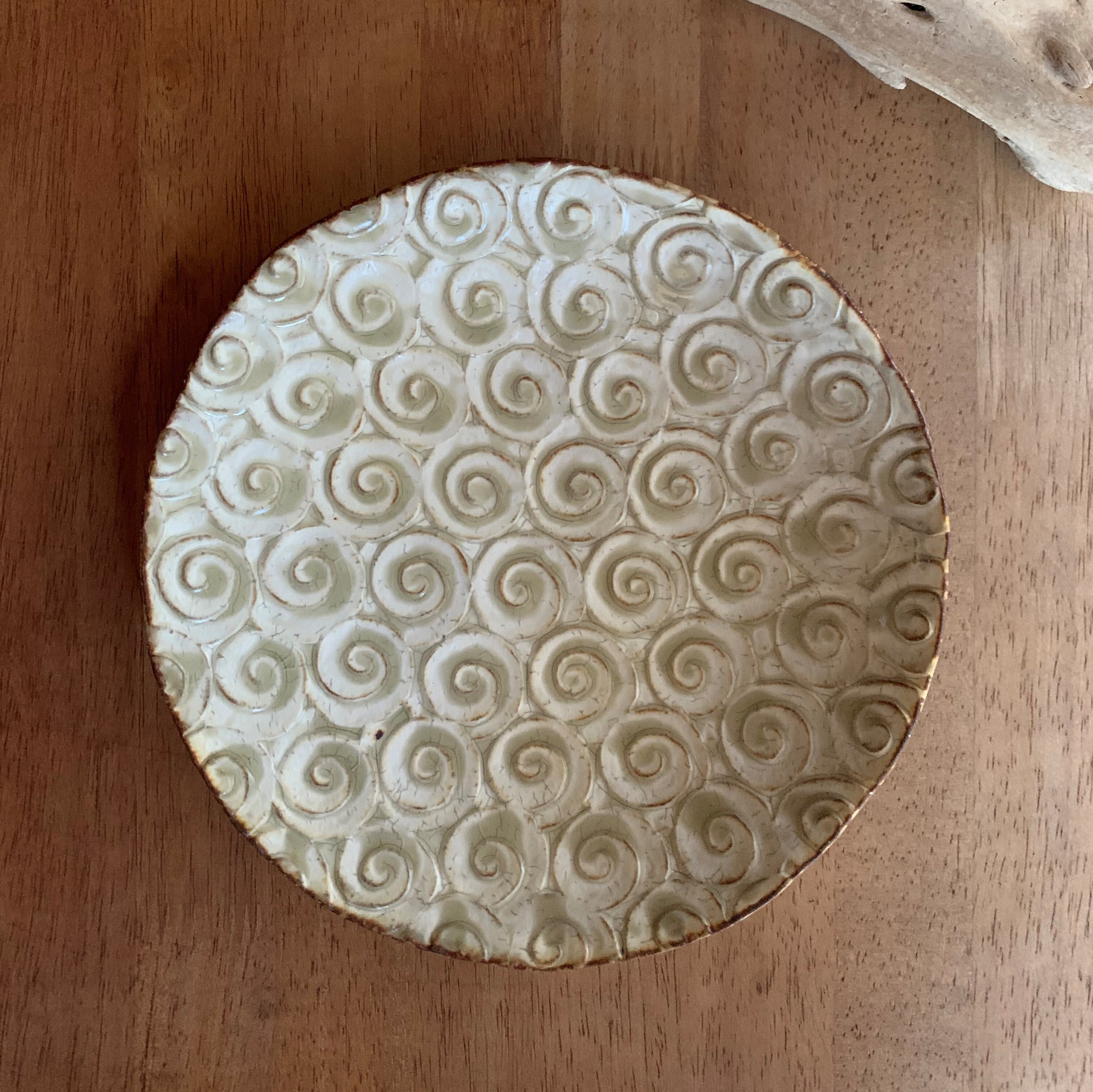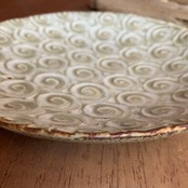 オフホワイトに所々スモーキーグリーンが入った、全面のうずまき模様が素敵な大皿です。少し深さがあるのでおかずをのせるのにちょうどいい大きさです。
