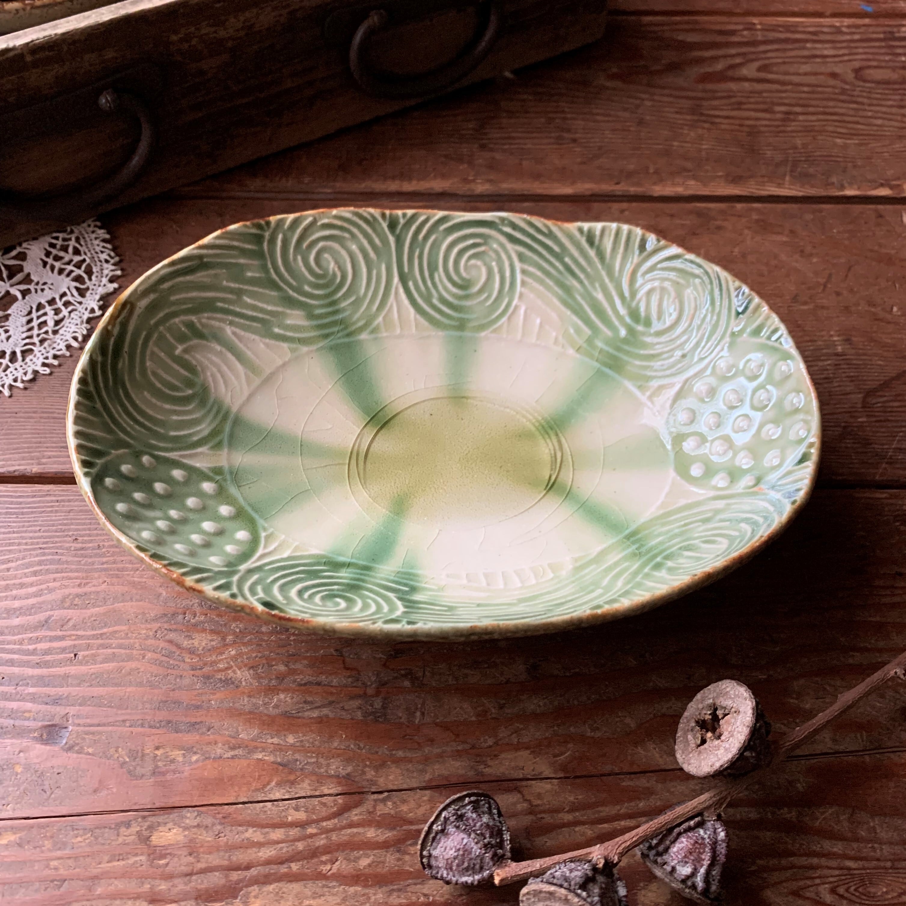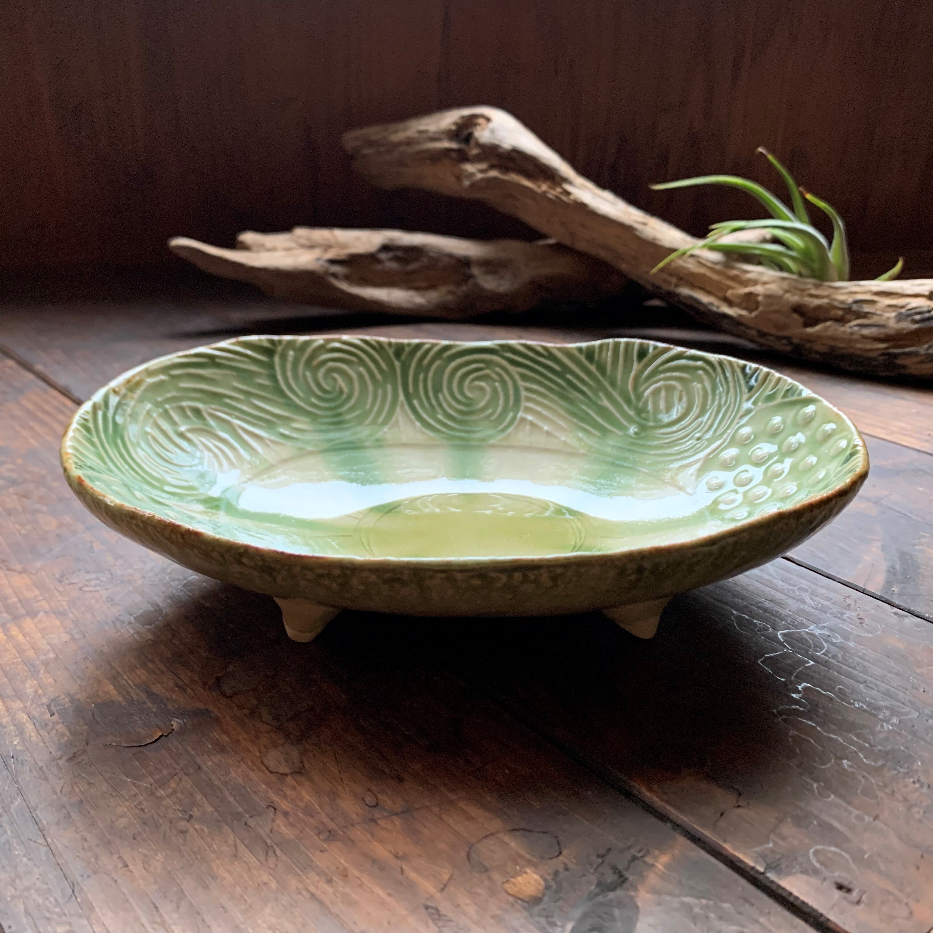 ところどころに入った緑色が素敵な緑灰釉の楕円形足付鉢です。ふちに入った個性的な刻文がいつものお料理にスパイスを与えてくれる素敵な鉢です。光沢感があります。