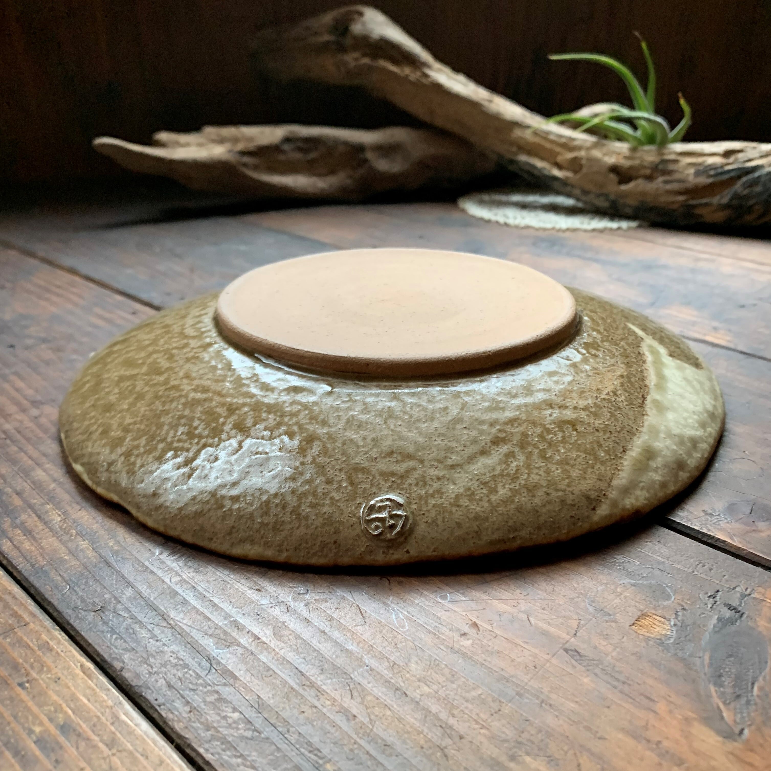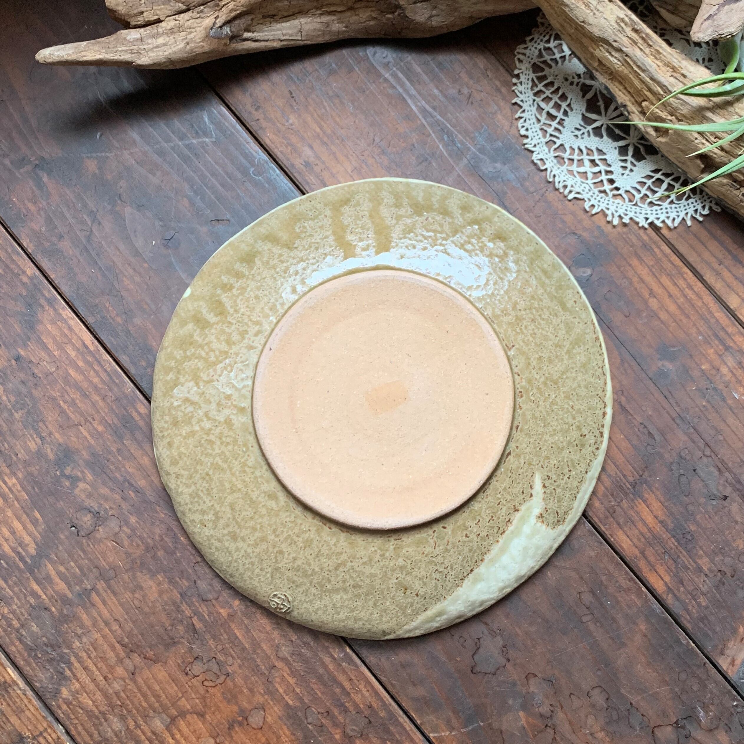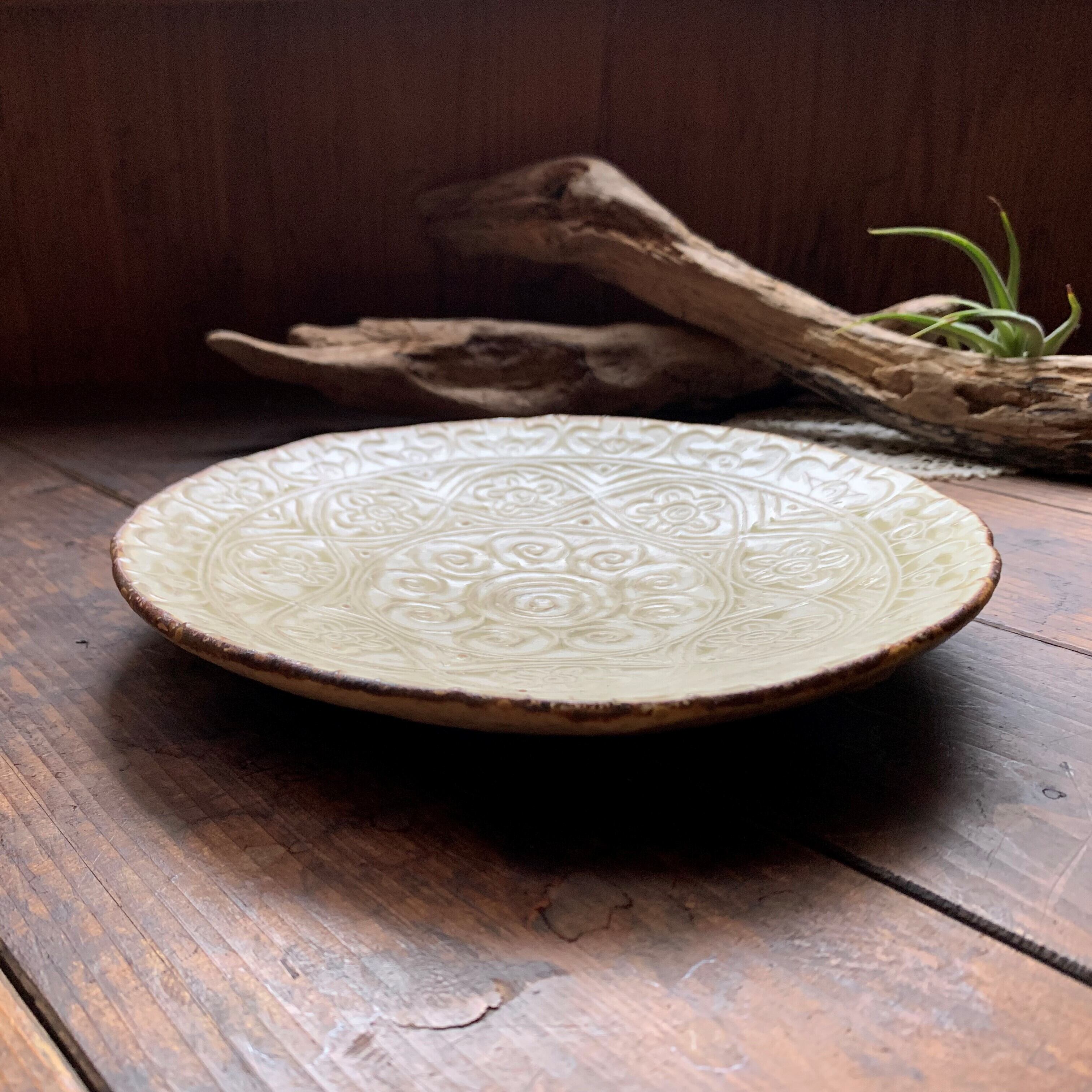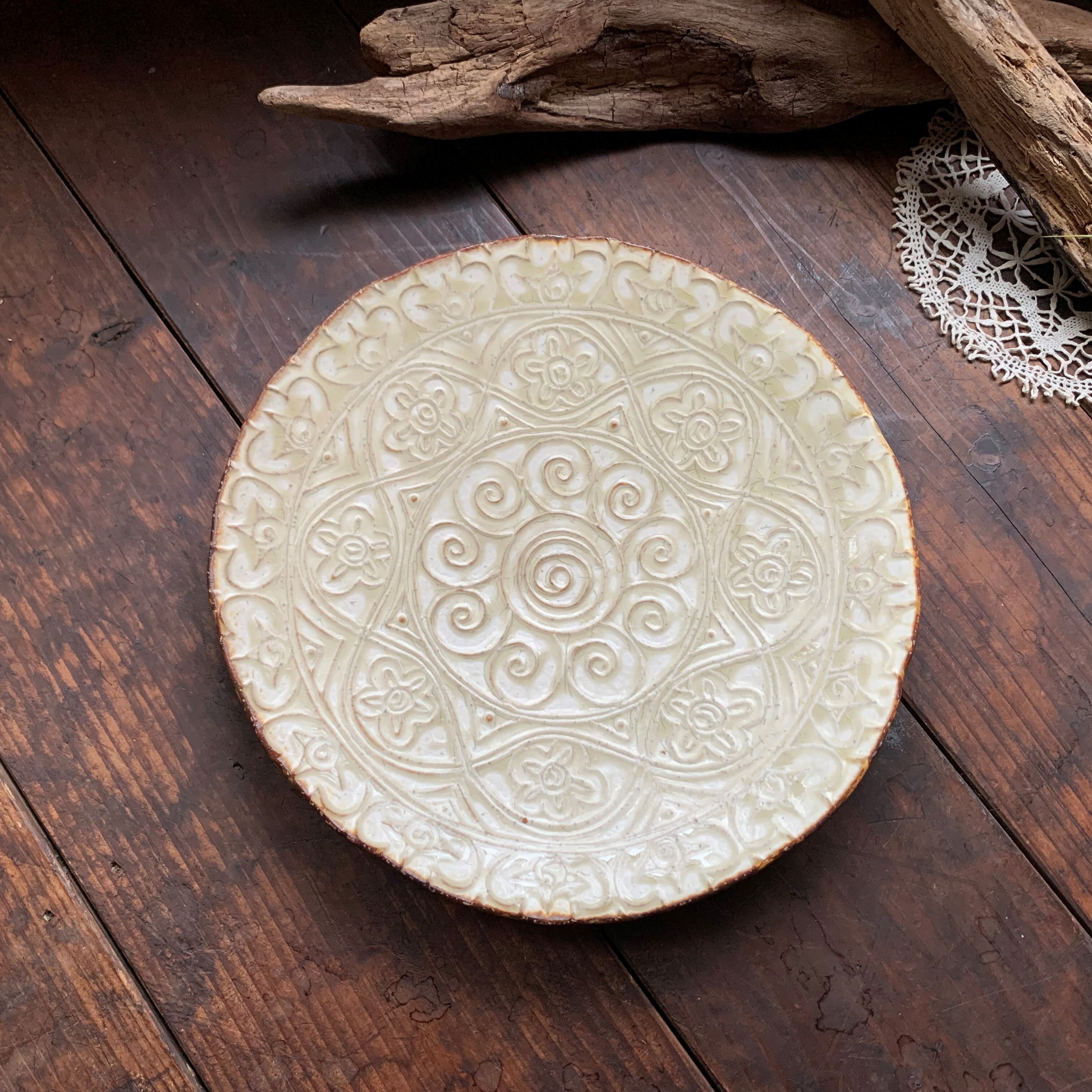 個性的な唐草模様の刻文が素敵なアイボリー色の化粧皿です。アイボリー色と言っても一色ではなく所々スモーキーなお色味があります。手作りならではの温かみを感じるお皿です。