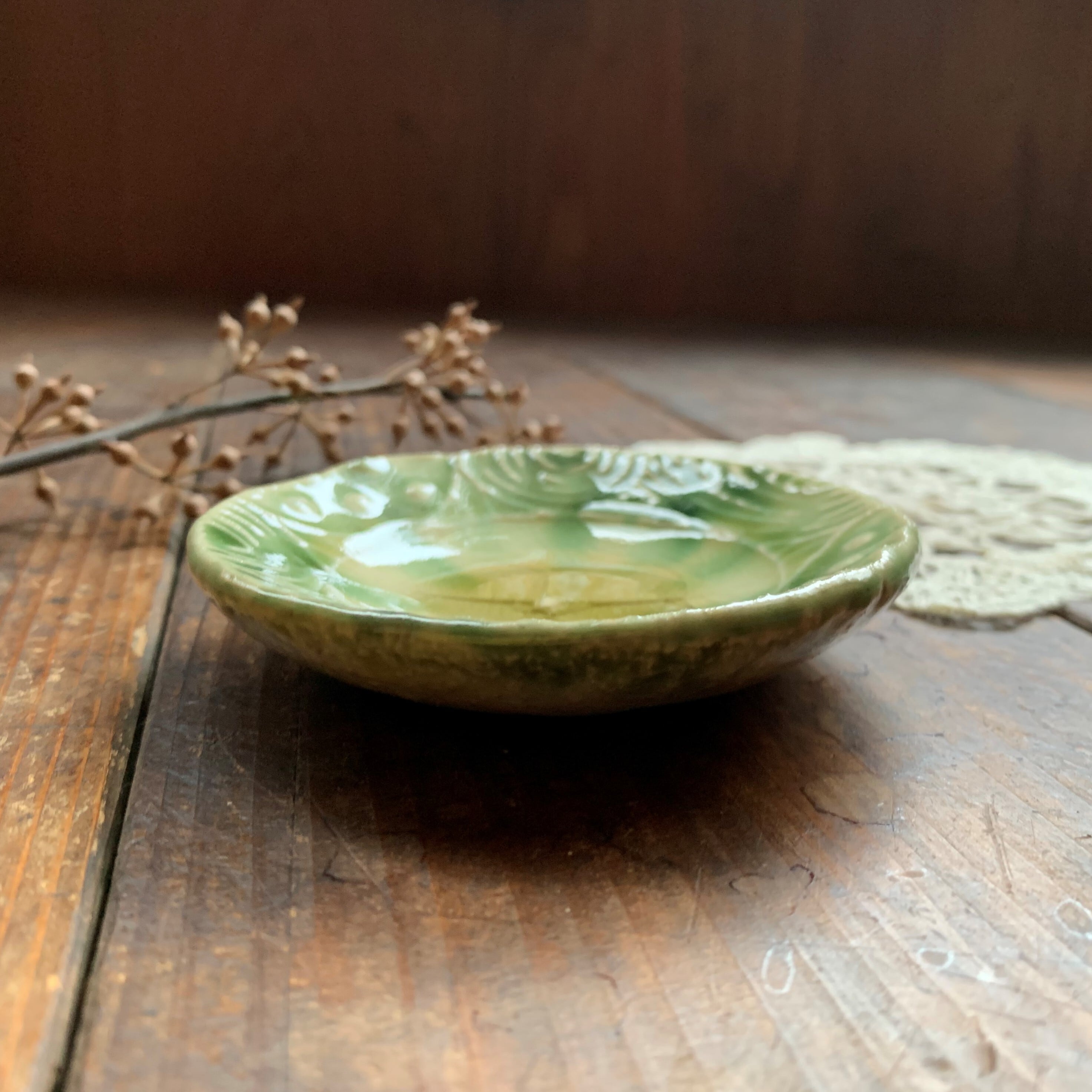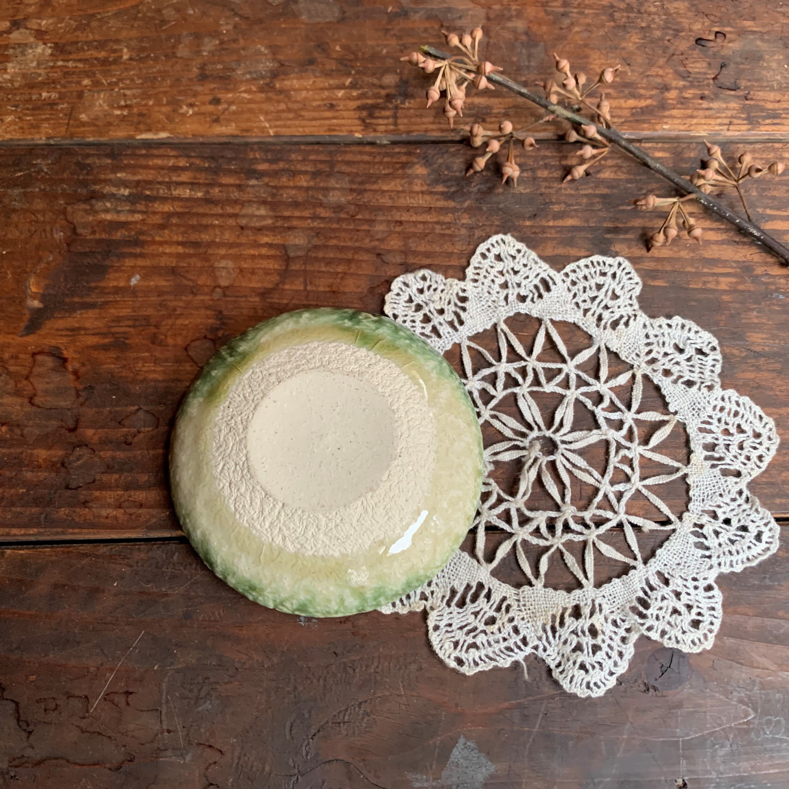 ところどころに入った緑色が素敵な緑灰釉の豆皿です。縁の個性豊かな刻文と真ん中に入った貫入がお花の形をしていて、とてもかわいらしいお皿です。光沢感があります。
