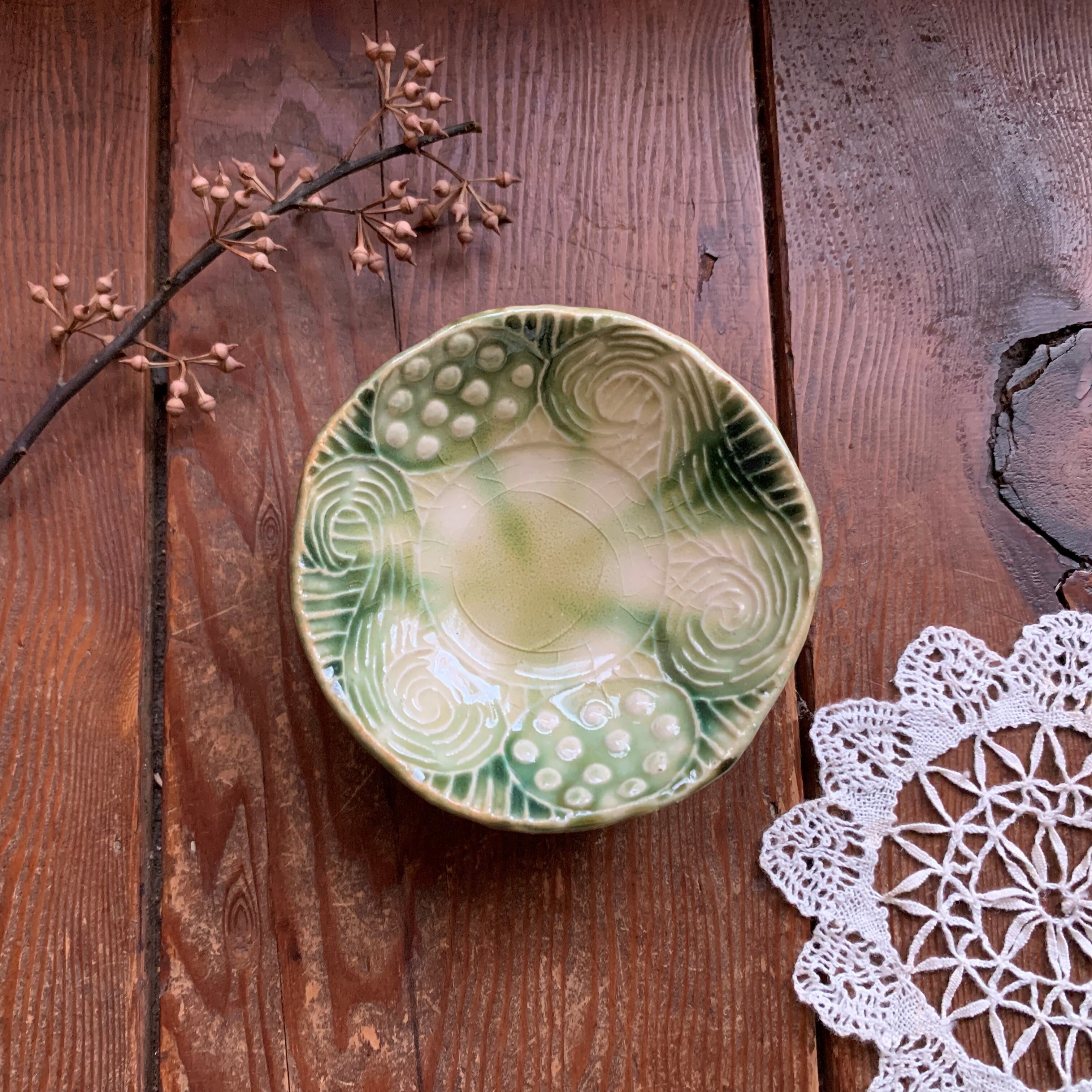 ところどころに入った緑色が素敵な緑灰釉の小鉢です。縁の個性豊かな刻文がいつものお料理にスパイスを与えてくれるような…そんな素敵な小鉢です。光沢感があります。