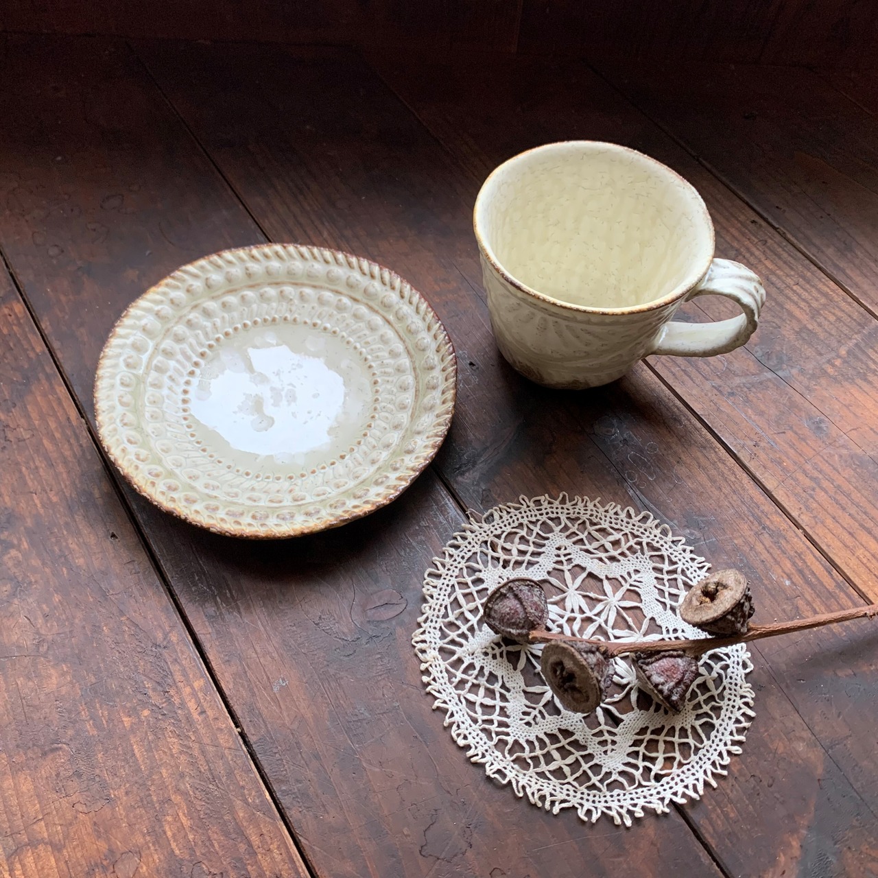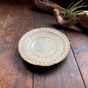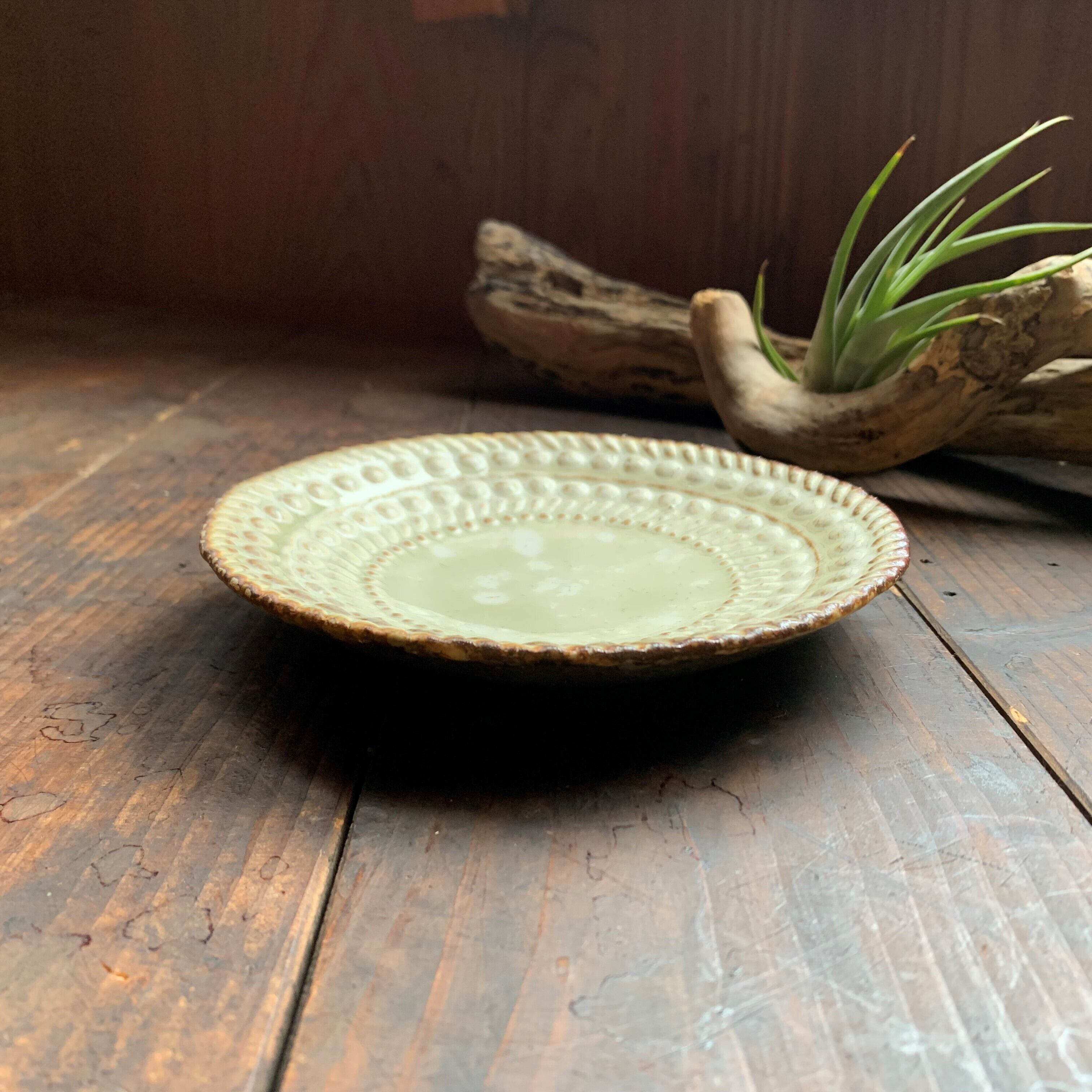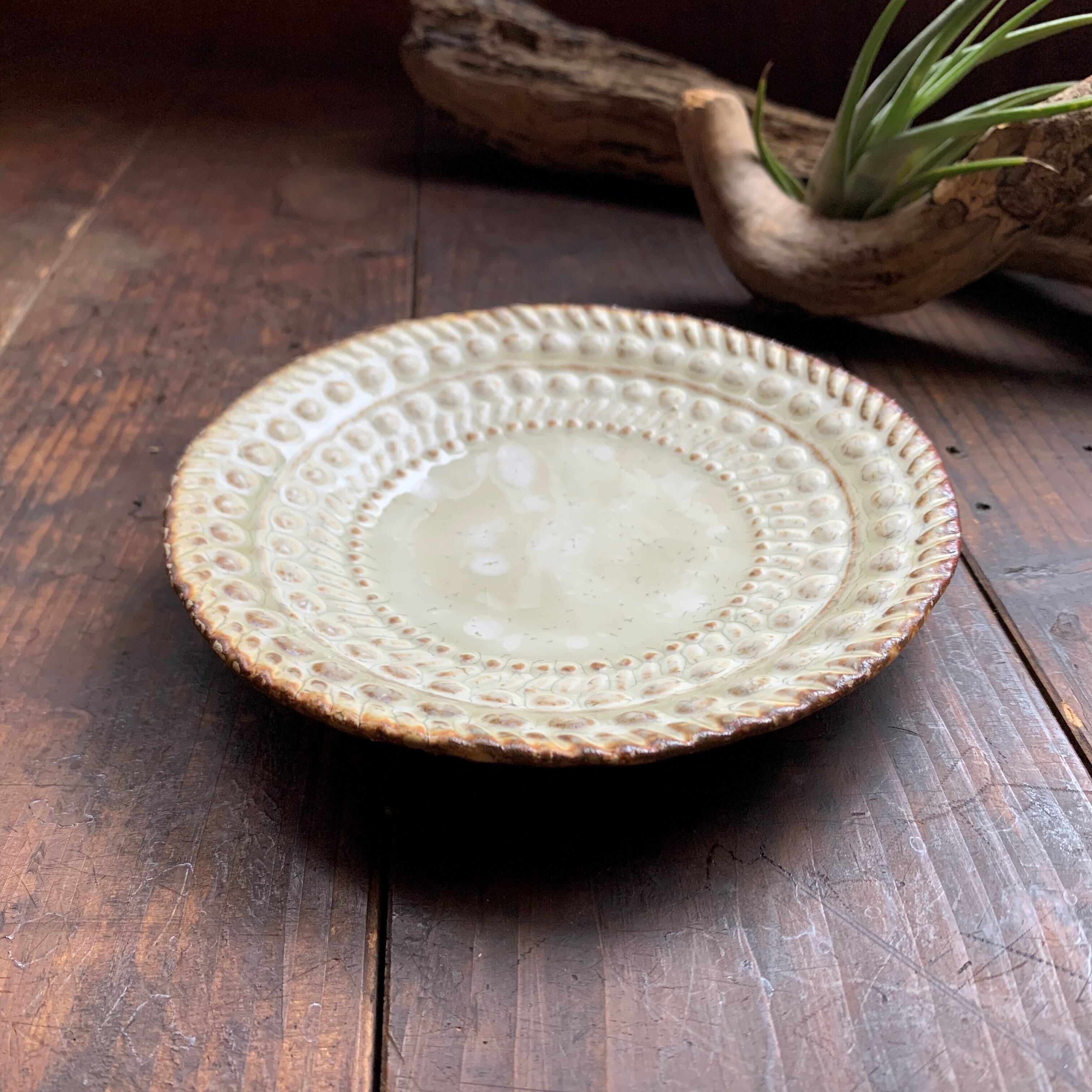 ドット模様の刻文が素敵なアイボリー色の小皿です。アイボリーといっても一色ではなく所々スモーキーなお色味があります。