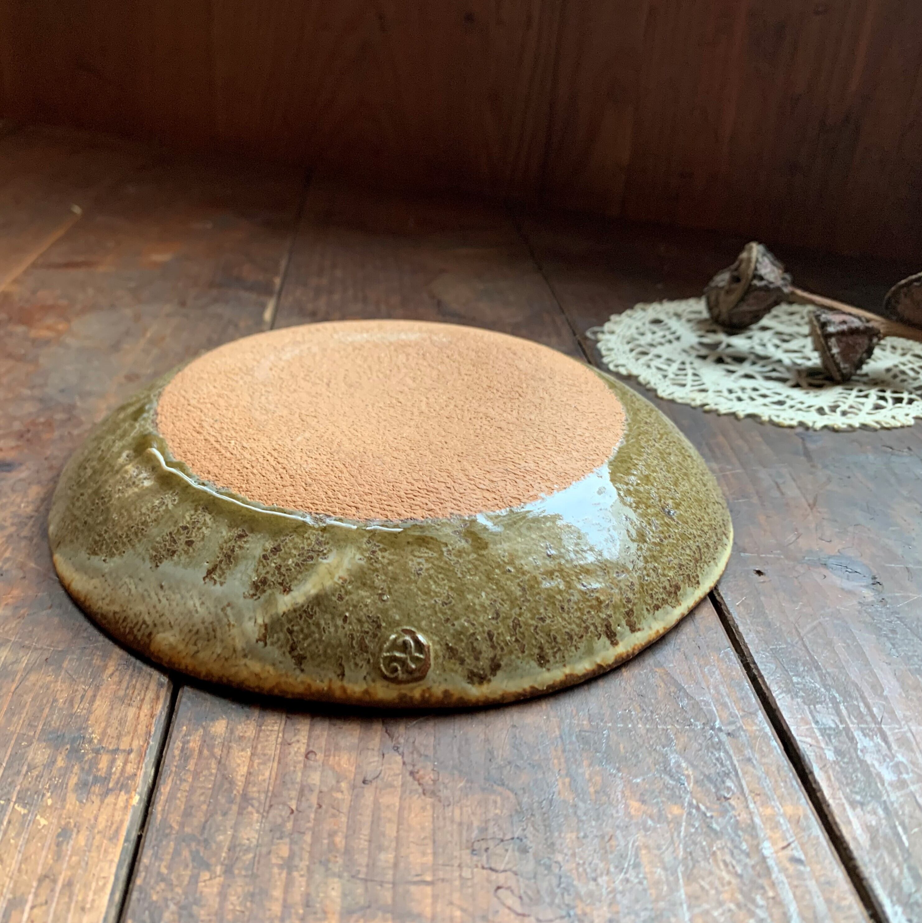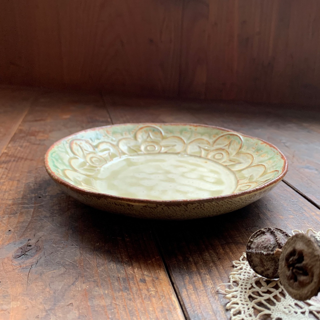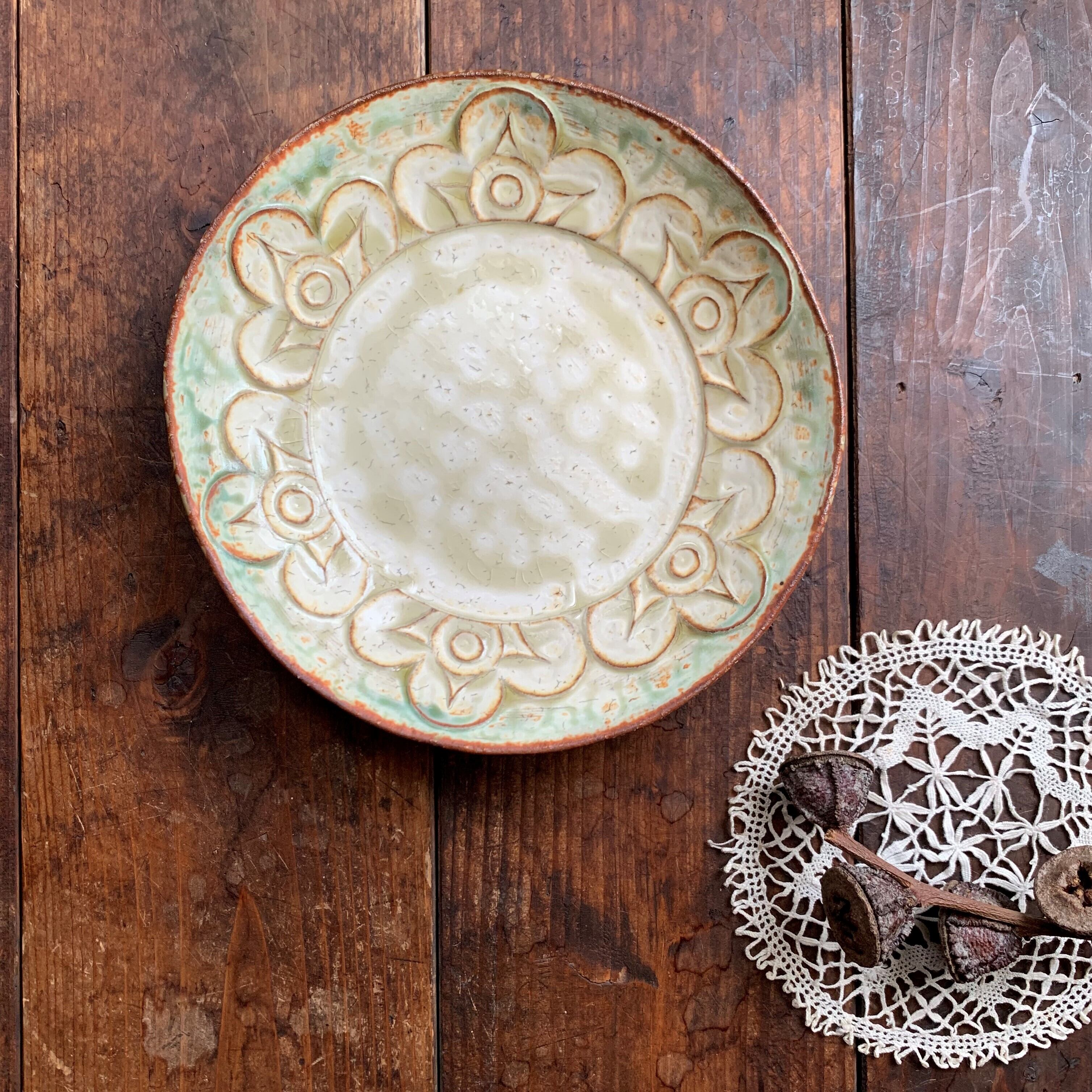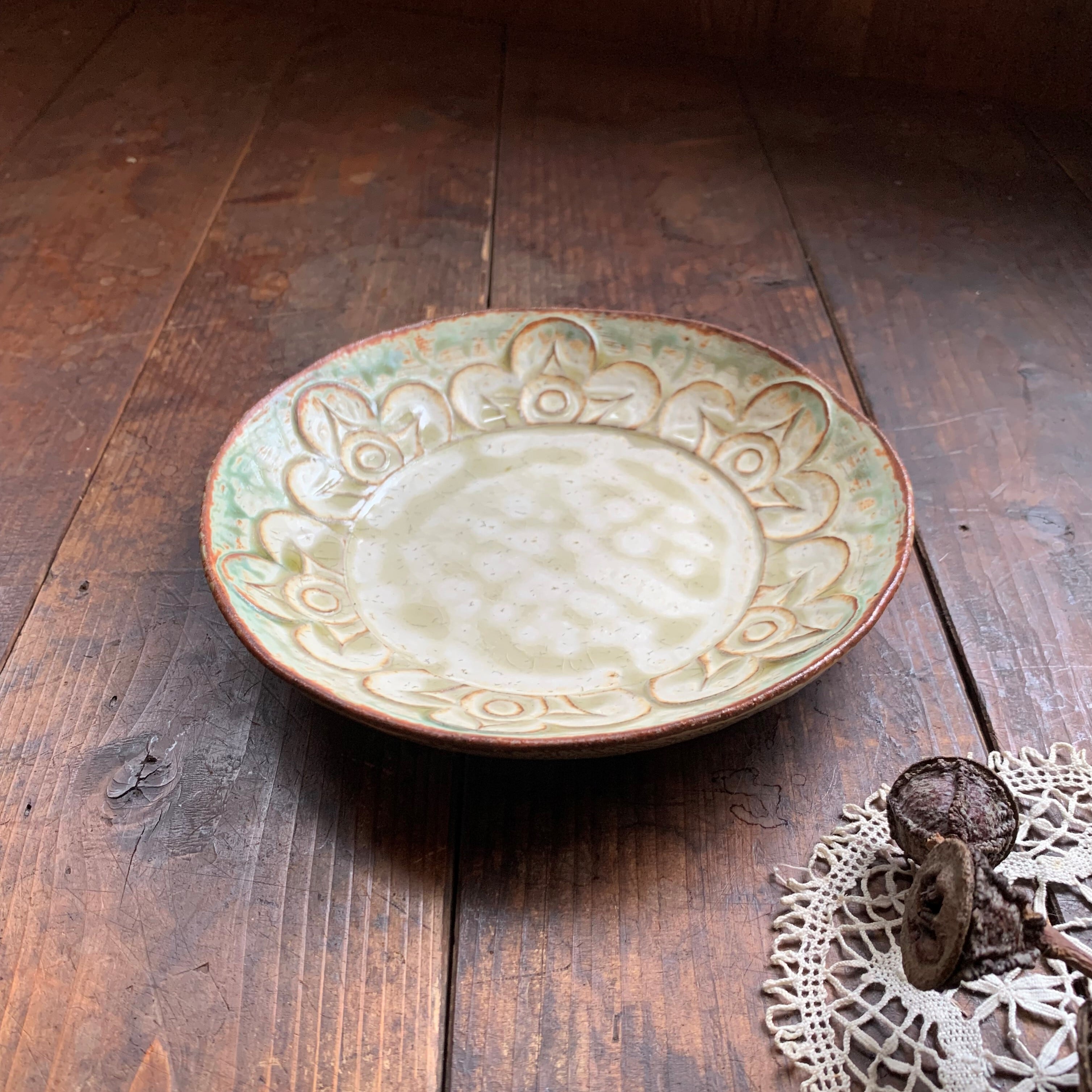 花柄模様の刻文が素敵なアイボリー色の化粧皿です。縁のスモーキーな緑色が何とも言えないシックな色合いです。手作りならではの温かみを感じるお皿です。