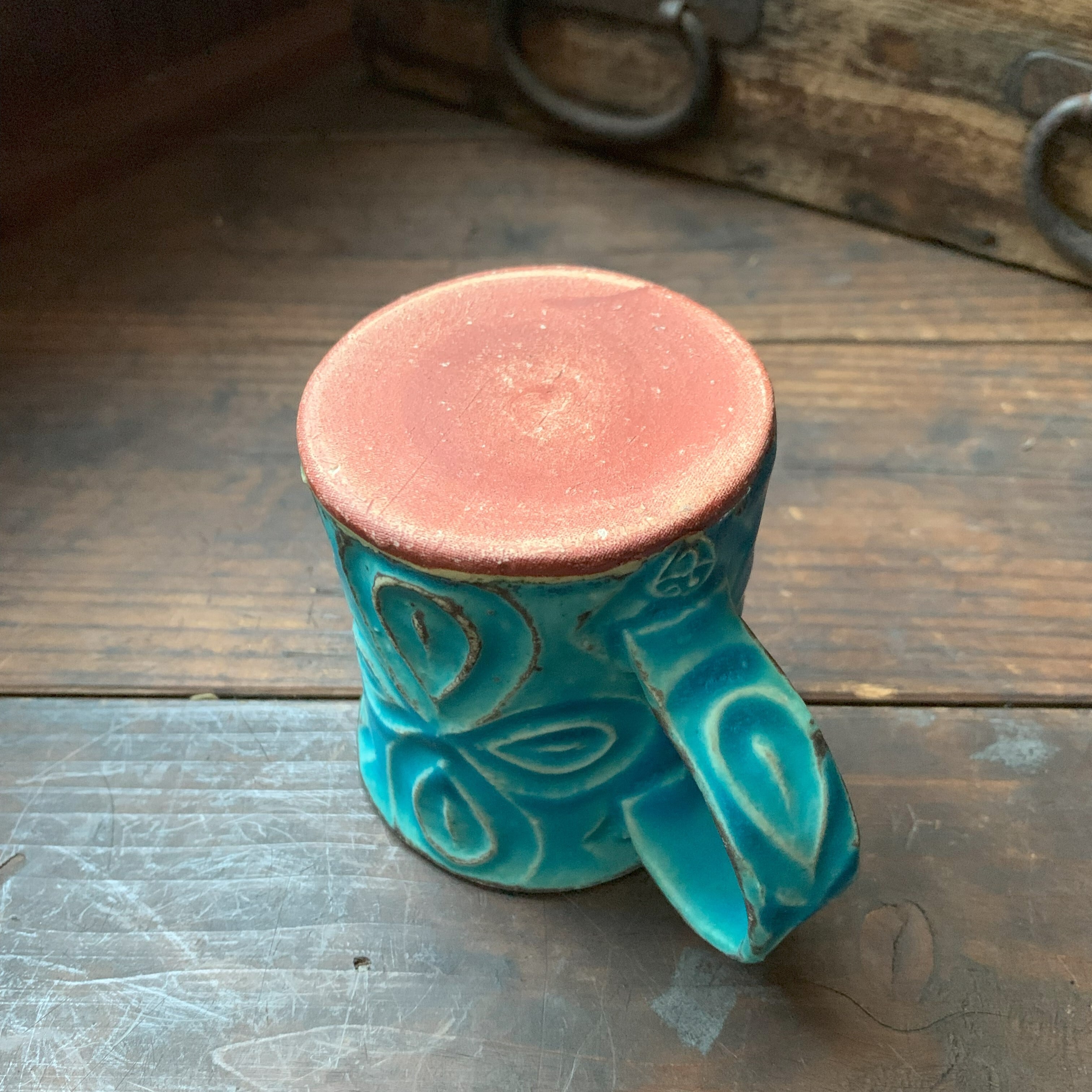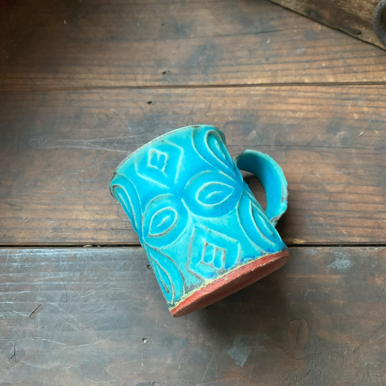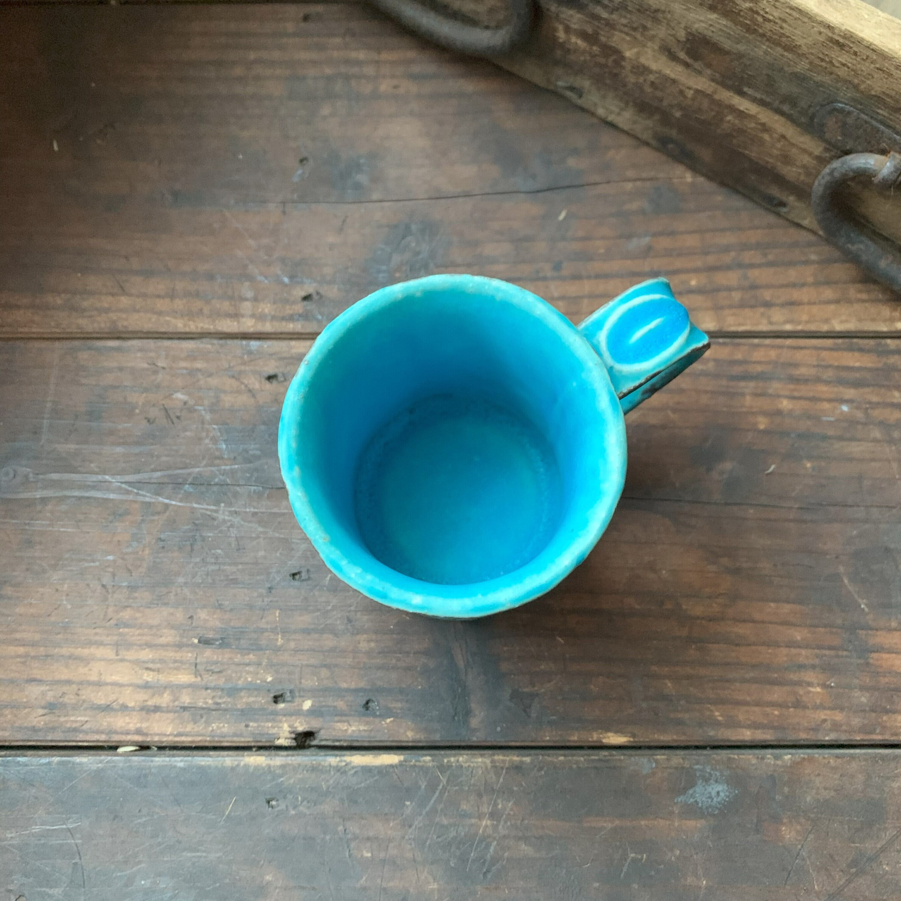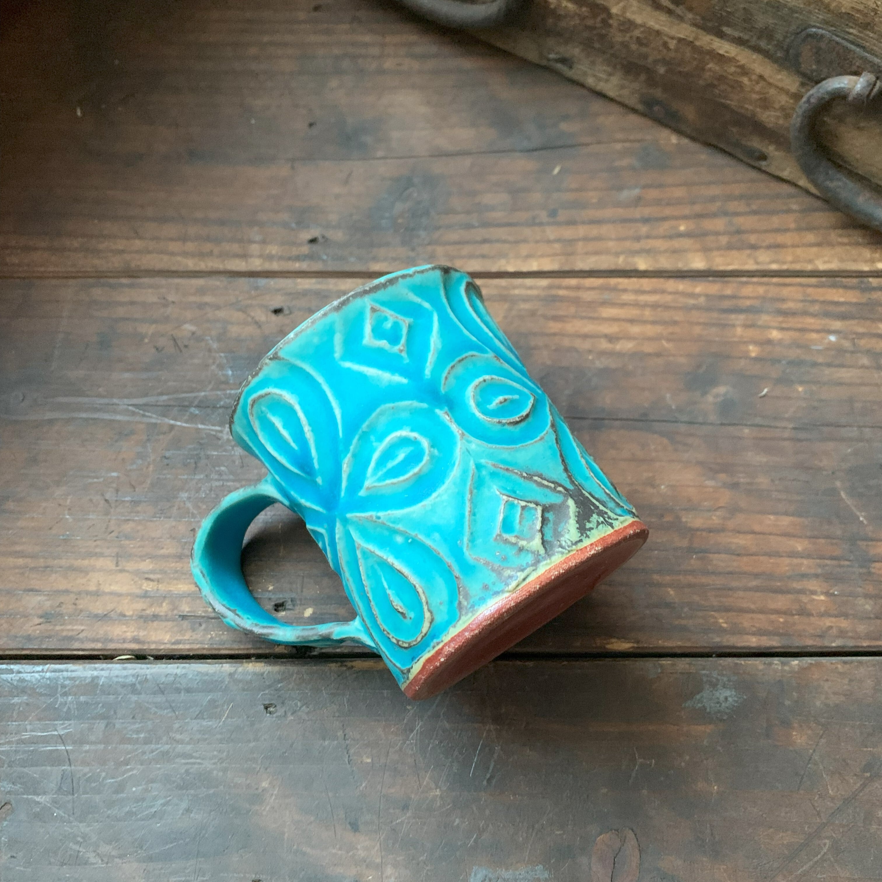 きれいなターコイズブルーに個性豊かな刻文の入ったカップです。やや小ぶりなサイズです。コーヒーを入れると、さらに絵になるかっこいいカップです。