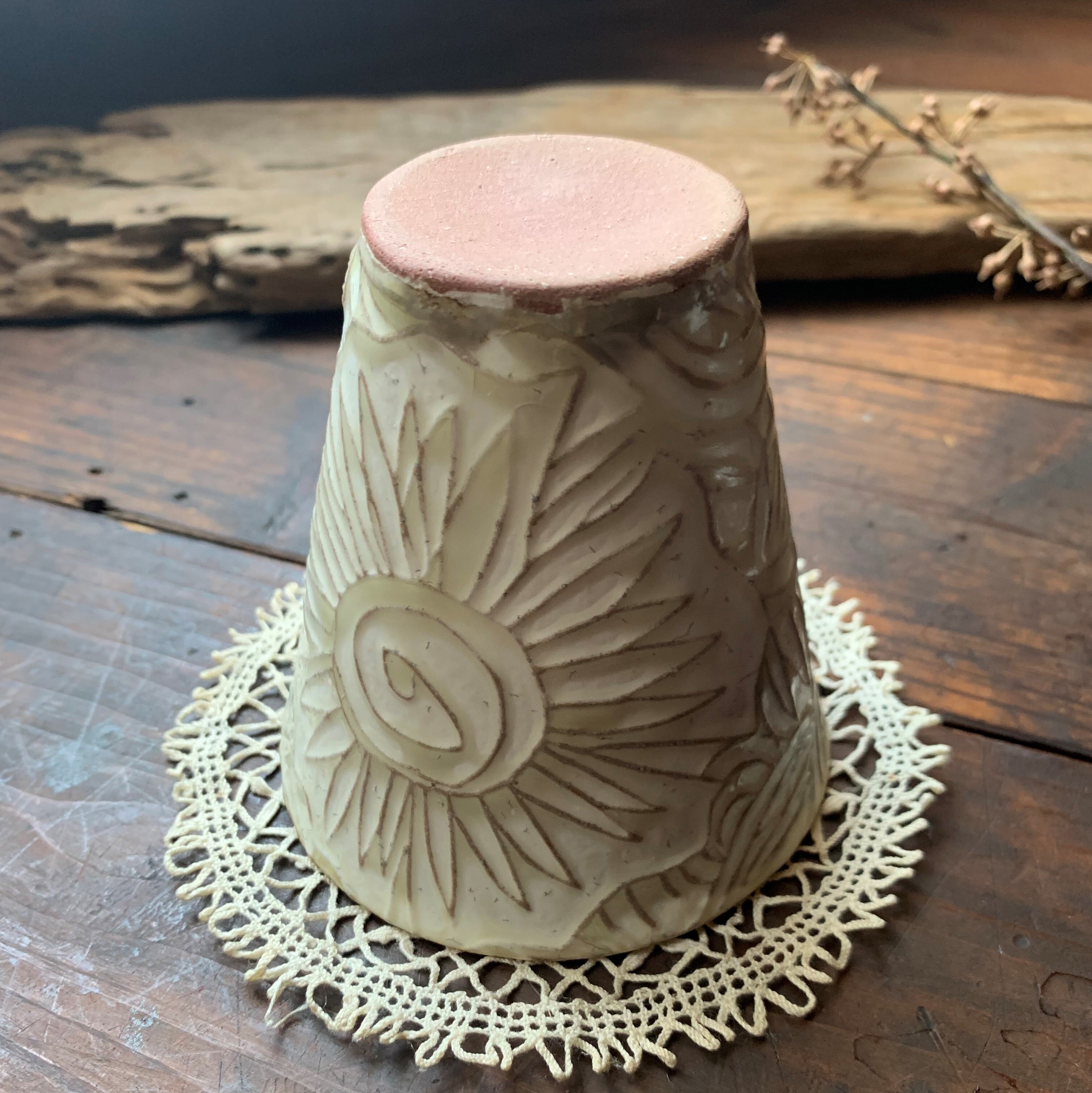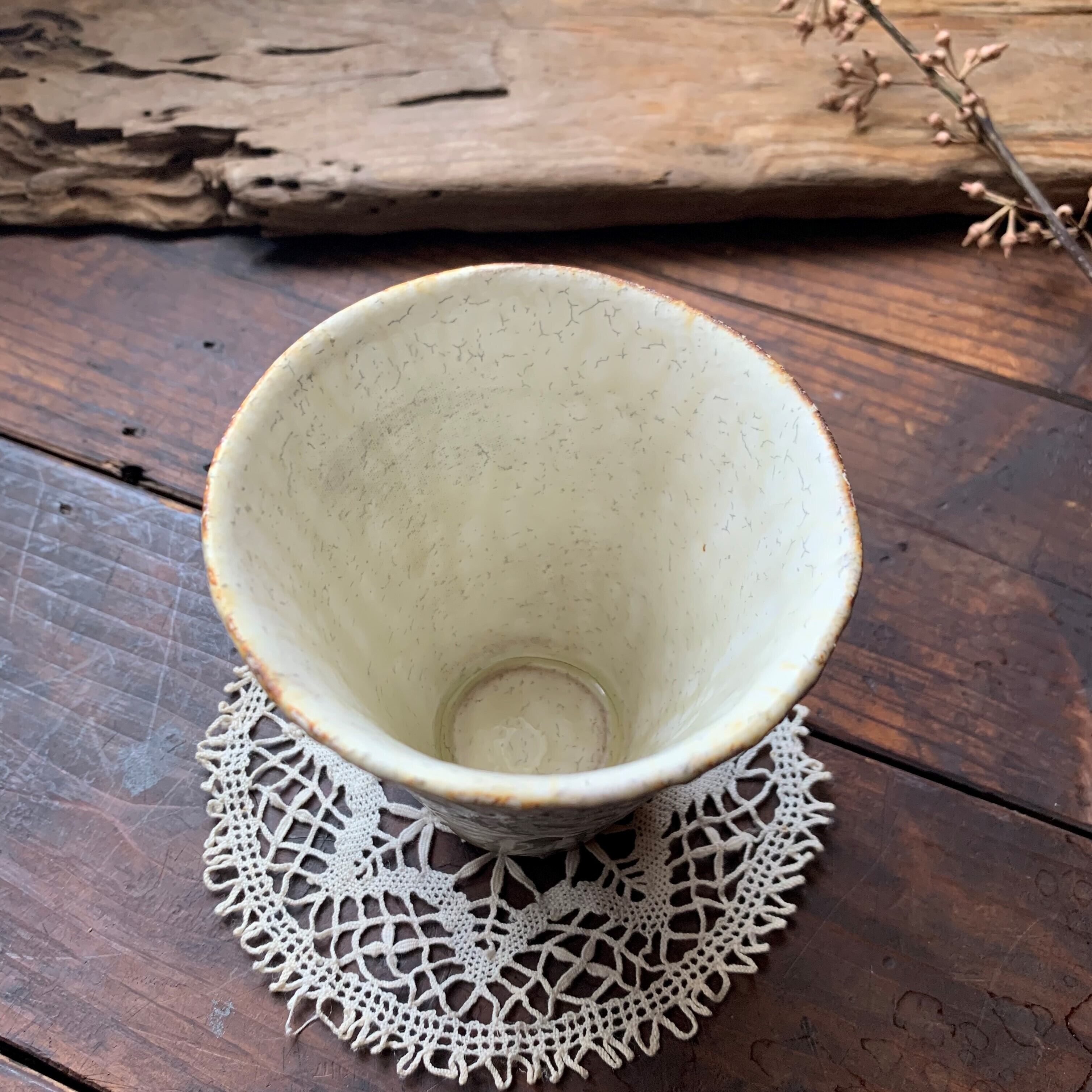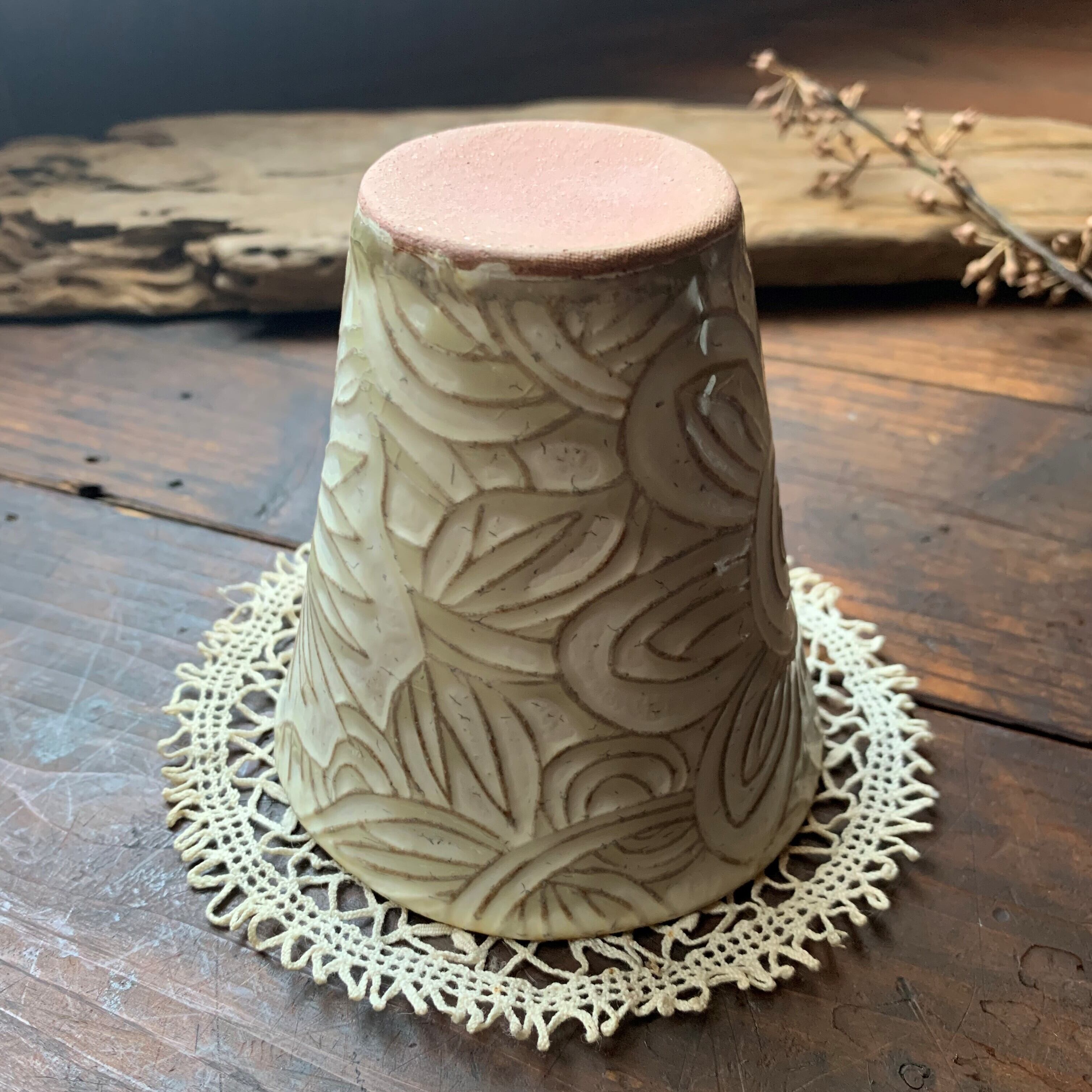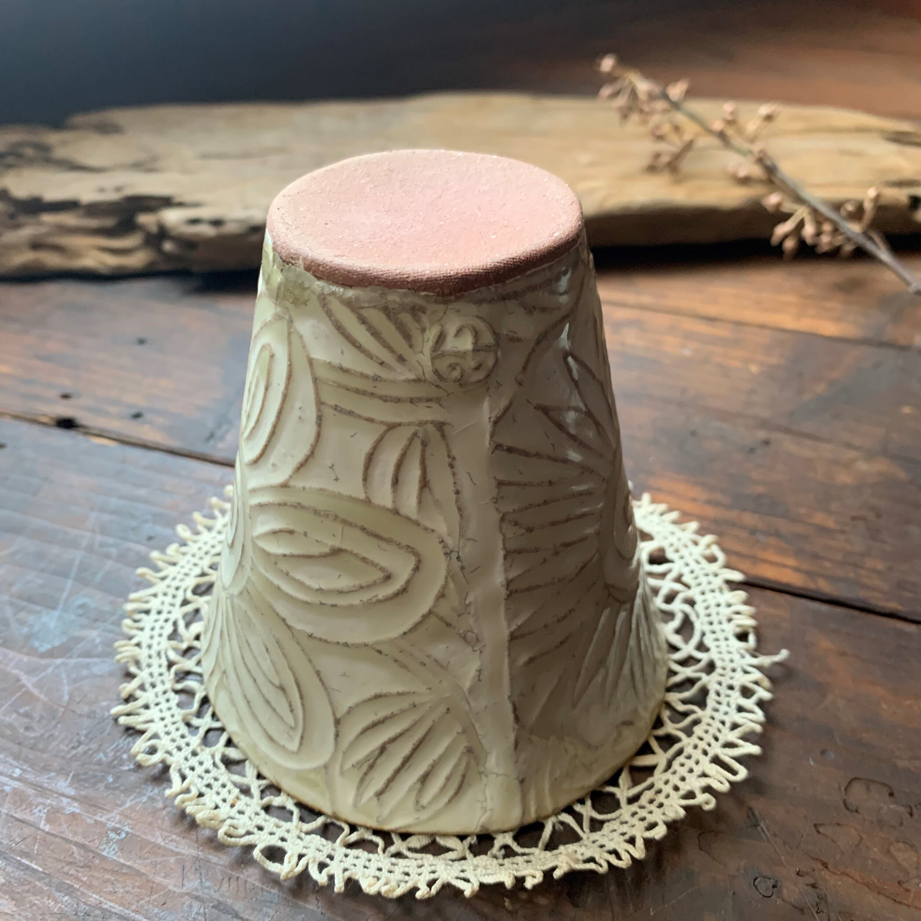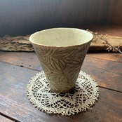 お花模様の刻文が入ったアイボリー色のフリーカップです。どんな飲み物も美味しく素敵に演出してくれます。
