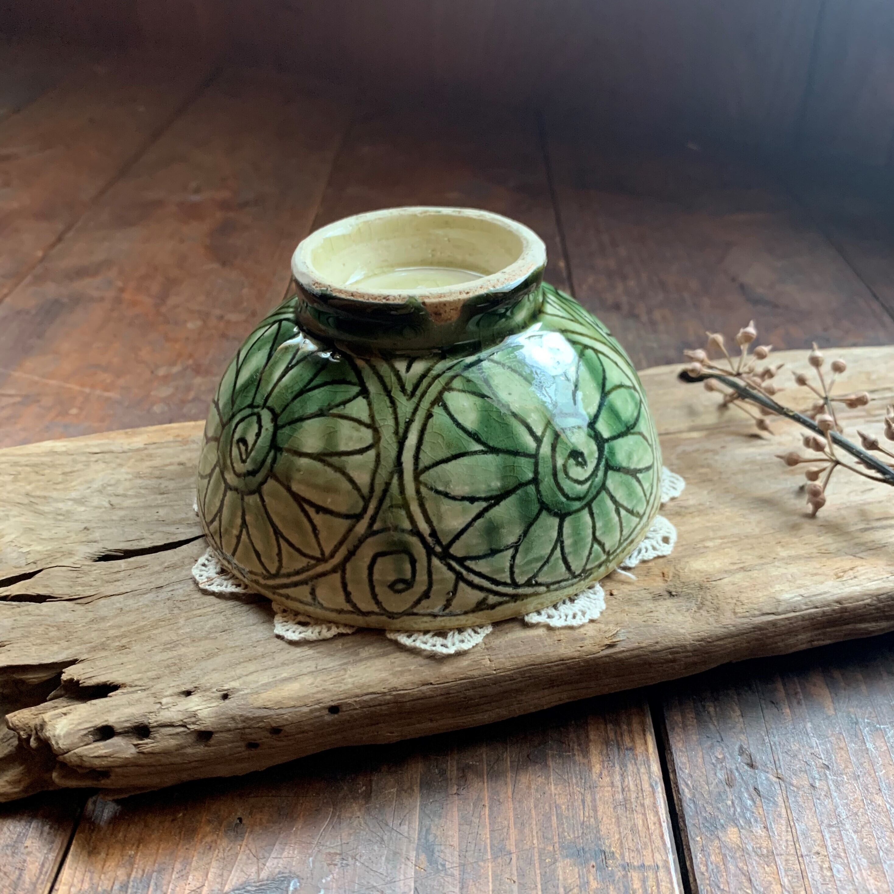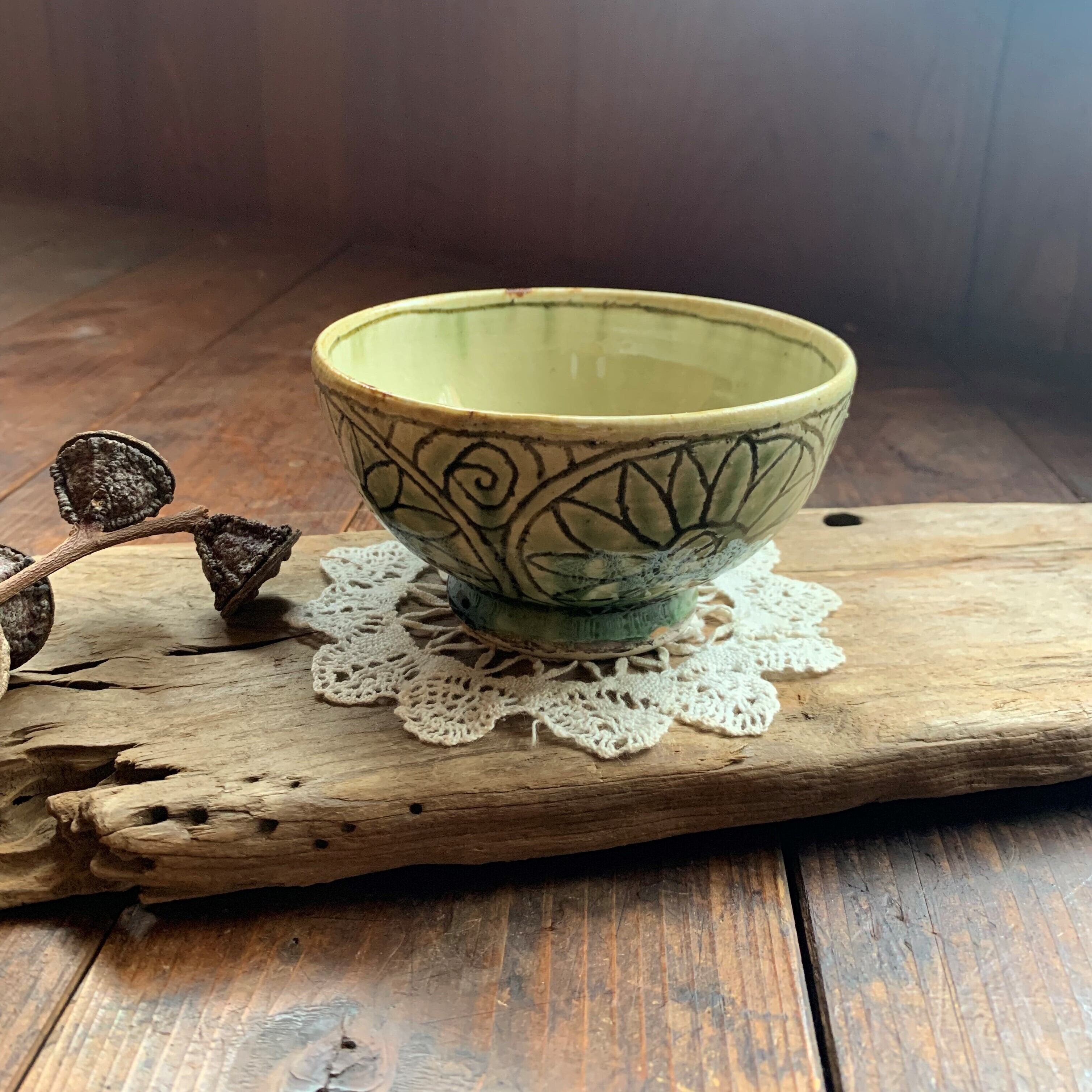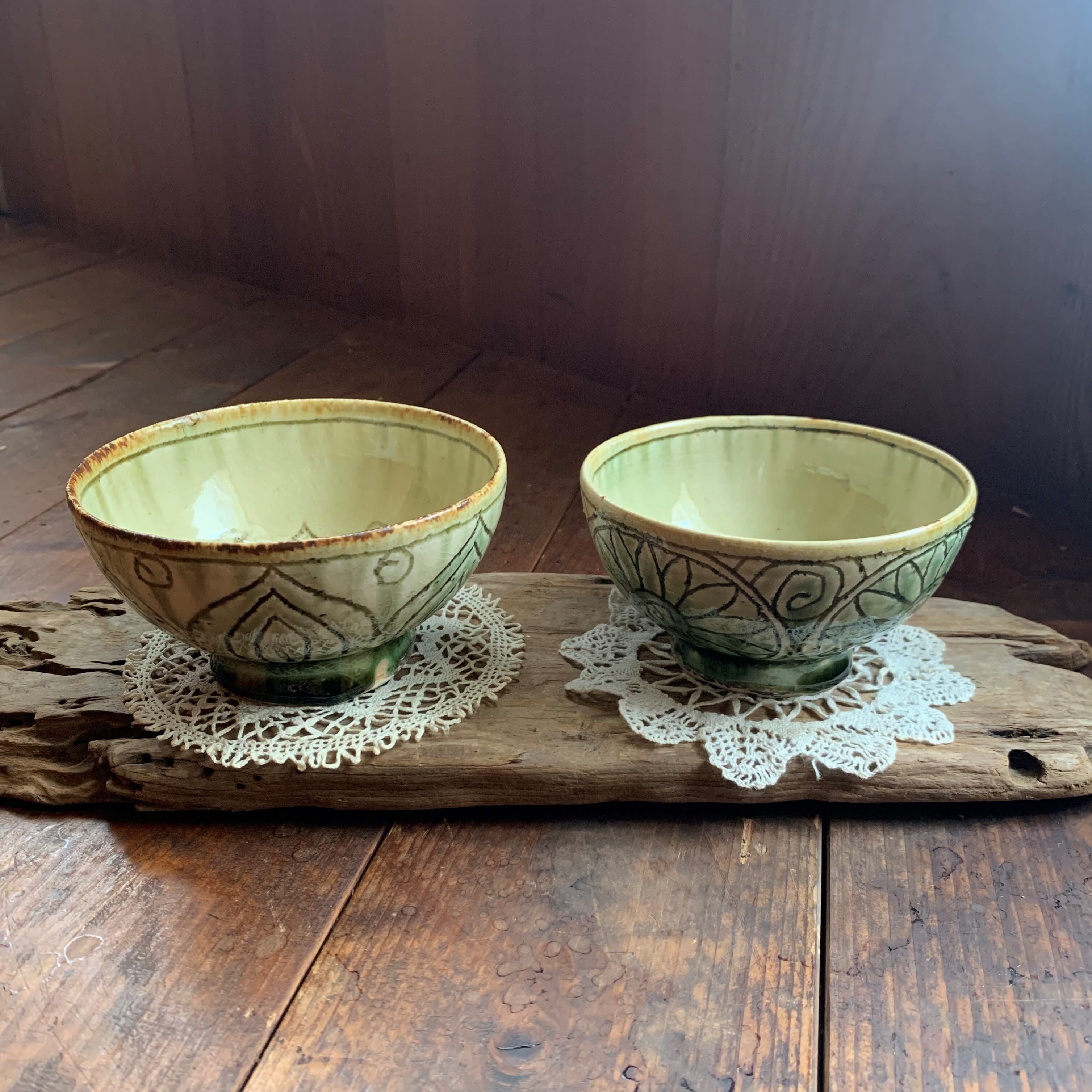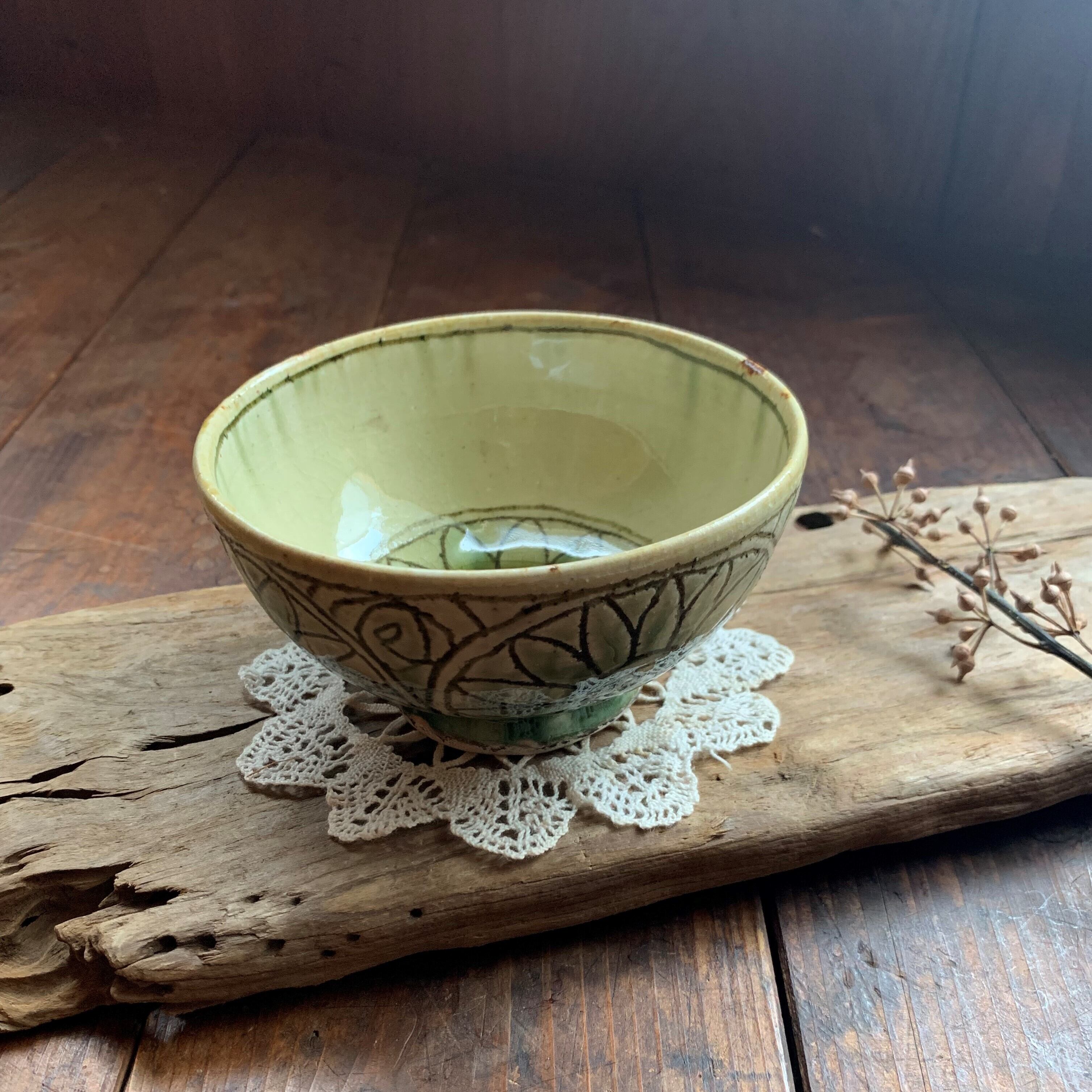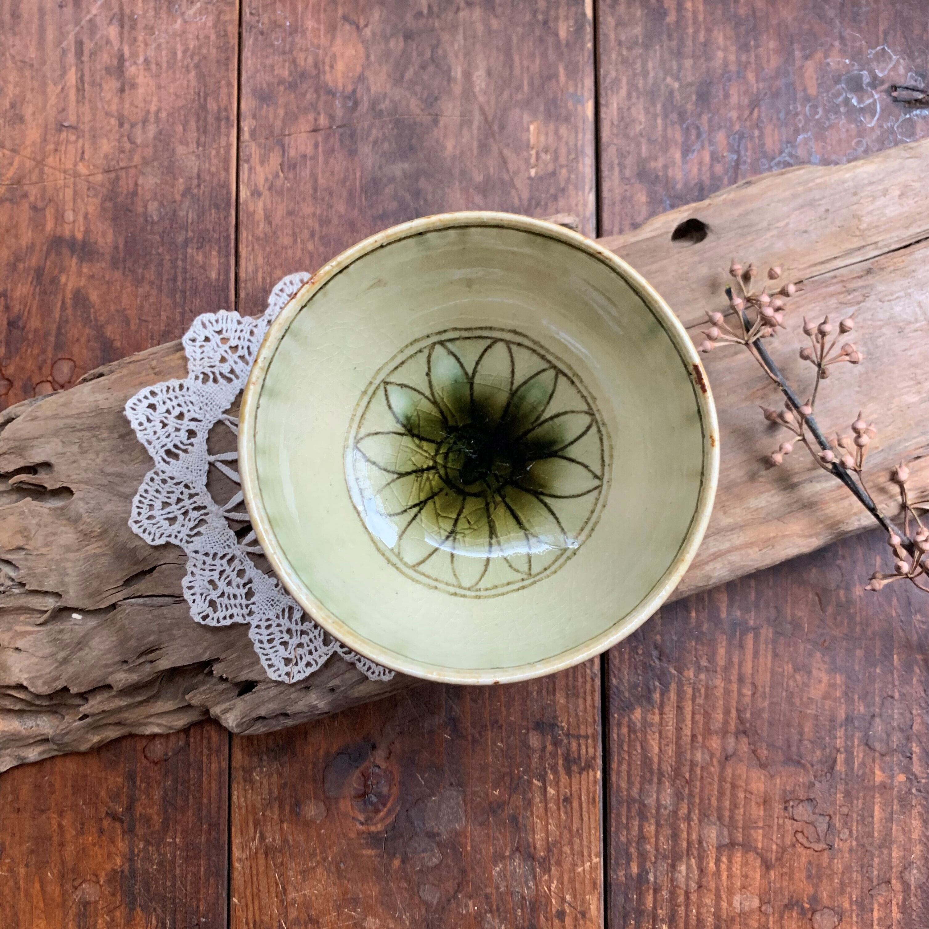 個性豊かな刻文の入った緑灰釉のお茶碗です。毎日のご飯を最後の一粒まで美味しくいただけそうな…そんなお茶碗です。別売のお茶碗(大)と合わせると夫婦茶碗になります。こちらはお茶碗(小)のみの販売になります。