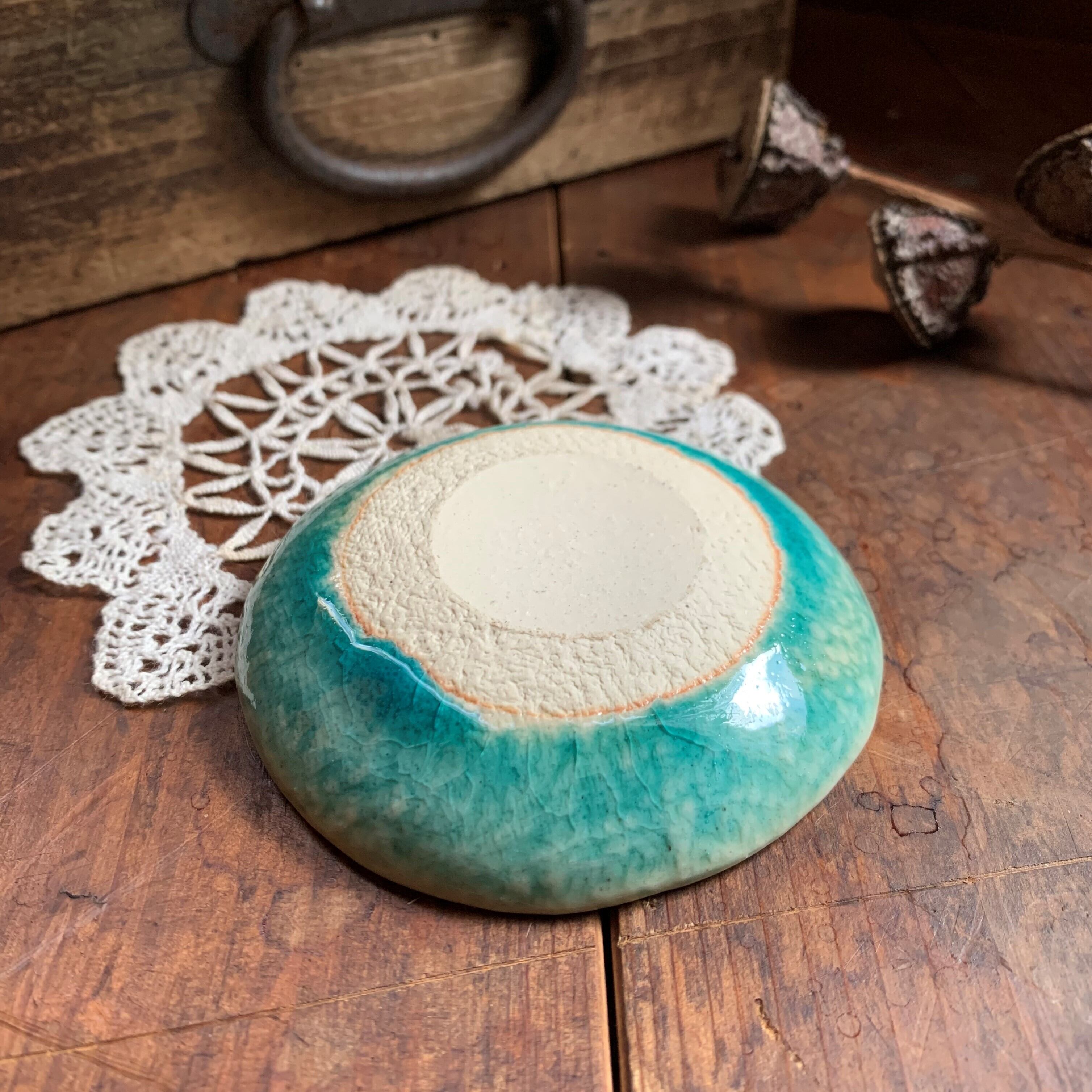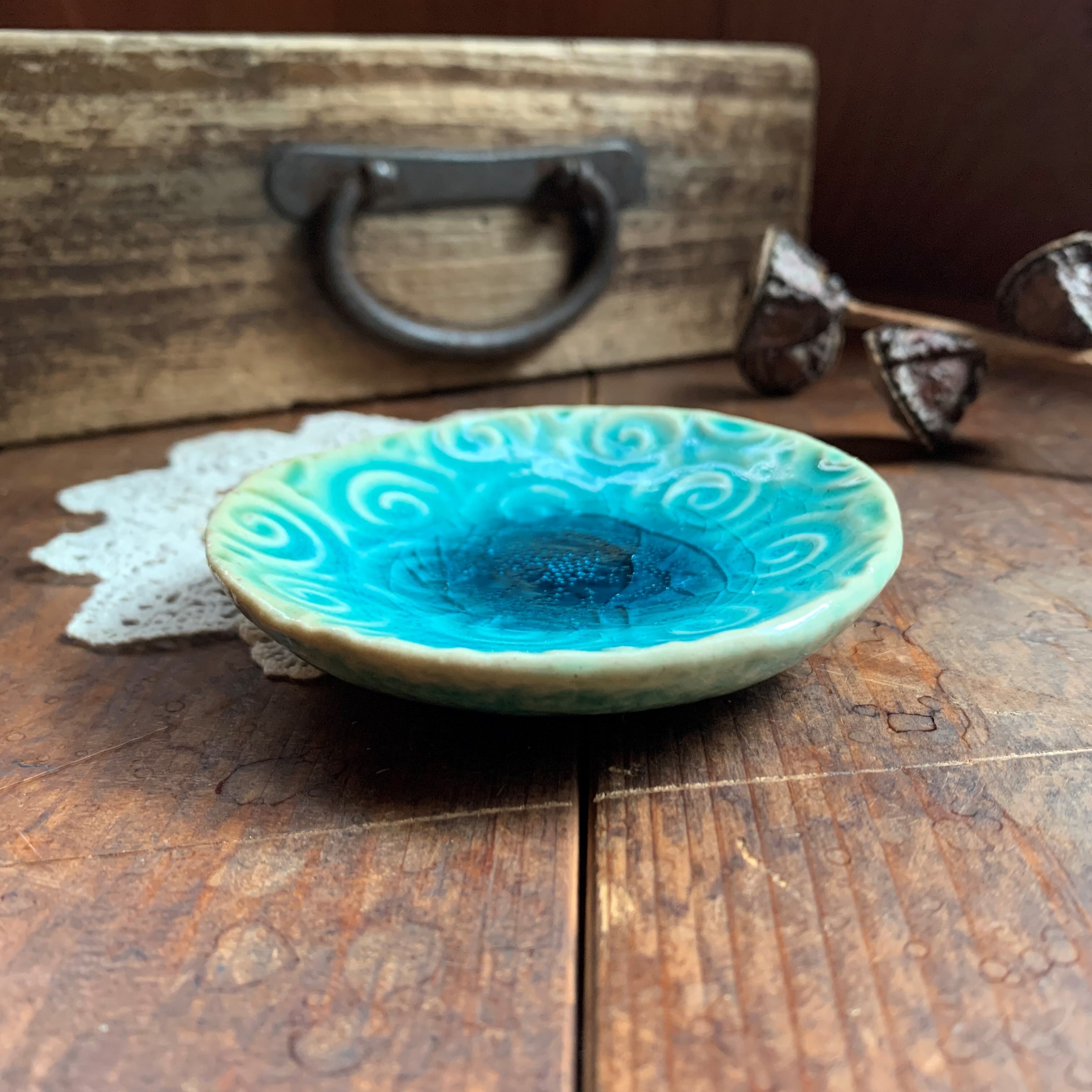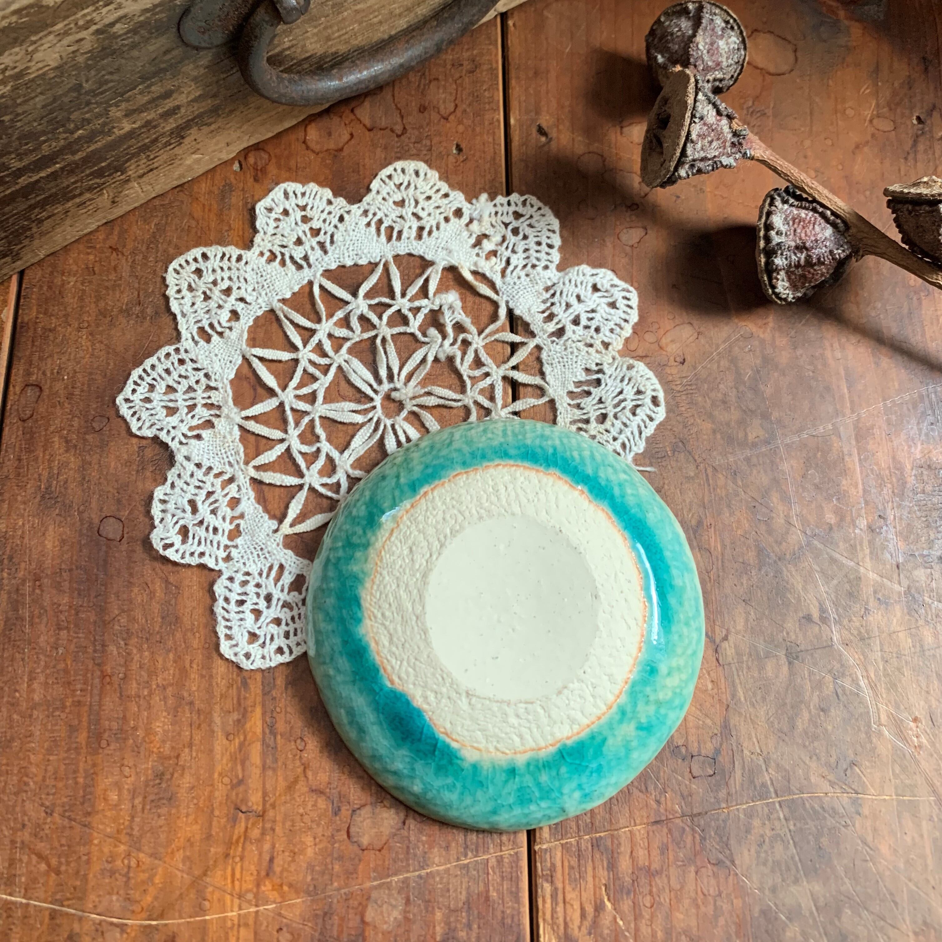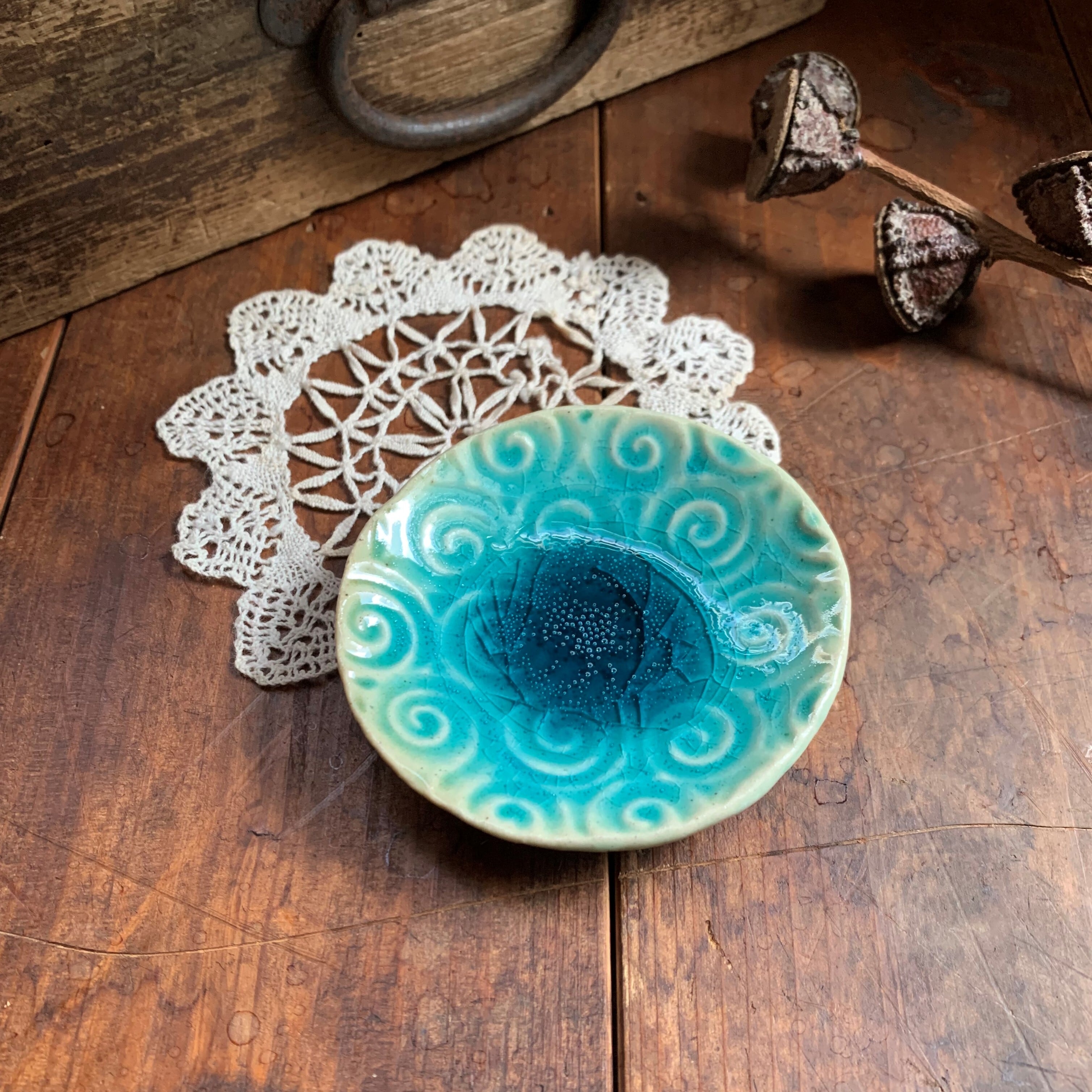ターコイズブルーに全面のうずまき模様が素敵な豆皿です。さりげない個性を感じさせてくれる豆皿です。光沢があります。