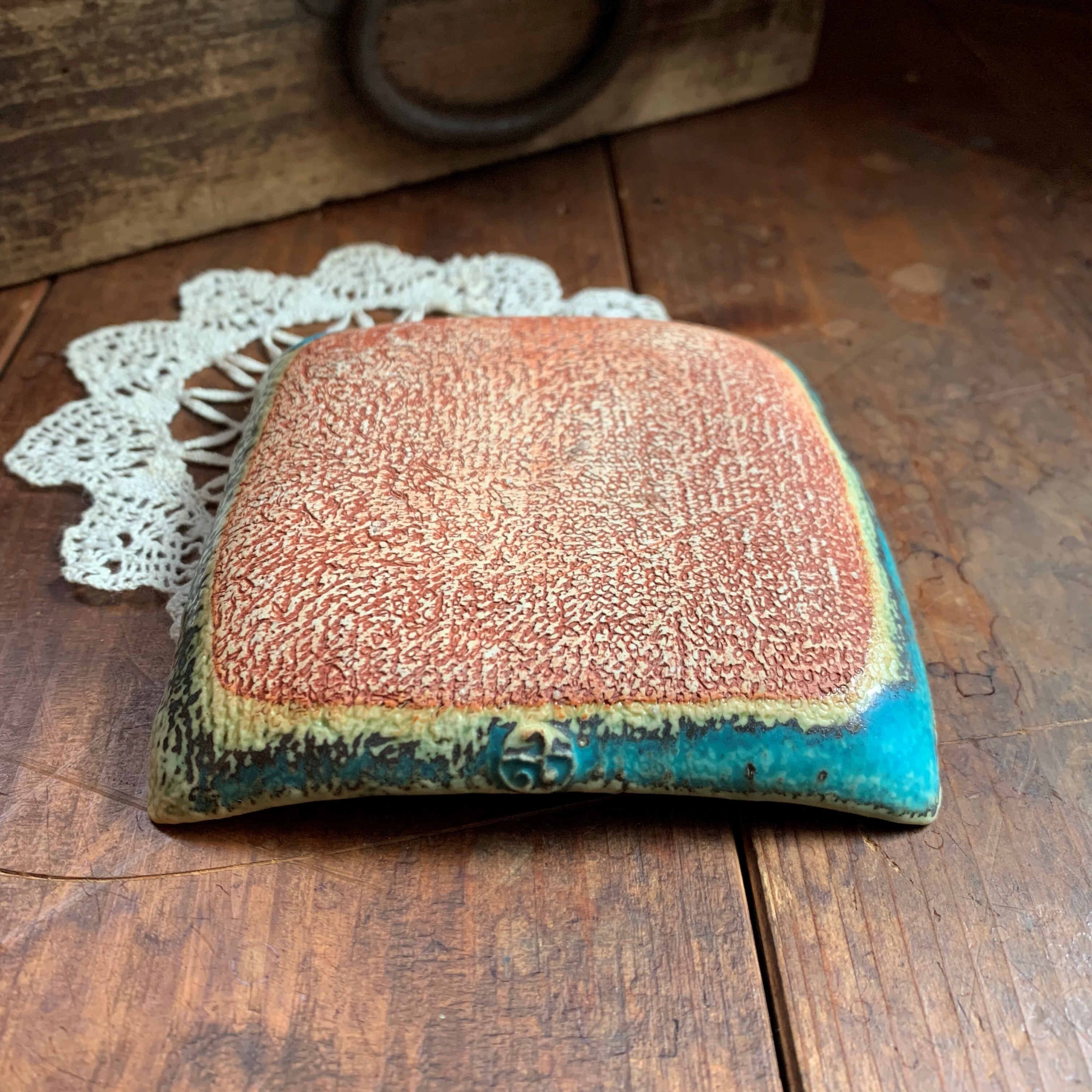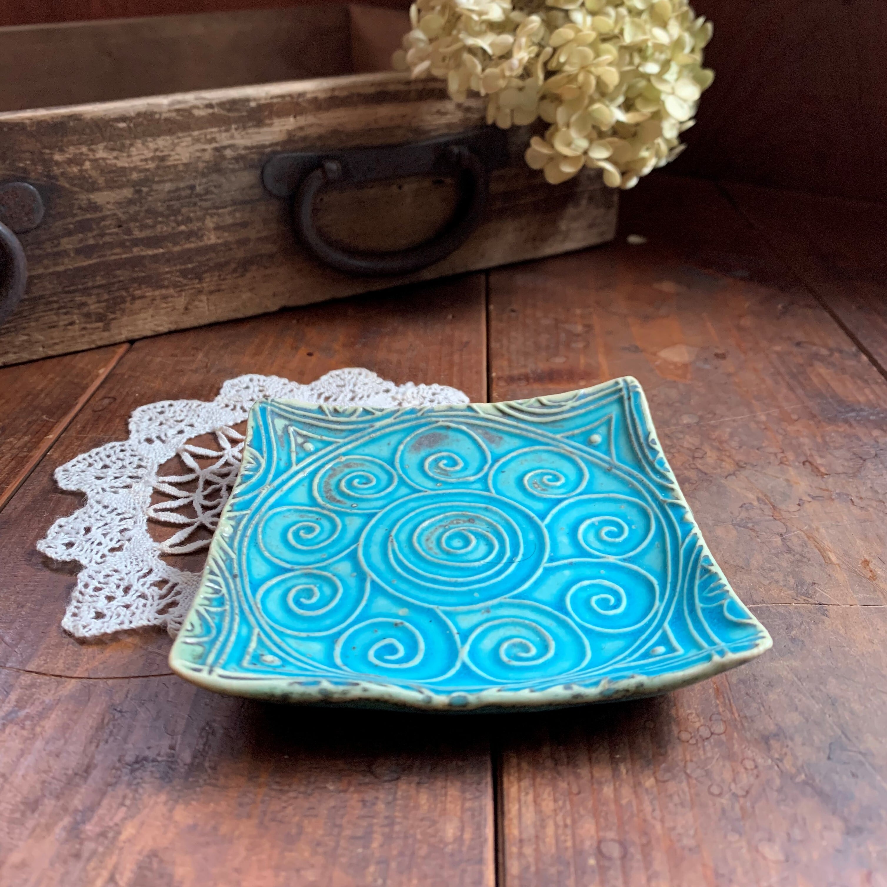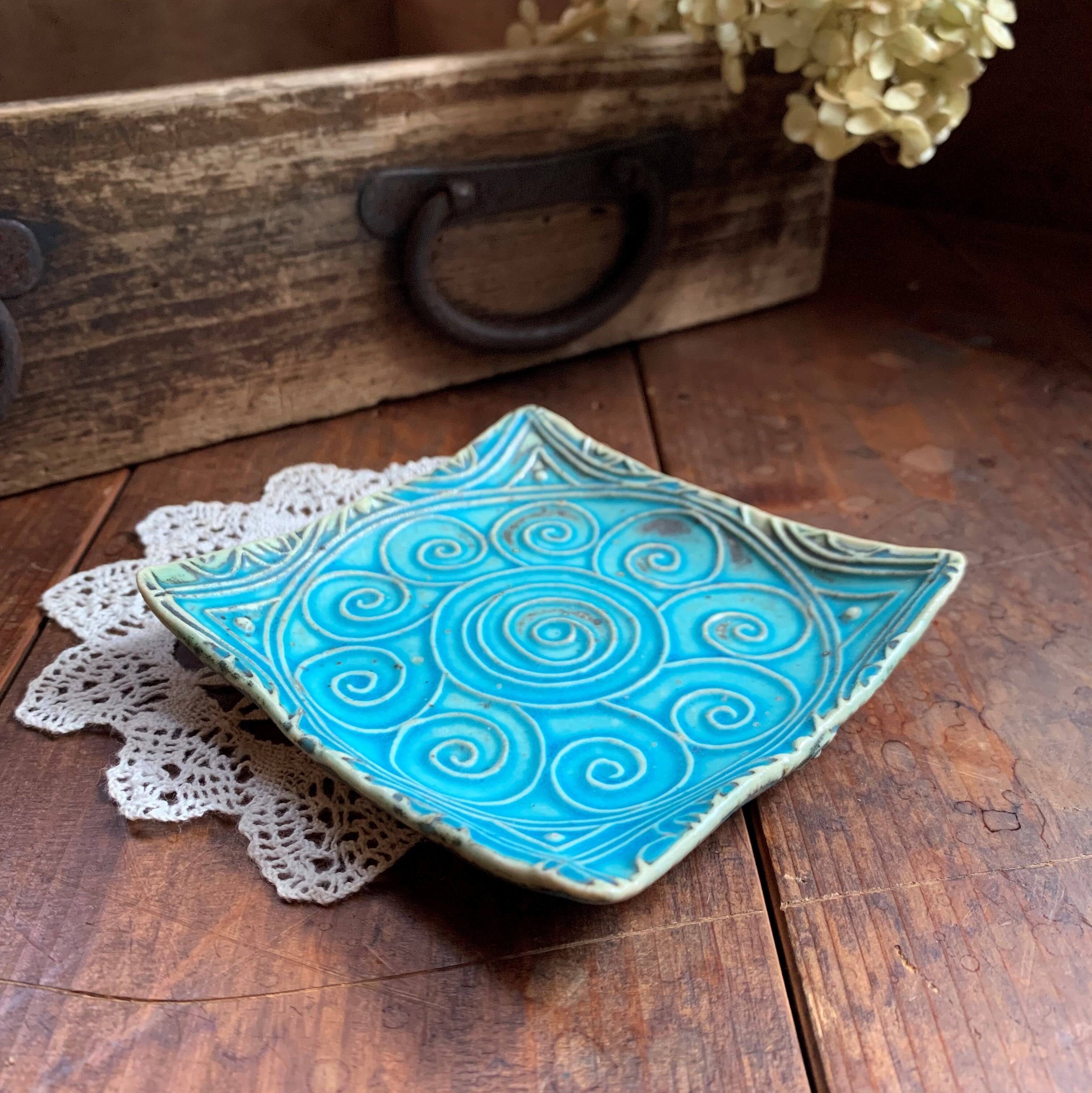 きれいなターコイズブルーに個性豊かなうずまき模様の入った豆角皿です。少し深さがあるので醤油皿や小さい和菓子などを乗せても素敵です。