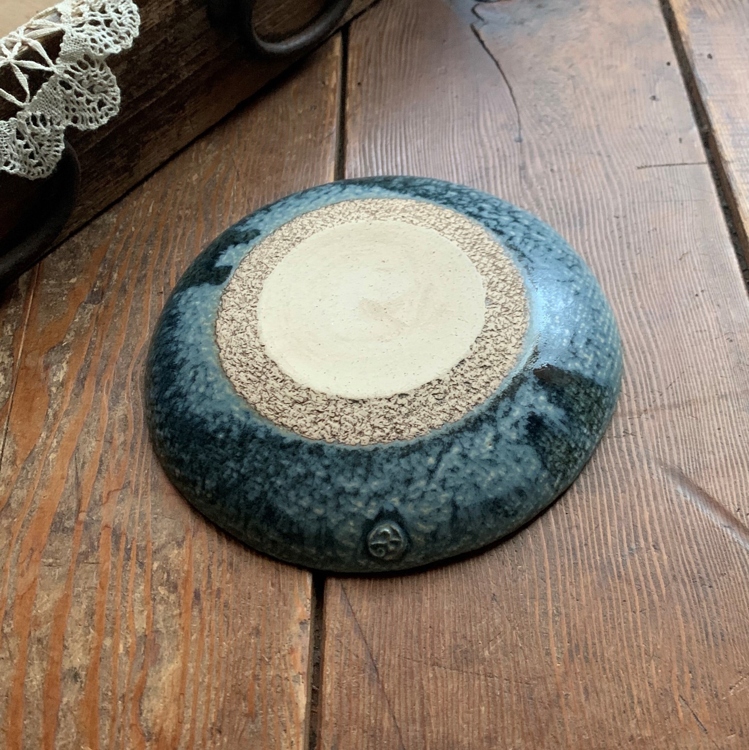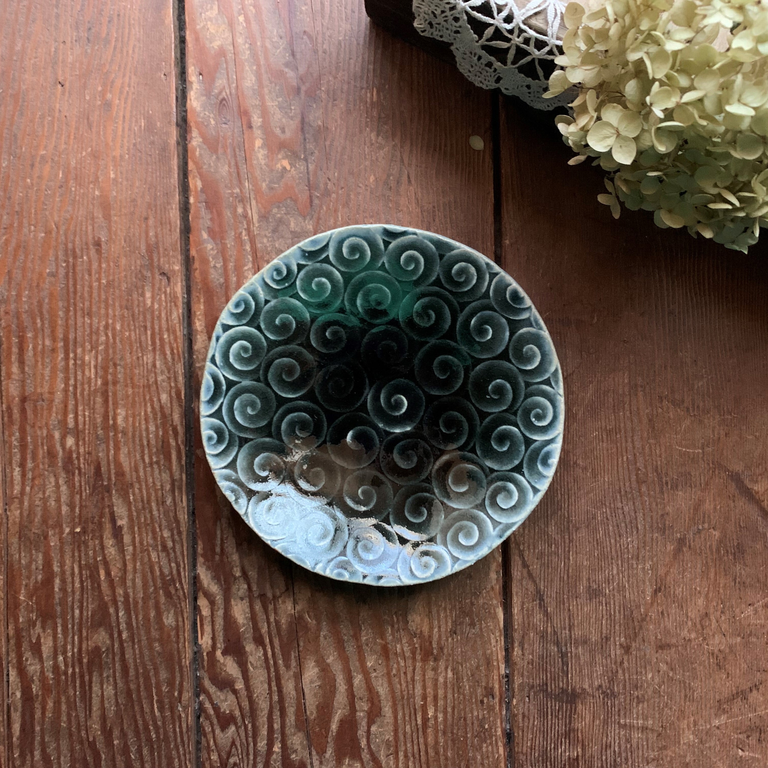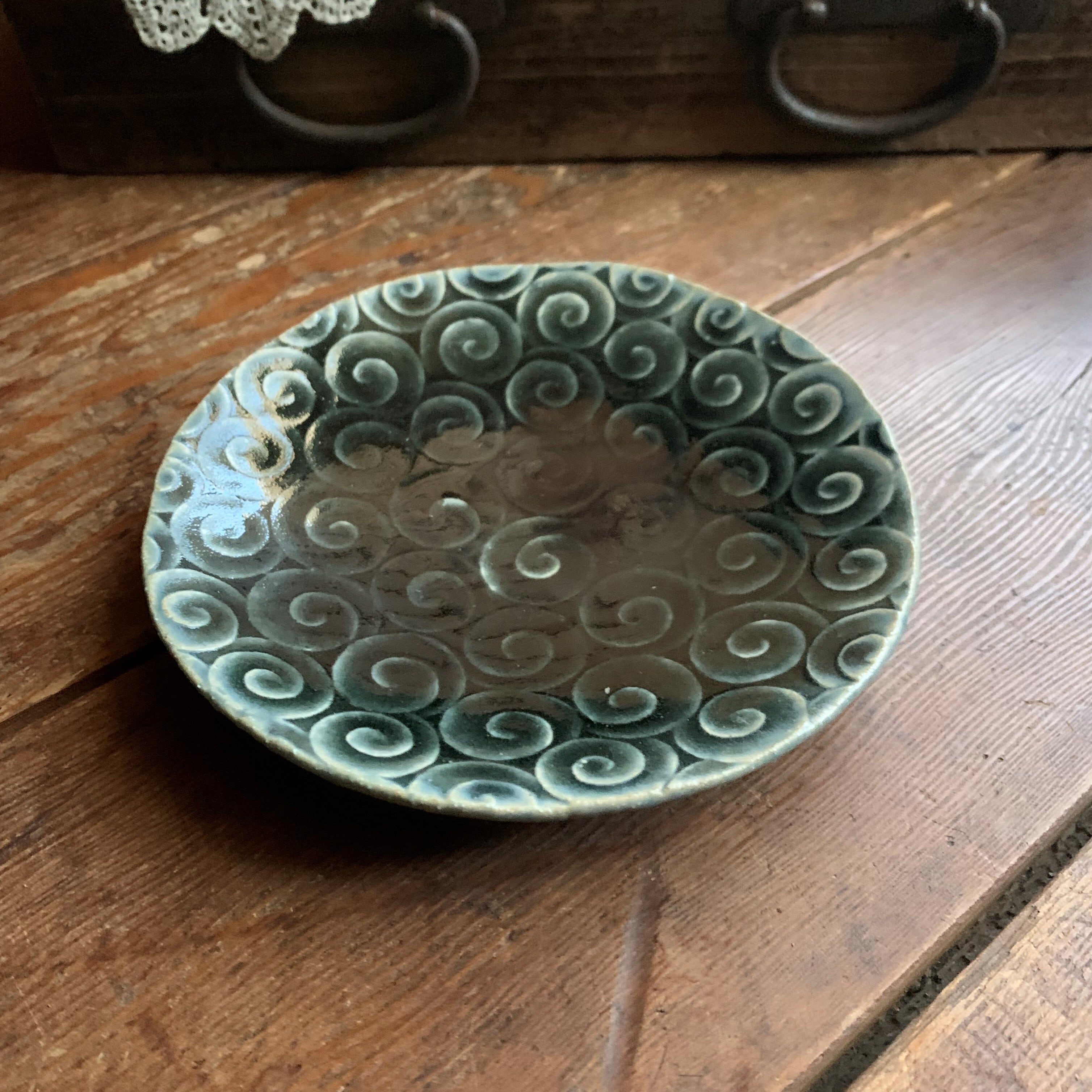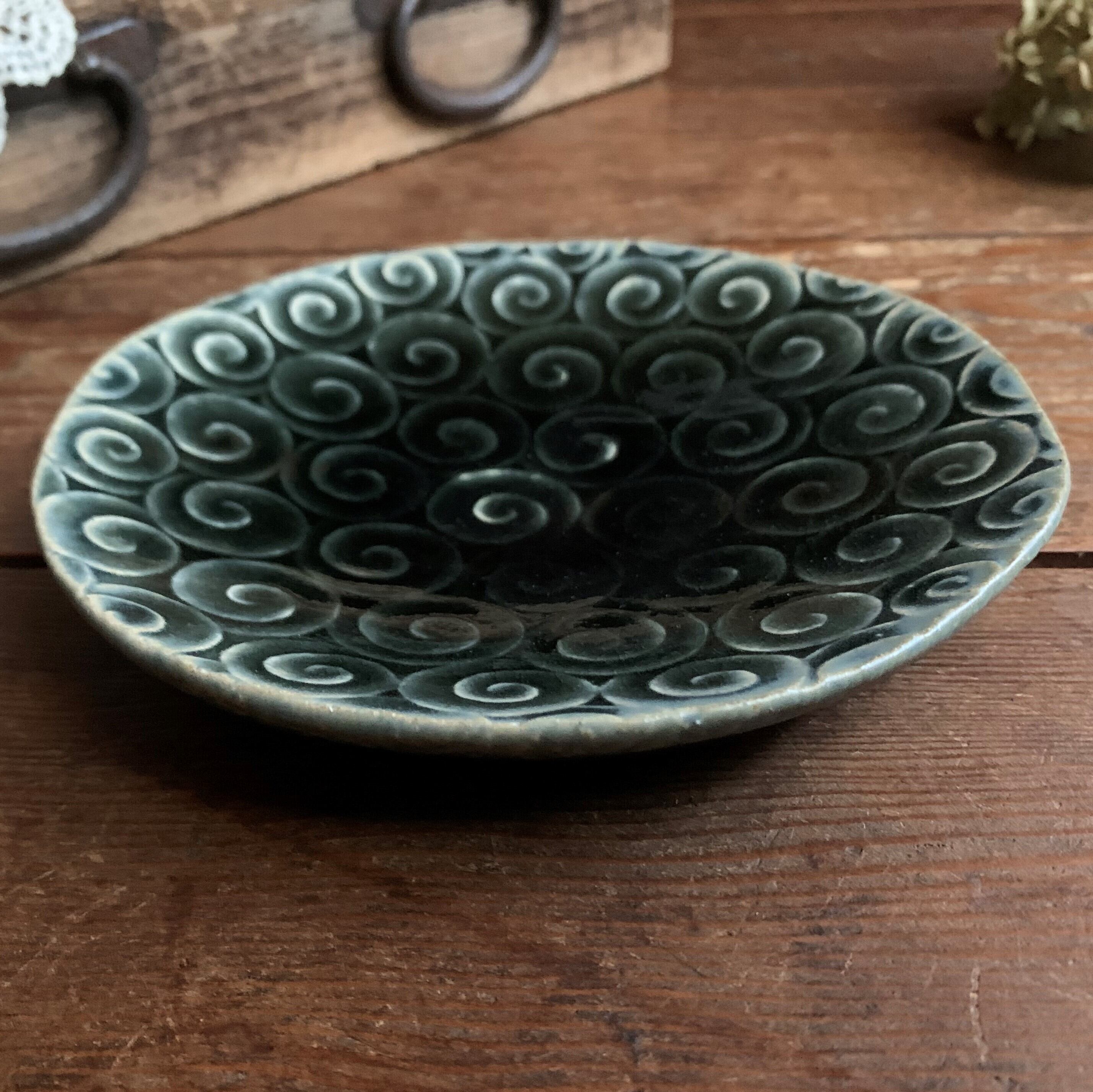 藍色釉にうずまき模様が素敵な中皿です。取り皿にちょうど良い大きさです。深い藍色ですが、どちらかというと黒に近いお色味です。光沢があります。