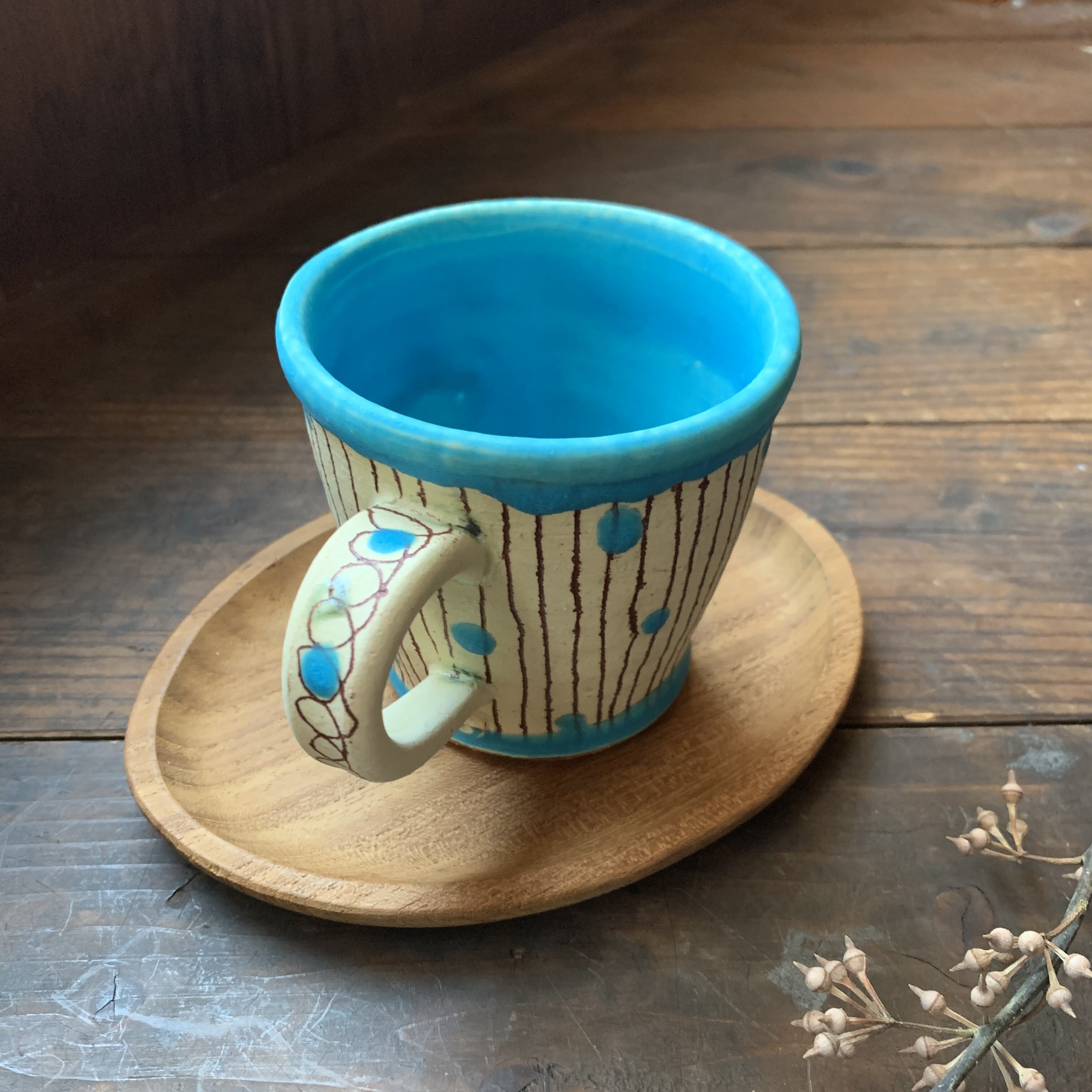 鮮やかなブルーとホワイトに、個性的なラインが施された、マグカップです。