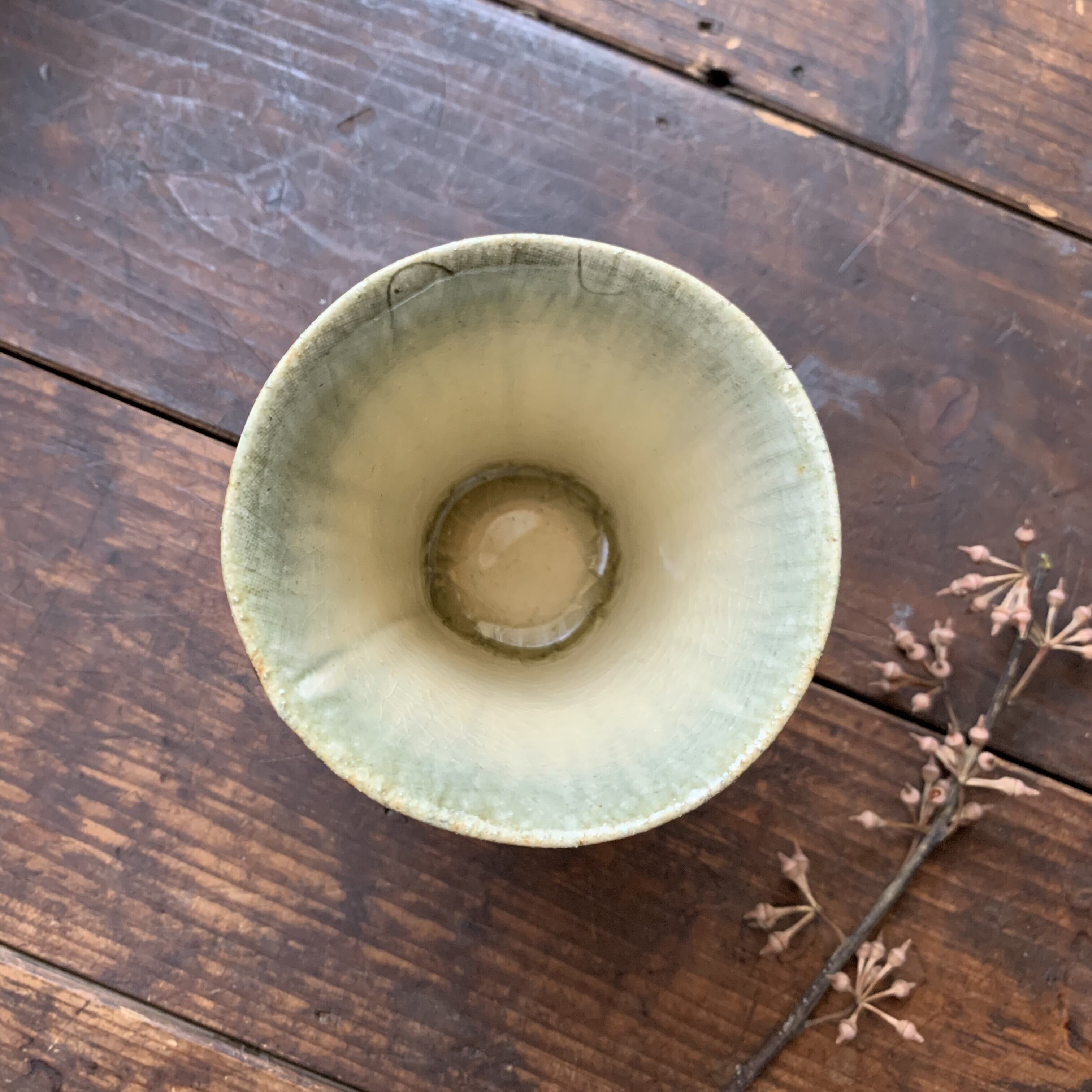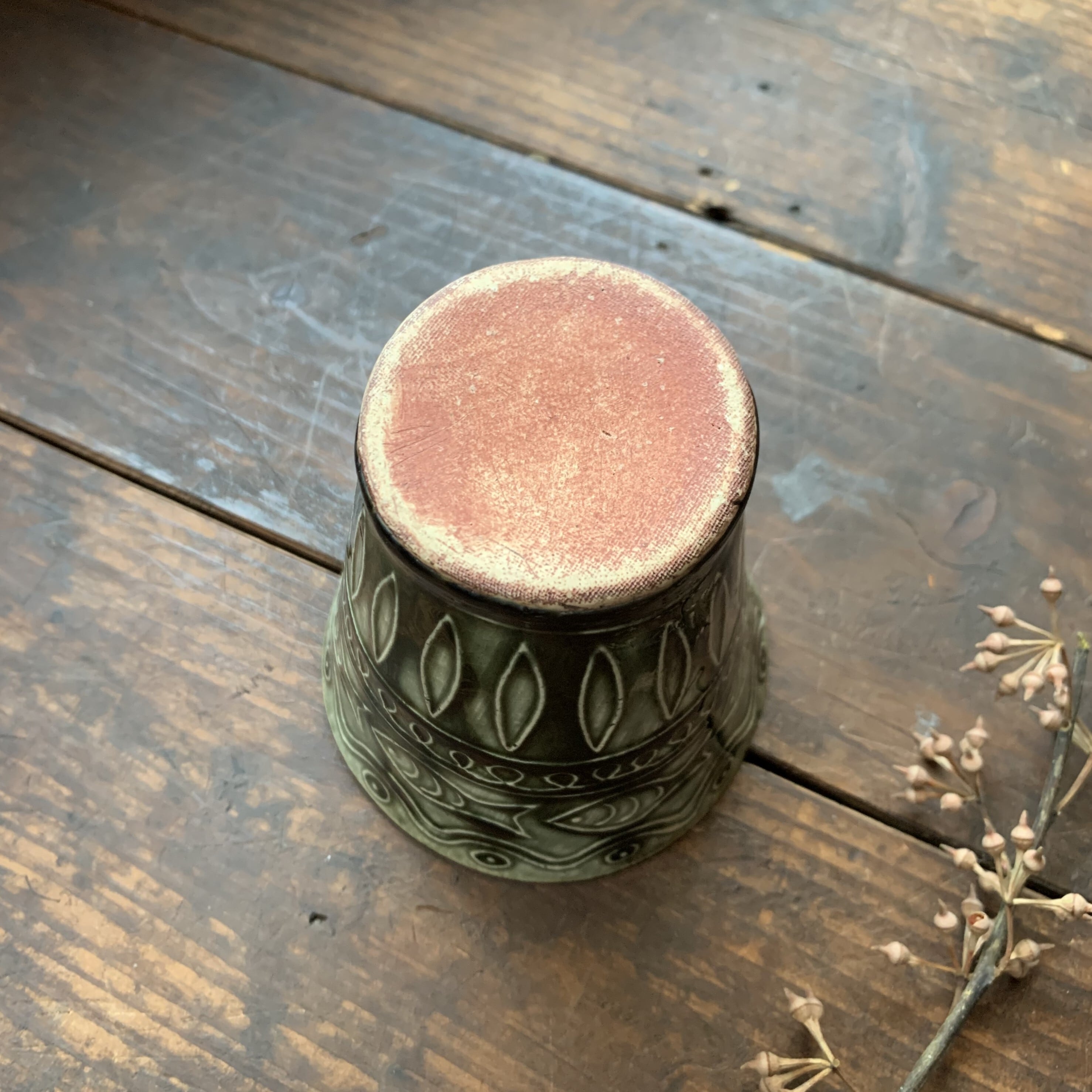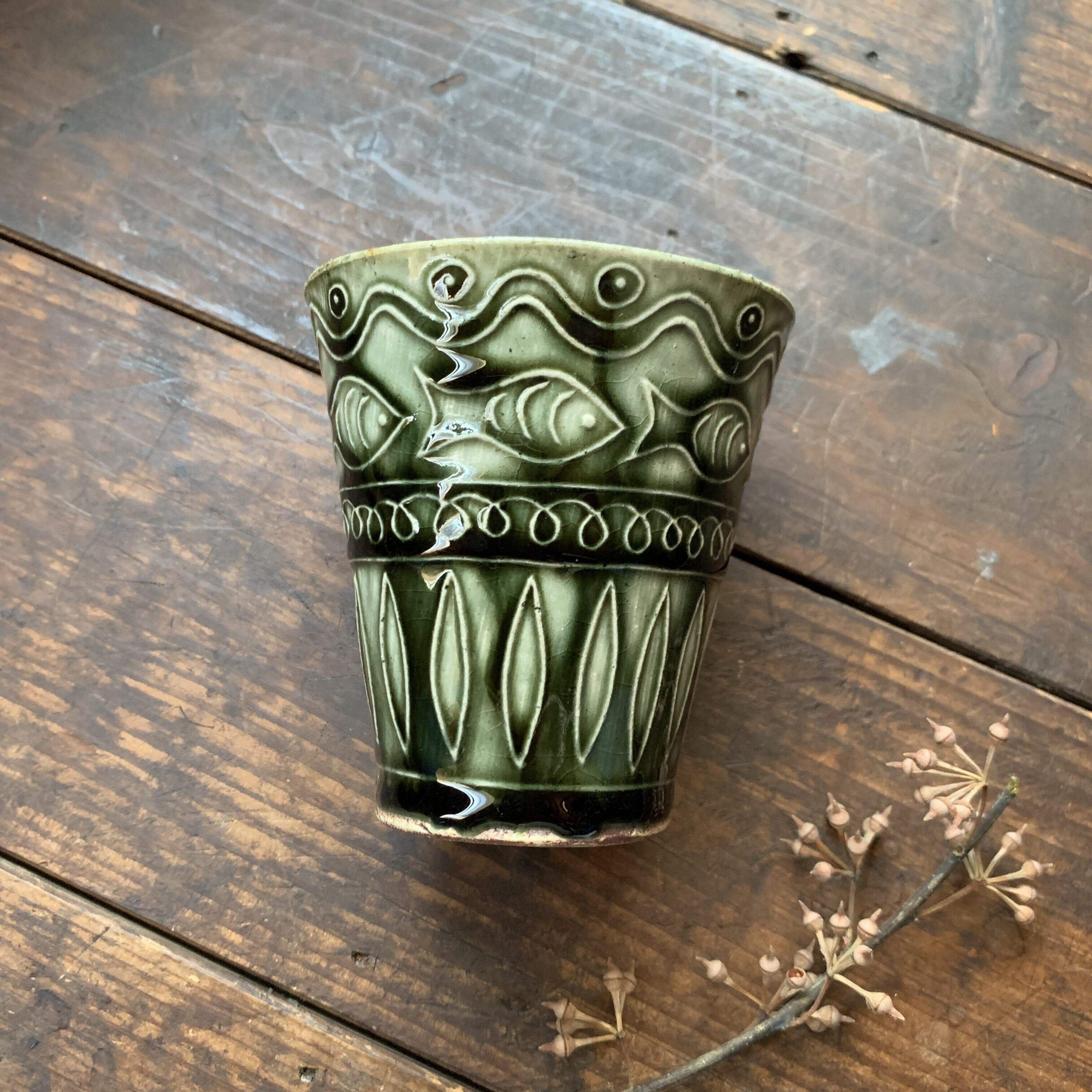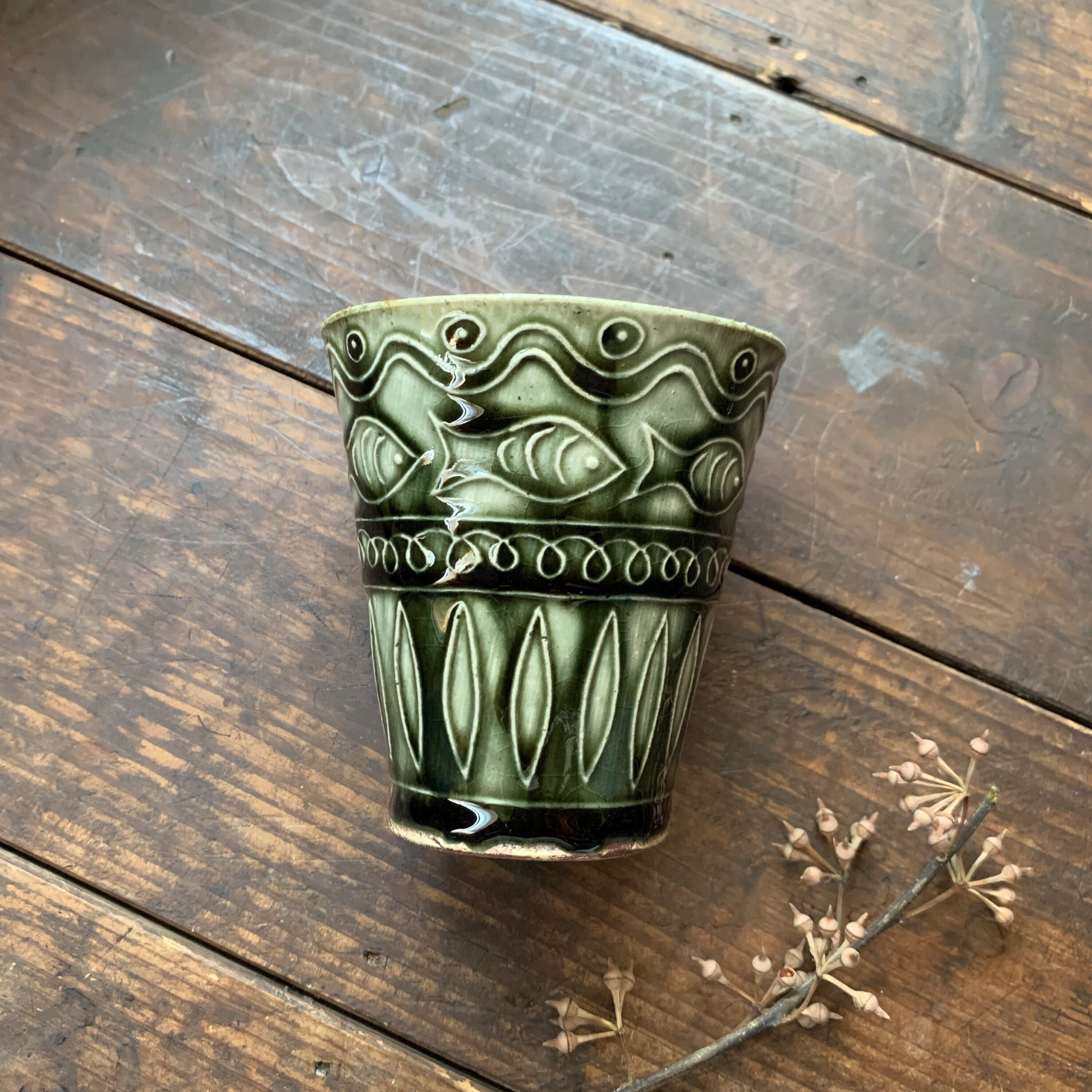 深緑の濃淡が美しく、ゆらゆらとお魚が泳いでいるかのような、個性豊かな刻文が入った緑灰釉のフリーカップです。