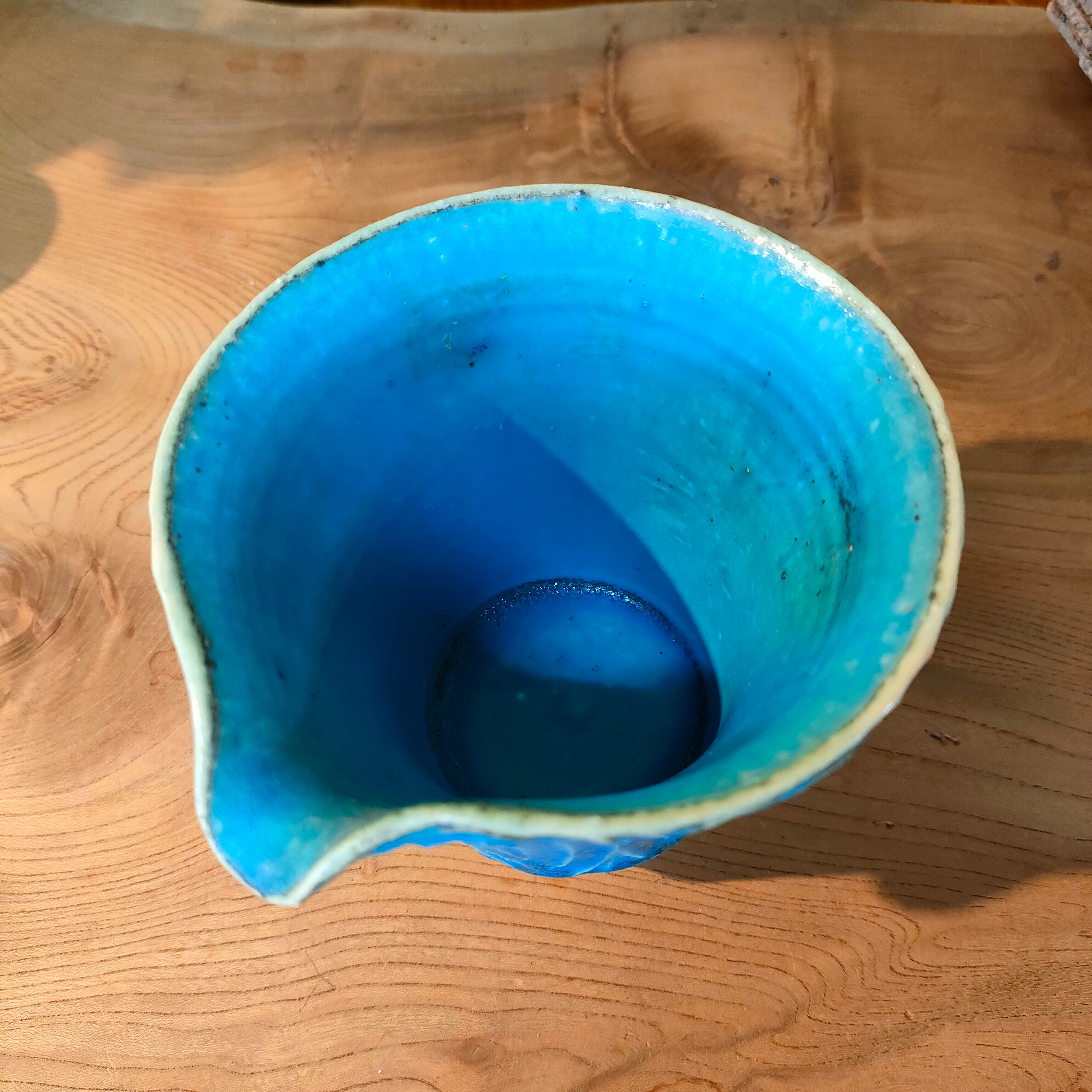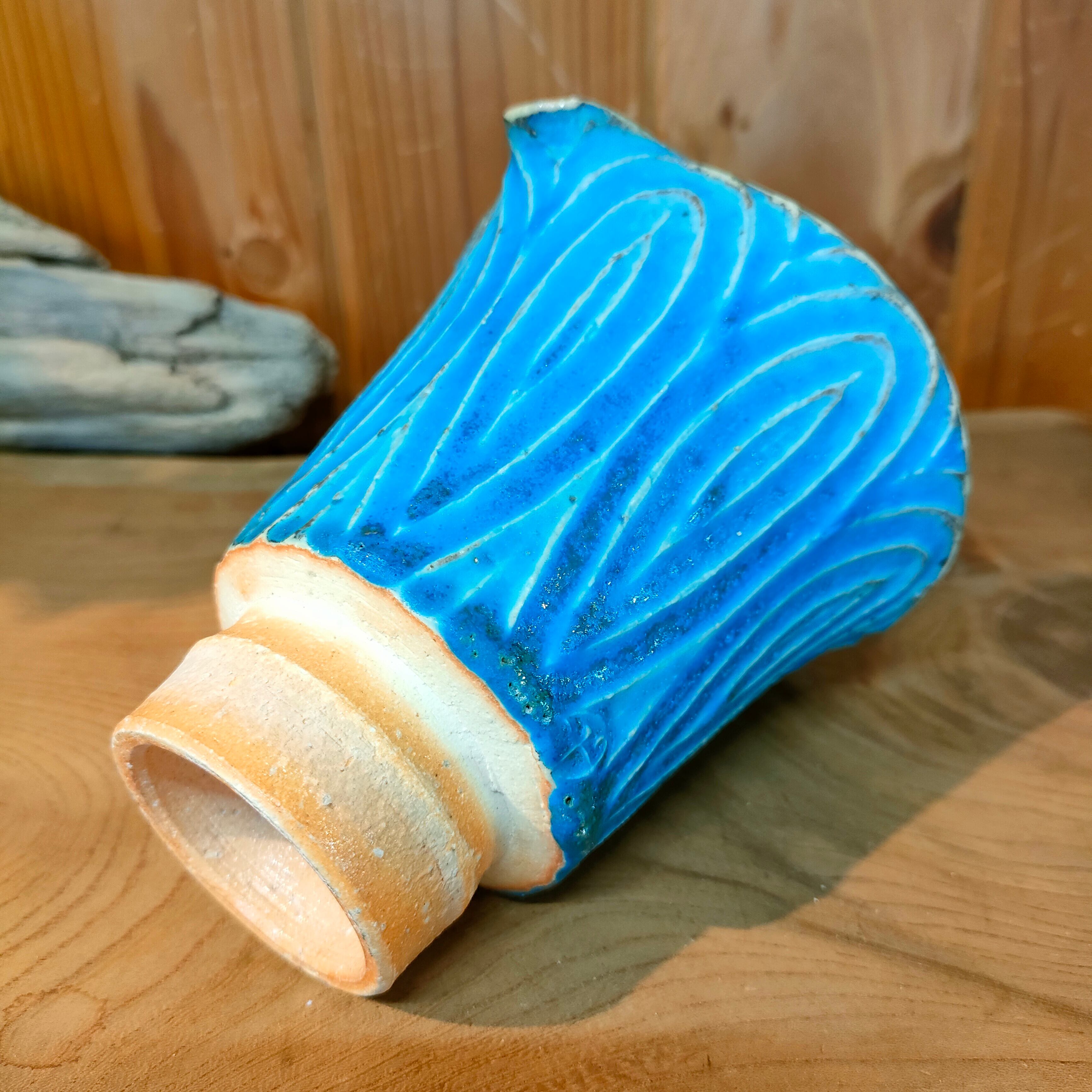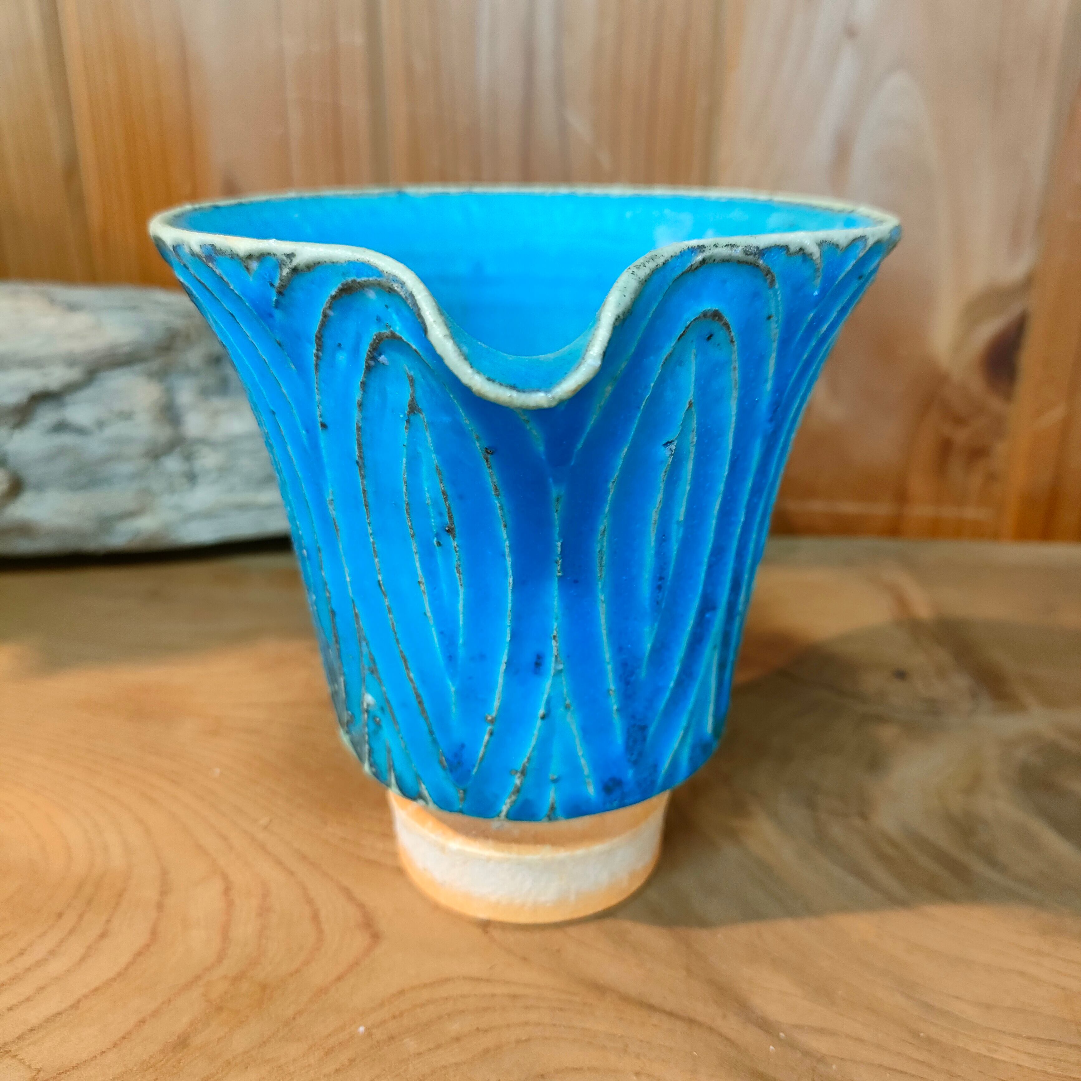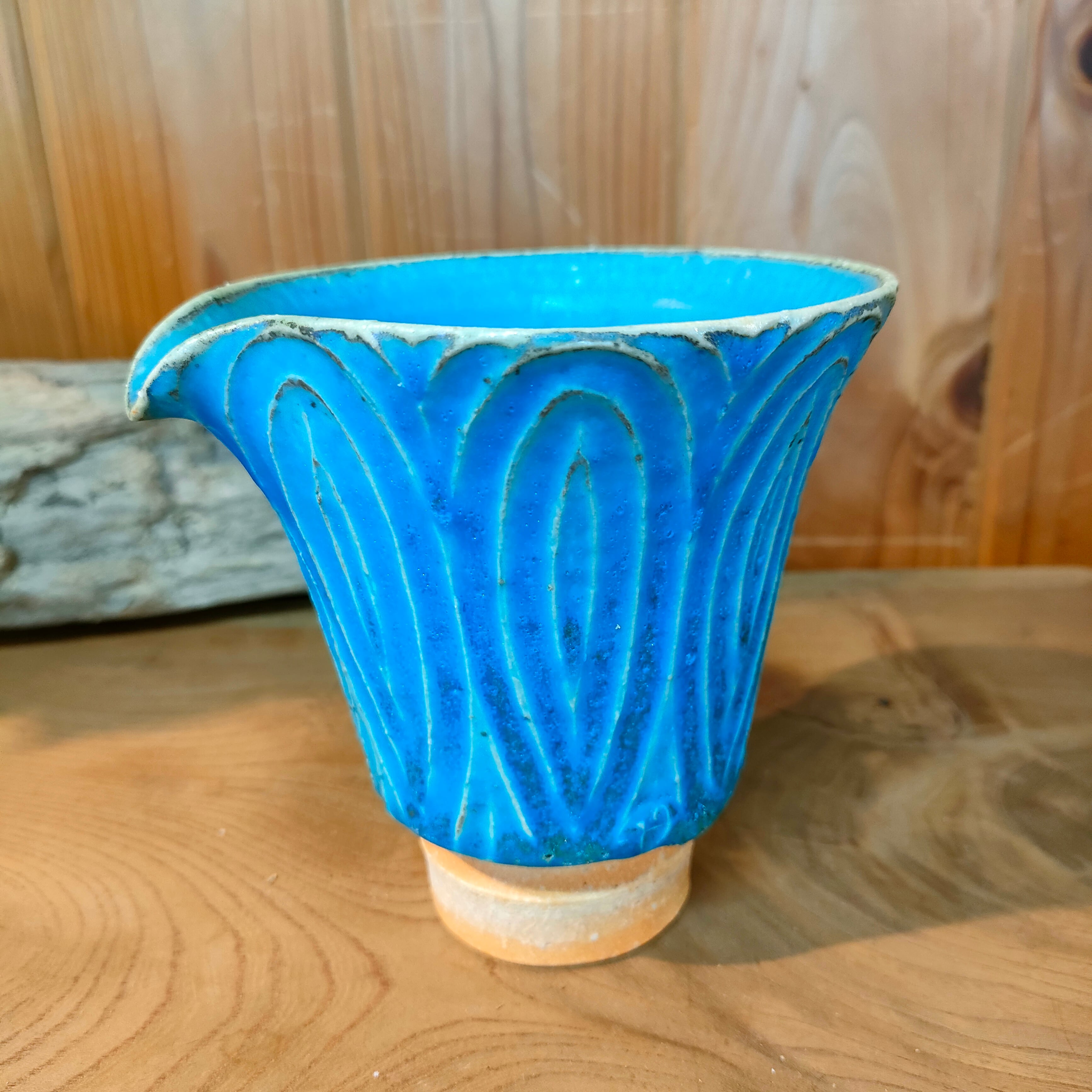 きれいなターコイズブルーに個性豊かな刻文の入った片口酒器です。