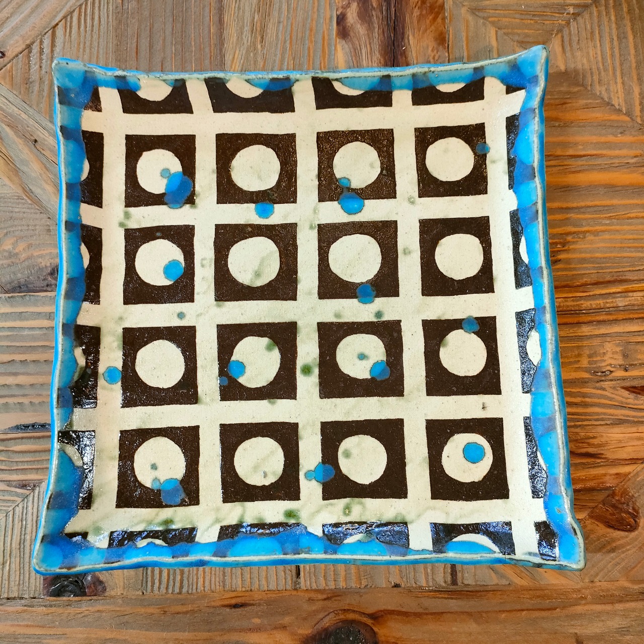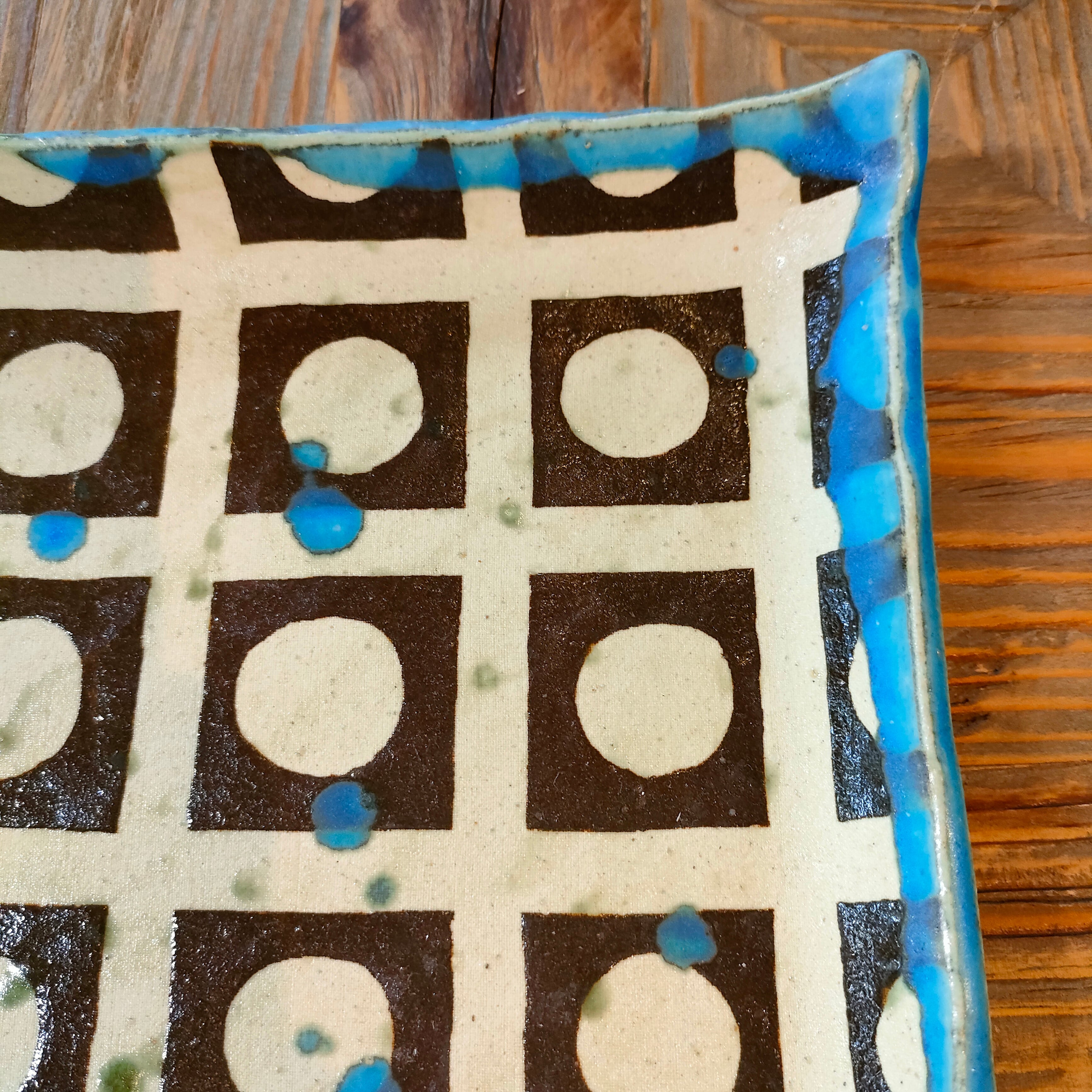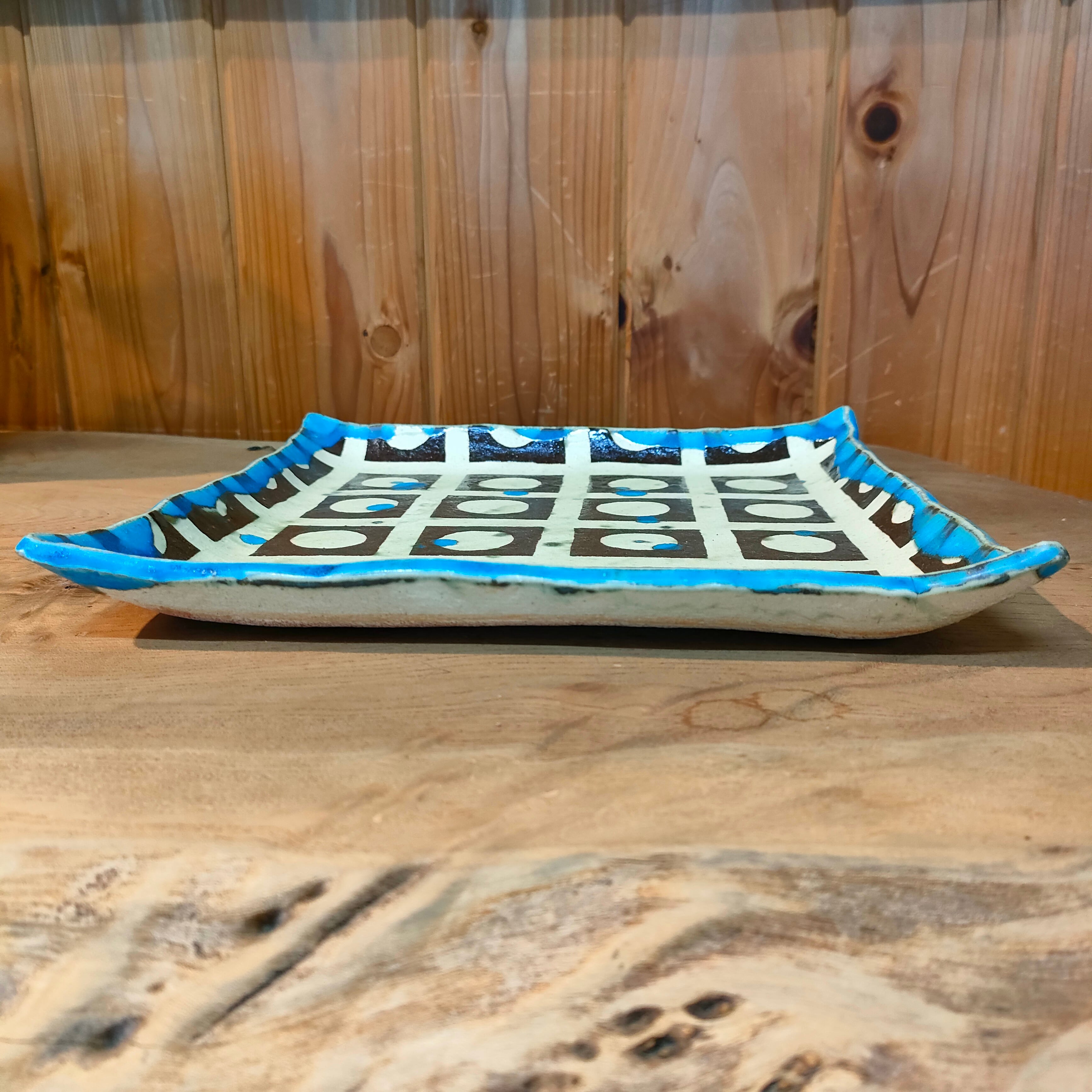 手作りならではの、色合いと柄が独特な雰囲気を醸し出している角皿です。