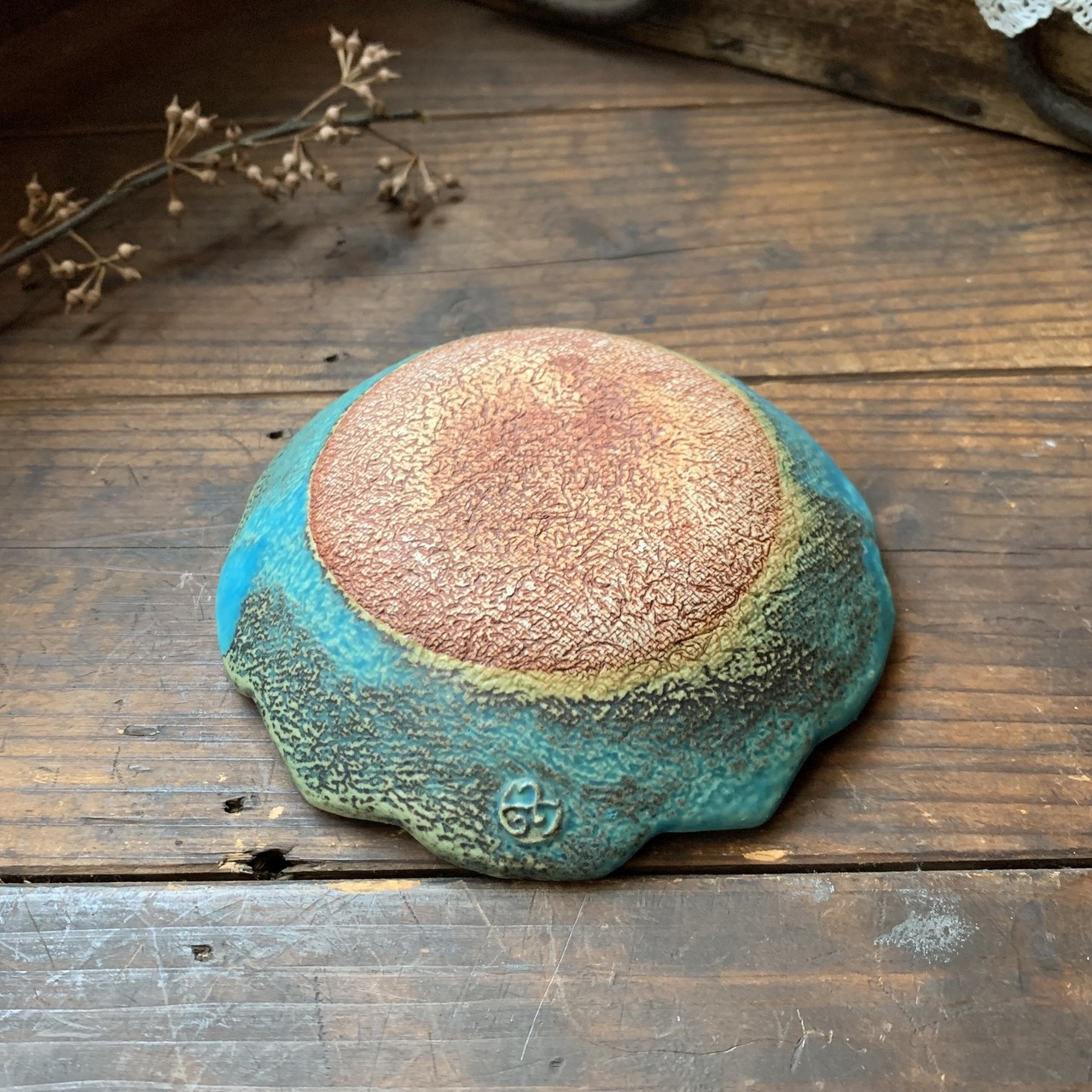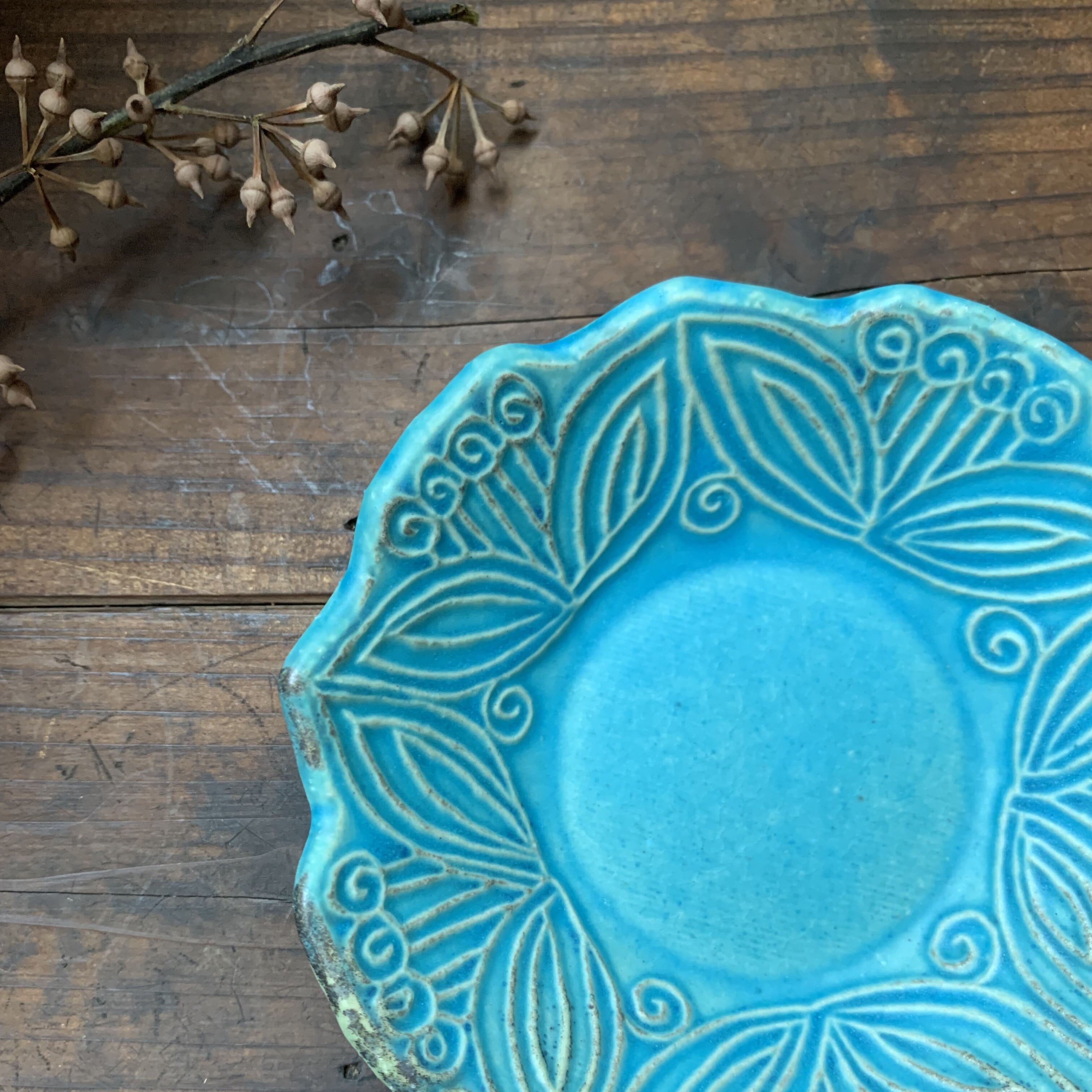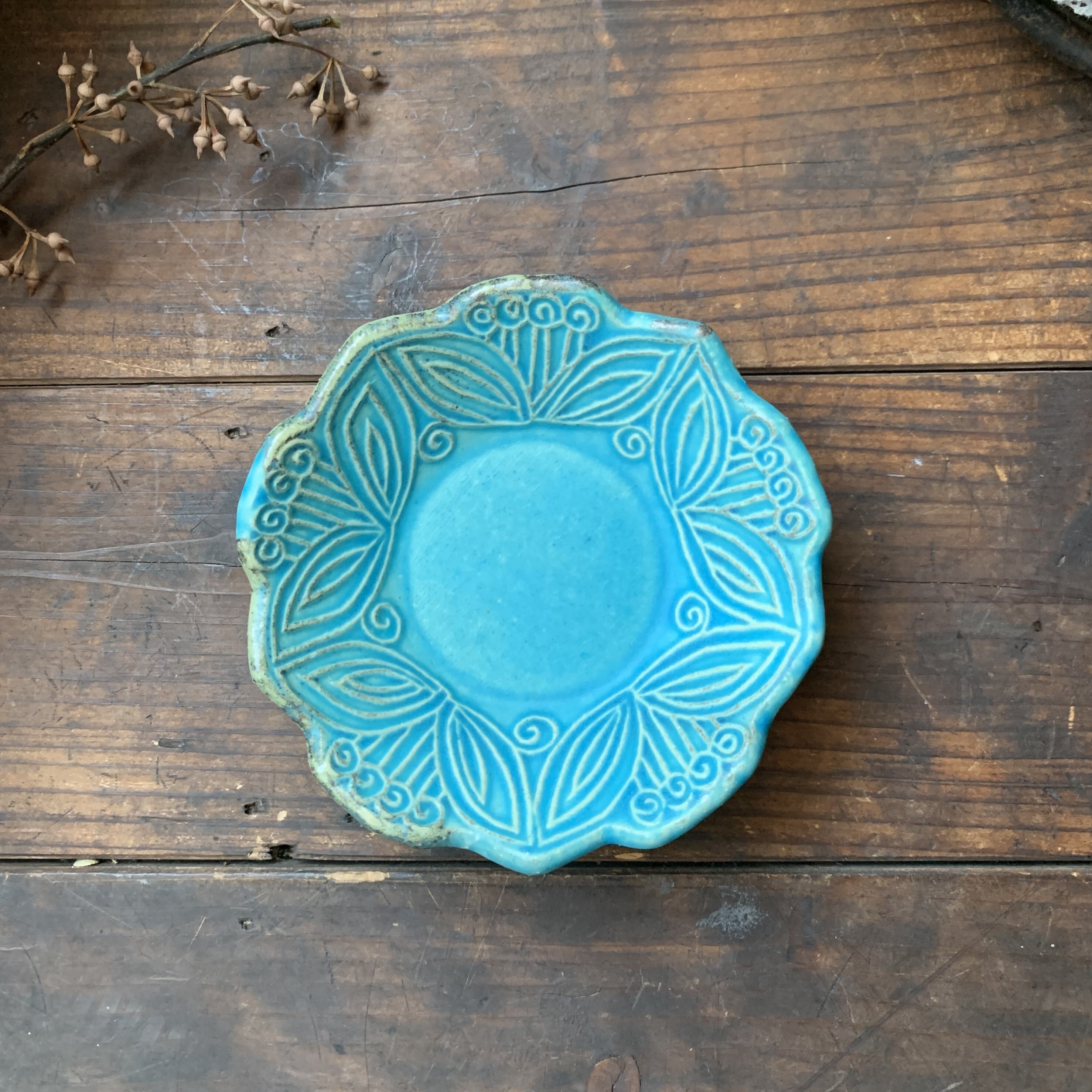 鮮やかなターコイズブルーが映える、花の刻文が入った小皿です。少し深さがあるので、汁物などのおかずの取り皿など、ちょこっと乗せにもお使いいただけます。