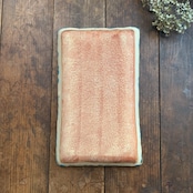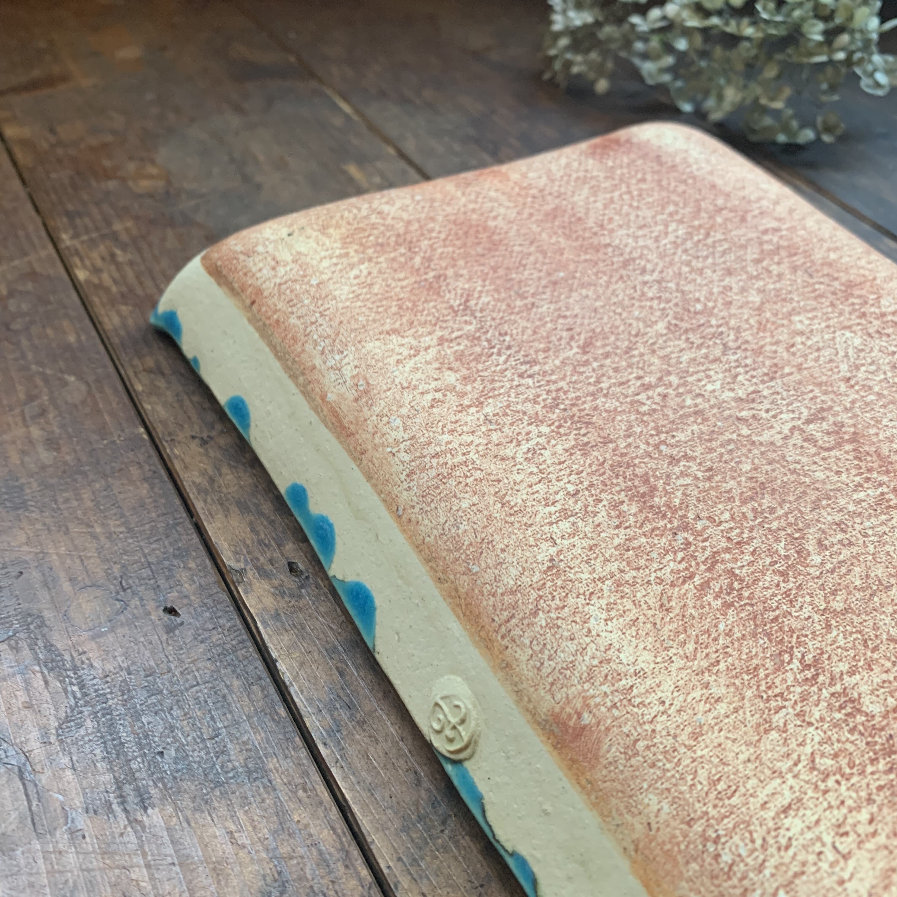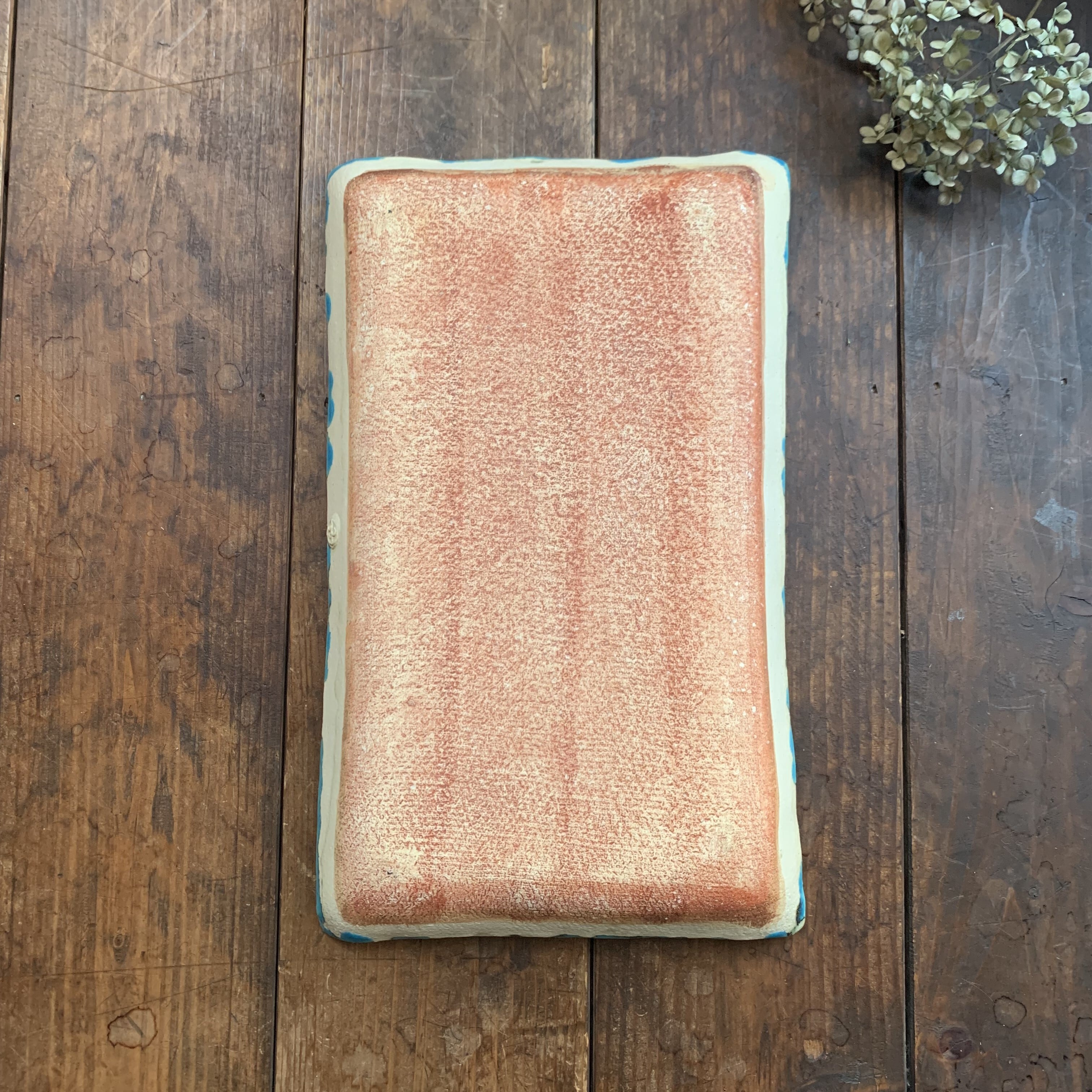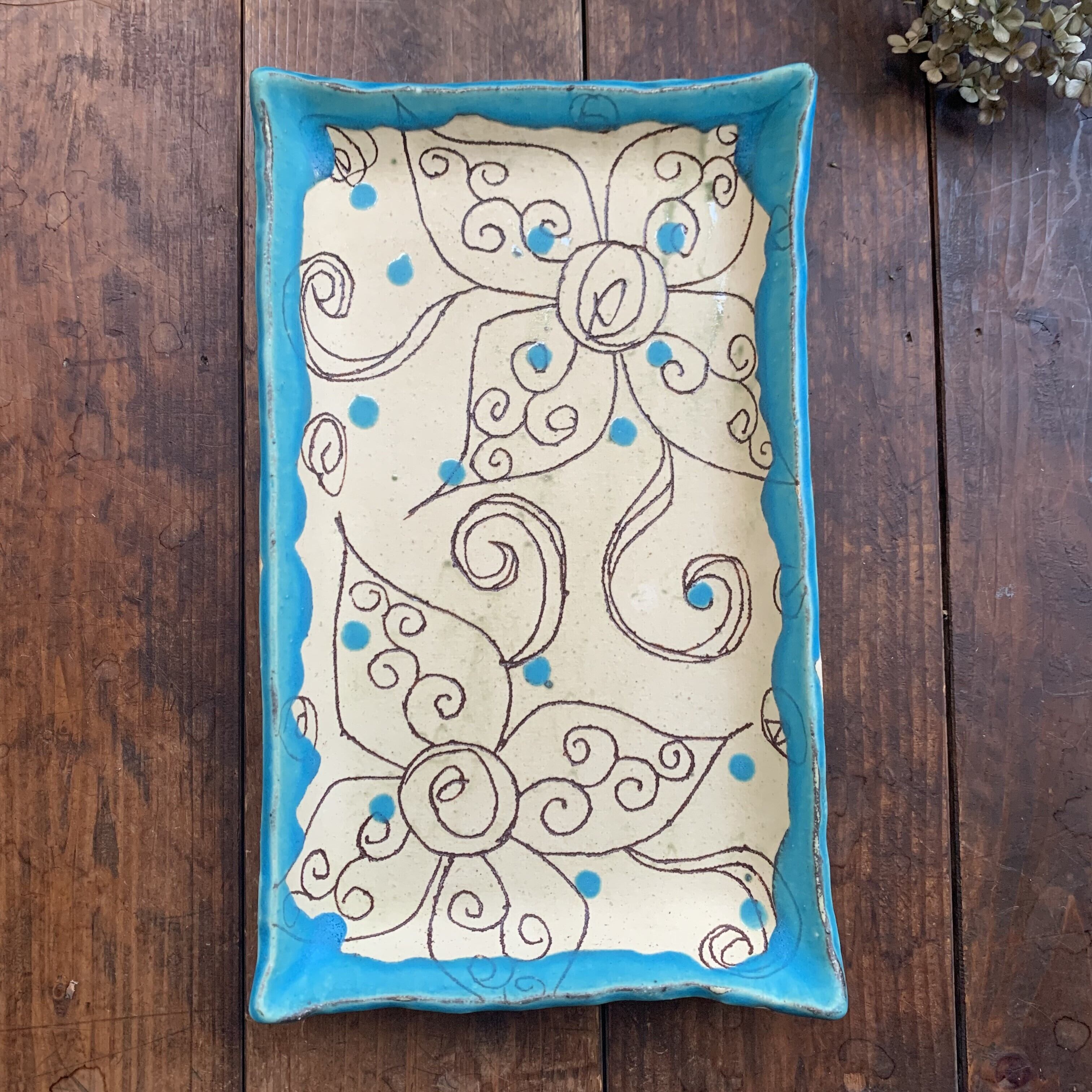 きれいなターコイズブルーにお花の模様にドット模様の入った長方形の角皿です。お魚やお刺身、サンドイッチやロールケーキの盛り付けなどいろいろな使い方ができます。置いてあるだけで絵になるお皿です。