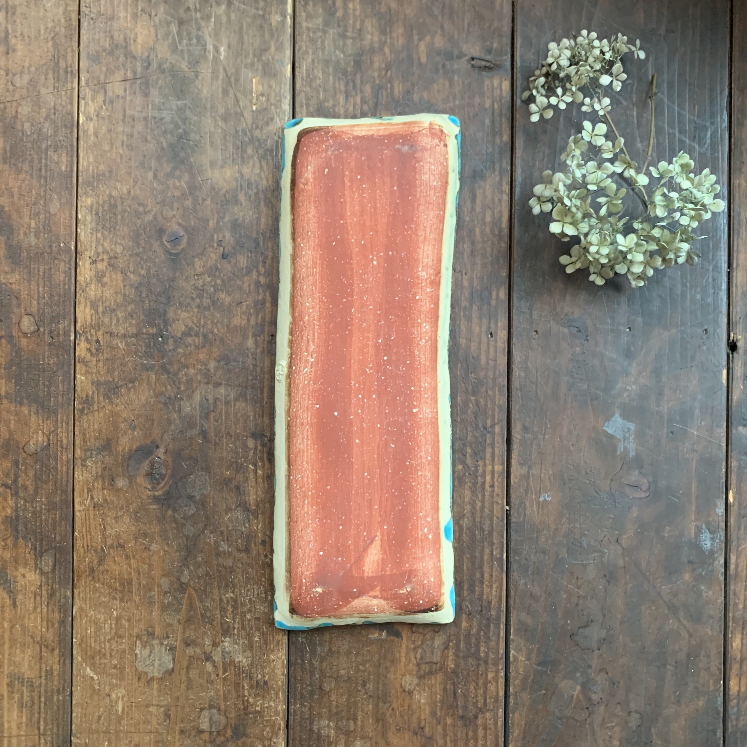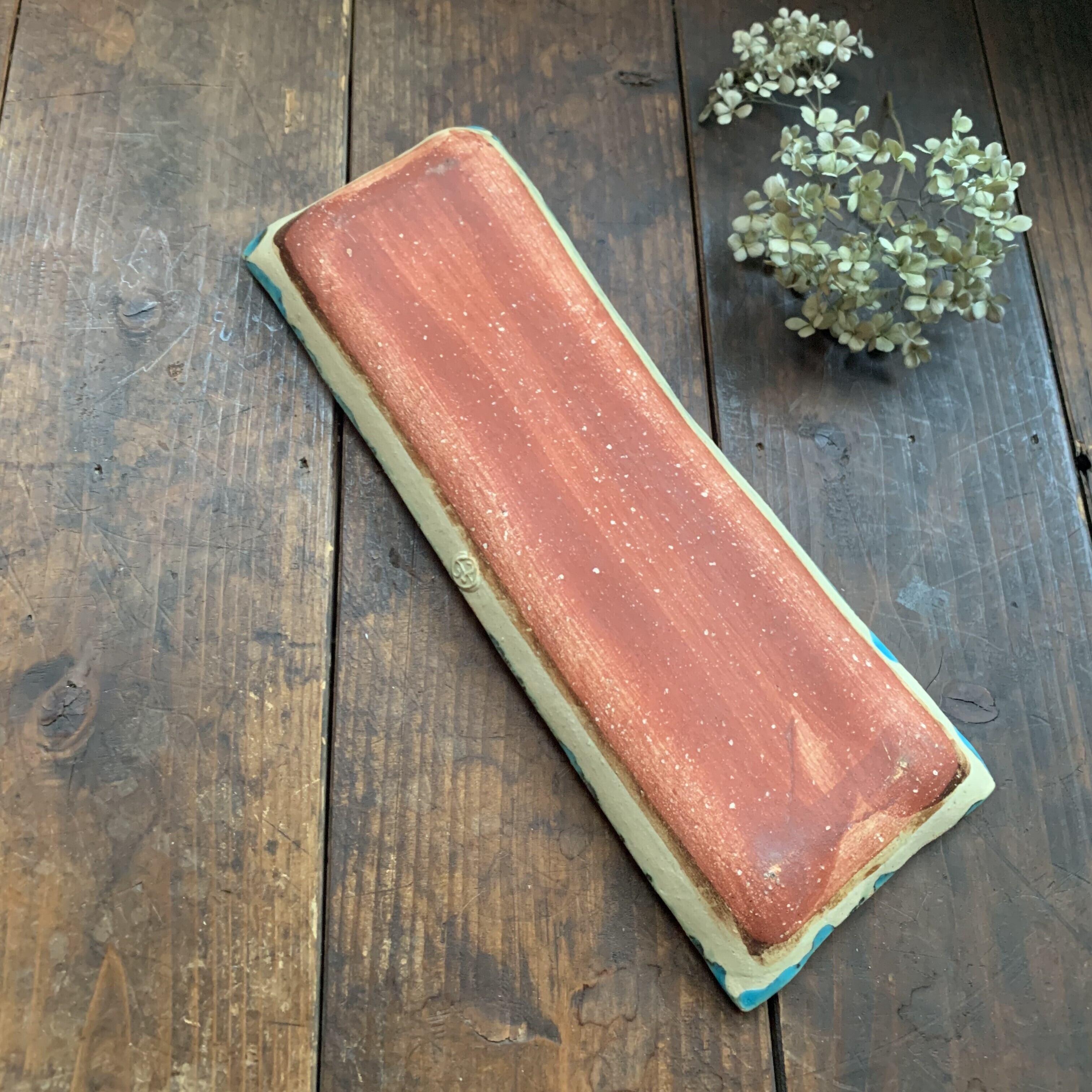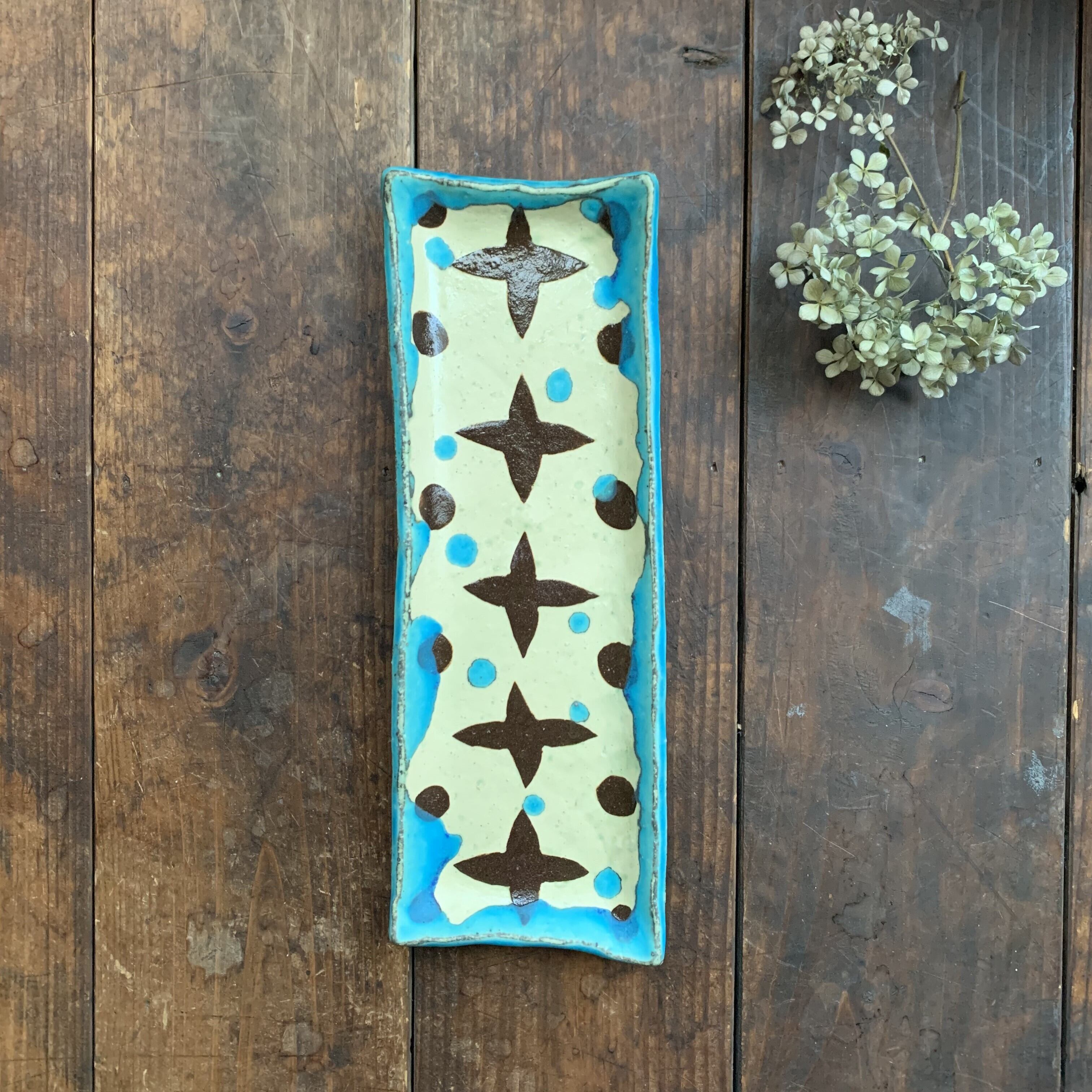 きれいなターコイズブルーに濃い茶色の柄とドット模様が入った長方形の角皿です。りぢゅう氏ならではの独創性のある絵柄が目を引きます。置いてあるだけで絵になるとても素敵な長皿です。