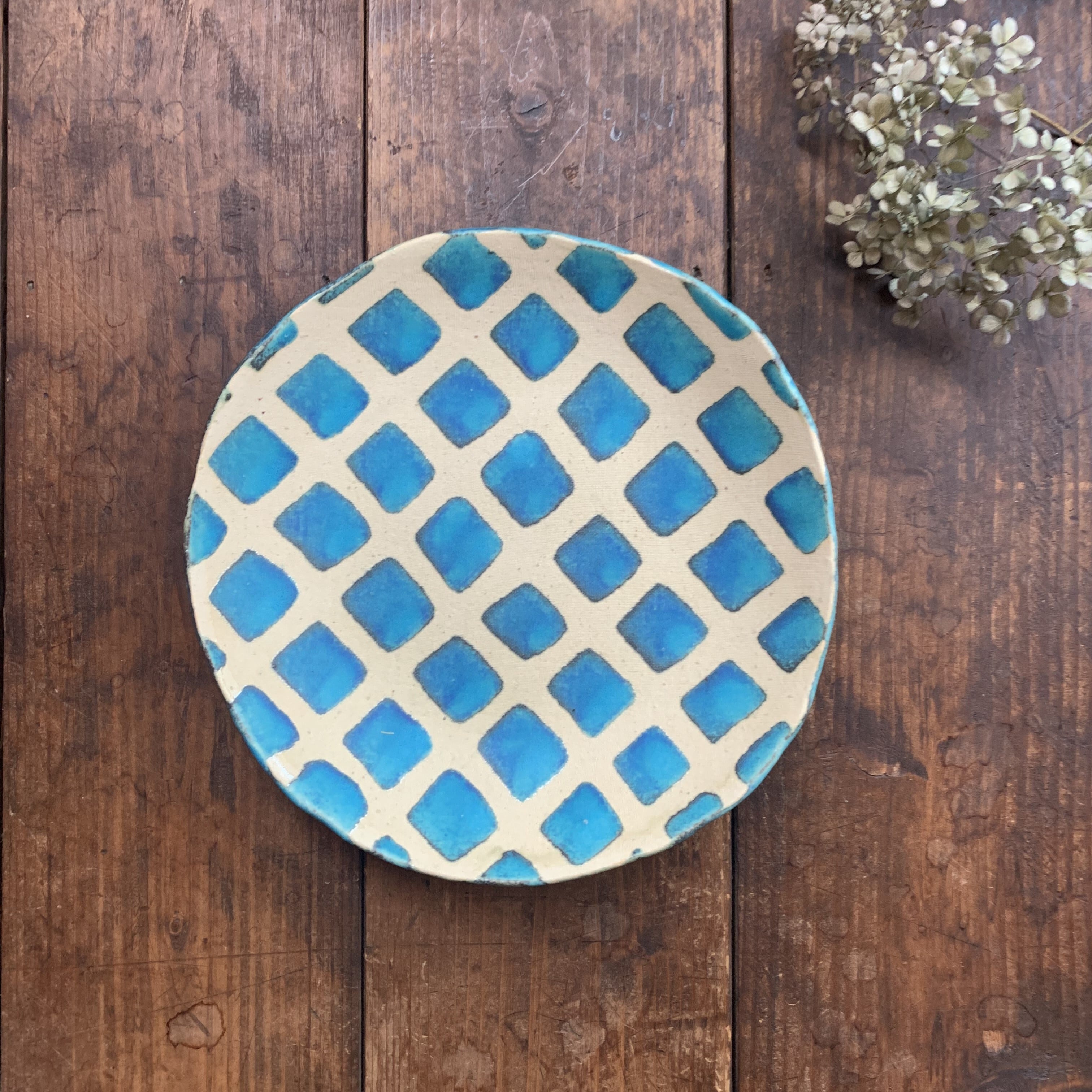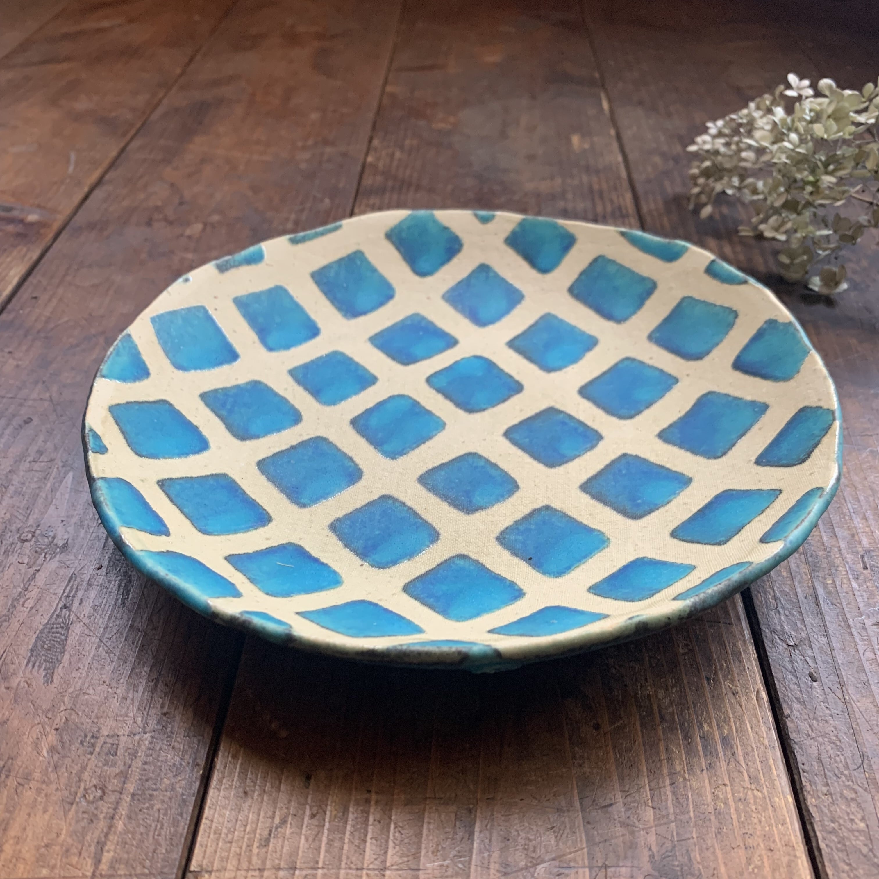 【笠間焼】佐藤りぢゅう 青釉白抜きパン皿 19.5cm 格子