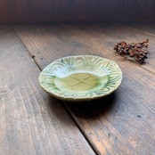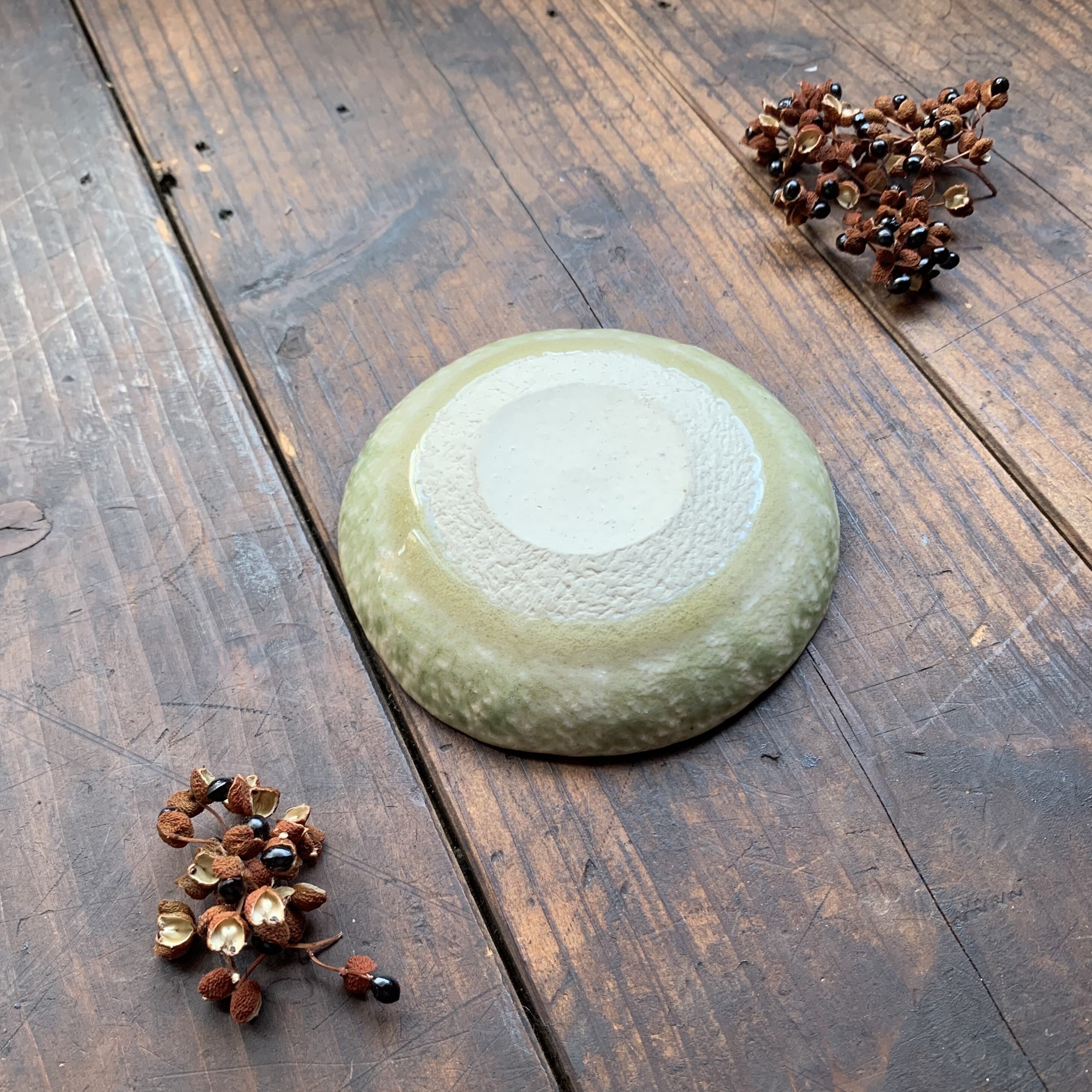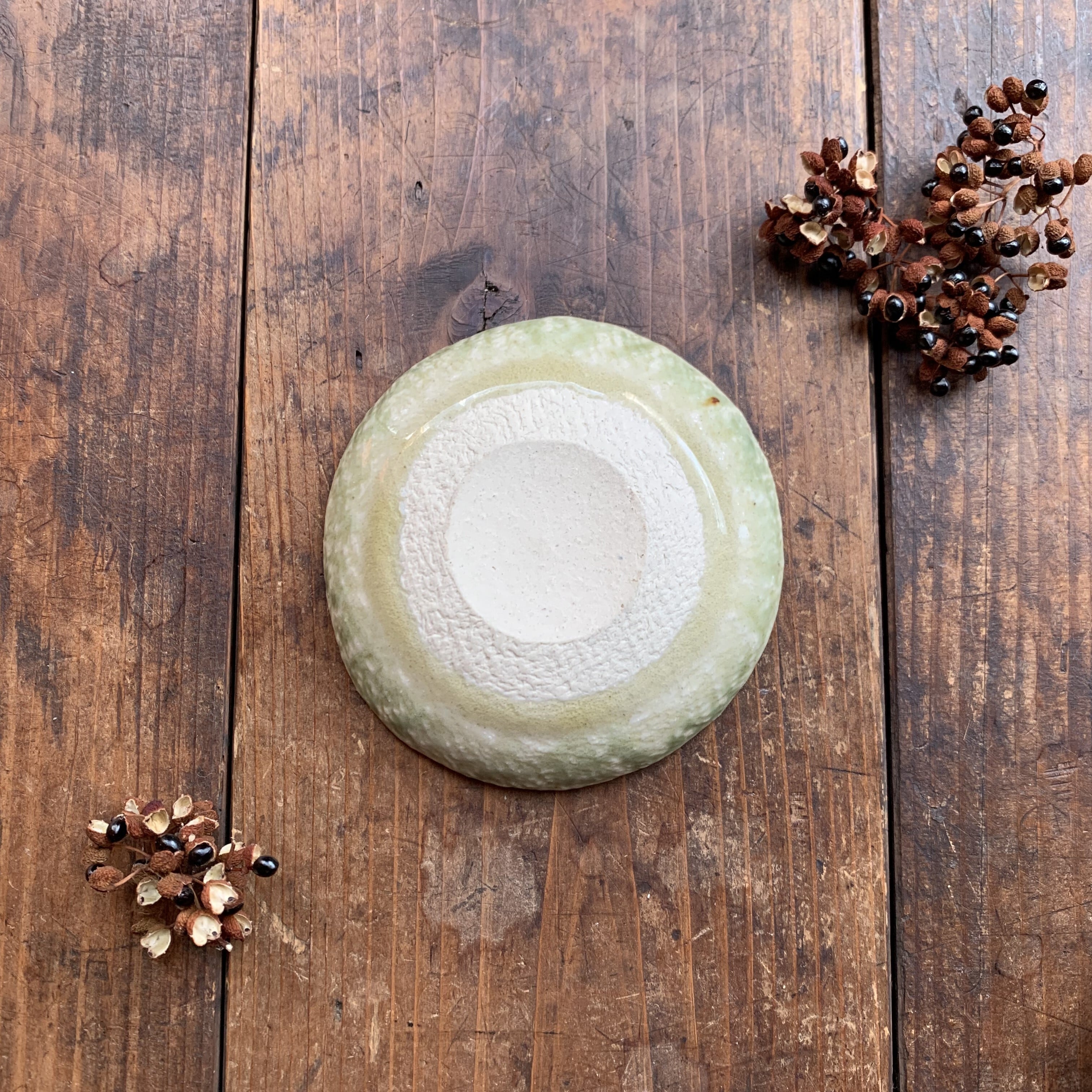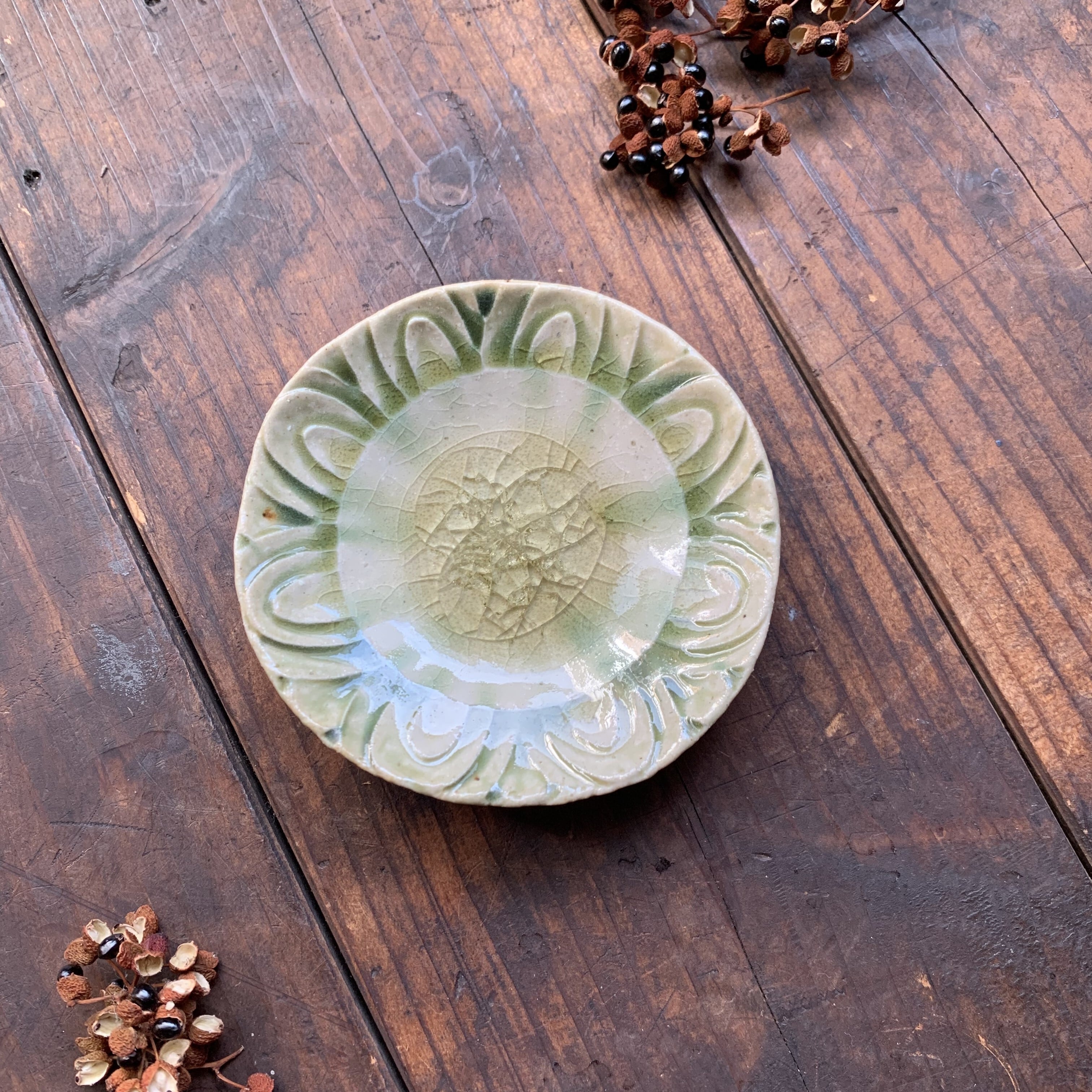 ところどころに入った緑色が素敵な緑灰釉の豆皿です。真ん中に入った貫入とふちの波模様がとてもかわいらしいです。光沢感があります。