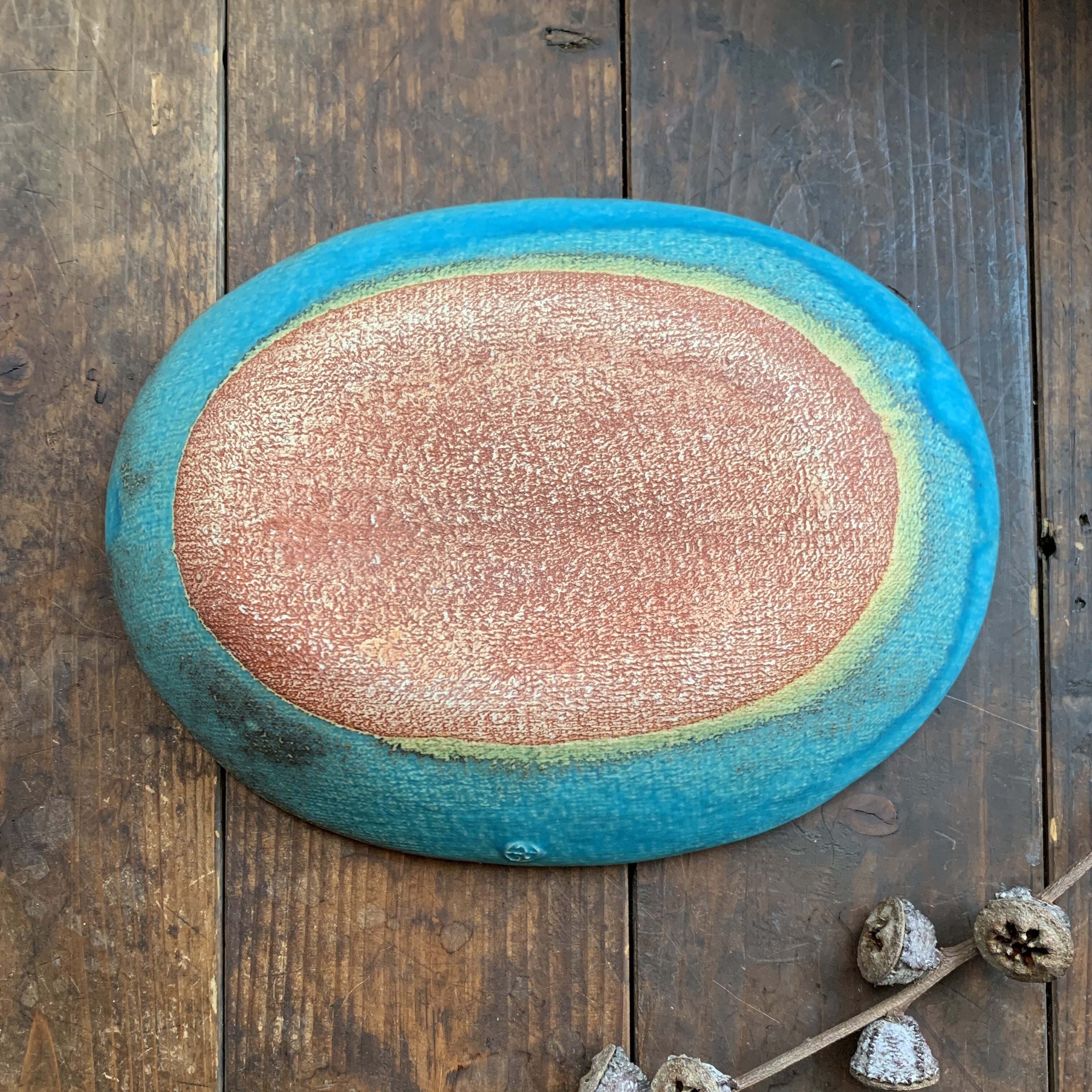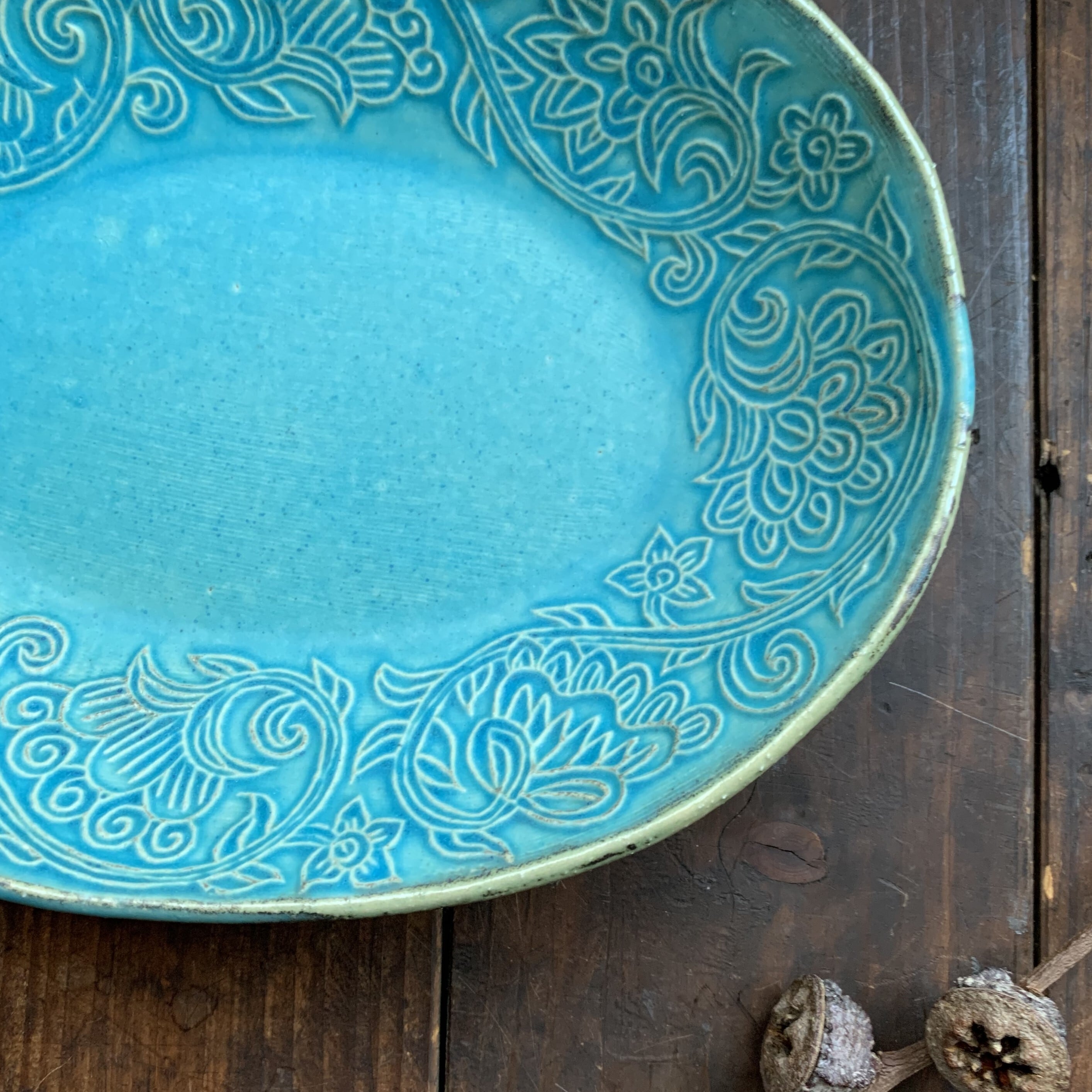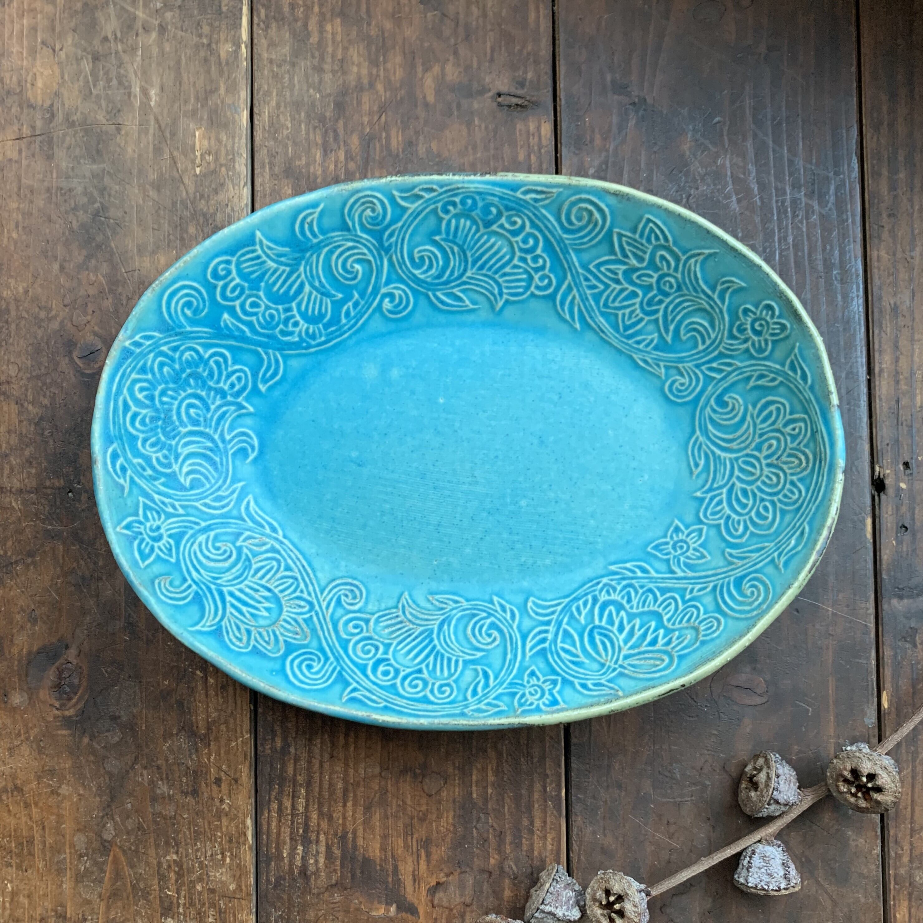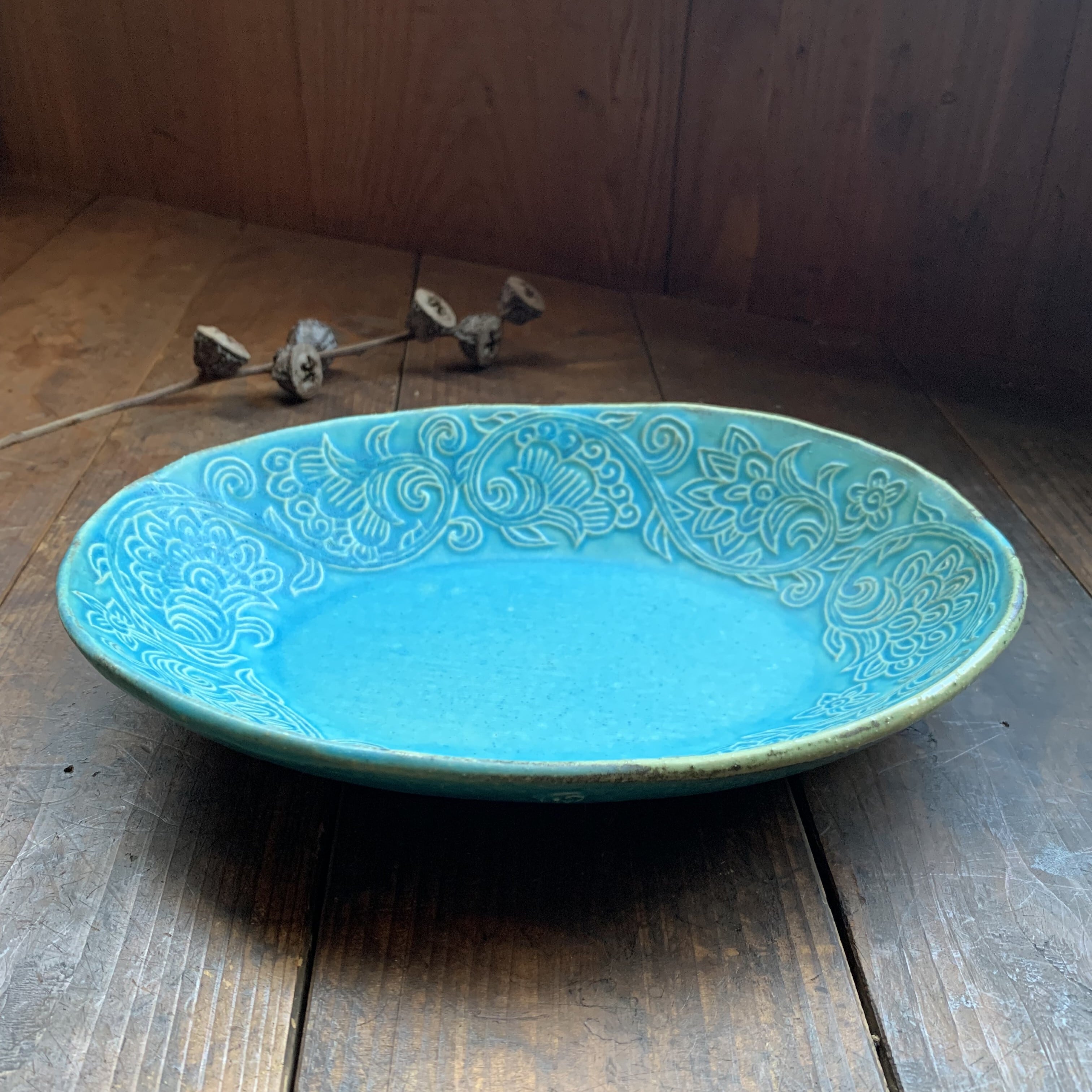 きれいなターコイズブルーに個性豊かな草刻文の入った楕円鉢です。