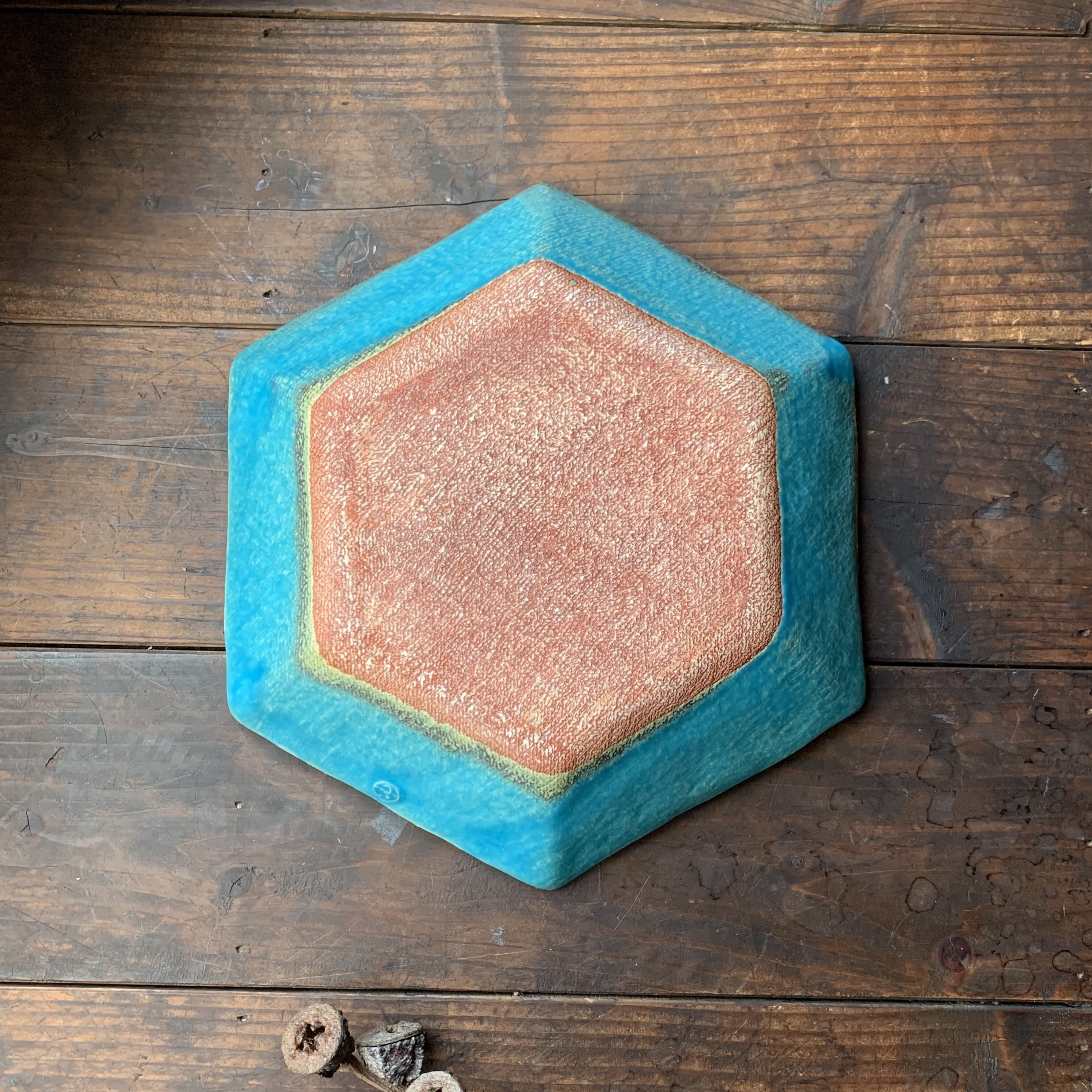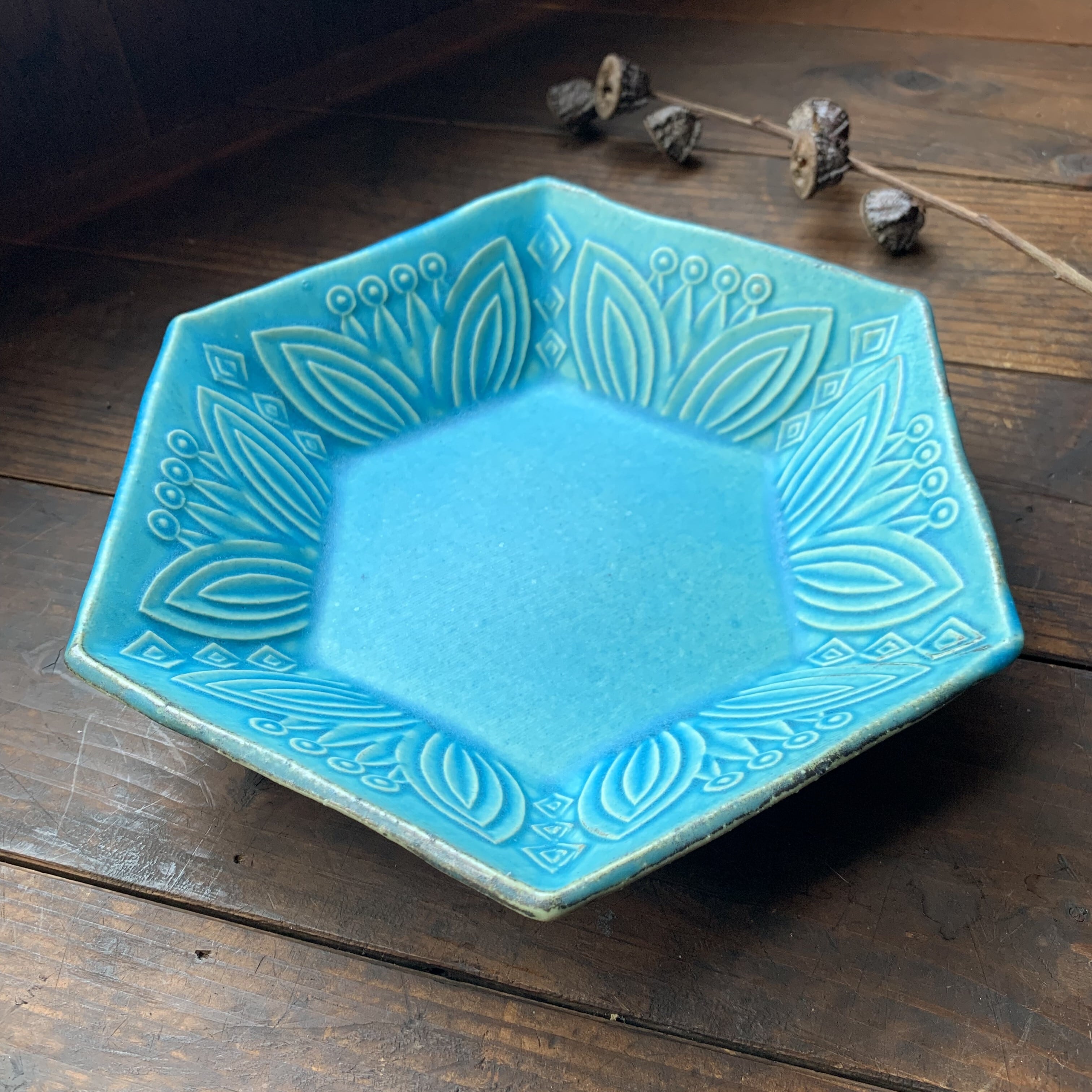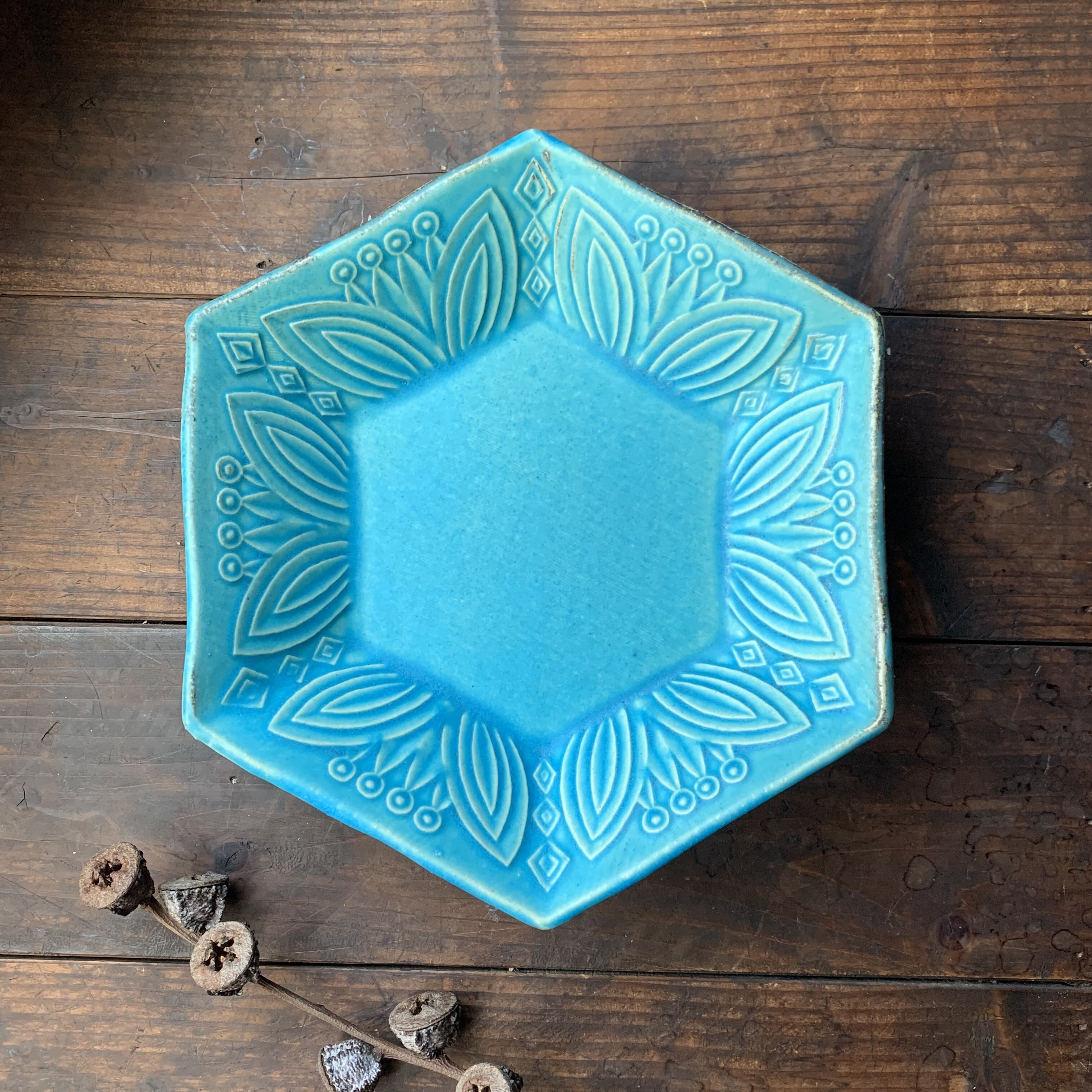 きれいなターコイズブルーにお花の刻文が入った六角鉢です。