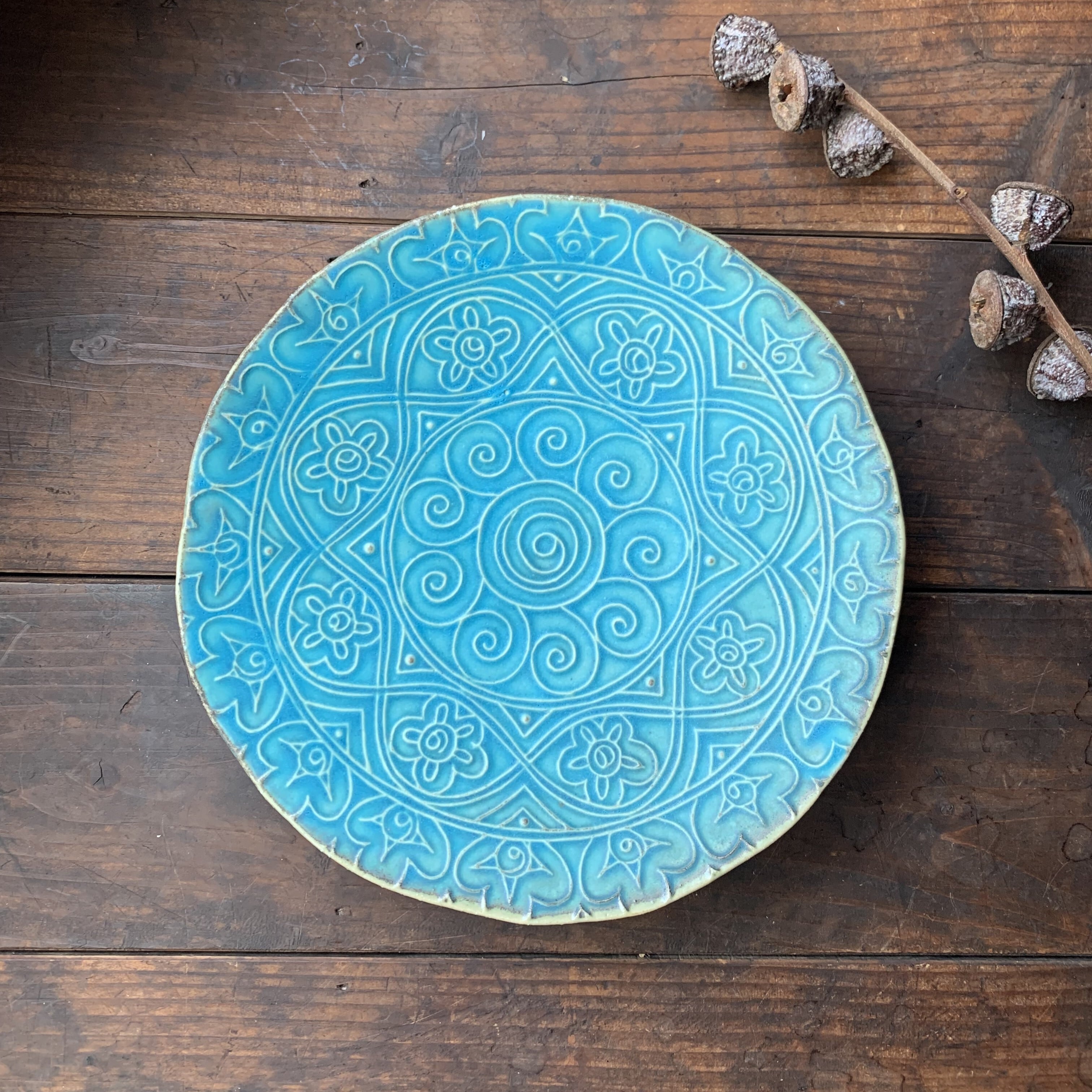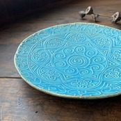 きれいなターコイズブルーに一面の刻文が素敵な大皿です。