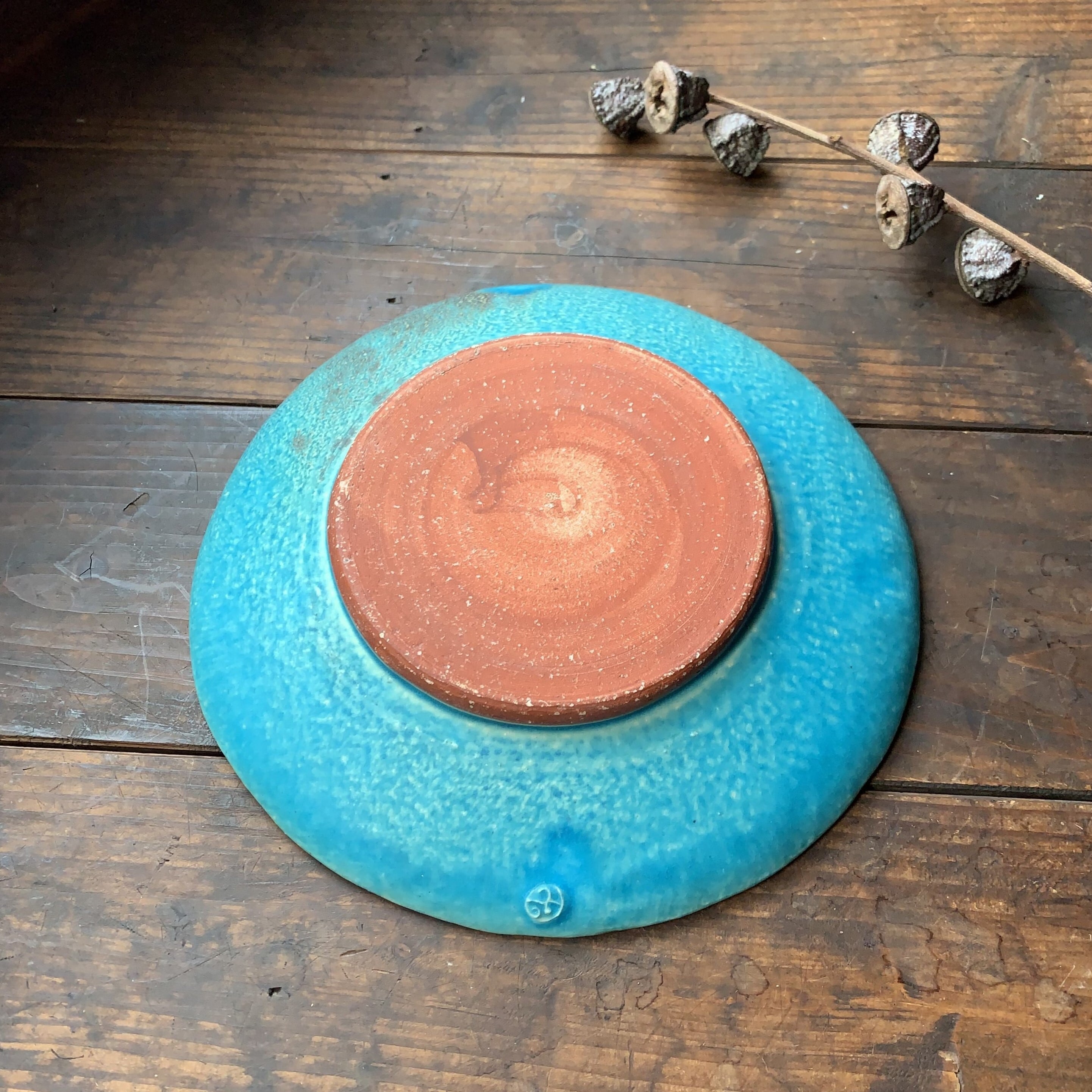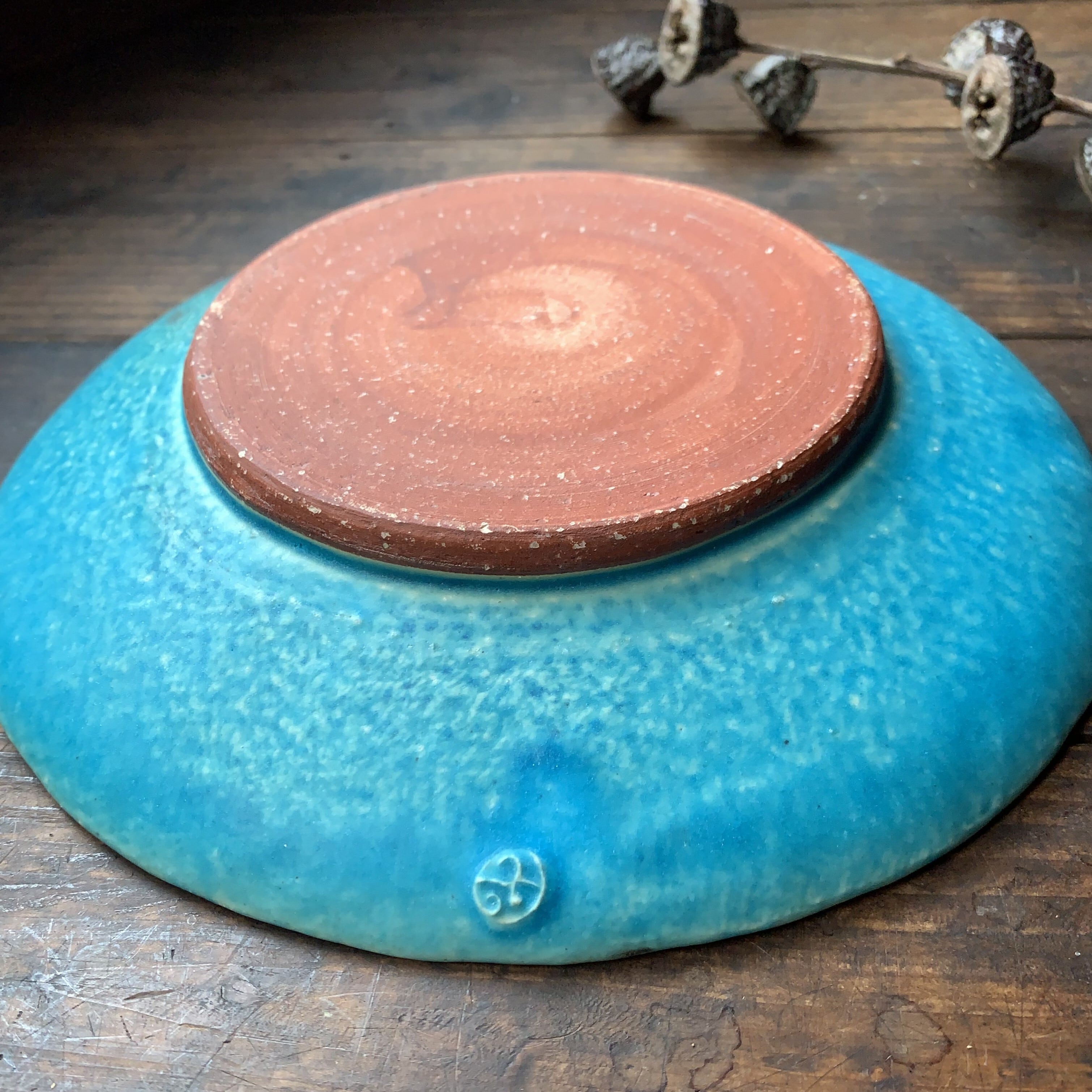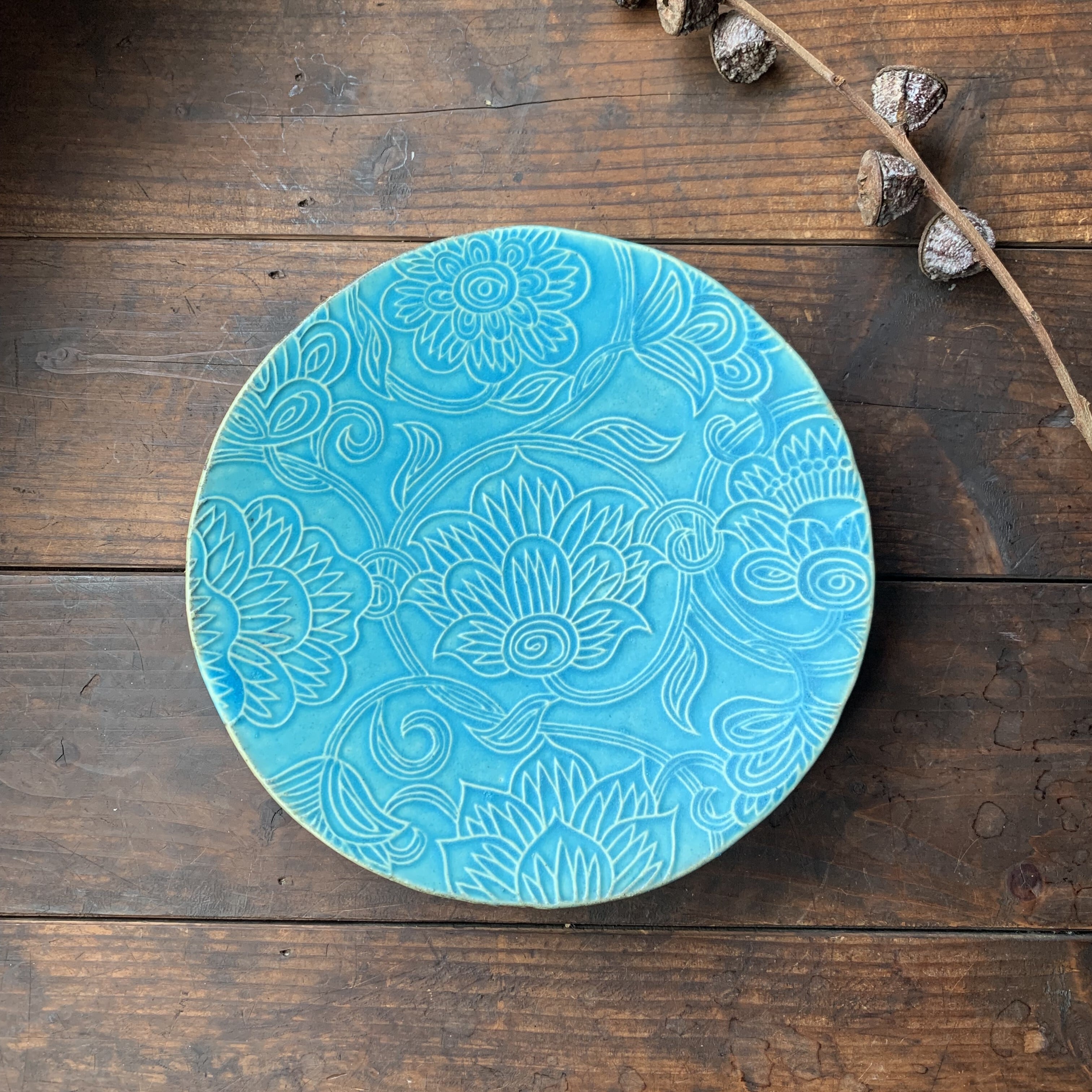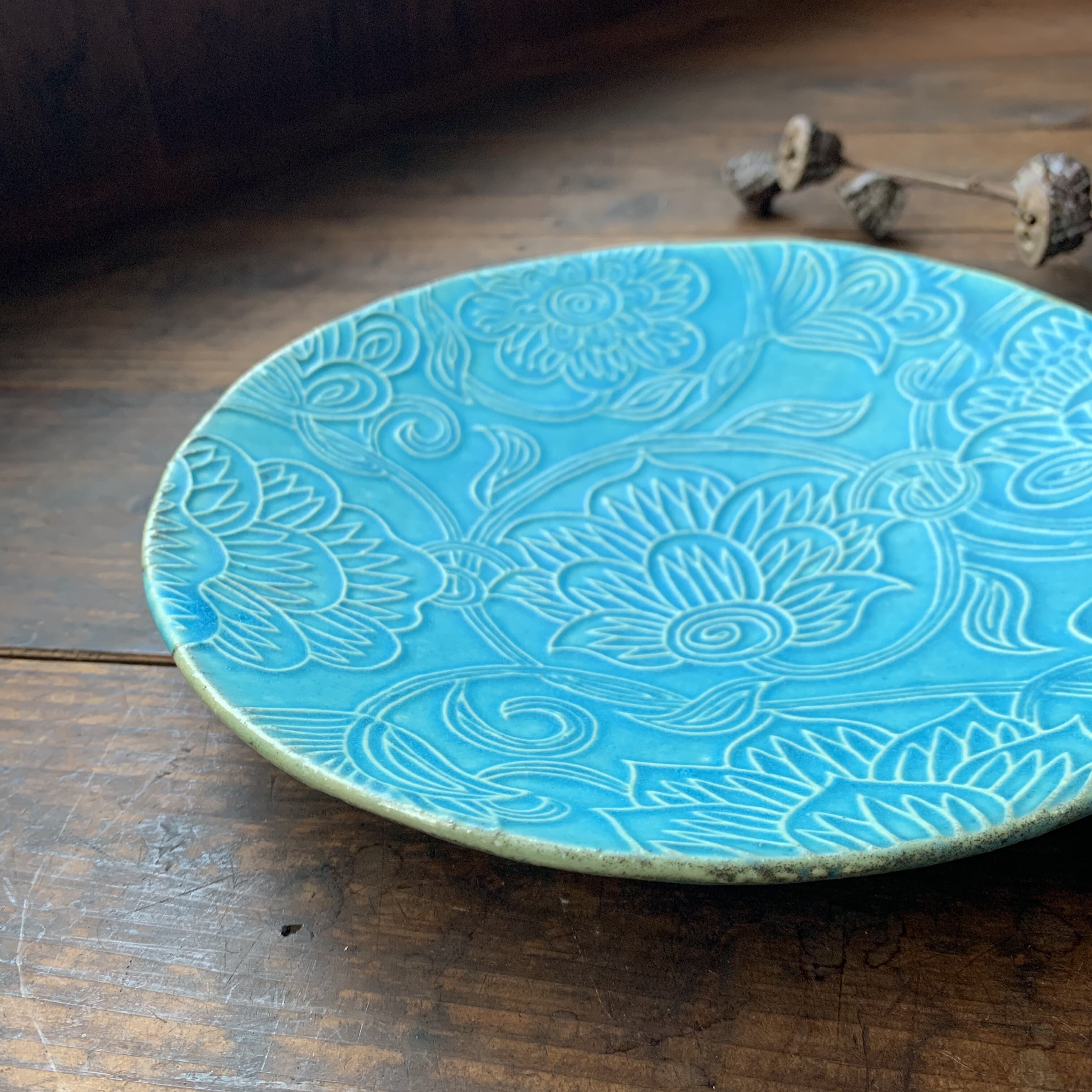 きれいなターコイズブルーにお花の刻文が素敵な大皿です。