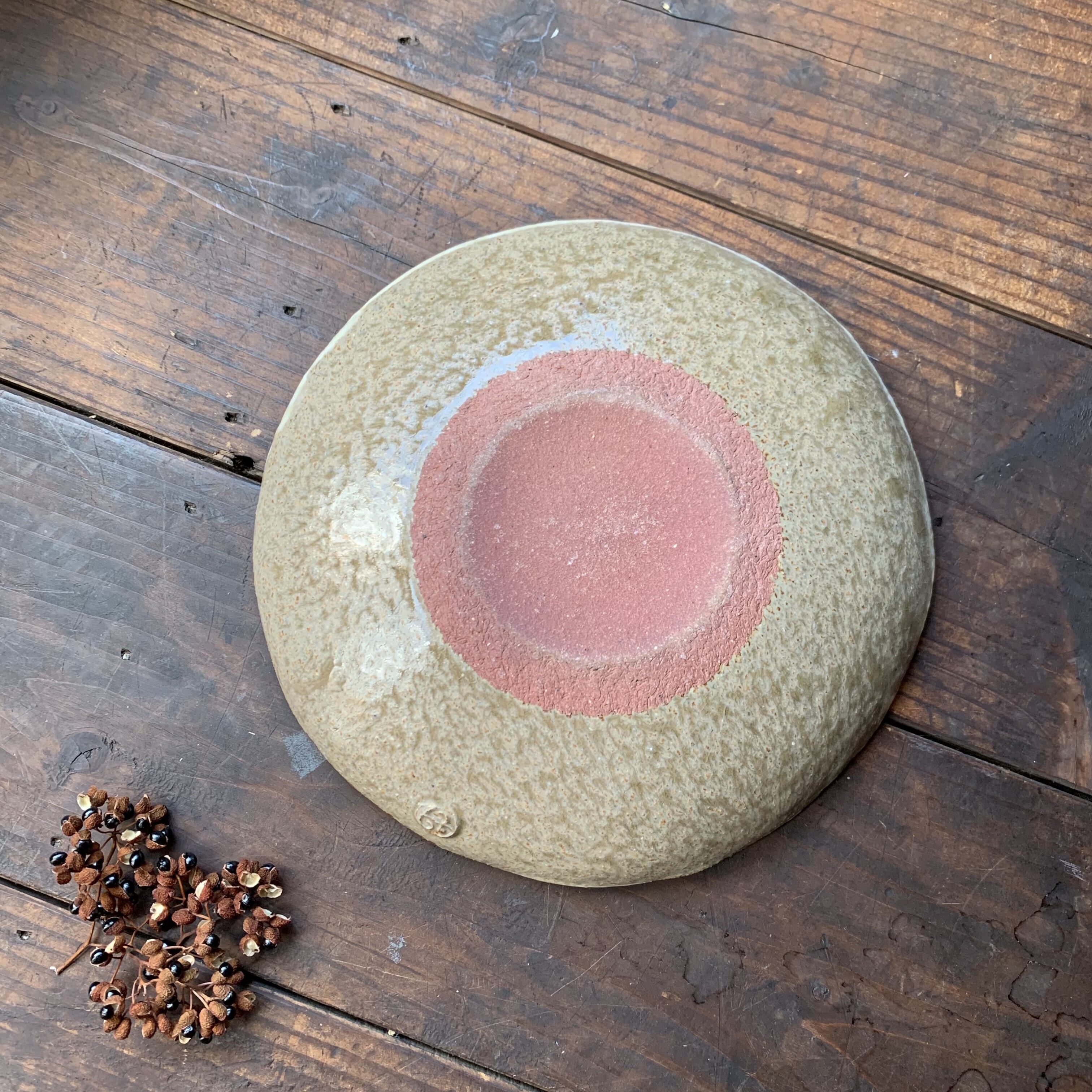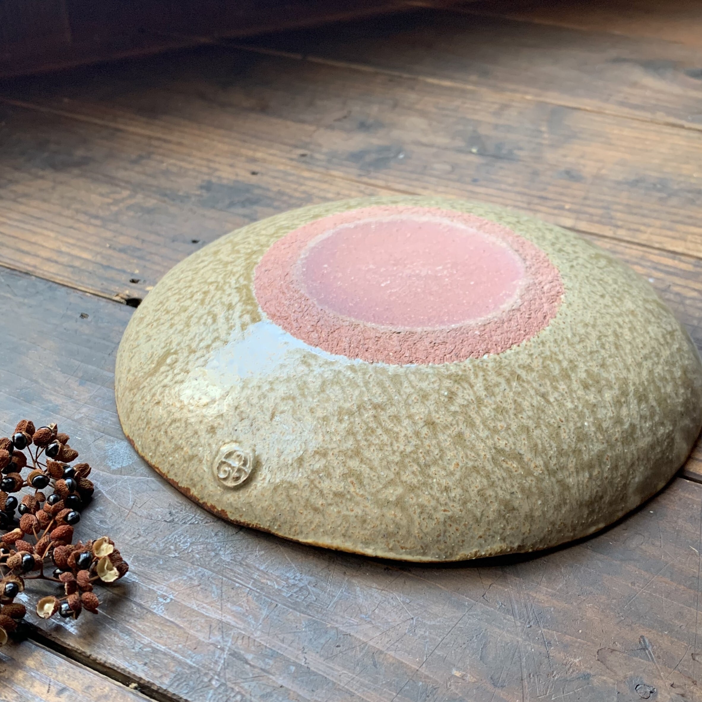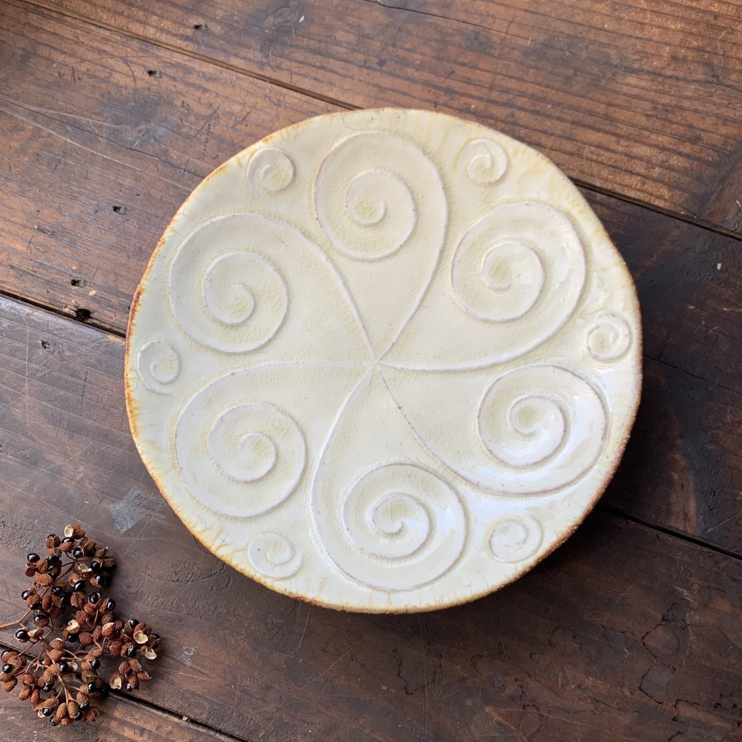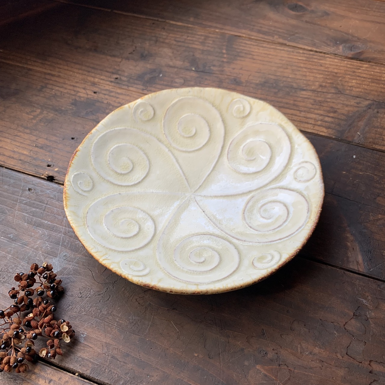 大きいうずまきの刻文が素敵なアイボリー色の中深皿です。