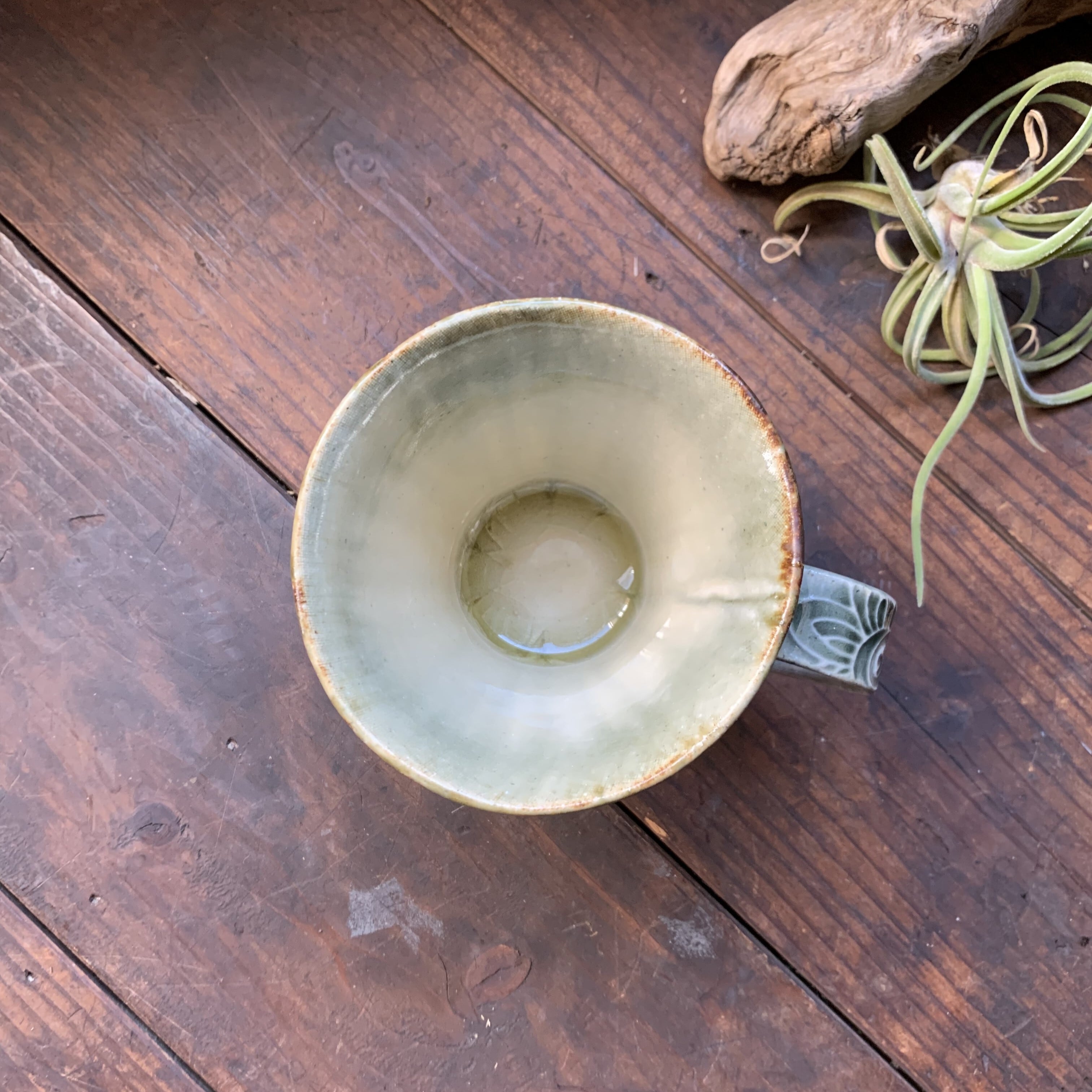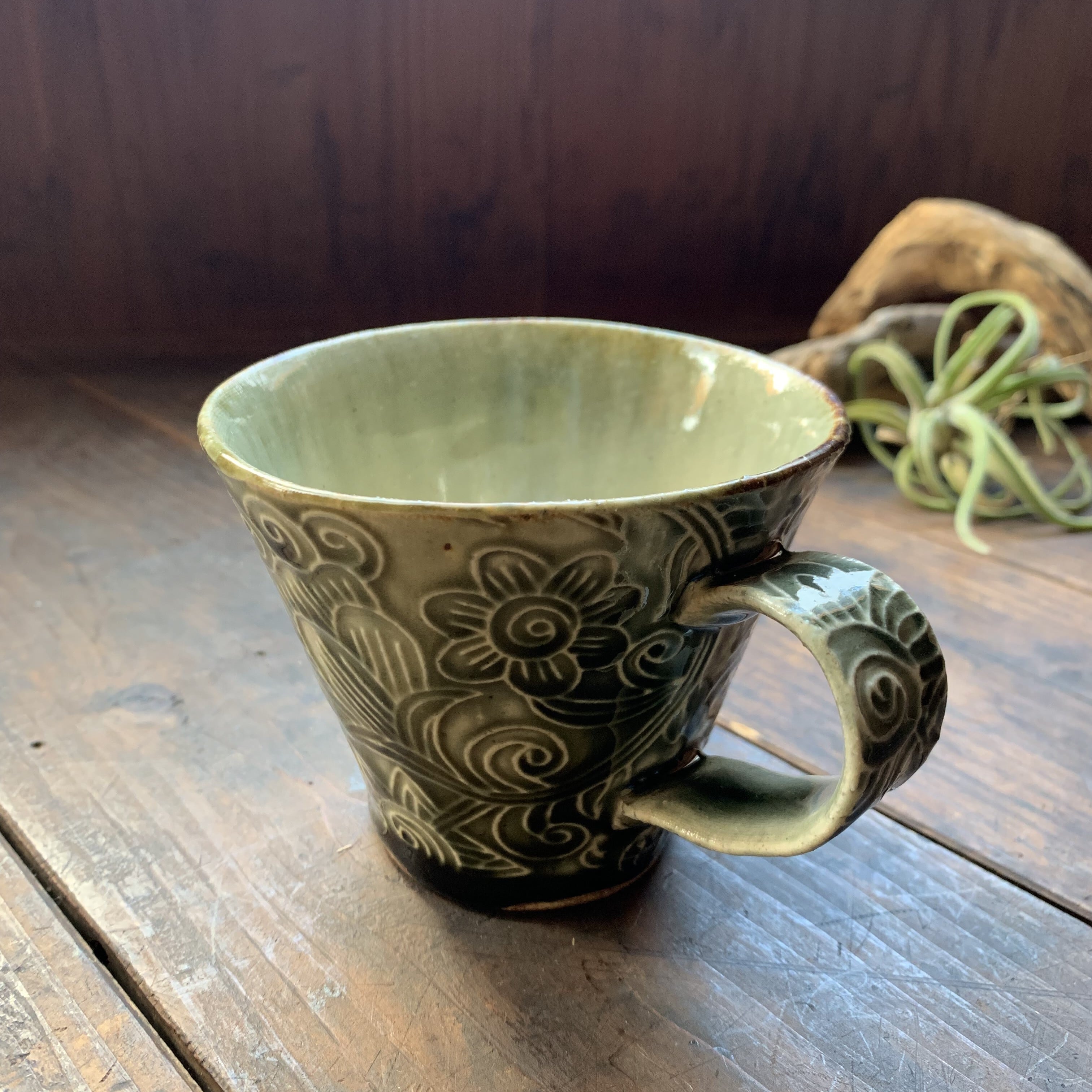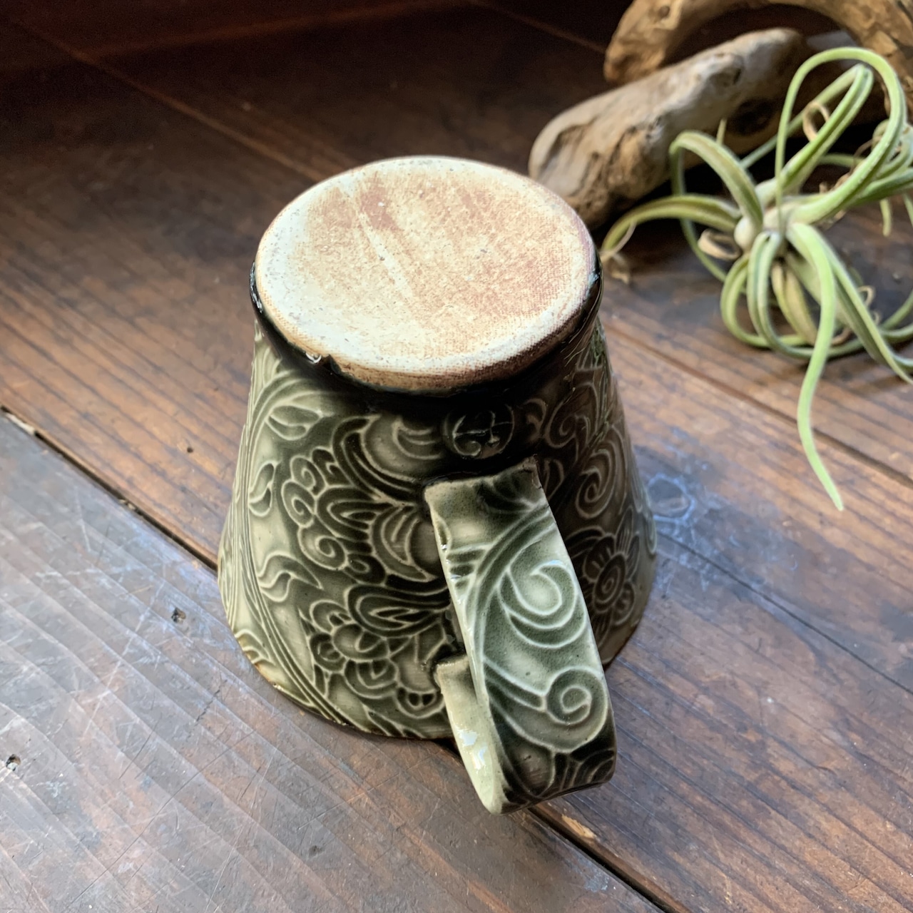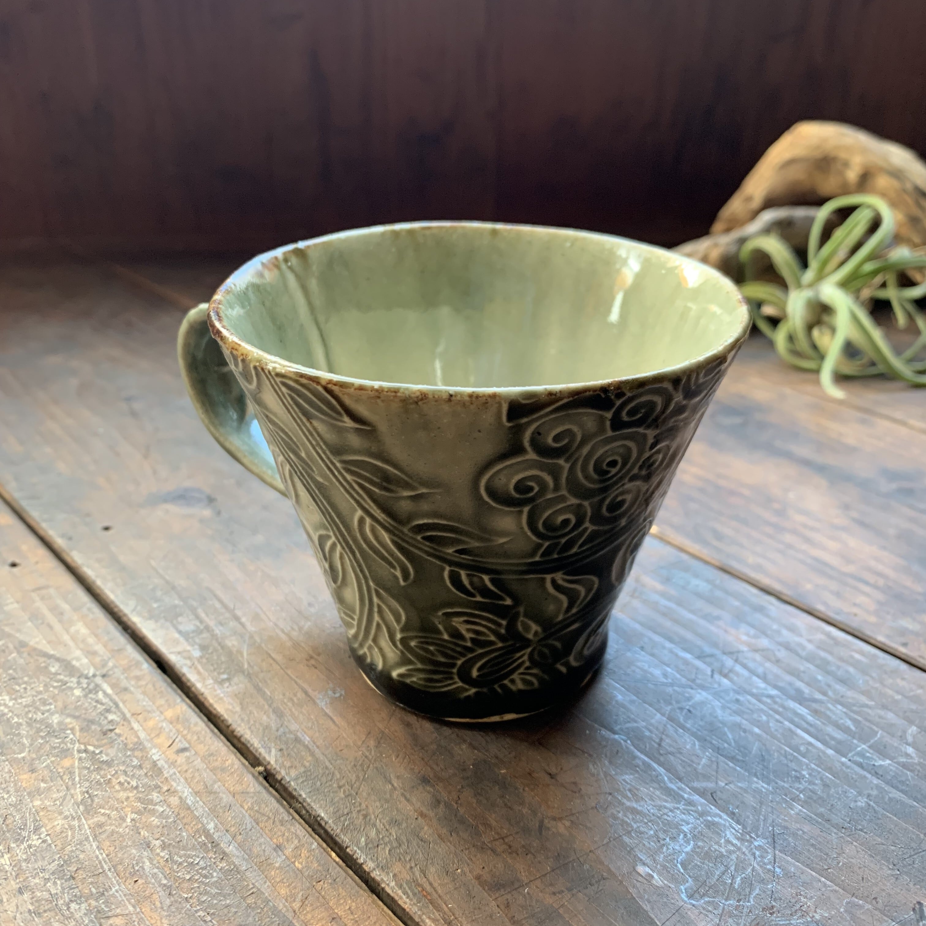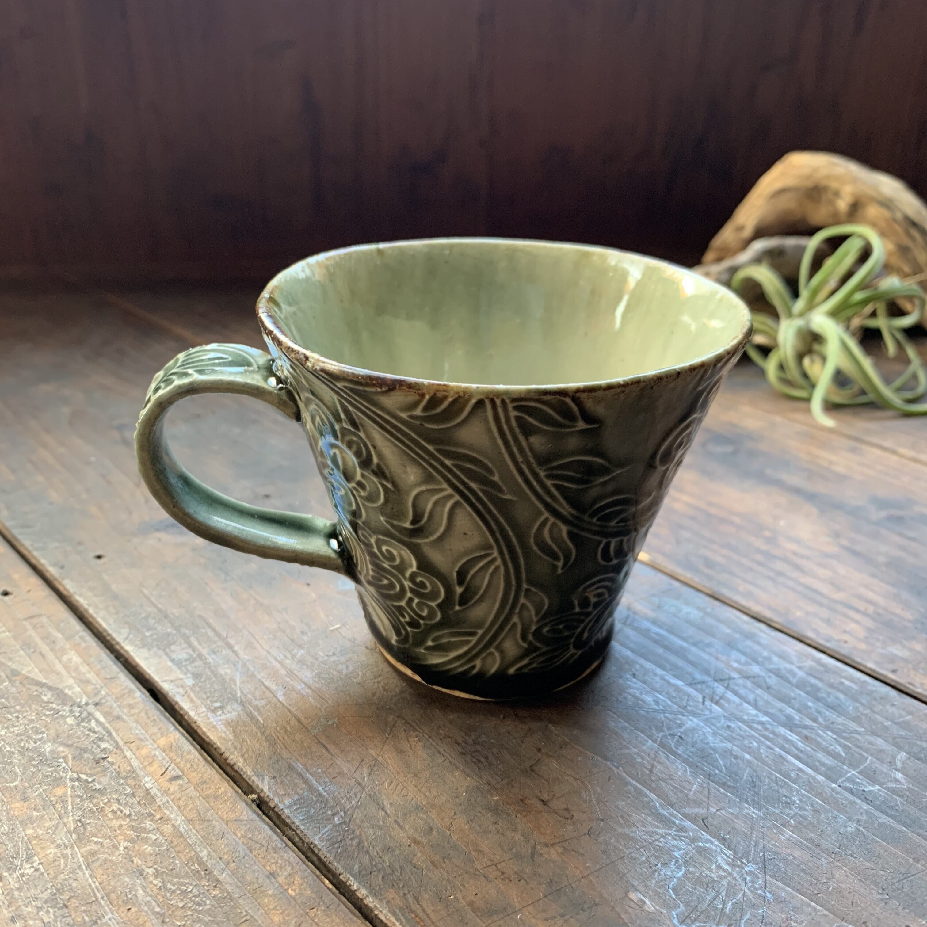 個性的な草の刻文が素敵な緑灰釉のマグカップです。光沢感があります。