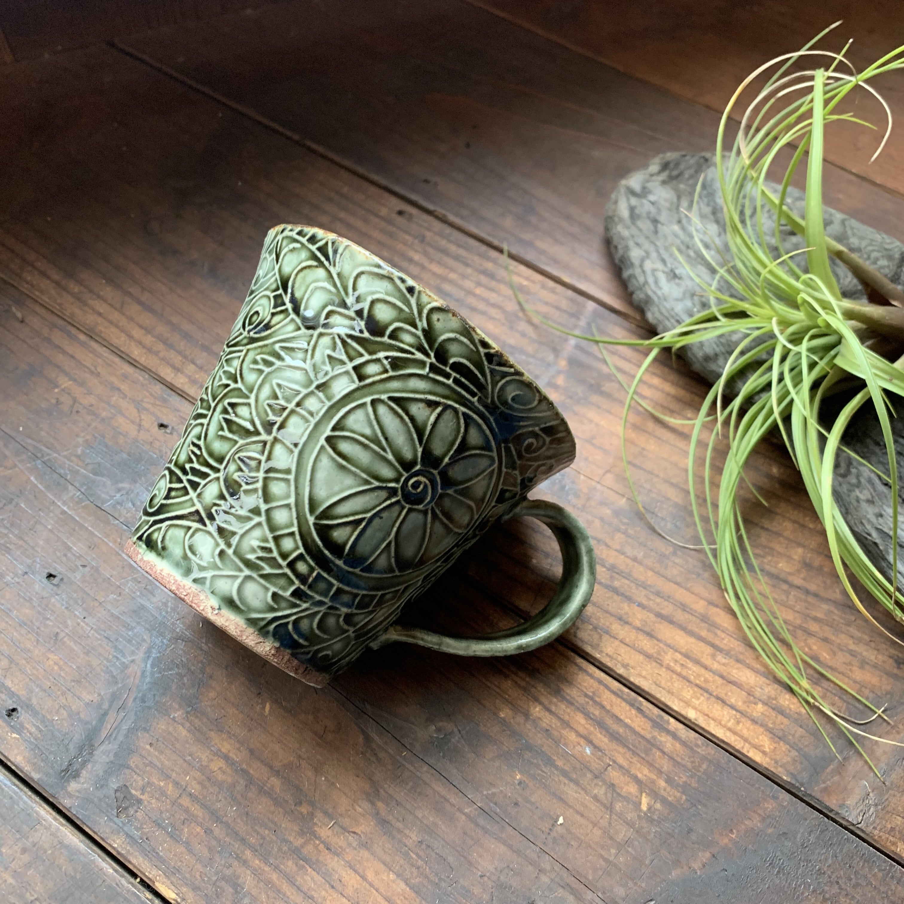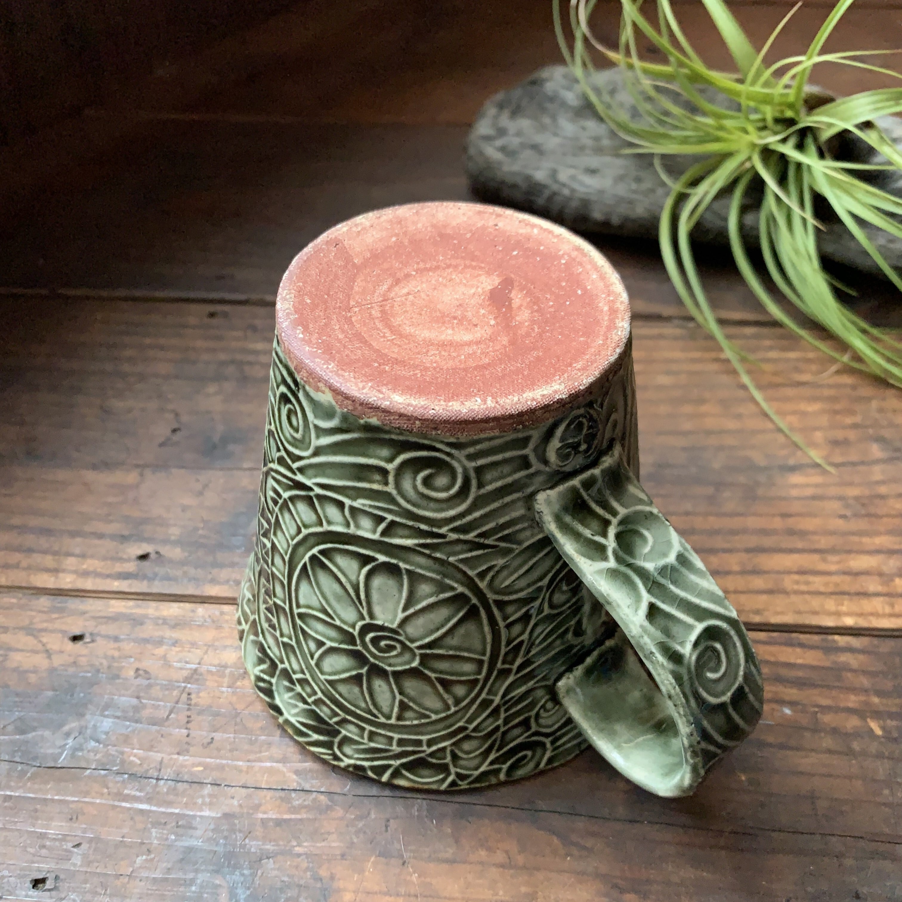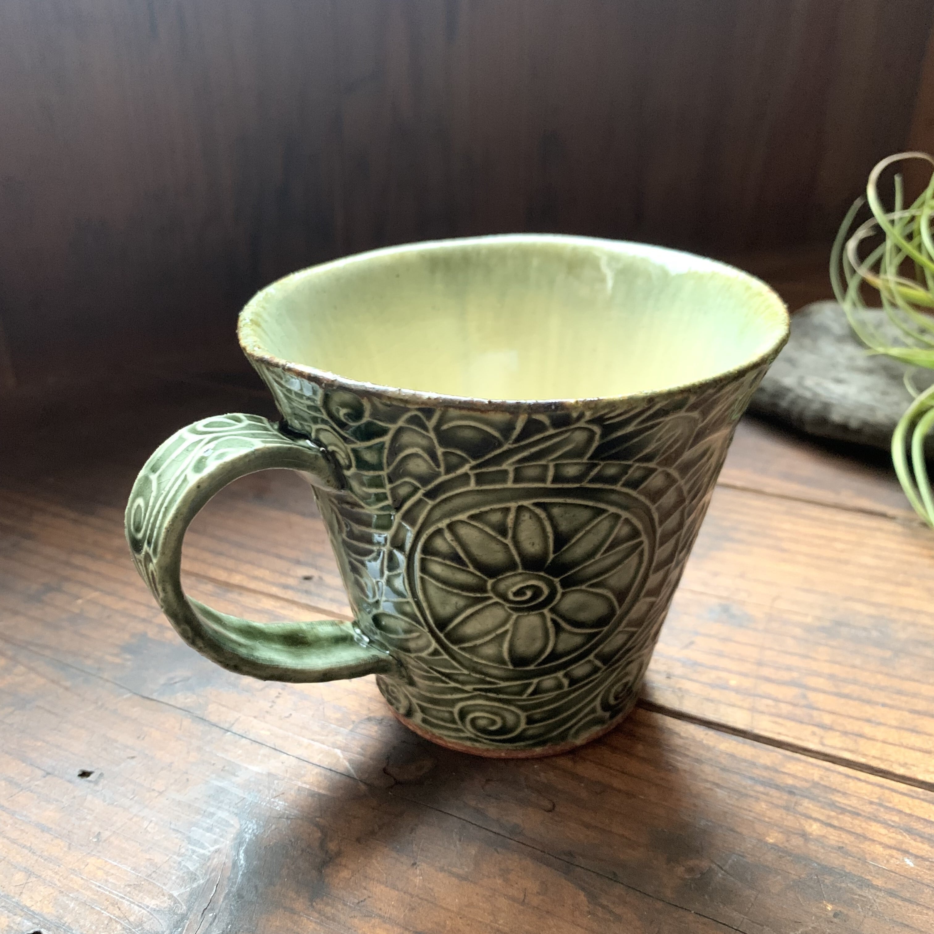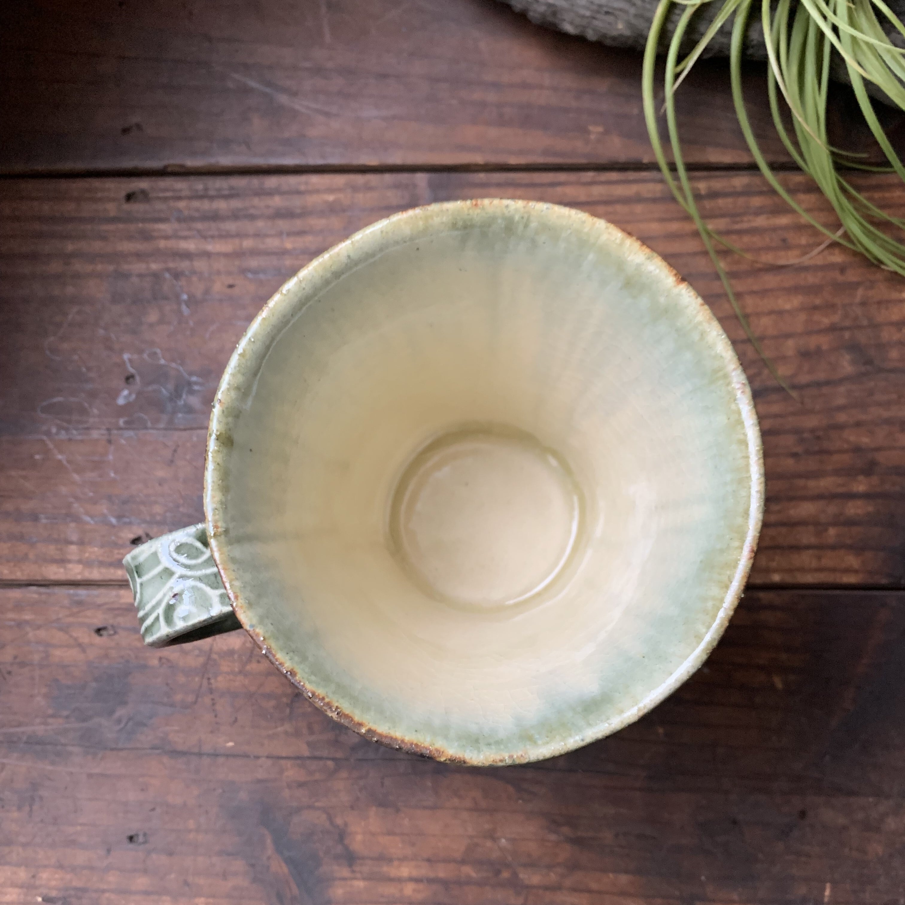 【笠間焼】佐藤りぢゅう 刻文 魚 マグカップ 10cm 緑灰釉